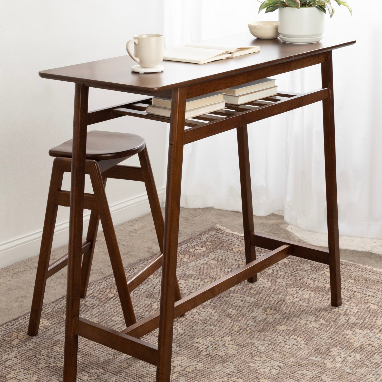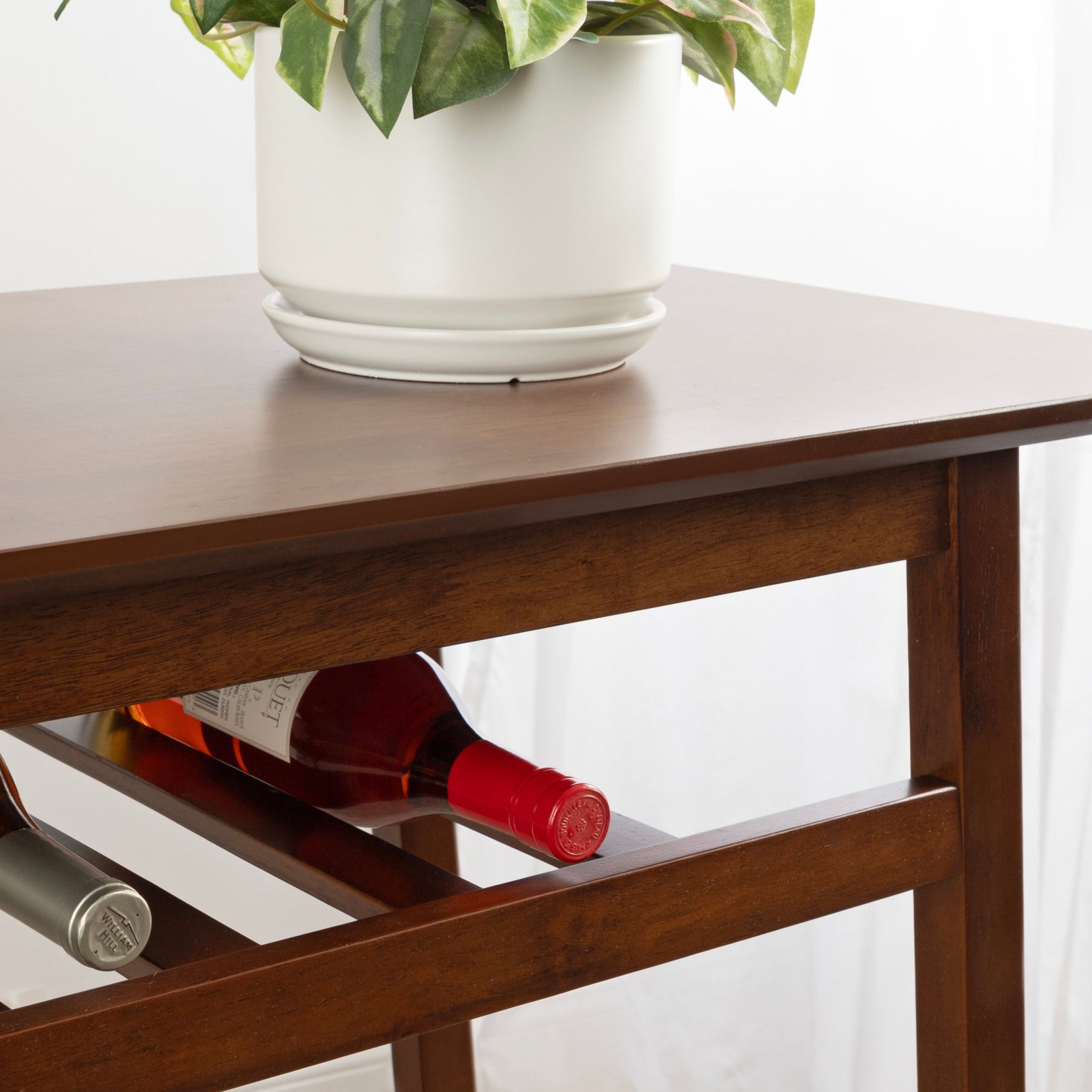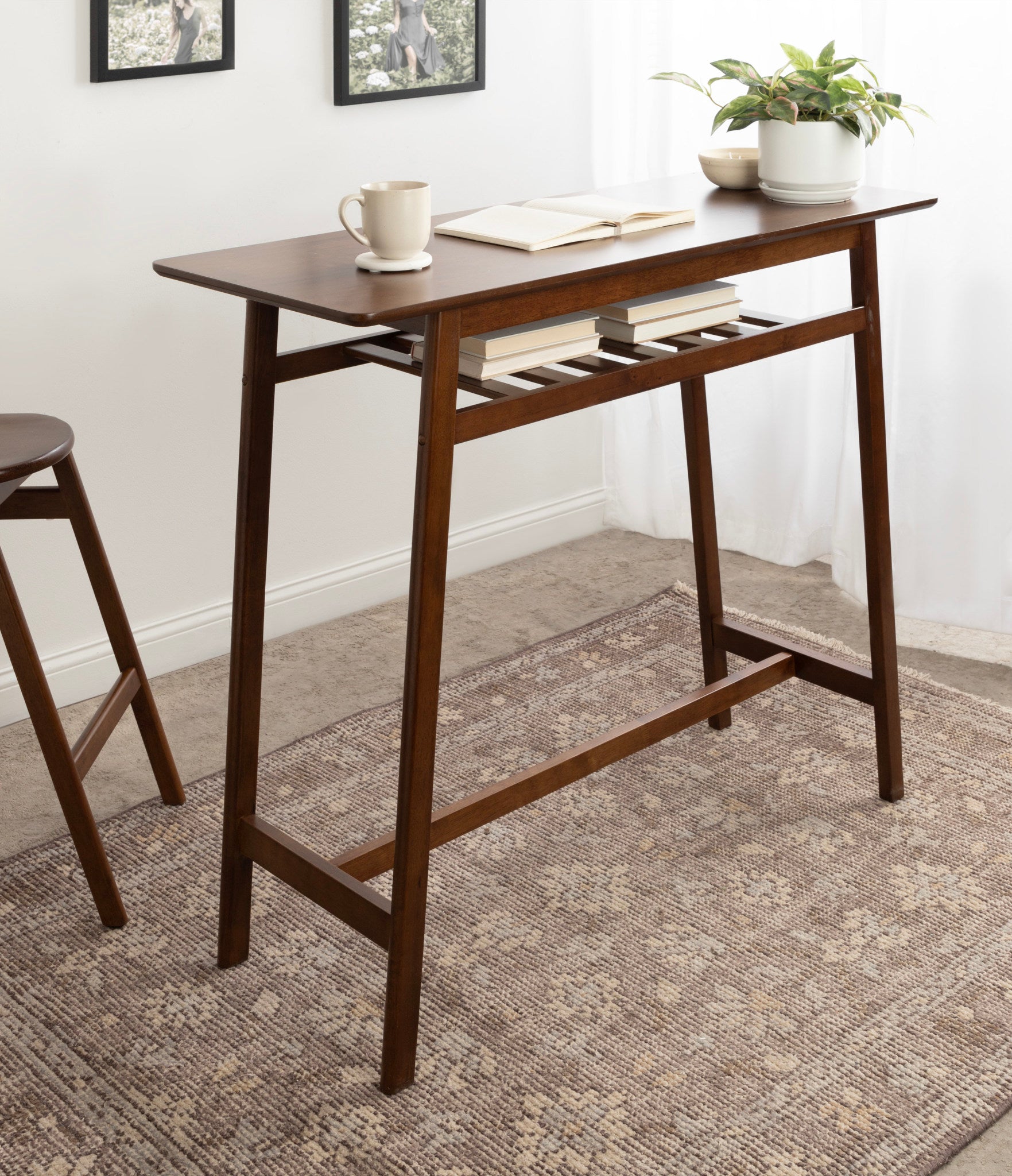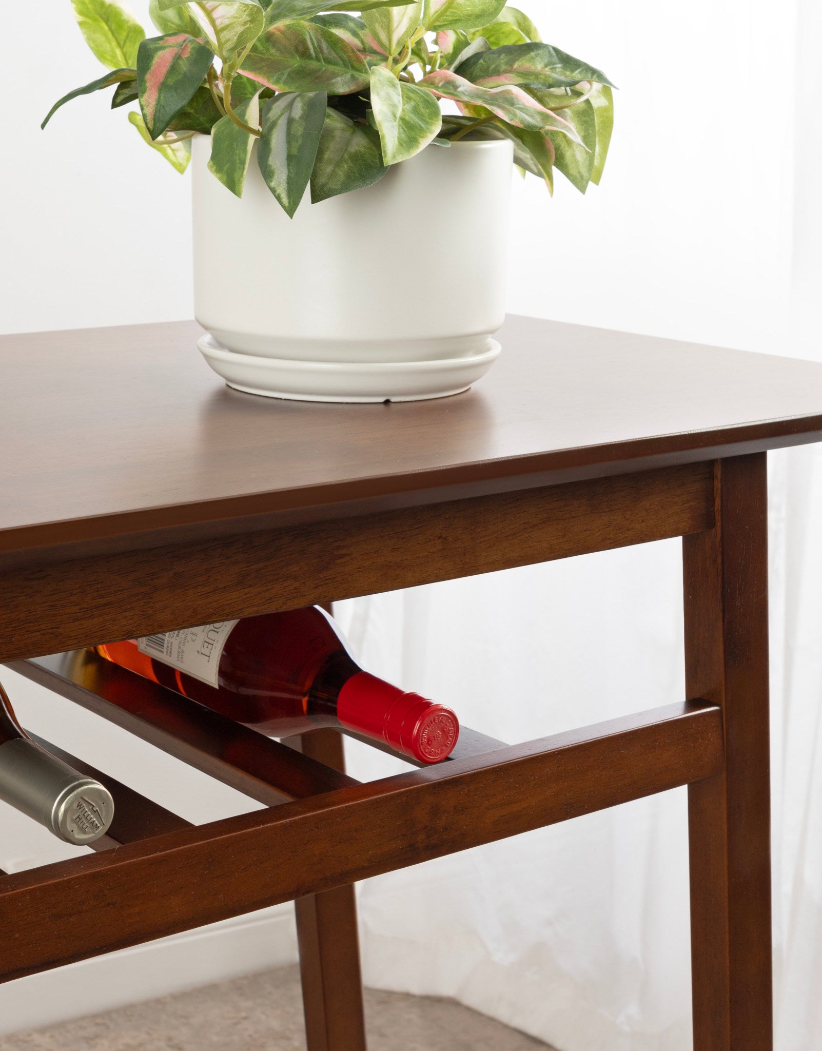Upgrade your home decor with this bold modern pub table. This timeless rectangle table is constructed solidly with a sturdy base and rectangular shape. Use this sophisticated table in a home office or craft room in your modern home. Pair the table with some barstools and use it as your dining table in a smaller apartment. Or, utilize this as a lovely standing computer desk if you're looking for the perfect versatile table to handle many different situations. The underlying shelf has slots for easy and convenient storage of some bottles of wine.