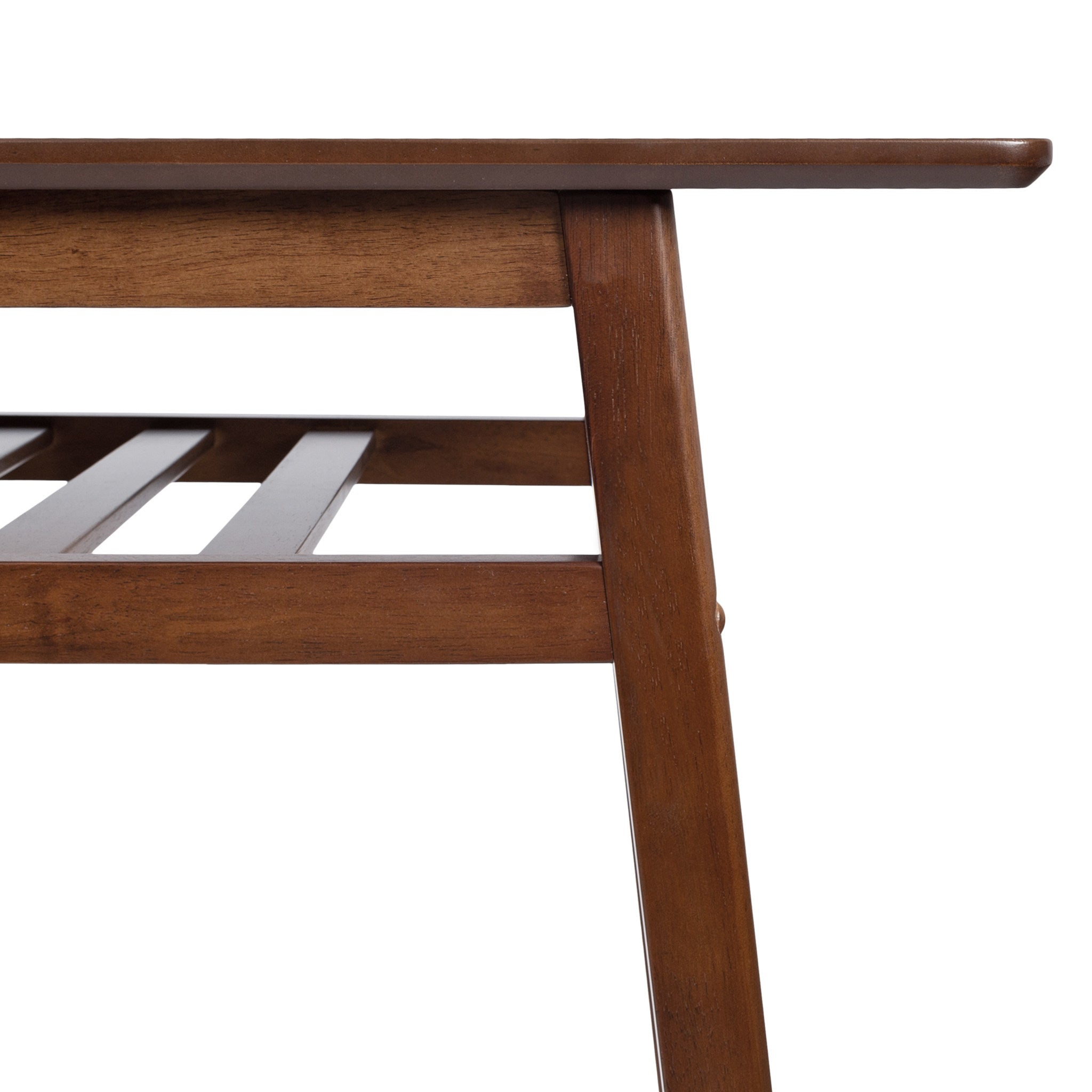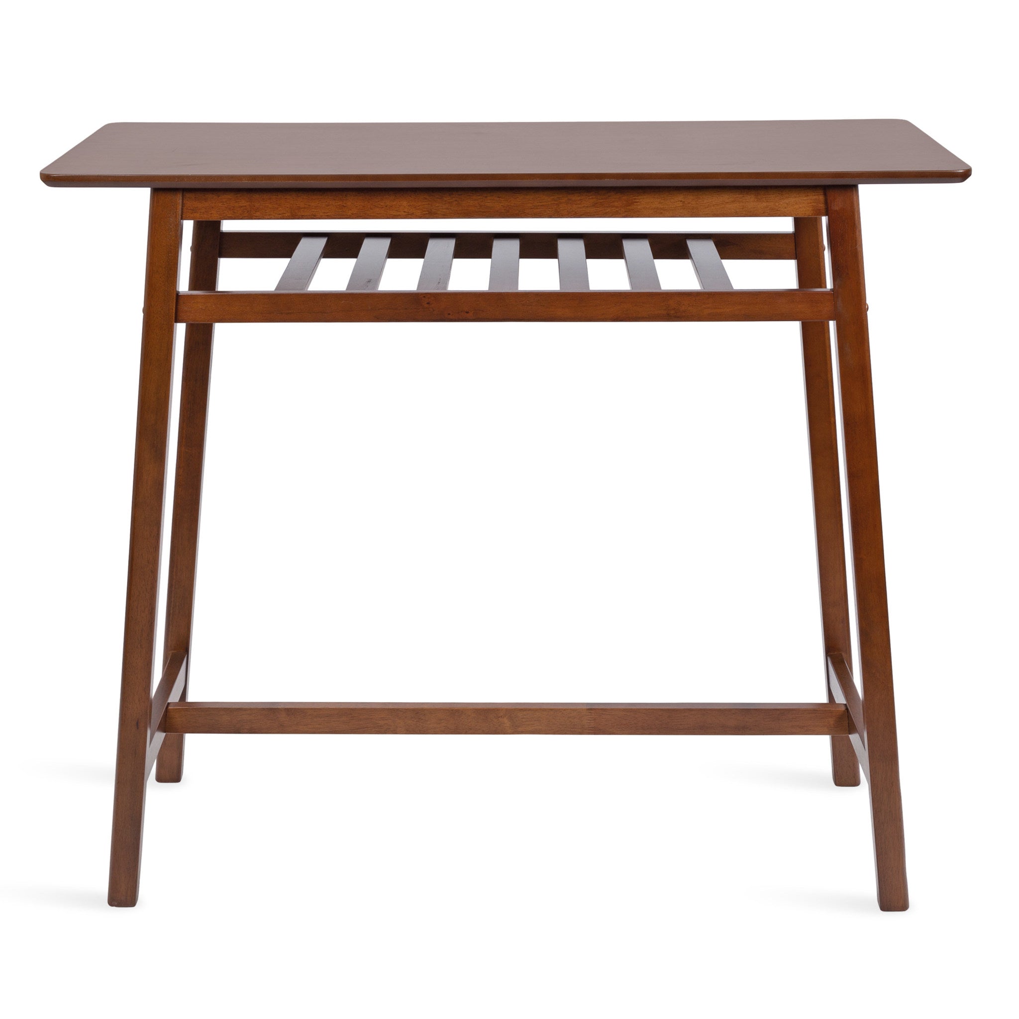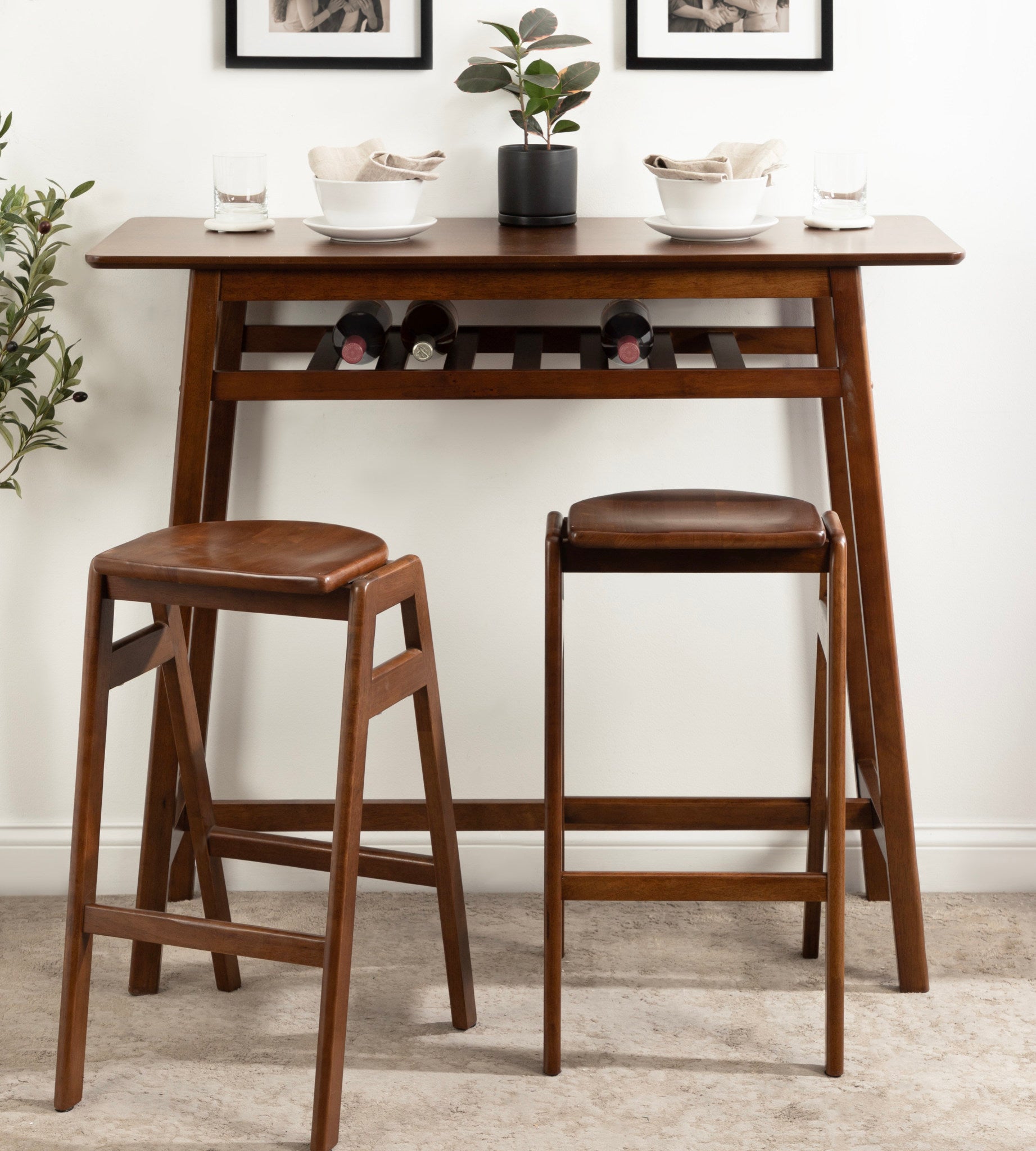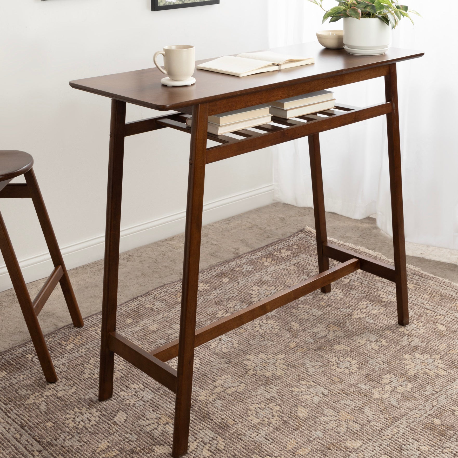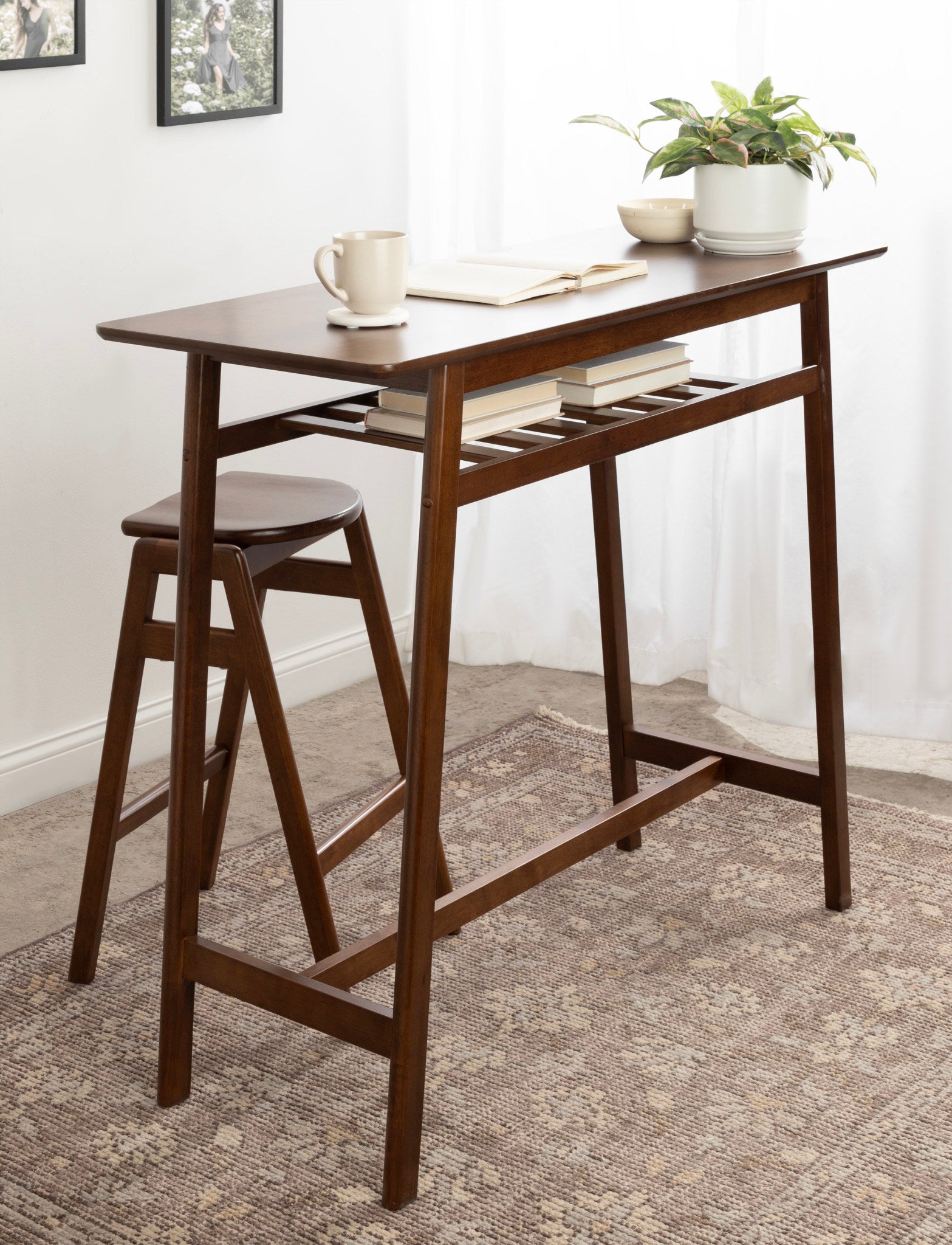 Upgrade your home decor with this bold modern pub table. This timeless rectangle table is constructed solidly with a sturdy base and rectangular shape. Use this sophisticated table in a home office or craft room in your modern home. Pair the table with some barstools and use it as your dining table in a smaller apartment. Or, utilize this as a lovely standing computer desk if you're looking for the perfect versatile table to handle many different situations. The underlying shelf has slots for easy and convenient storage of some bottles of wine.