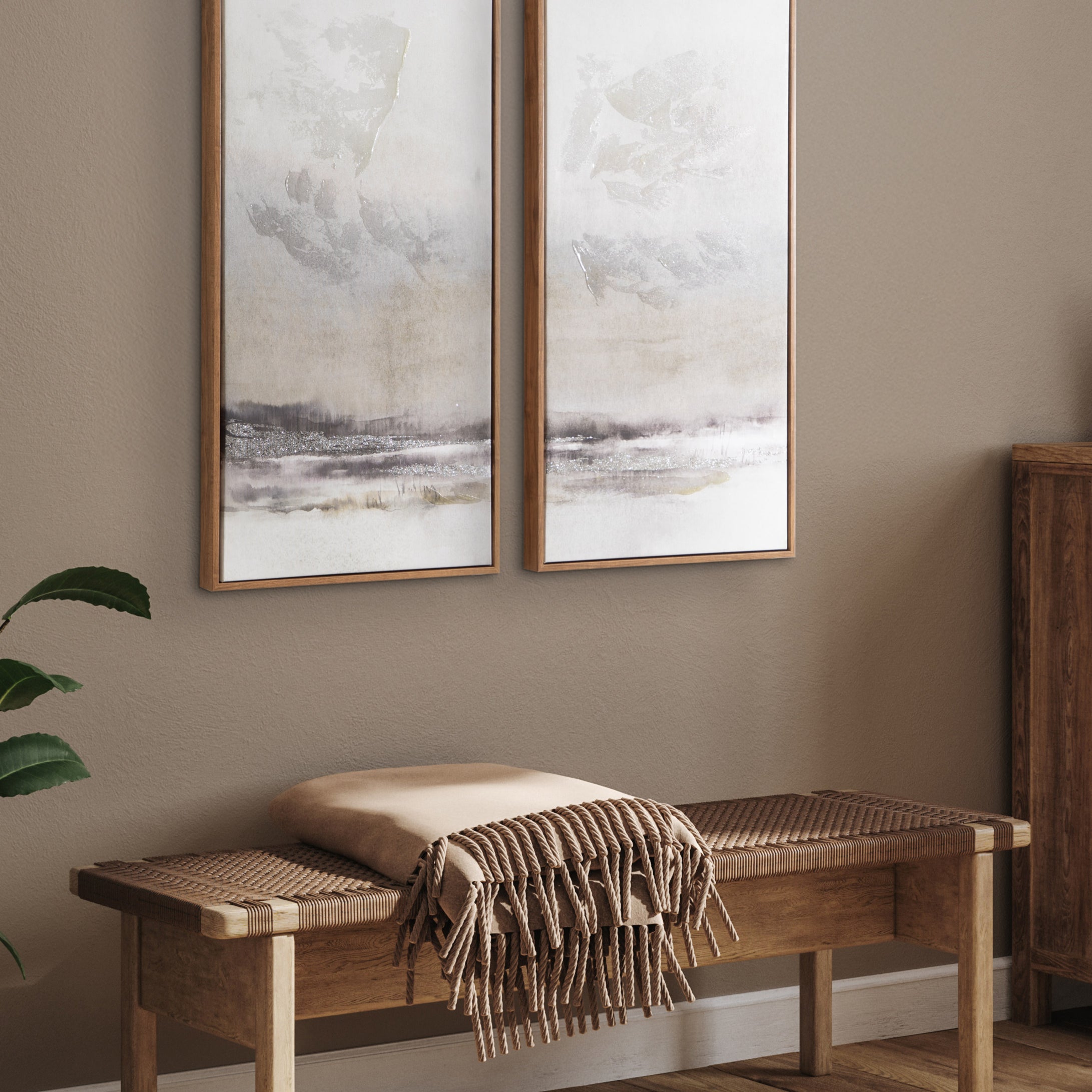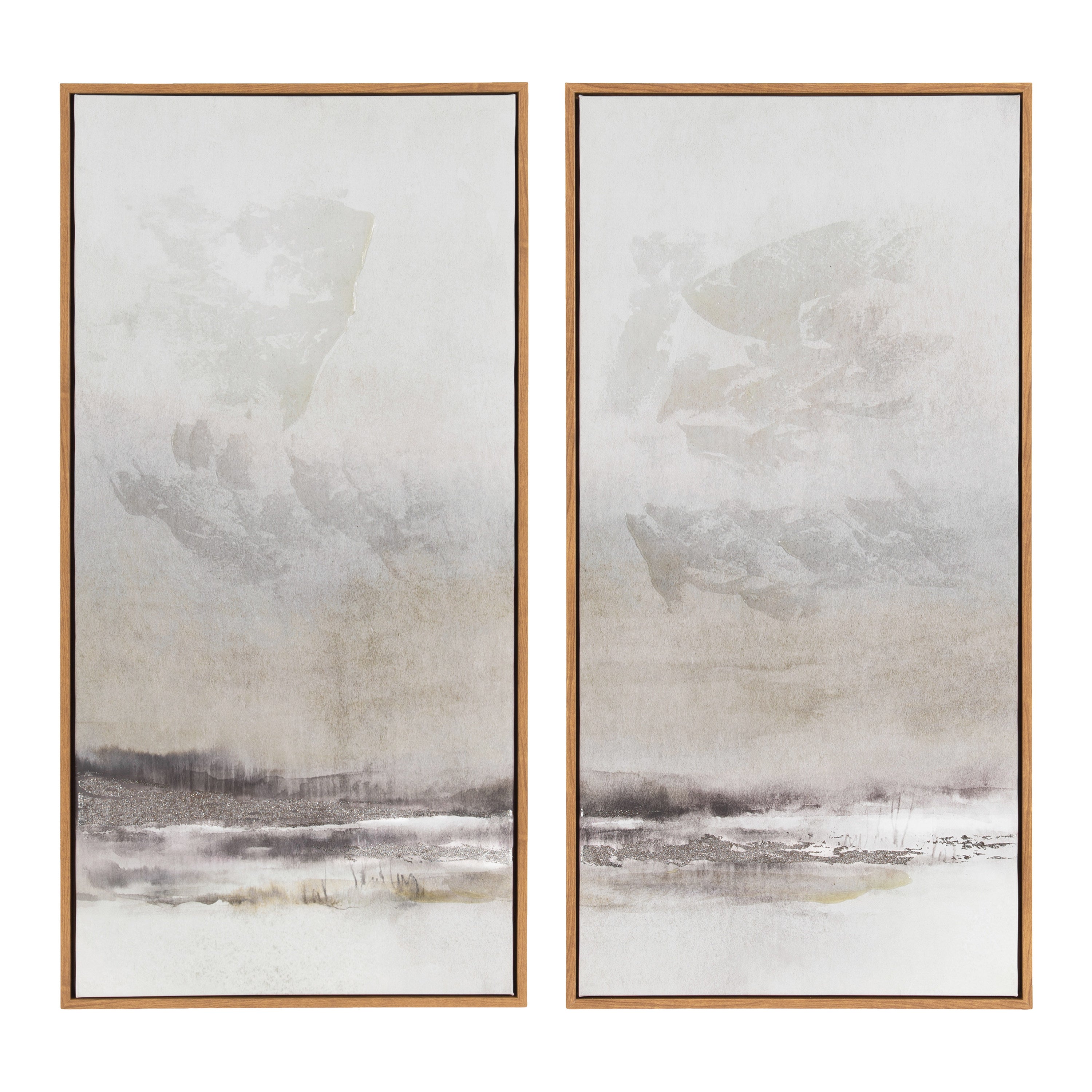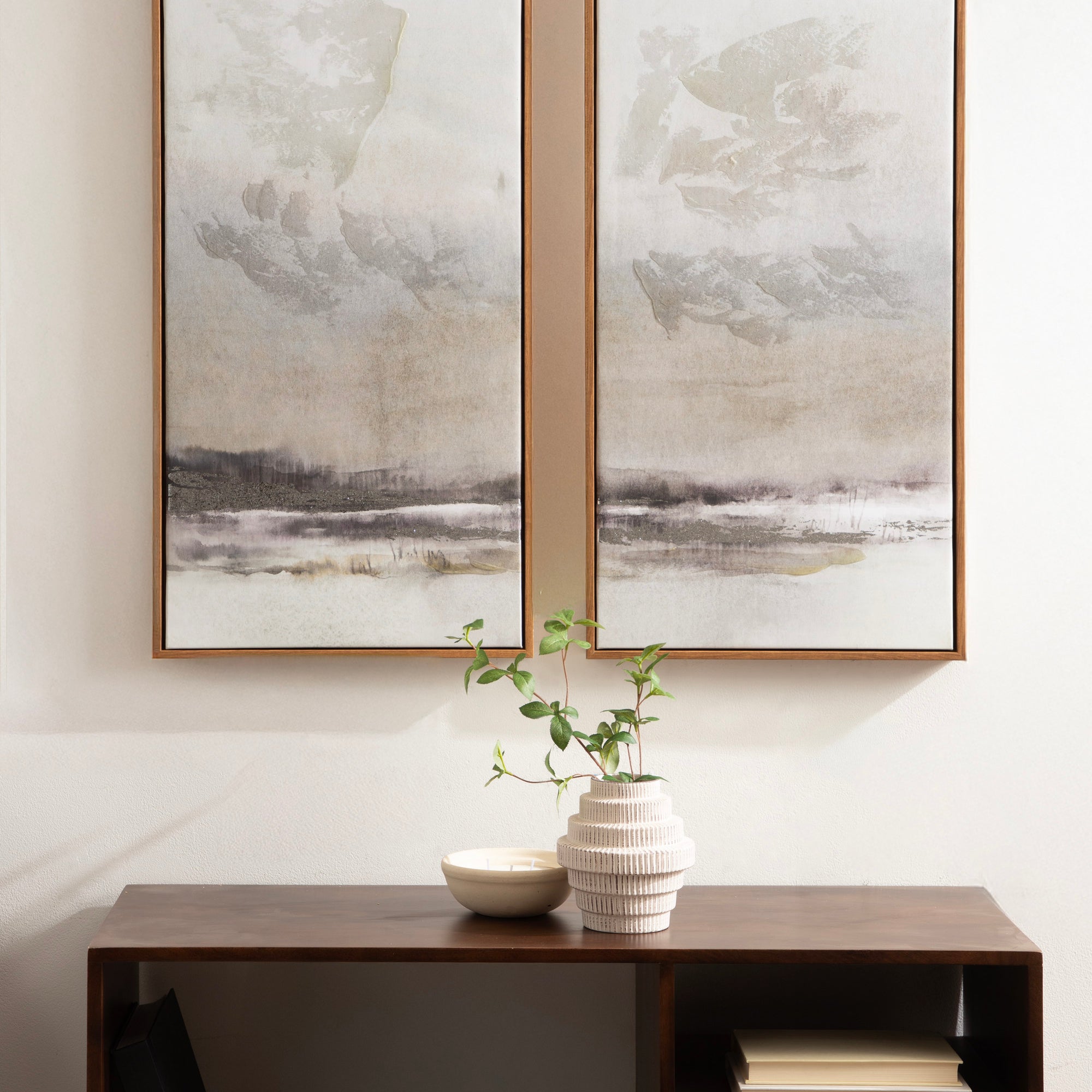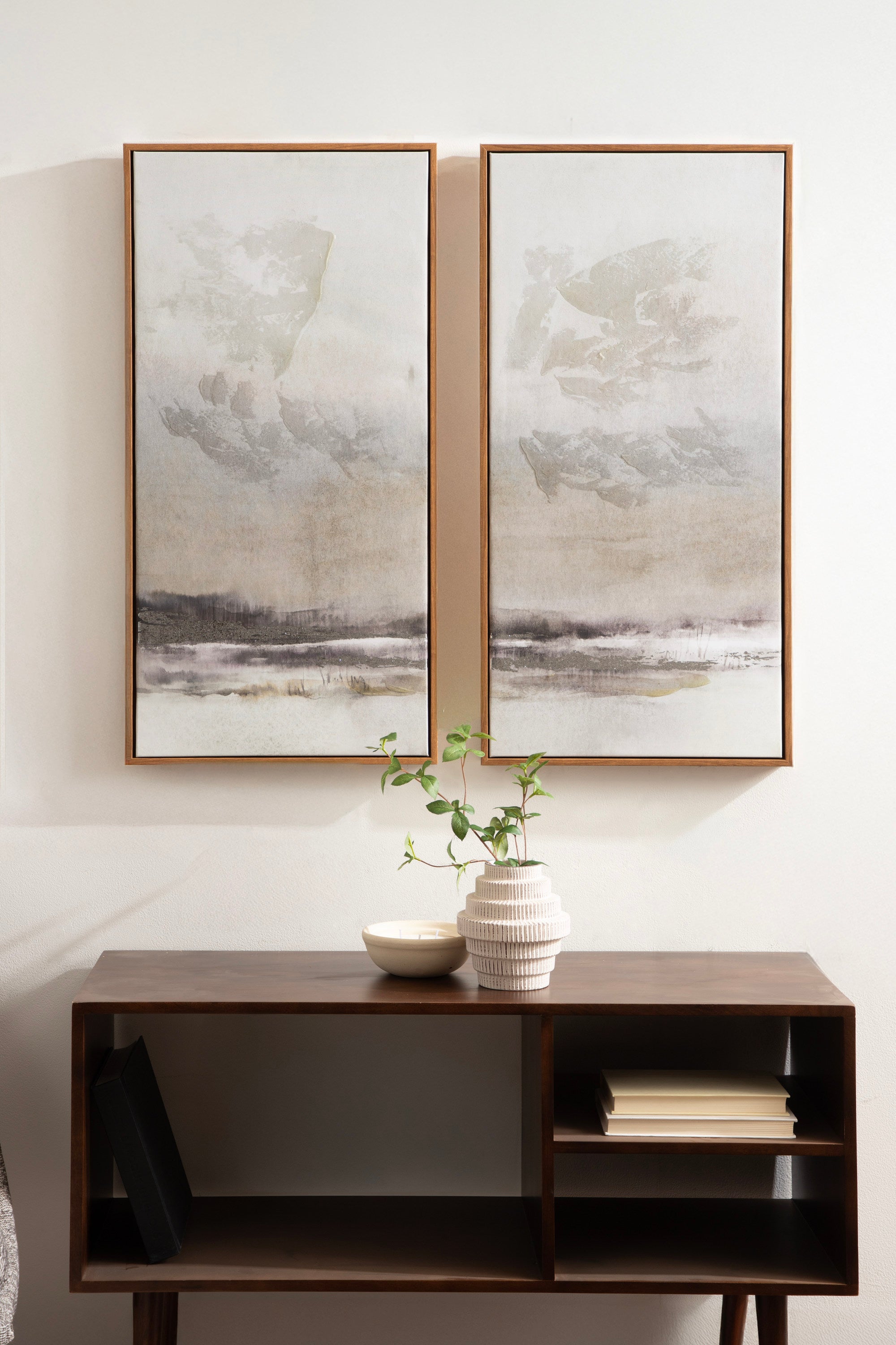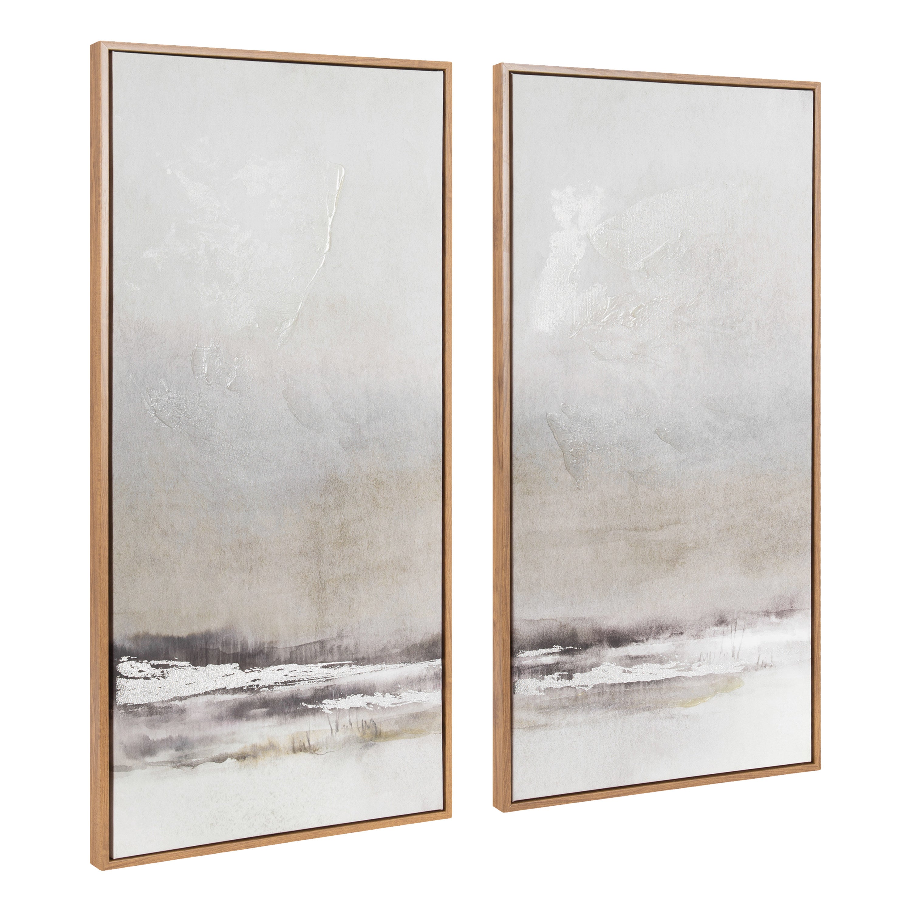 Bring a touch of serenity and modern sophistication to your home with this two-piece framed canvas art set from Kate and Laurel. This unique and captivating art set embodies the harmony between natural elements and contemporary artistry, creating a calming yet intriguing focal point for any room in your home. The soft watercolor painting adds texture to your wall and some metallic accenting within the brushstrokes. Whether you're looking to add visual interest to your bedroom, create a welcoming atmosphere in your entryway, or enhance the aesthetic of your living room, this two-piece abstract landscape set will elevate your décor with its subtle yet striking beauty. Bordered by a polystyrene modern gallery style frame, the artwork is adequately framed with design and function in mind.