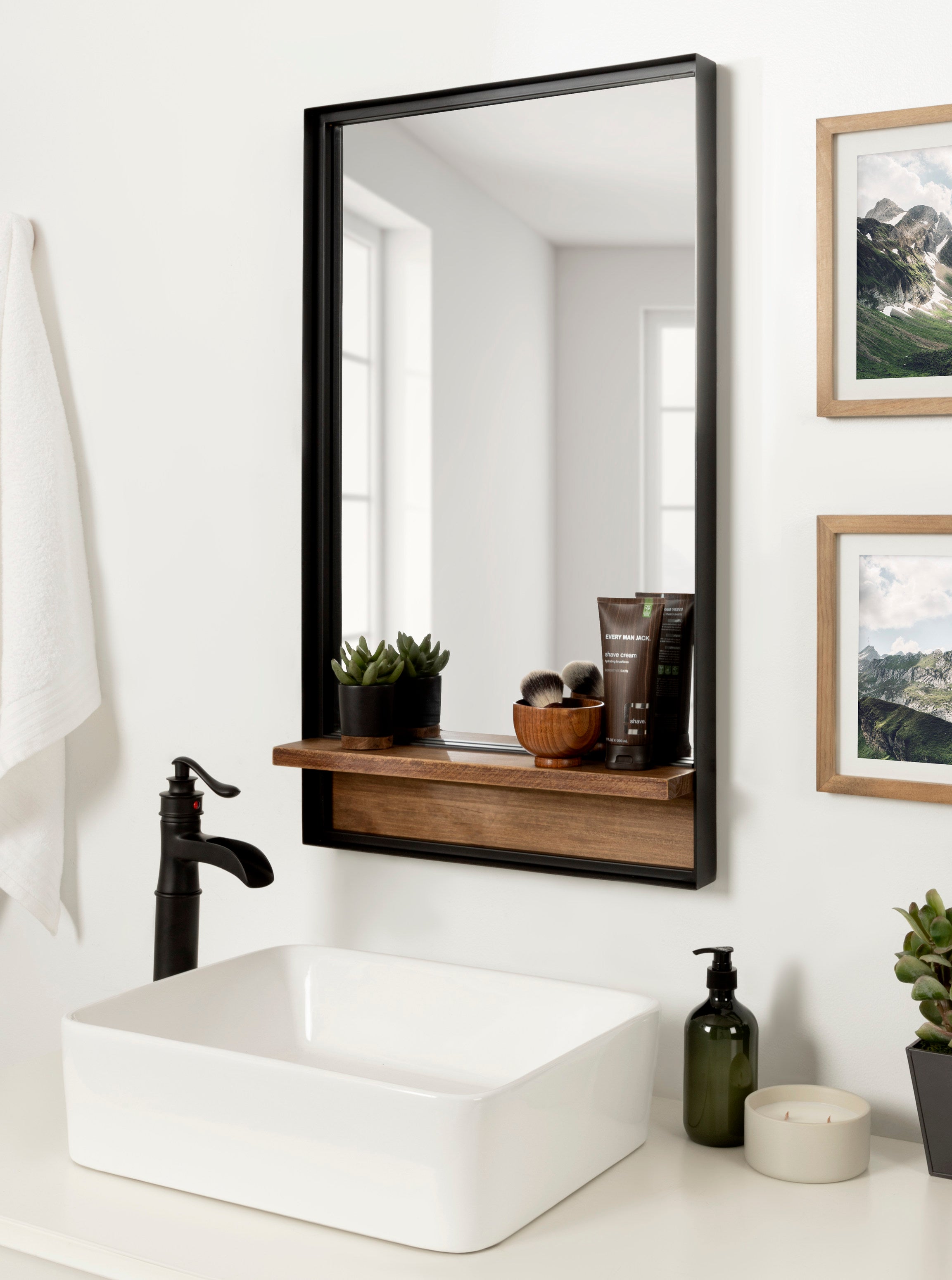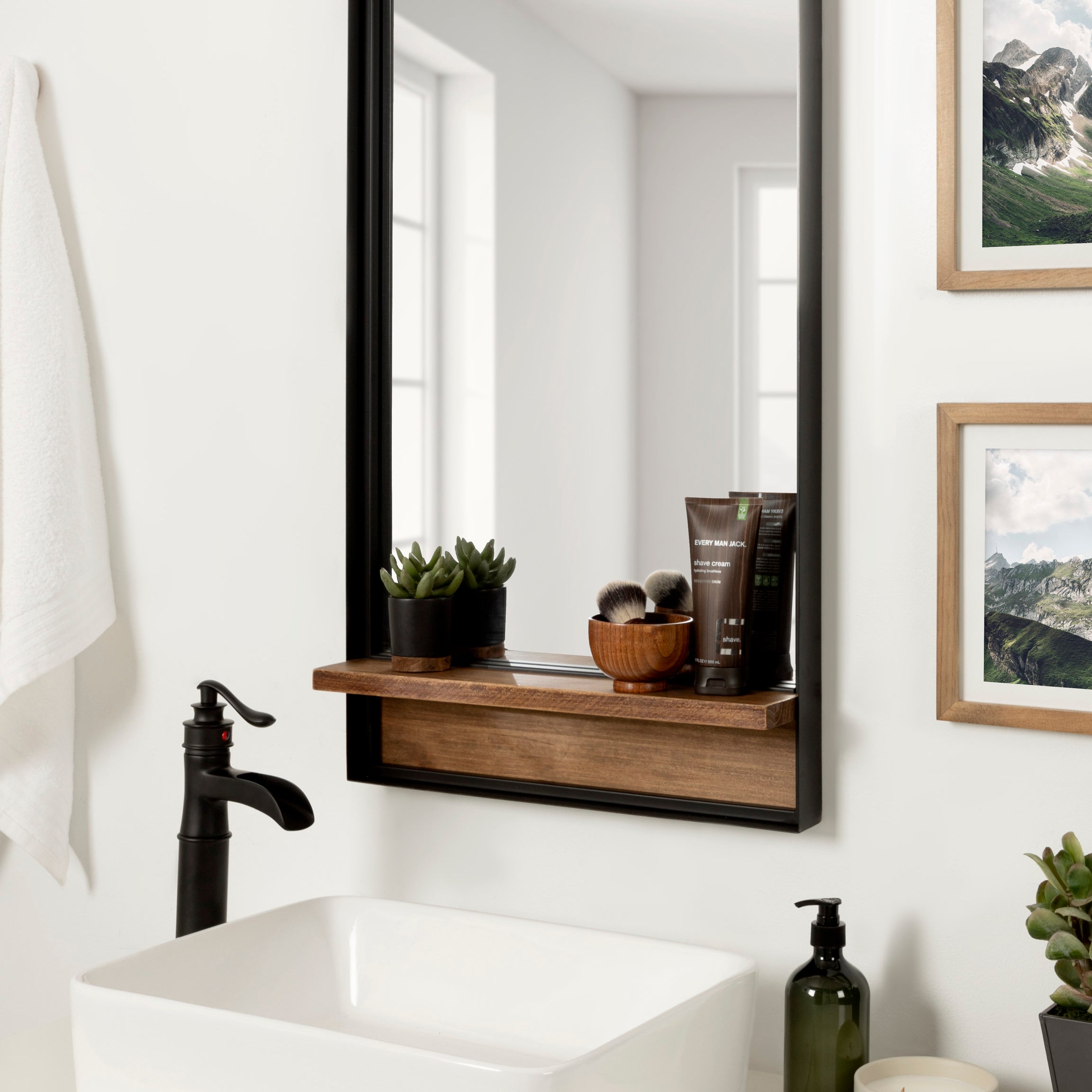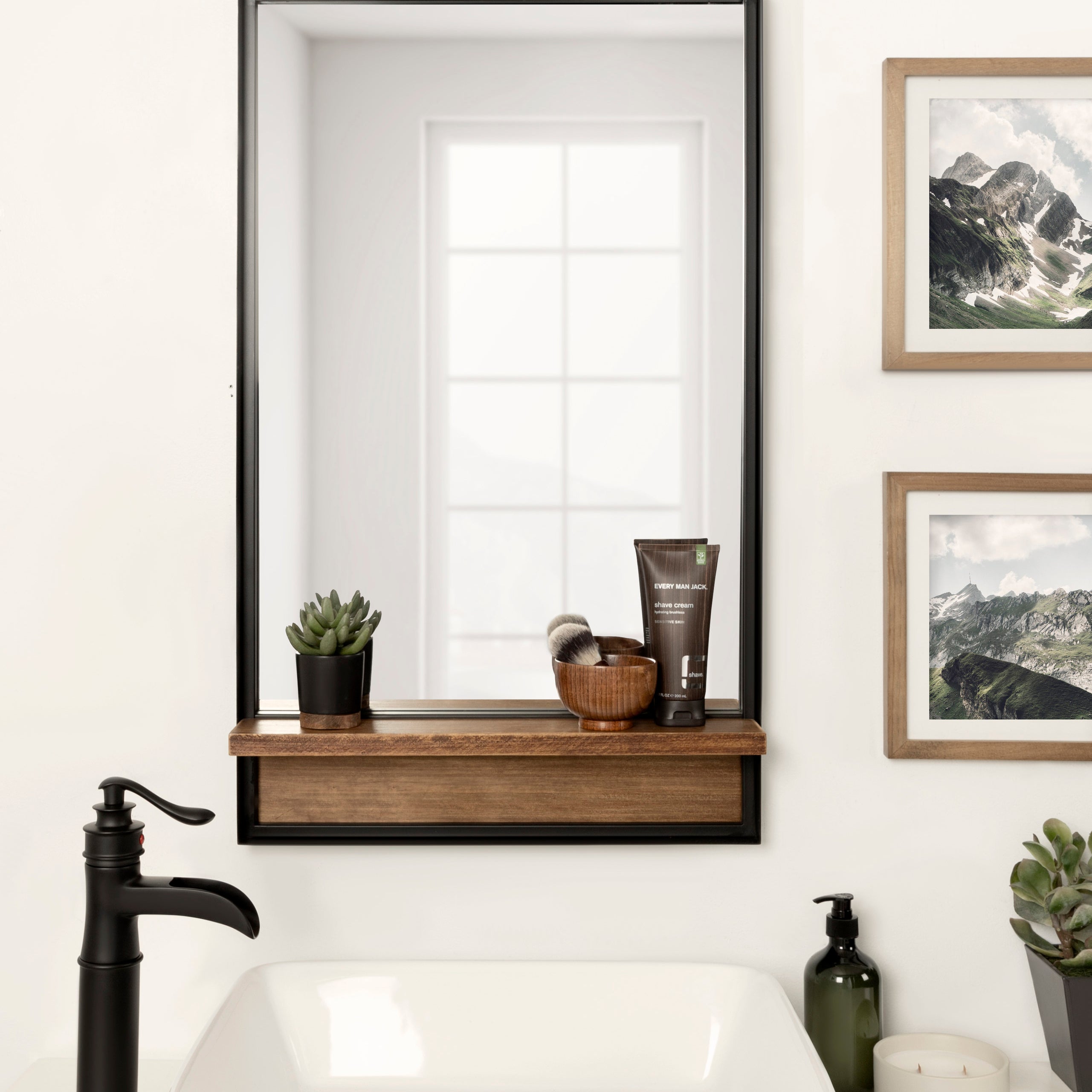 The Owing mirror charms with its farmhouse design, sturdy metal frame, and solid wooden shelf, creating a gorgeous look that will upgrade any wall decor. This mirror makes an eye-catching exhibit with its rectangular frame and solid wood shelf, storing your favorite accent pieces while acting as a commanding focal point for your wall decor. It's a fantastic element for introducing modern farmhouse design and multifunctionality to your space. In addition, the handy shelf presents the perfect place for displaying candles, photographs, decorative accents, holiday decor, etc.