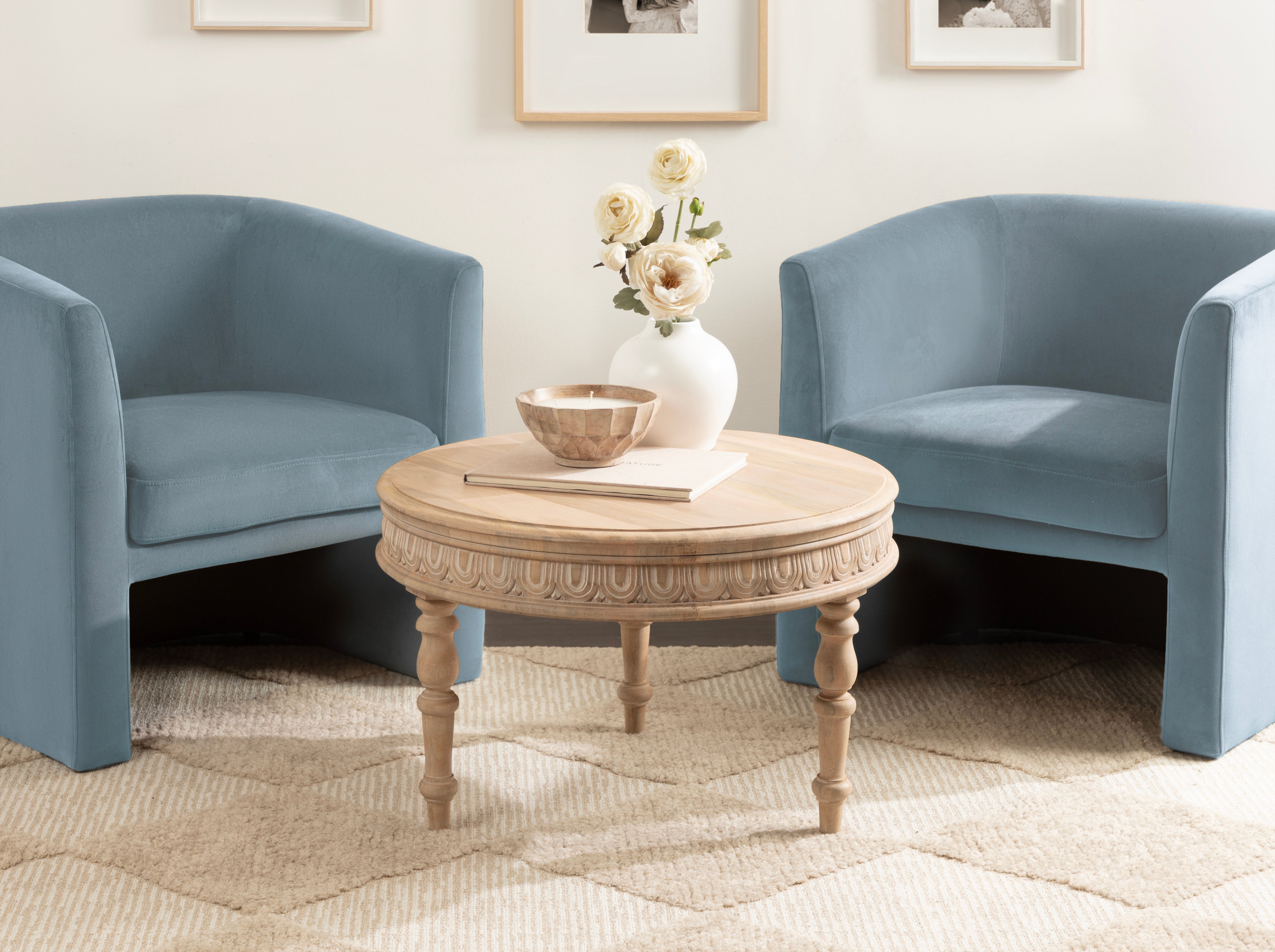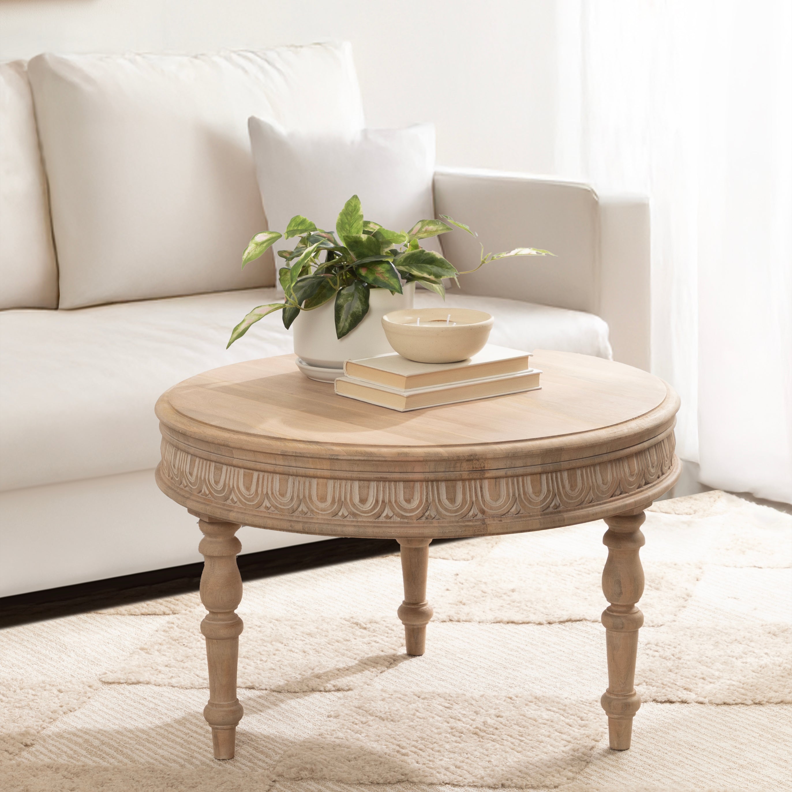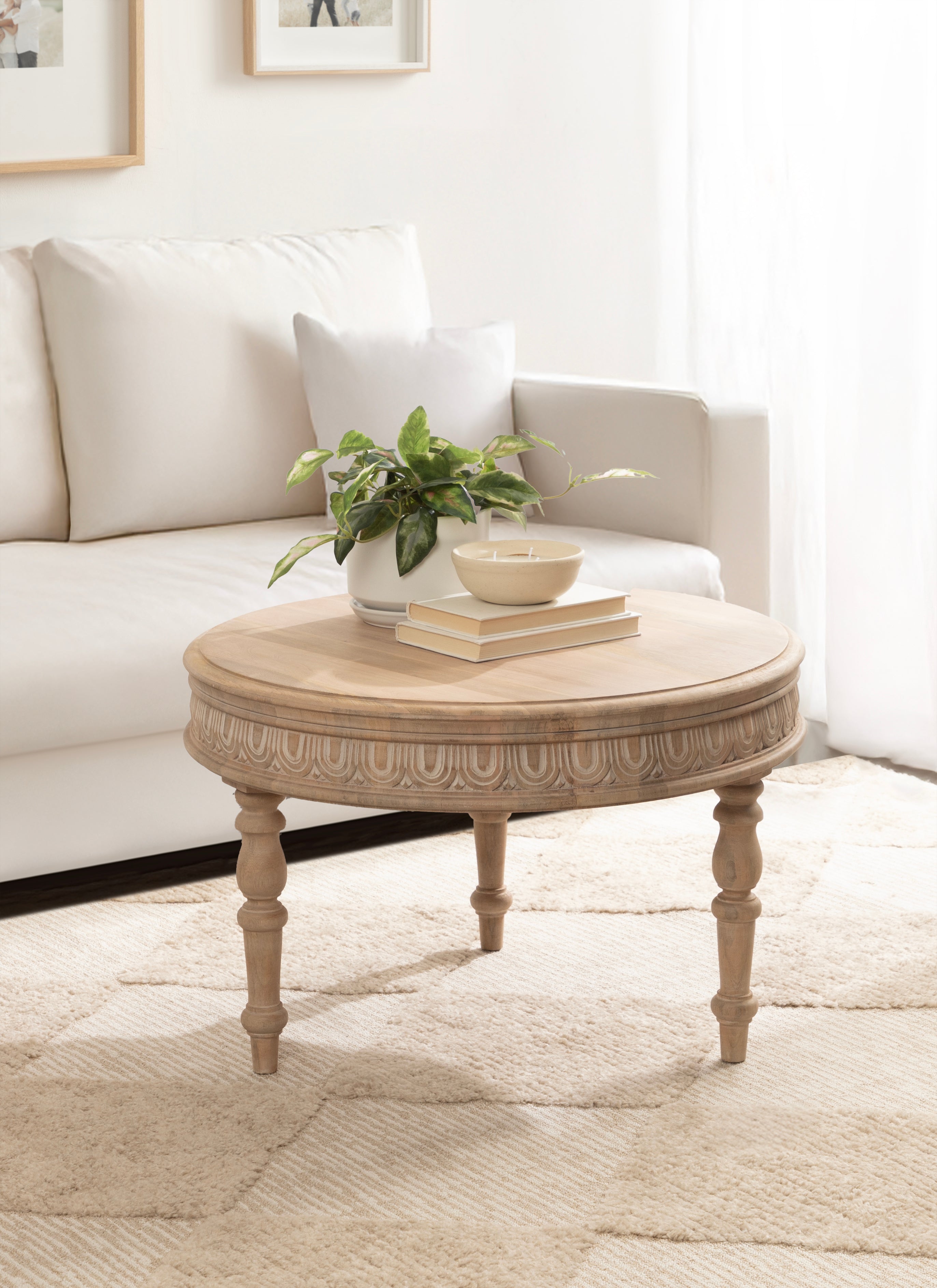 Showcase your transitional-inspired style with the Patresa round coffee table from Kate and Laurel. The rich and elegant finish of the wood adds a touch of sophistication to any space, while the ornate texture of the design adds character to your space. The finish also lends itself to organic modern design, giving it that look of transitional, timeless decor. Gorgeous mango wood was used to create this beautiful coffee table, creating a statement that is as durable as it is beautiful. It is made of 100% solid mango wood with detailed carvings, giving your space a unique look and textural feel. The wooden tabletop is perfect for creating a lovely display area for candles, plants, and other accents. The traditional turned legs add a vintage, eclectic feel. Assemble this table in only a matter of minutes with a simple, two-step assembly process.