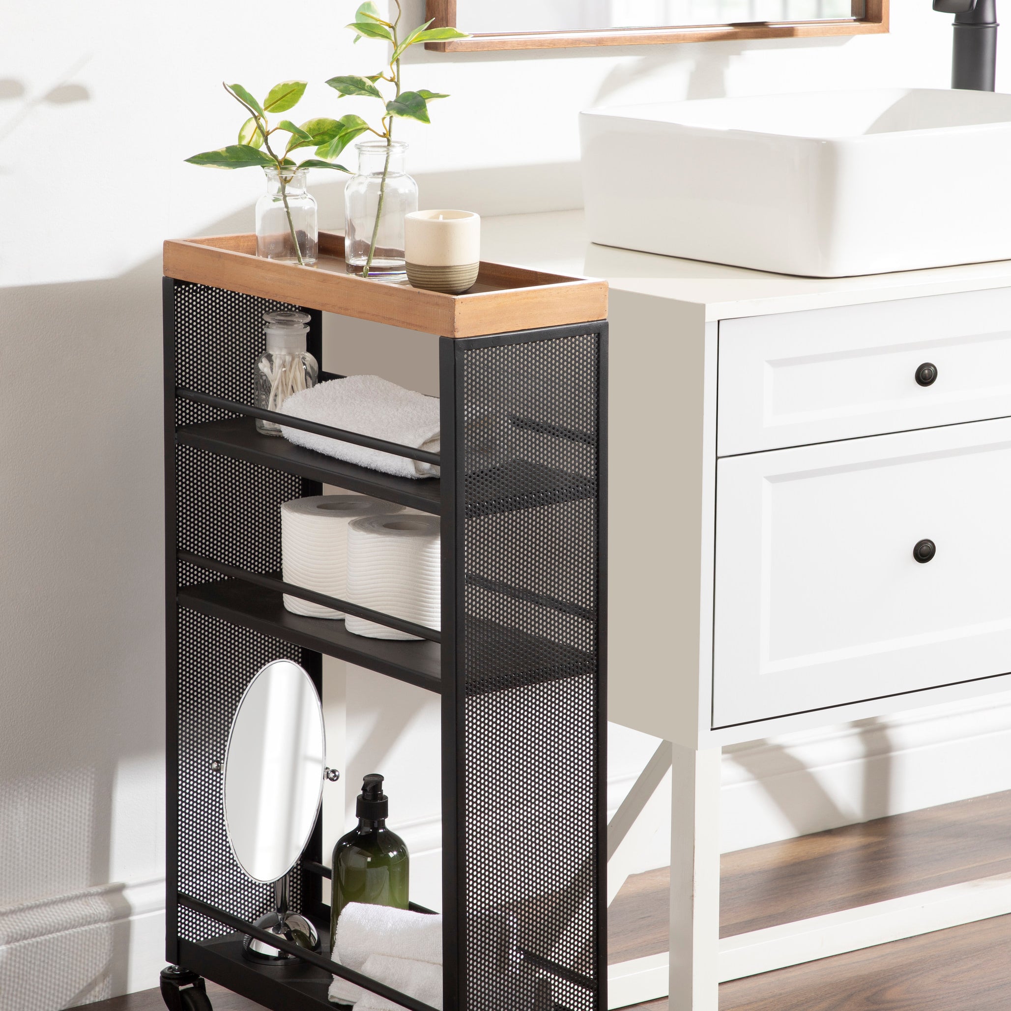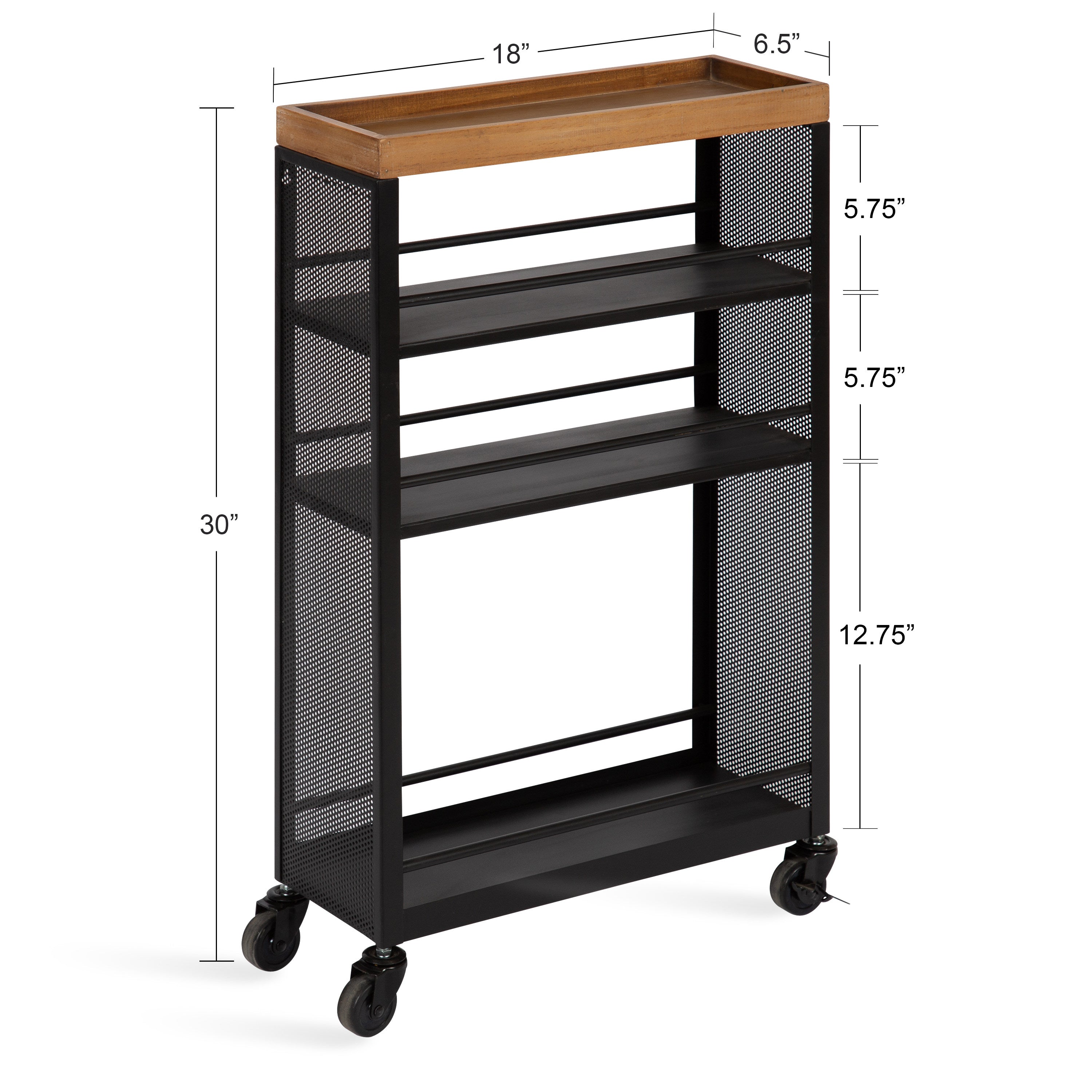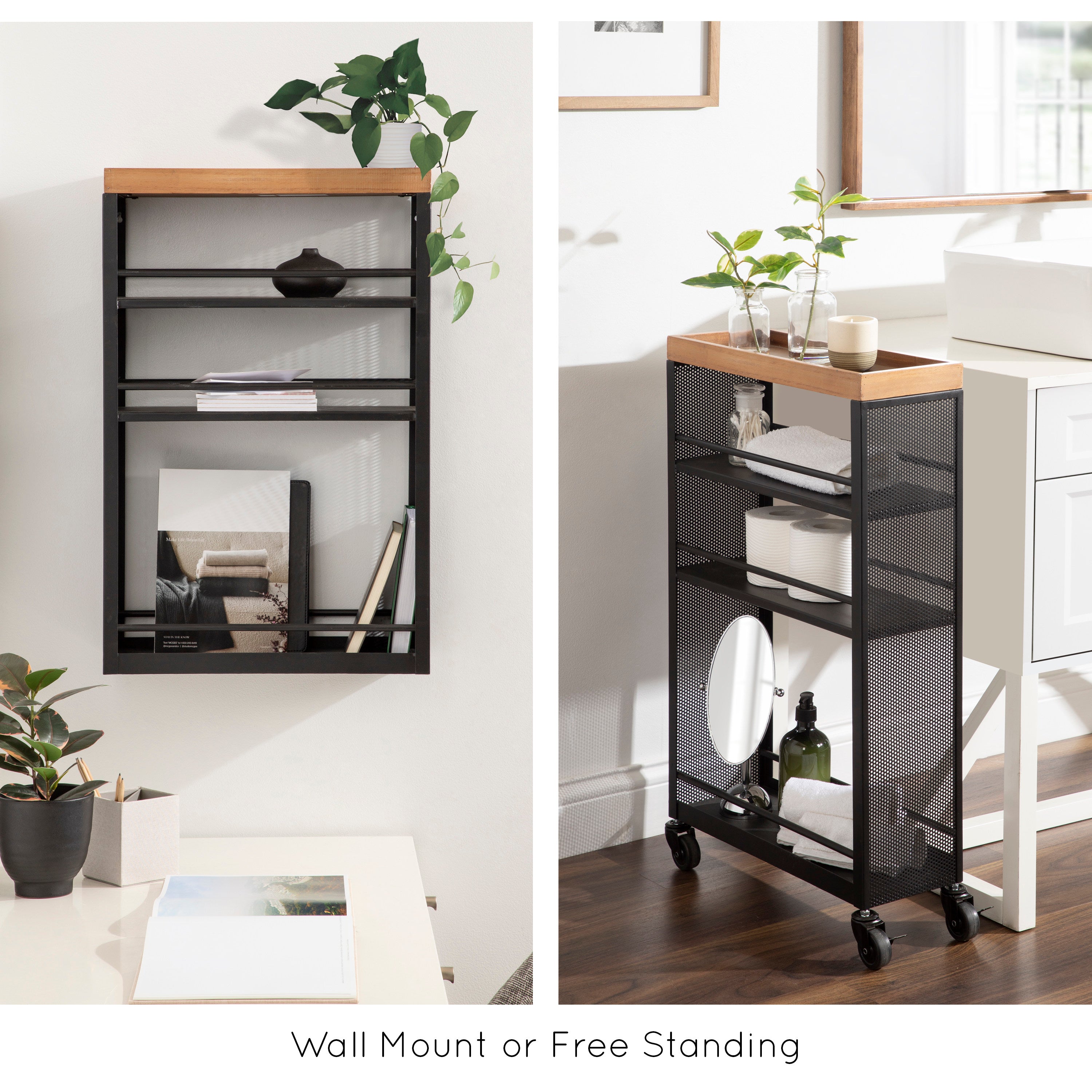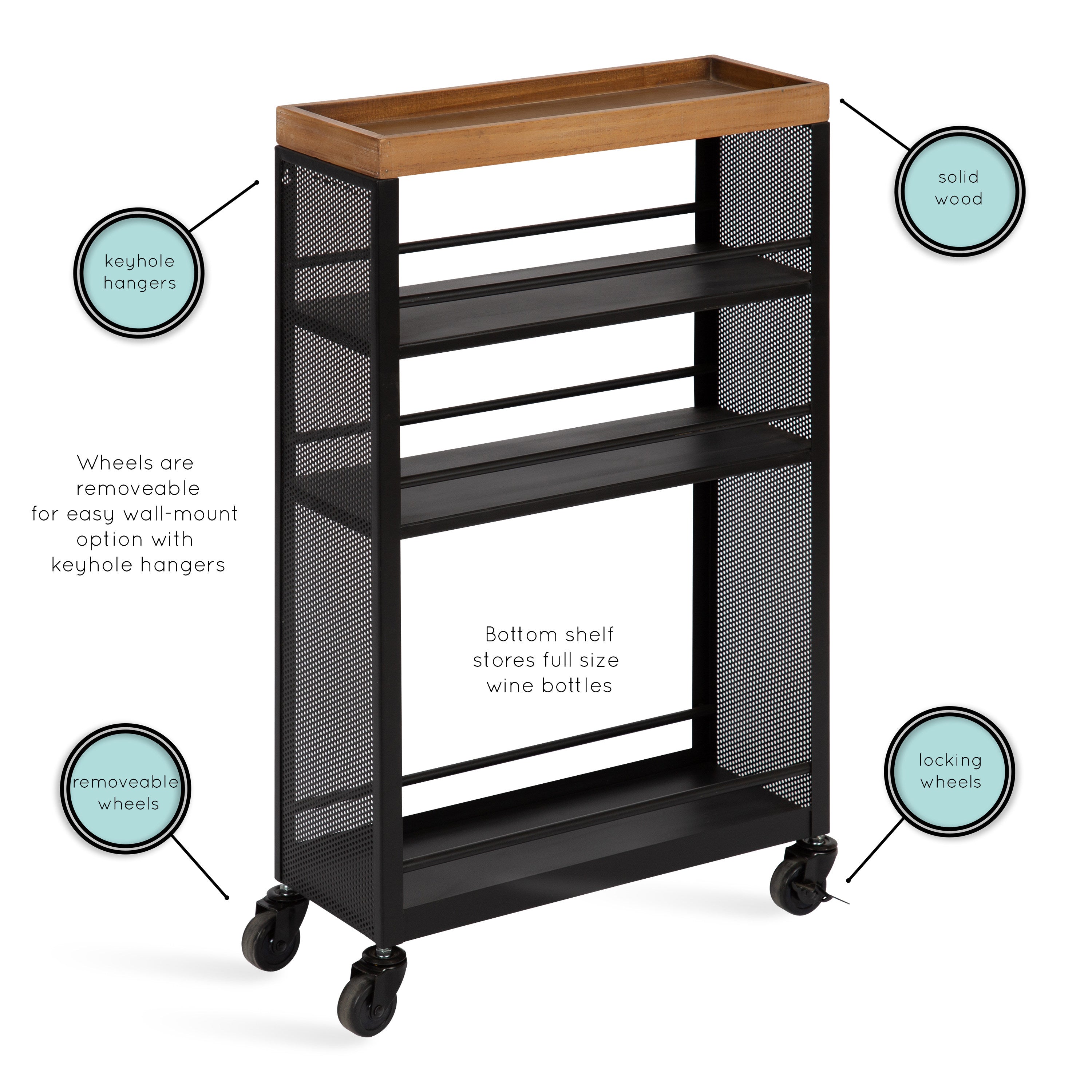 The narrow Piazza cart offers portable storage in a stylish and modern design. This lovely storage cart features three shelves with varied sizes, creating the space you need for glasses, non-perishable ingredients, wine bottles, office supplies, and even toiletries! To add visual intrigue and sophistication, the top shelf of this sleek bar cart is made from wood, creating a perfect top tier for showcasing accents, wowing with colorful cocktails, or serving plated appetizers. This rolling bar cart does it all without taking up space, creating a bold display piece with robust function. Want to save even more floor space? You can mount this cart on the wall with its convenient keyhole hangers!