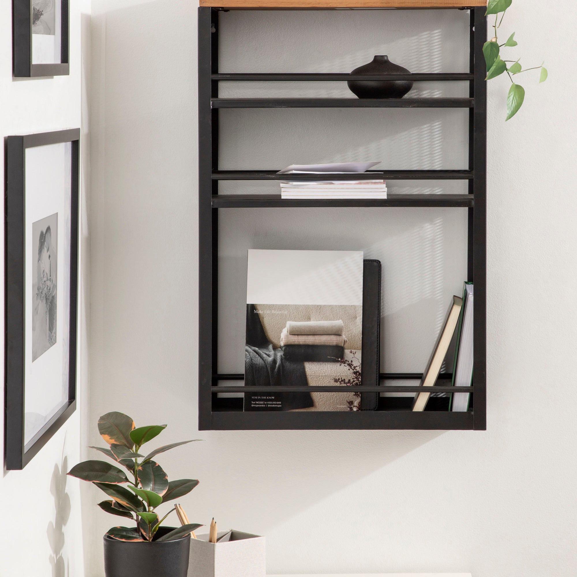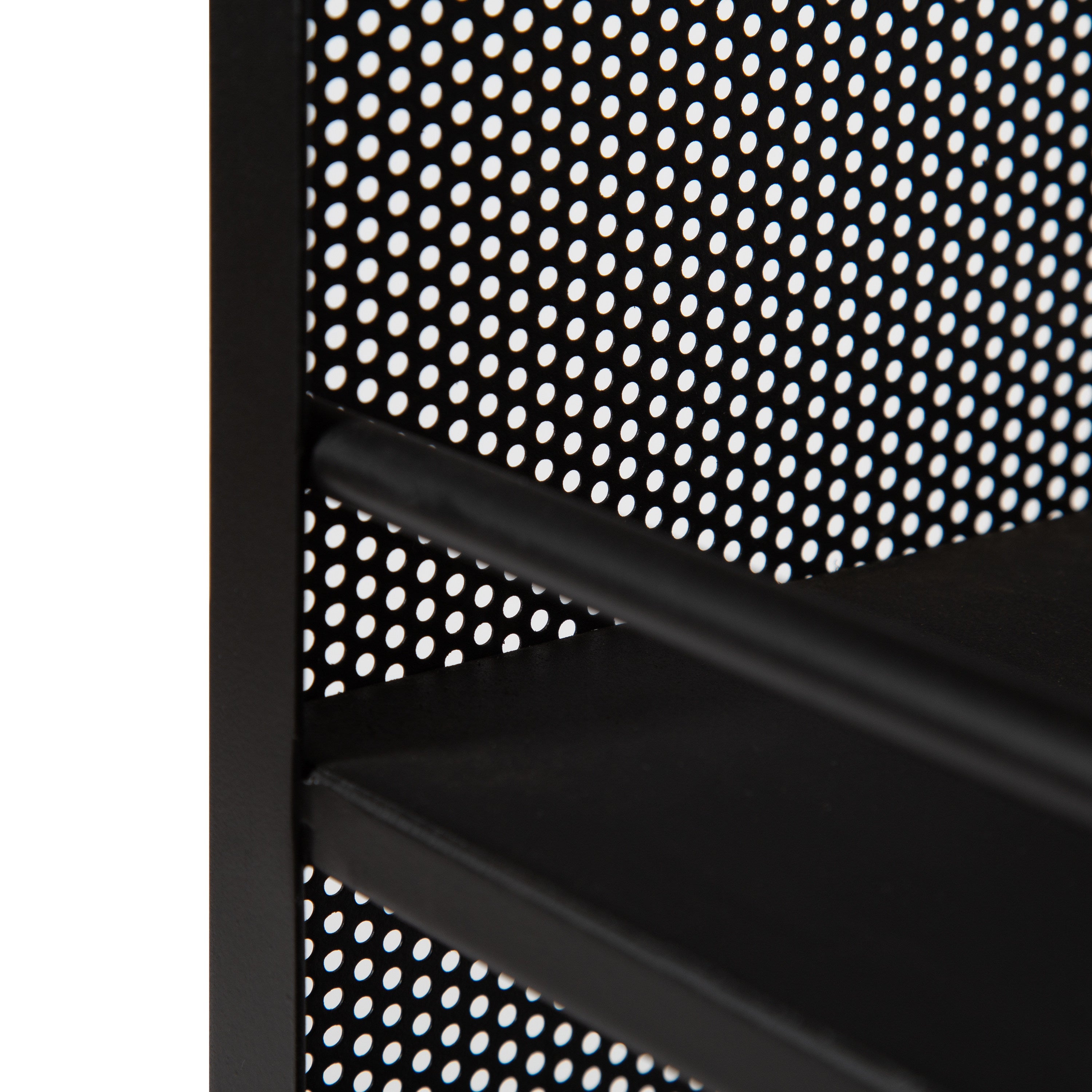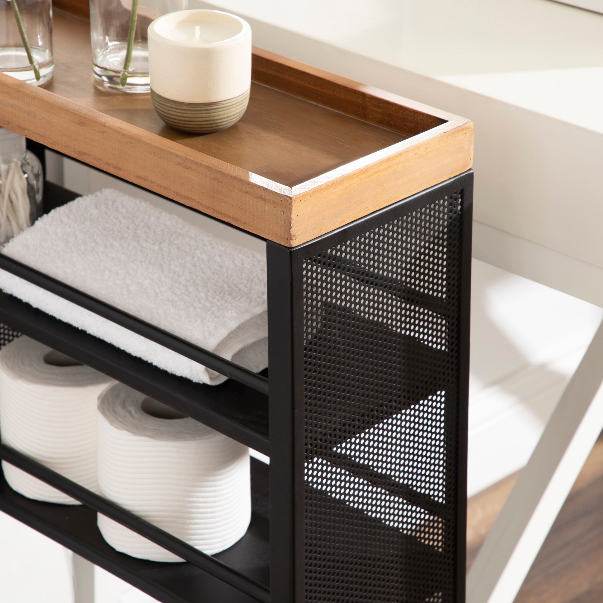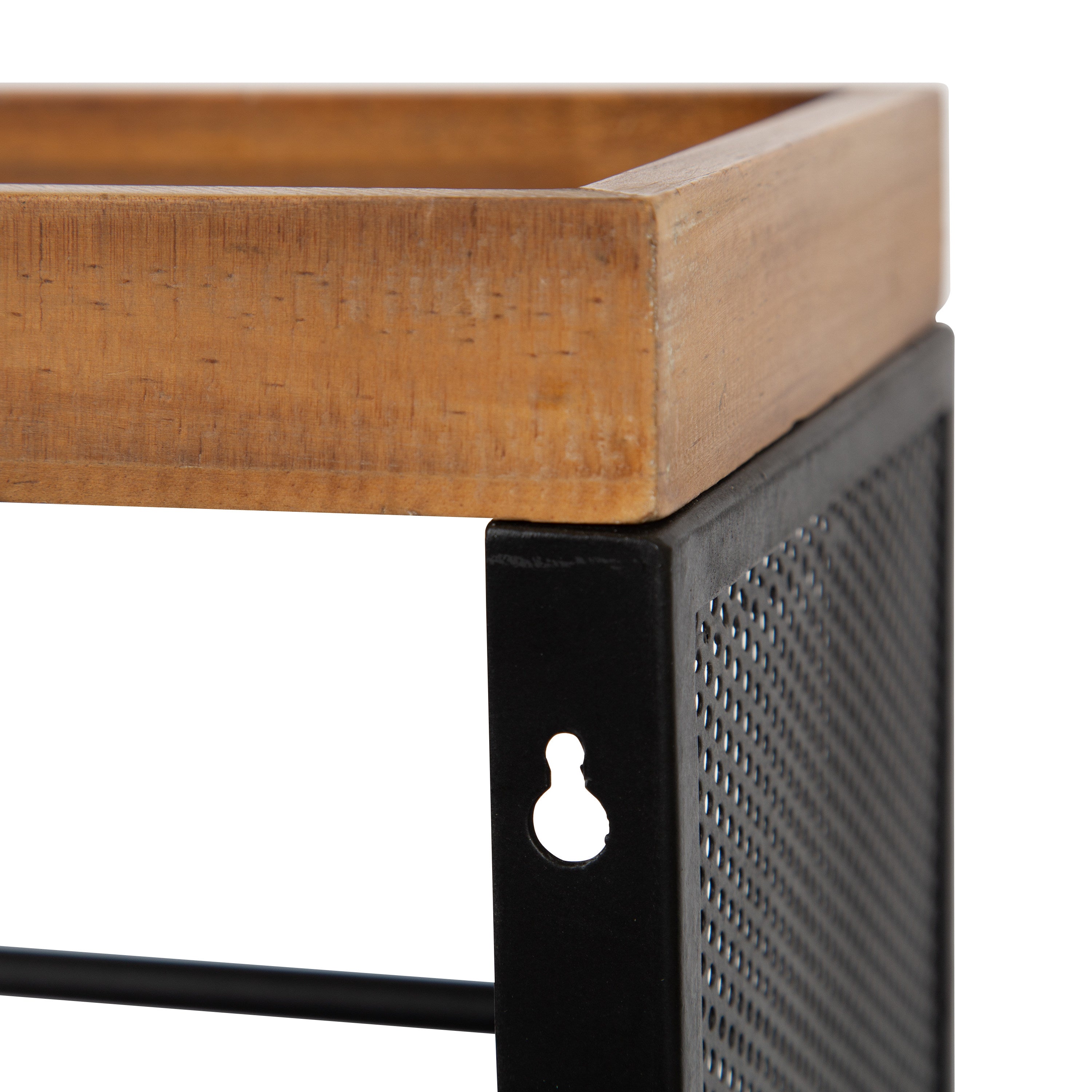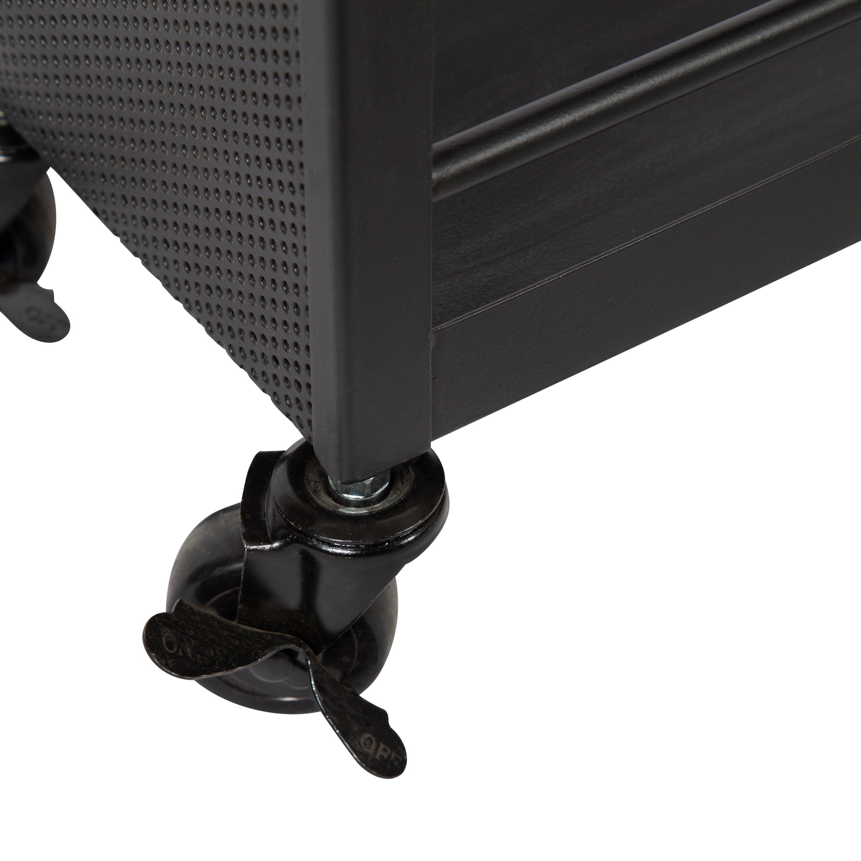 The narrow Piazza cart offers portable storage in a stylish and modern design. This lovely storage cart features three shelves with varied sizes, creating the space you need for glasses, non-perishable ingredients, wine bottles, office supplies, and even toiletries! To add visual intrigue and sophistication, the top shelf of this sleek bar cart is made from wood, creating a perfect top tier for showcasing accents, wowing with colorful cocktails, or serving plated appetizers. This rolling bar cart does it all without taking up space, creating a bold display piece with robust function. Want to save even more floor space? You can mount this cart on the wall with its convenient keyhole hangers!