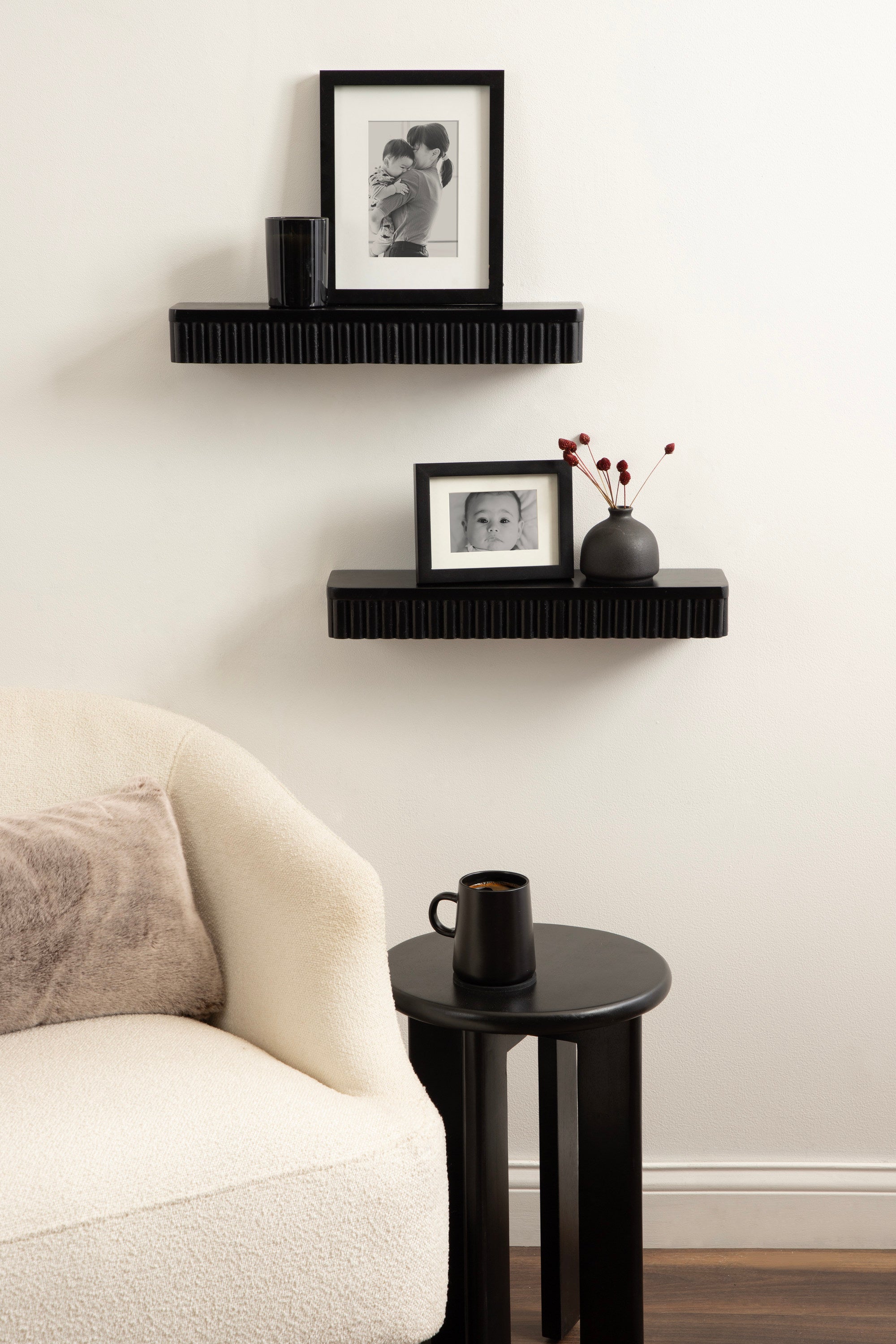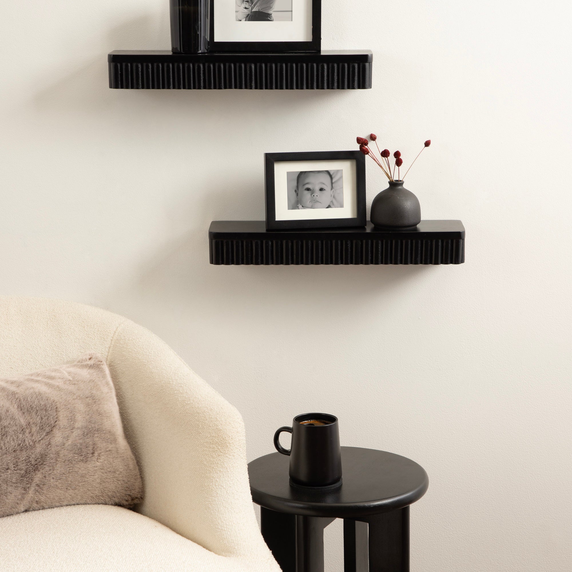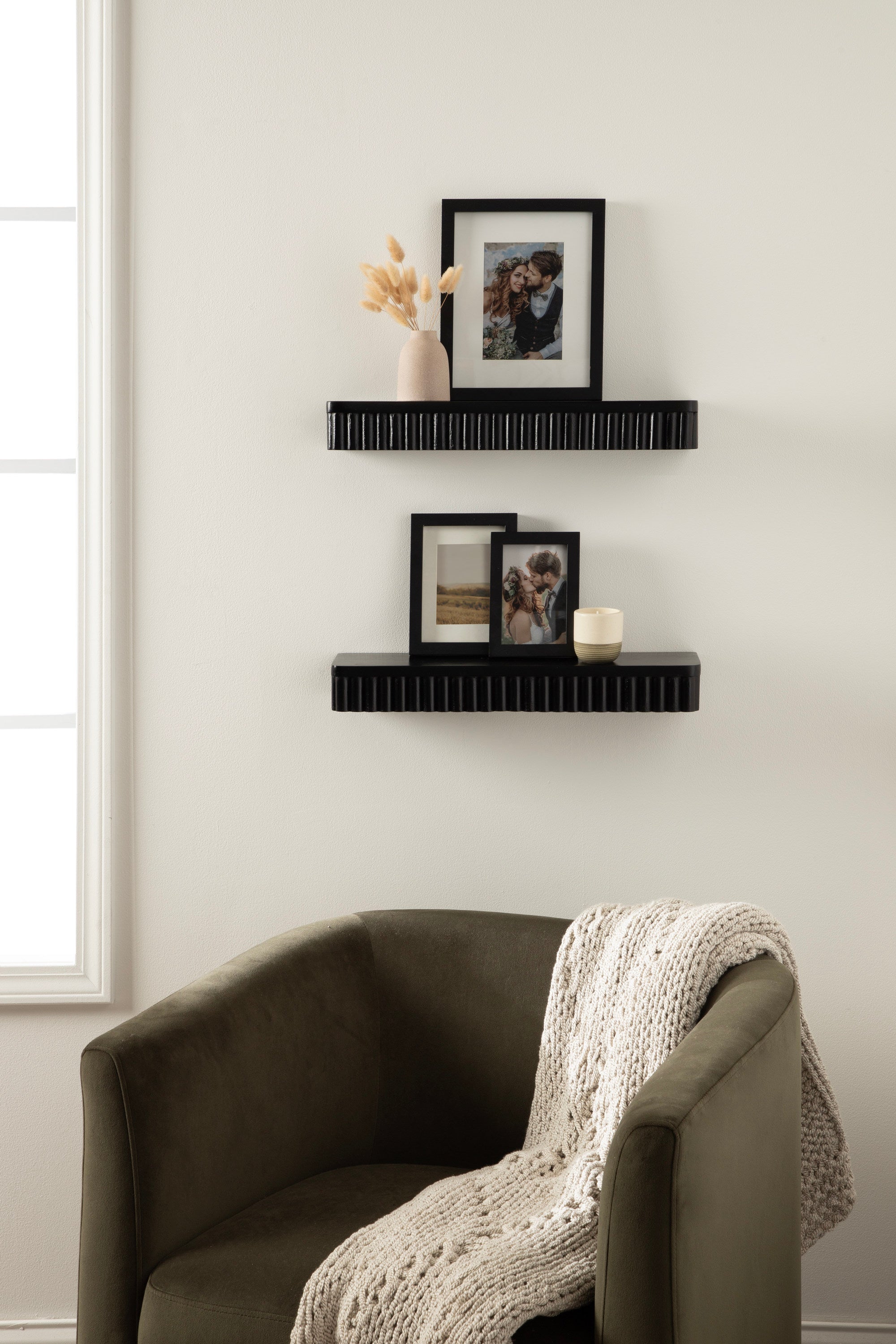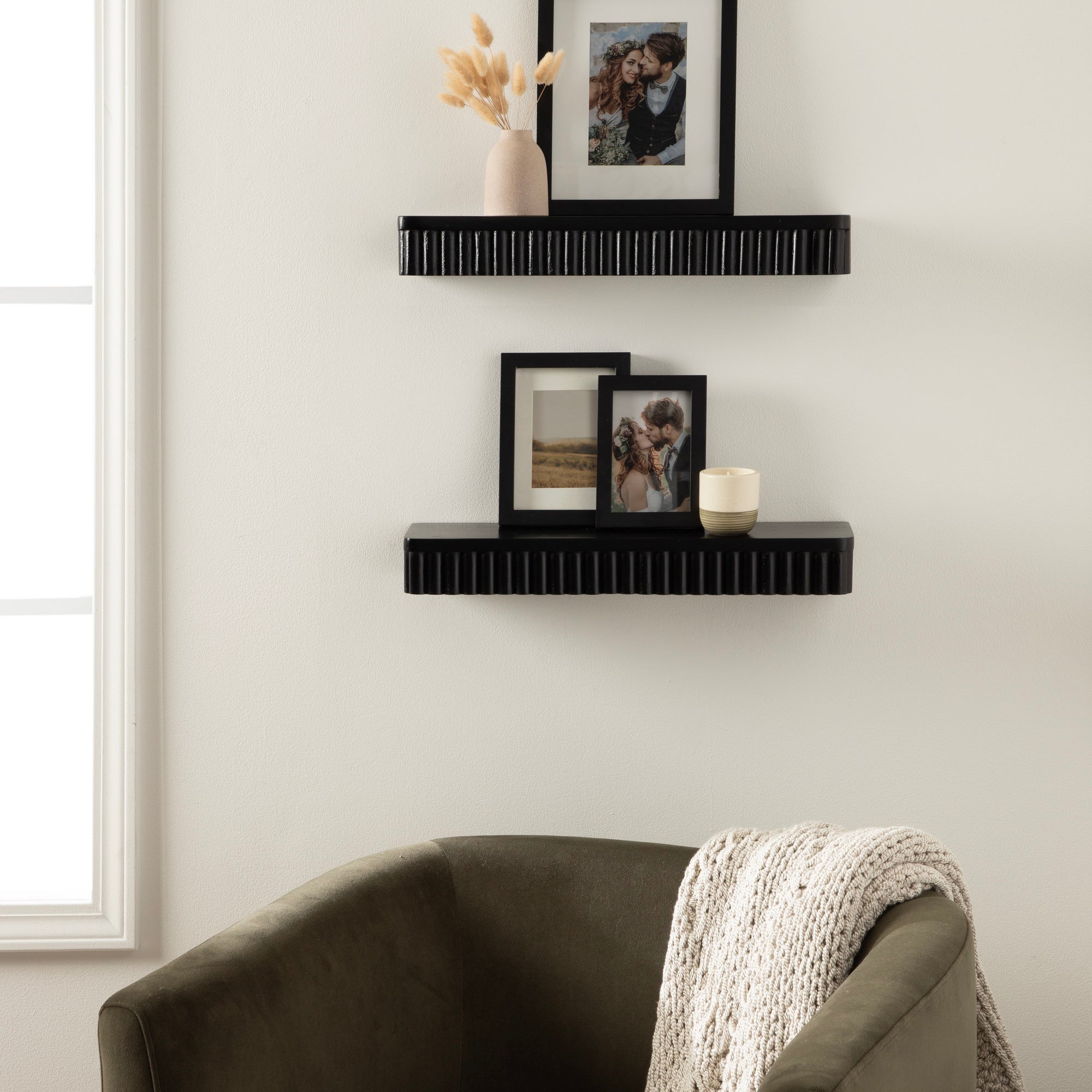 Inspire your inner interior decorator with these functional and beautiful floating shelves. Inspired by subjtel curvature and convenient design, the Reid shelves combine modern aesthetics with practical function. These shelves were made primarily from solid mango wood, giving them an elevated quality and appearance. The modern finish provides a look that lends itself to clean design, allowing the Reid to blend into a variety of decorative aesthetics. The two Reid shelves hang in just a matter of minutes with the convenient hanging brackets that attach directly to the wall for a quick and simple process.
