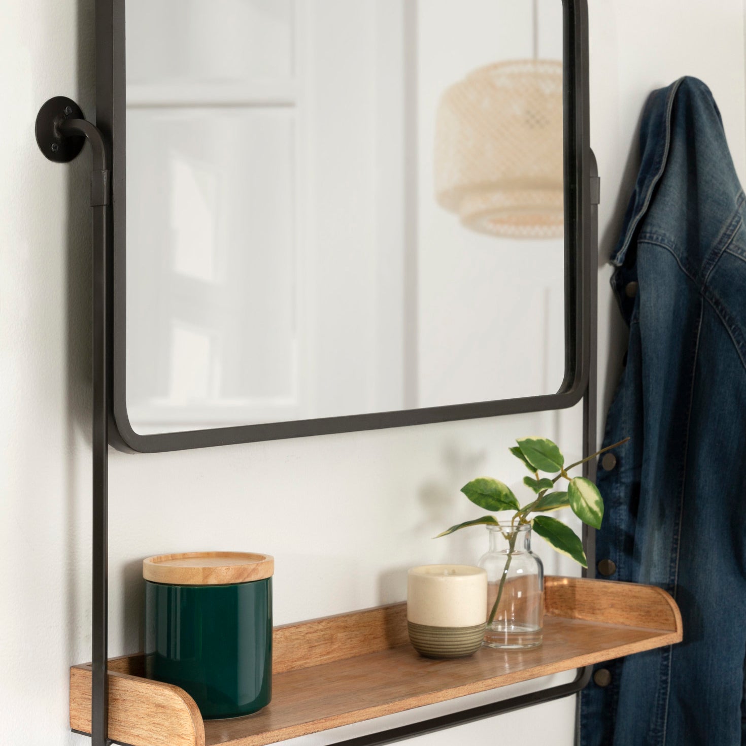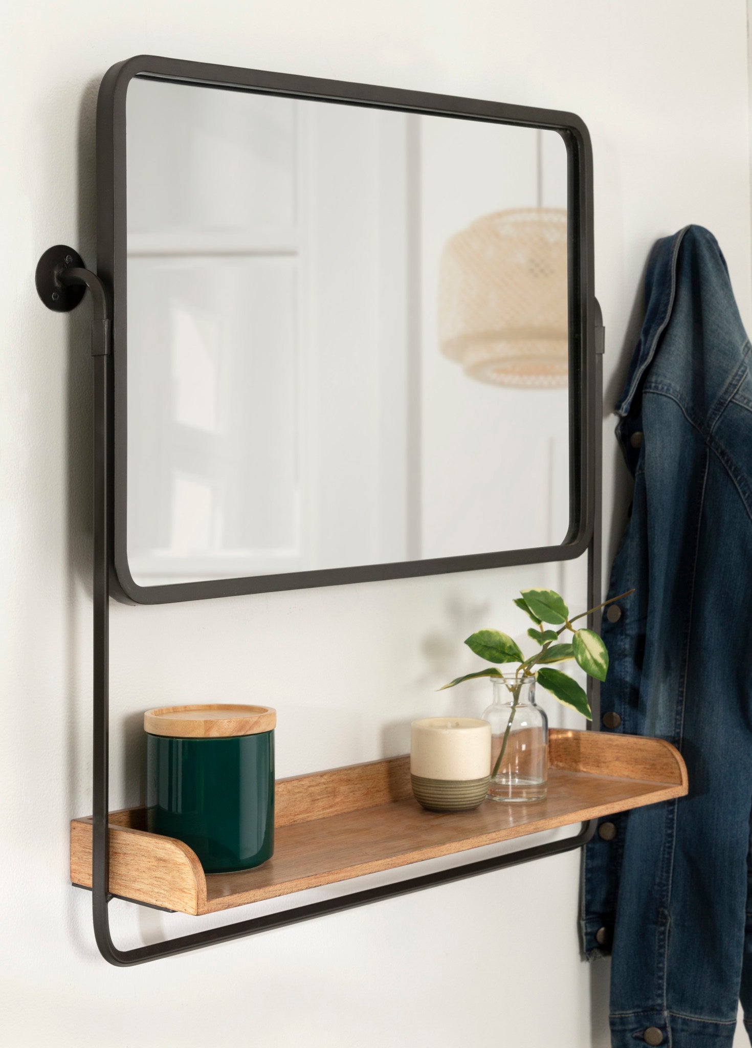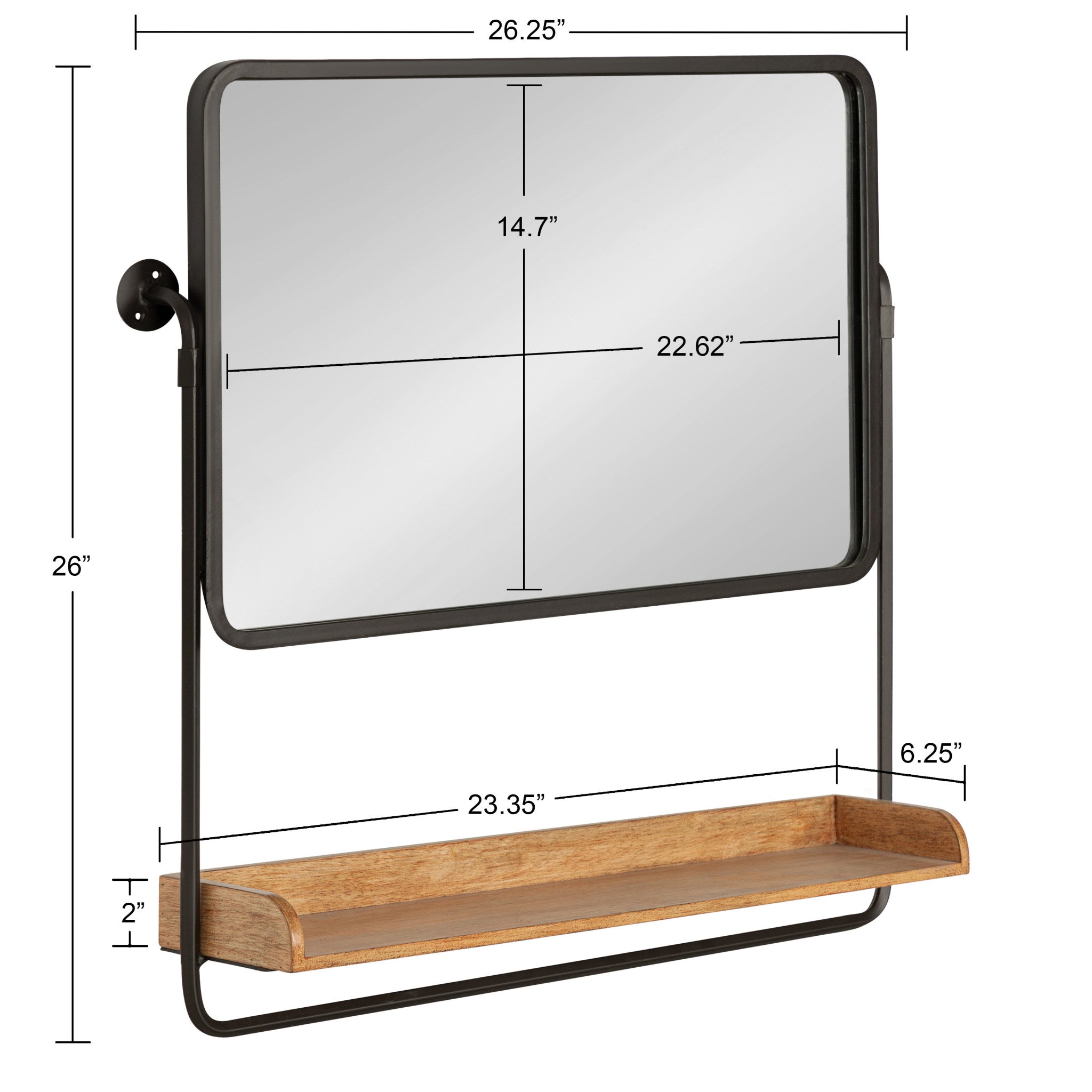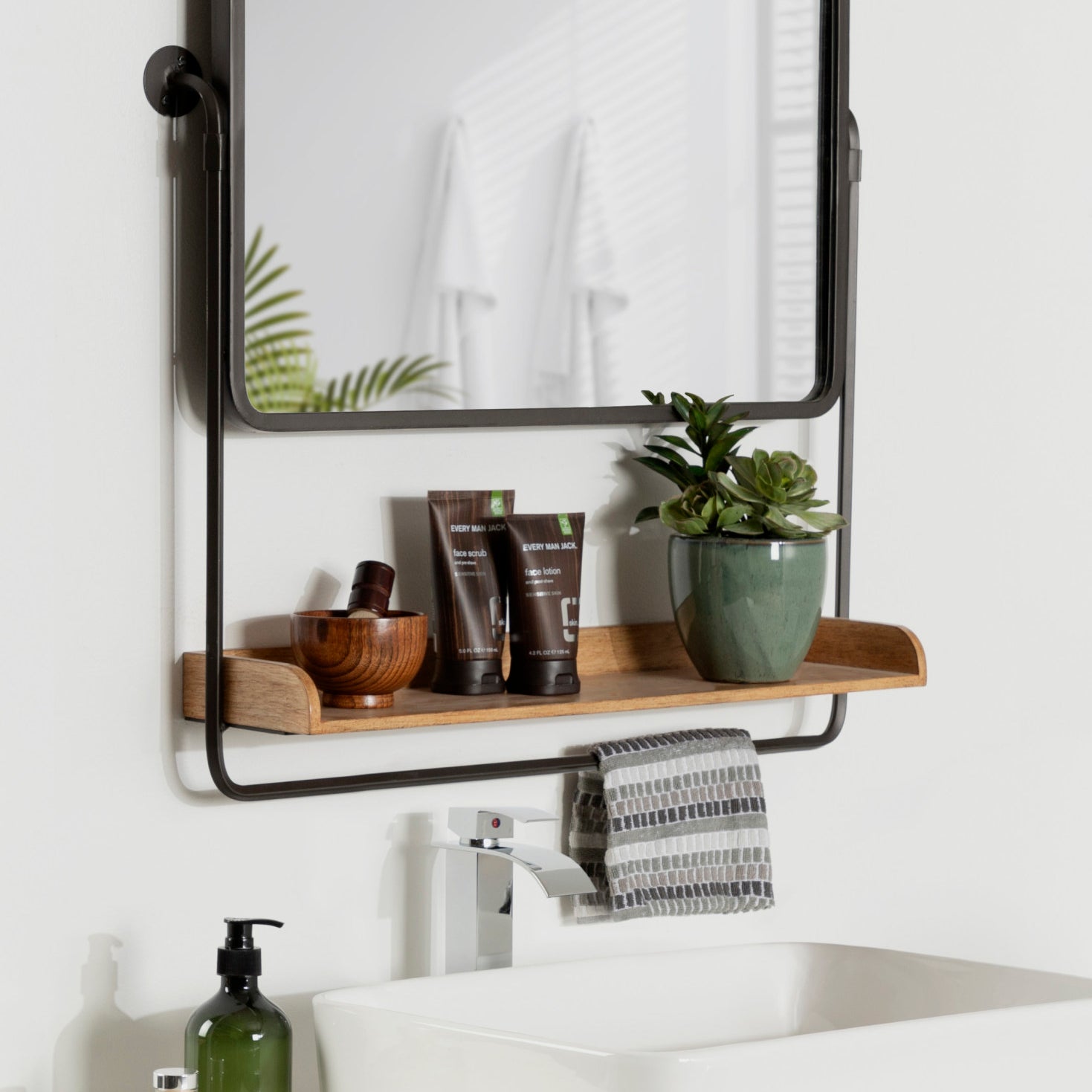 Bring functional farmhouse aesthetics to your home with the sophisticated Rheeves mirror. This beautiful mirror features a metal frame with a hanging bracket. The Rheeves mirror also features a wooden base shelf that is fantastic for storage of small household items like lotion, soap, and other small items. This mirror is perfect for a decorative statement in your living room, bedroom, or entryway, or a bathroom vanity mirror in your master.