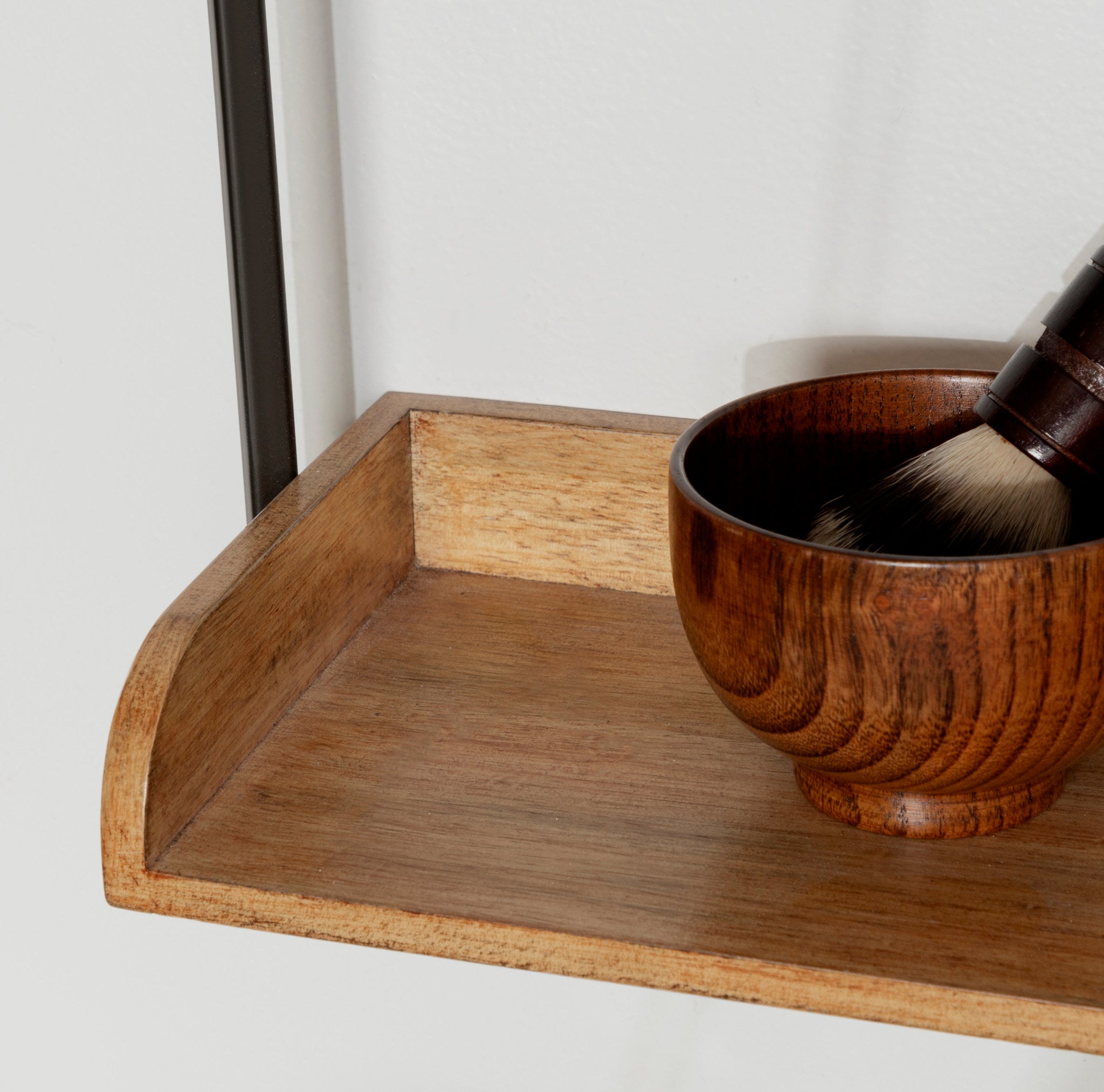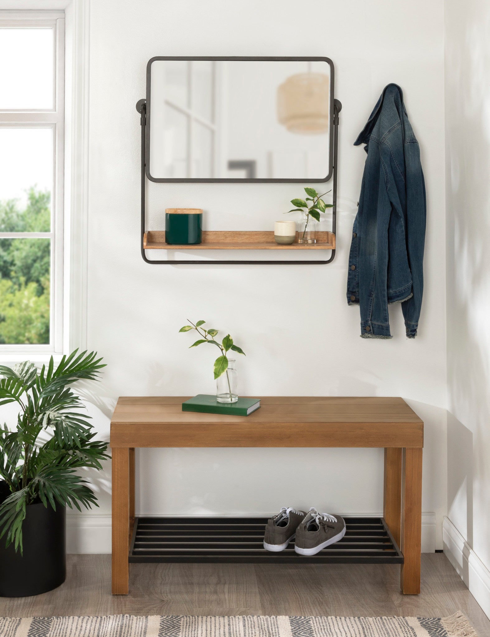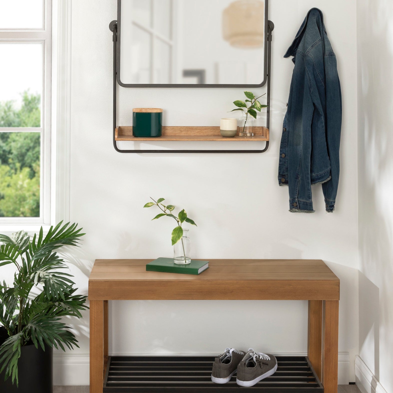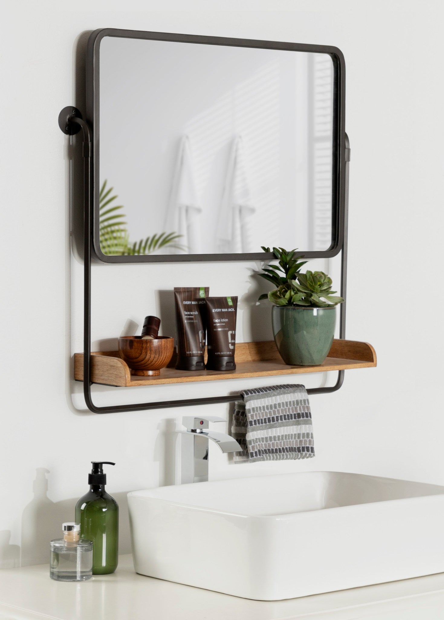 Bring functional farmhouse aesthetics to your home with the sophisticated Rheeves mirror. This beautiful mirror features a metal frame with a hanging bracket. The Rheeves mirror also features a wooden base shelf that is fantastic for storage of small household items like lotion, soap, and other small items. This mirror is perfect for a decorative statement in your living room, bedroom, or entryway, or a bathroom vanity mirror in your master.
