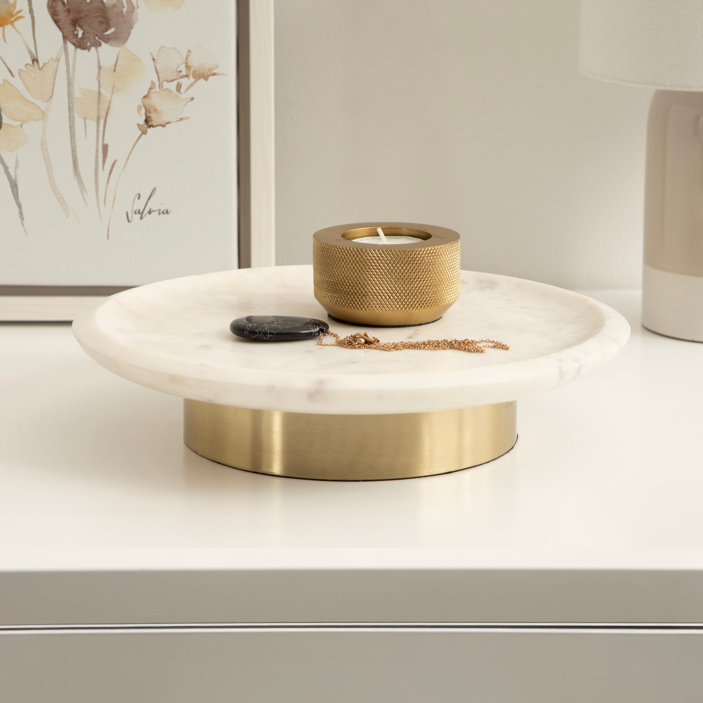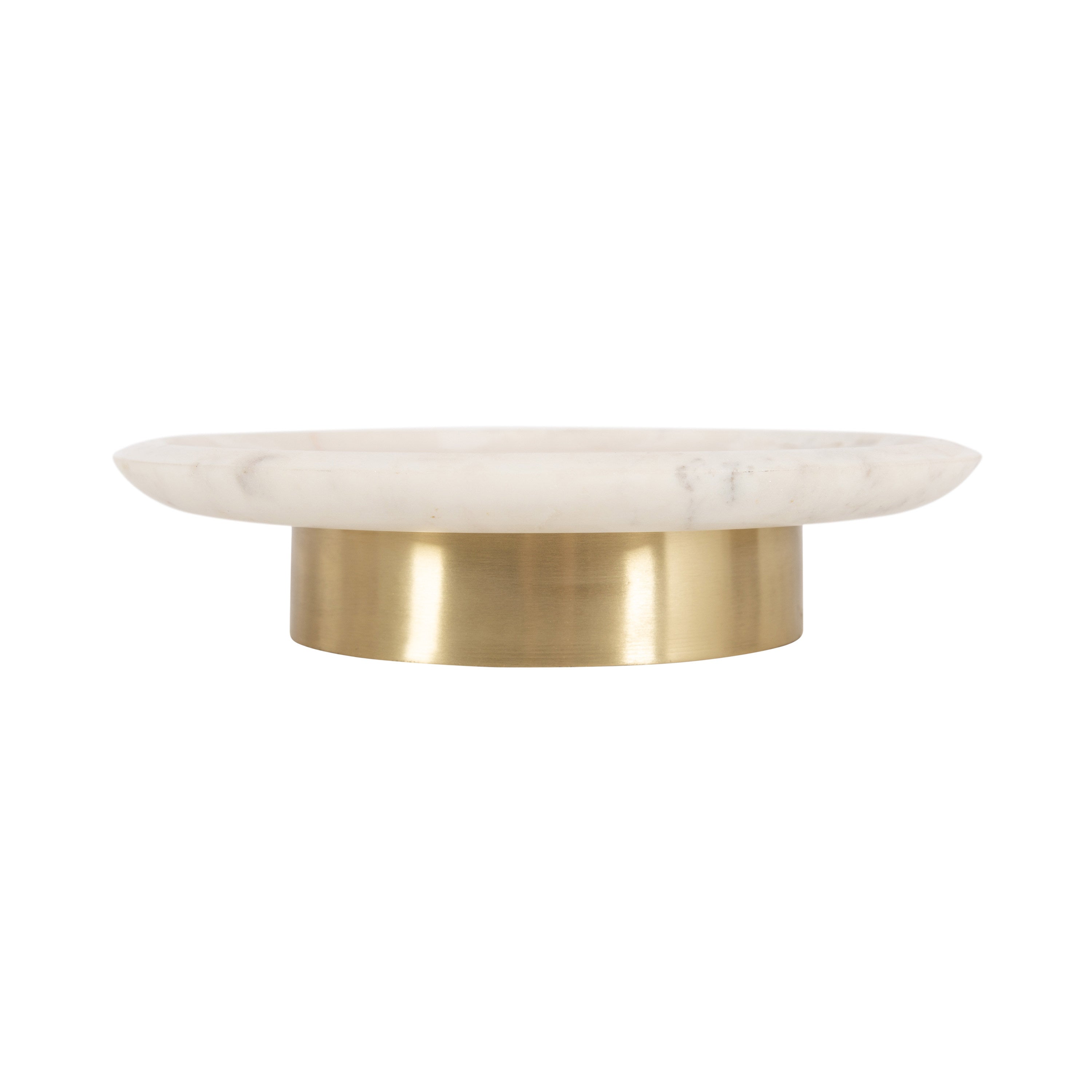 Create a vision of modern design with the Sevienne marble tray. Inspired by glam aesthetics, this beautiful tray features a sleek design with a round shape and premium finishes. The Sevienne is crafted from authentic marble with a sturdy metal base, making it a resilient display piece that is meant to last for multiple years. This versatile surface area allows the Sevienne to serve various purposes across multiple rooms: use it as a charming table centerpiece, a decorative nightstand tray, or a storage catch-all for perfume and jewelry on your vanity. The metal base creates an attractive pedestal tray look to easily and literally elevate your space! Even better, the Sevienne is perfect for any of your wood, metal, or marble surfaces with protective padding attached to the bottom.