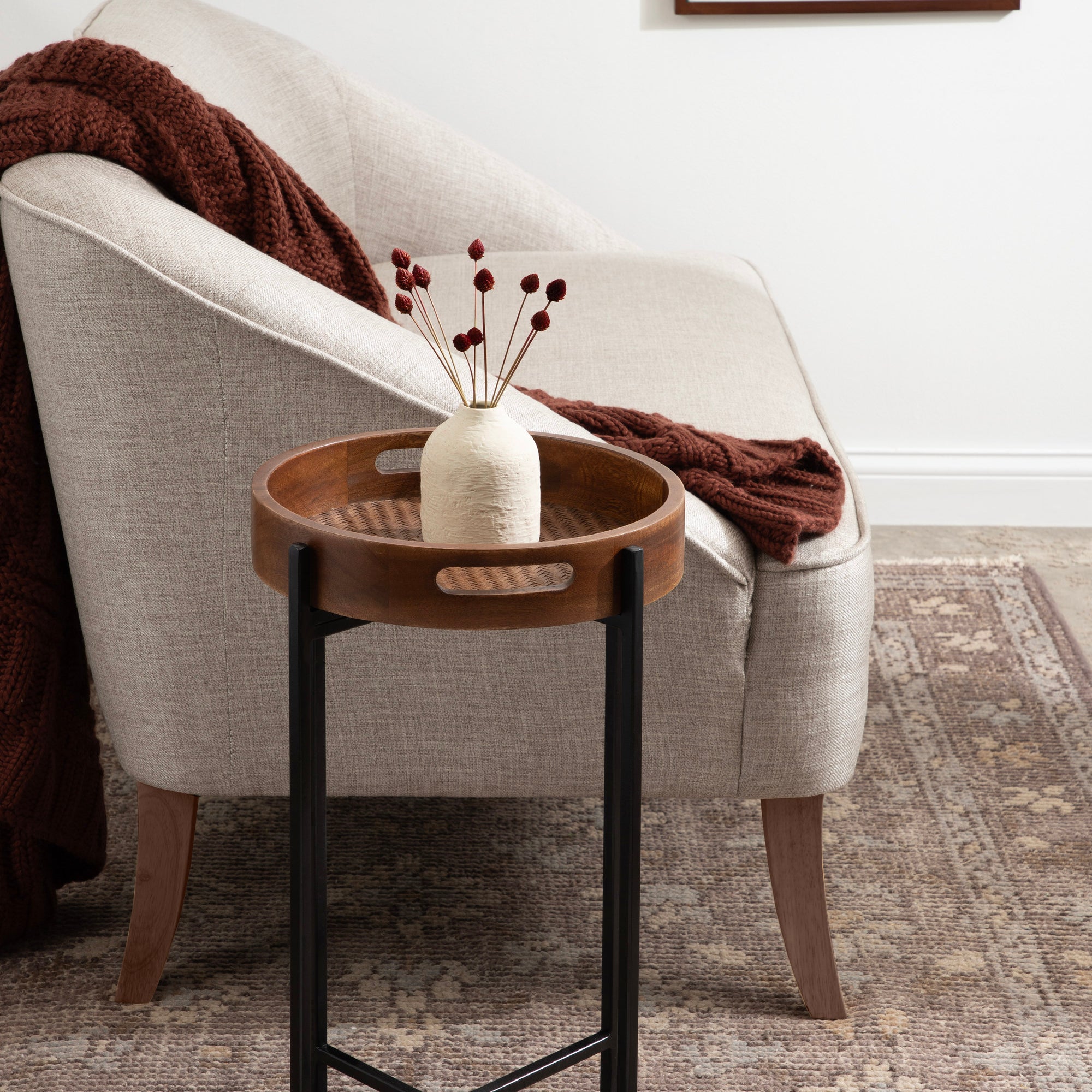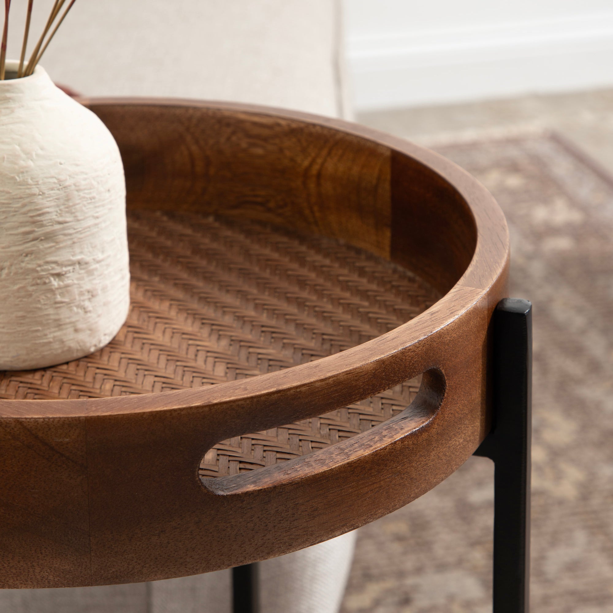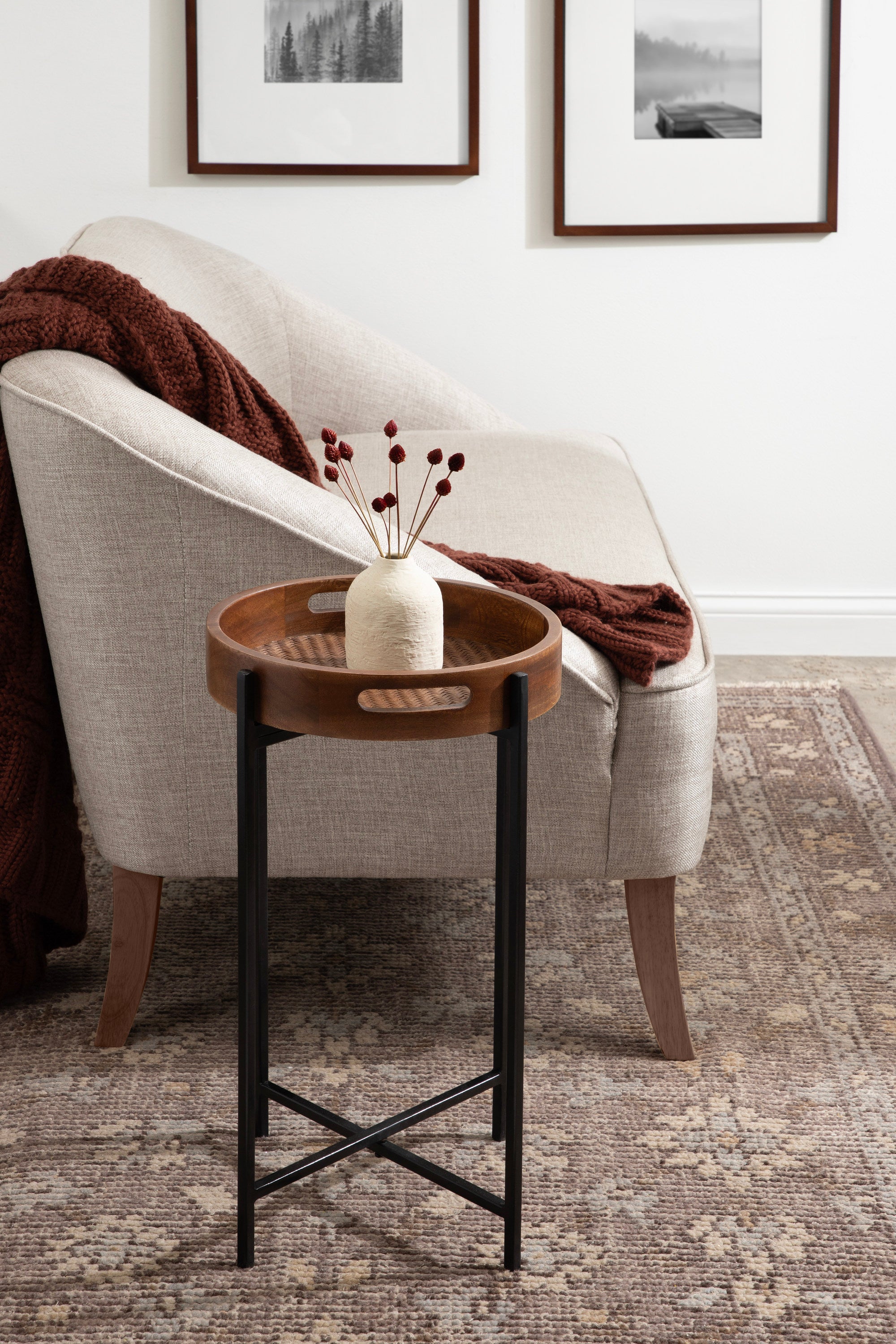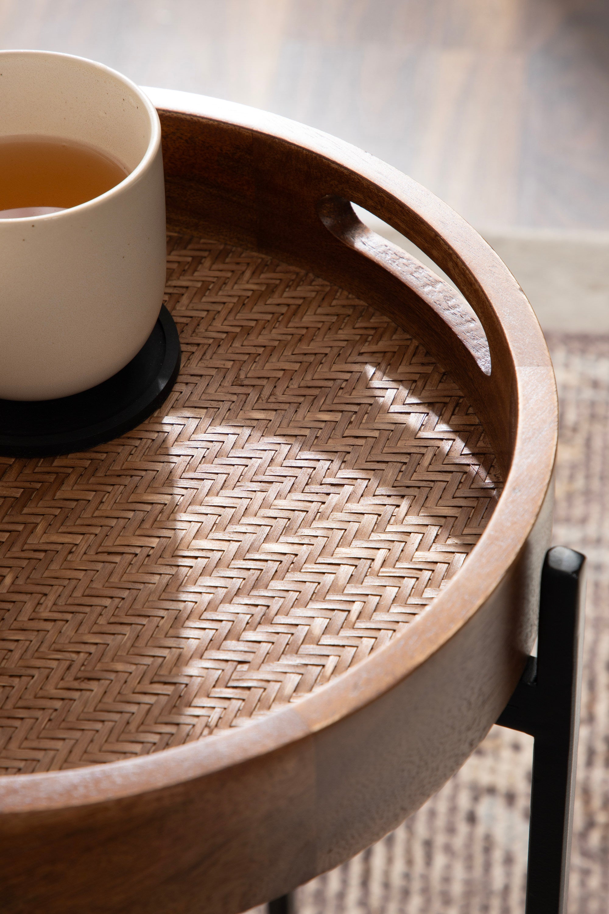 Looking for a versatile and stylish accent table that can complement any room in your home? Look no further than the Kate and Laurel Smita round accent table! One of the standout features of this tray table is its removable wooden tray tabletop, which makes it easy to clean and provides a convenient spot for holding drinks, snacks, or small items like your phone or keys. The tabletop is crafted from solid mango wood, giving you a resilient tray that features a natural woodgrain. The removable tray also features an inset woven cane texture, giving your items more security and your decor an additional touch of refinement.