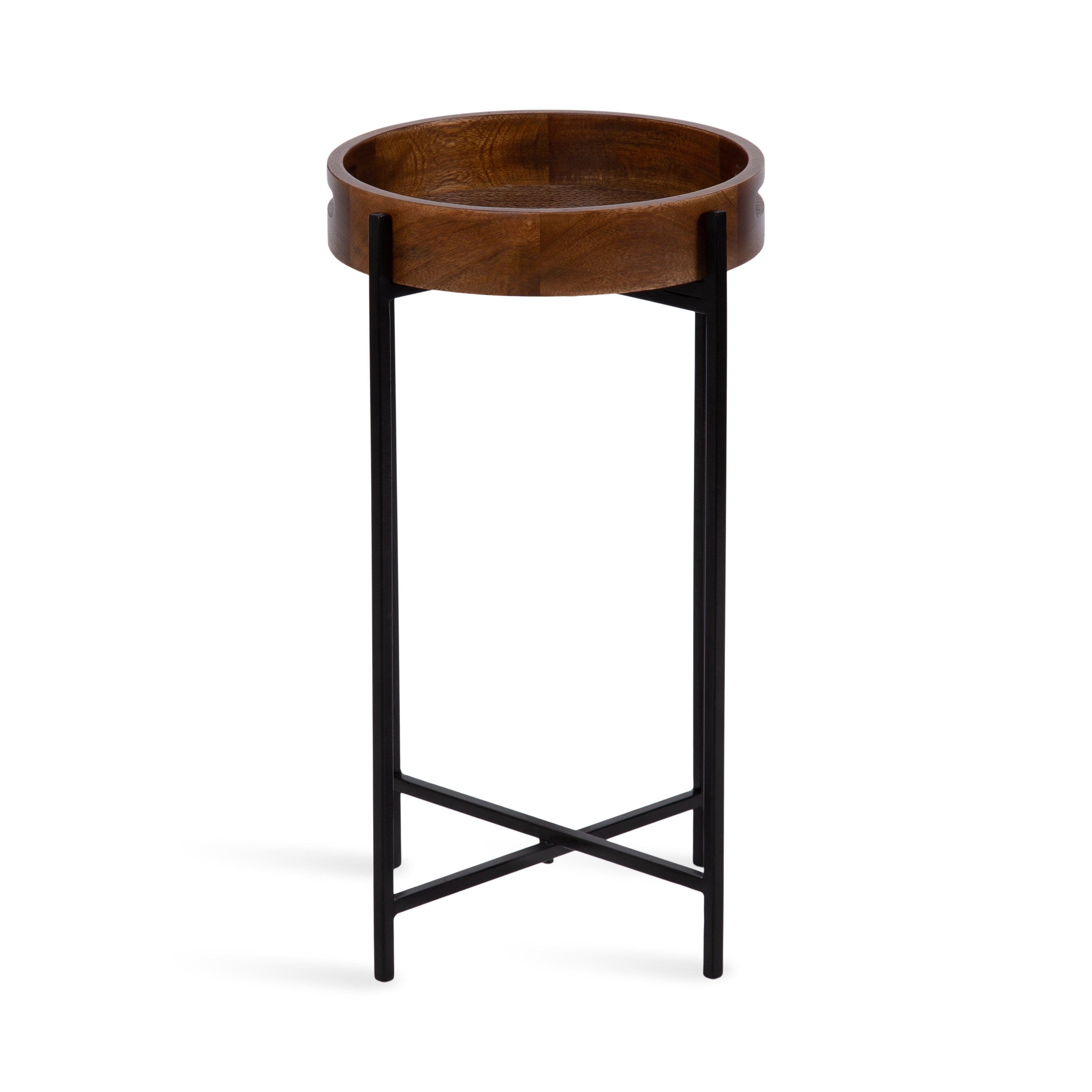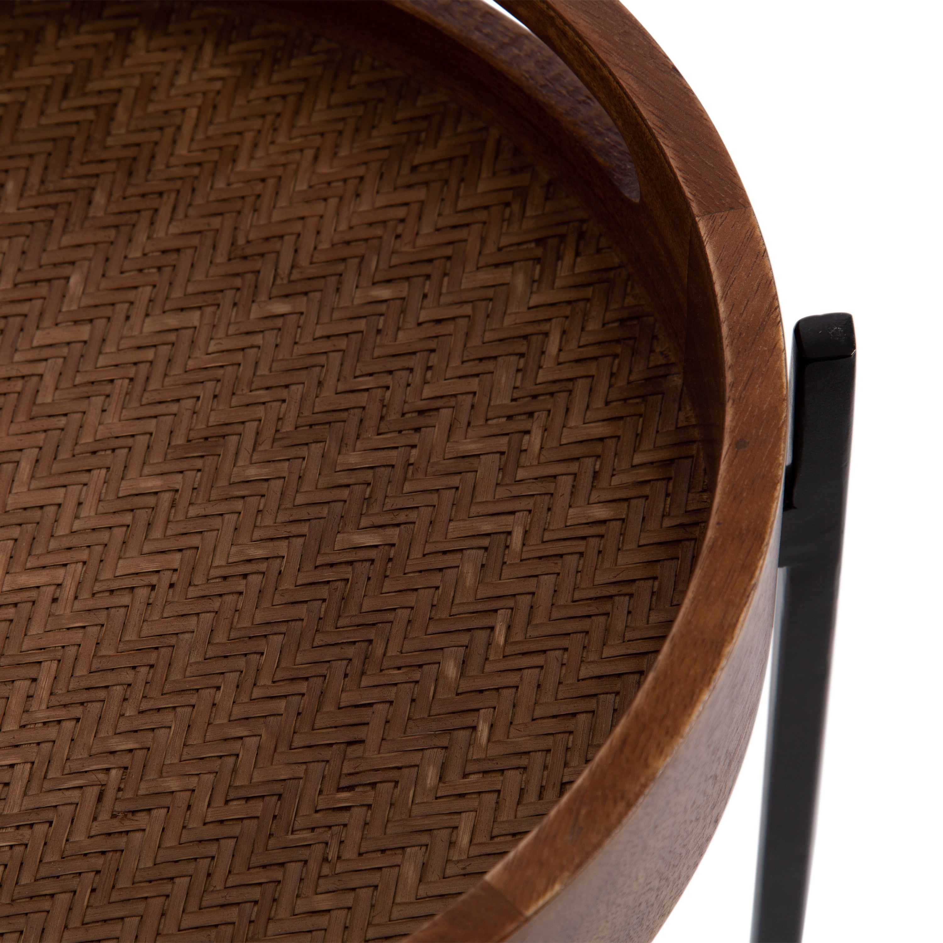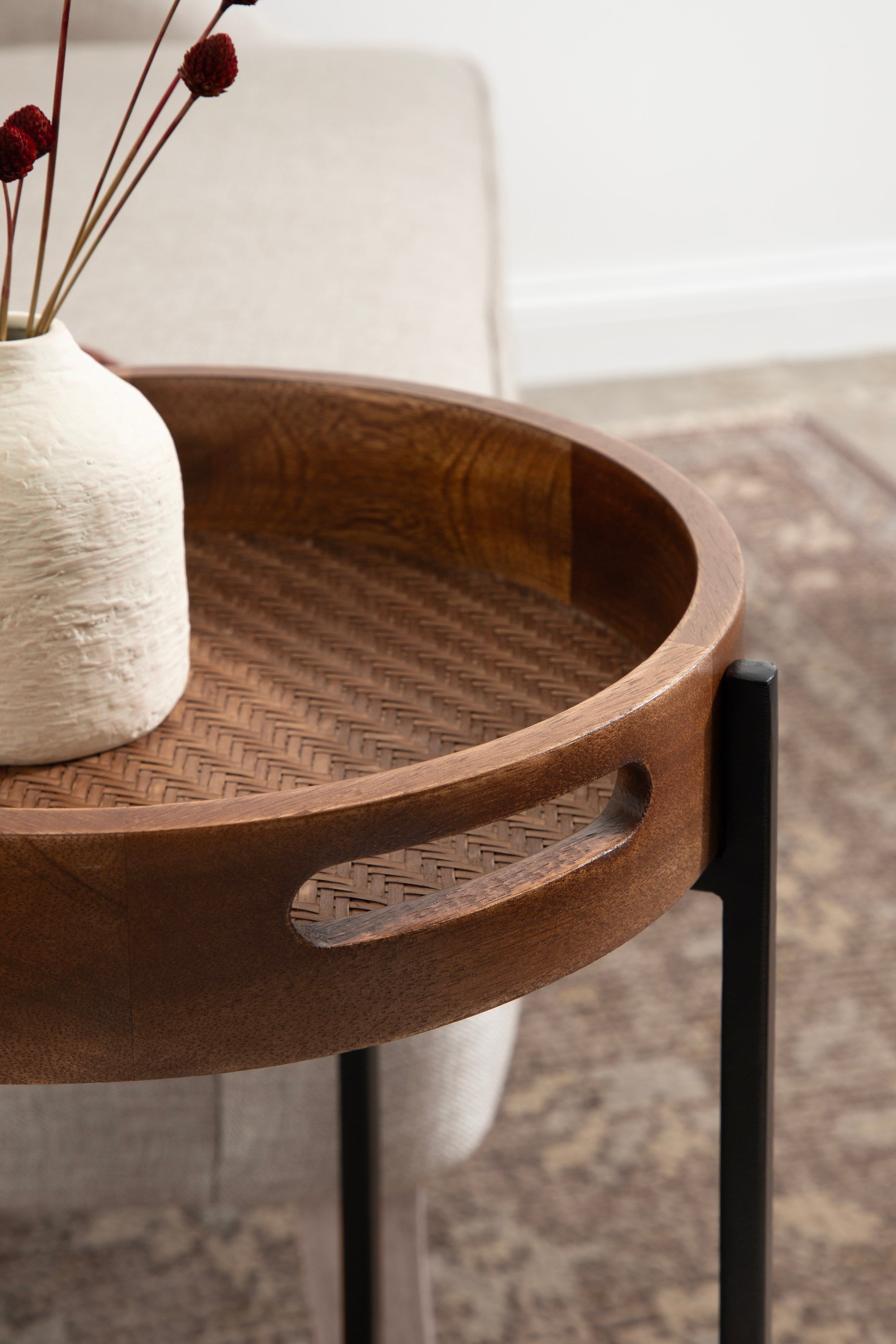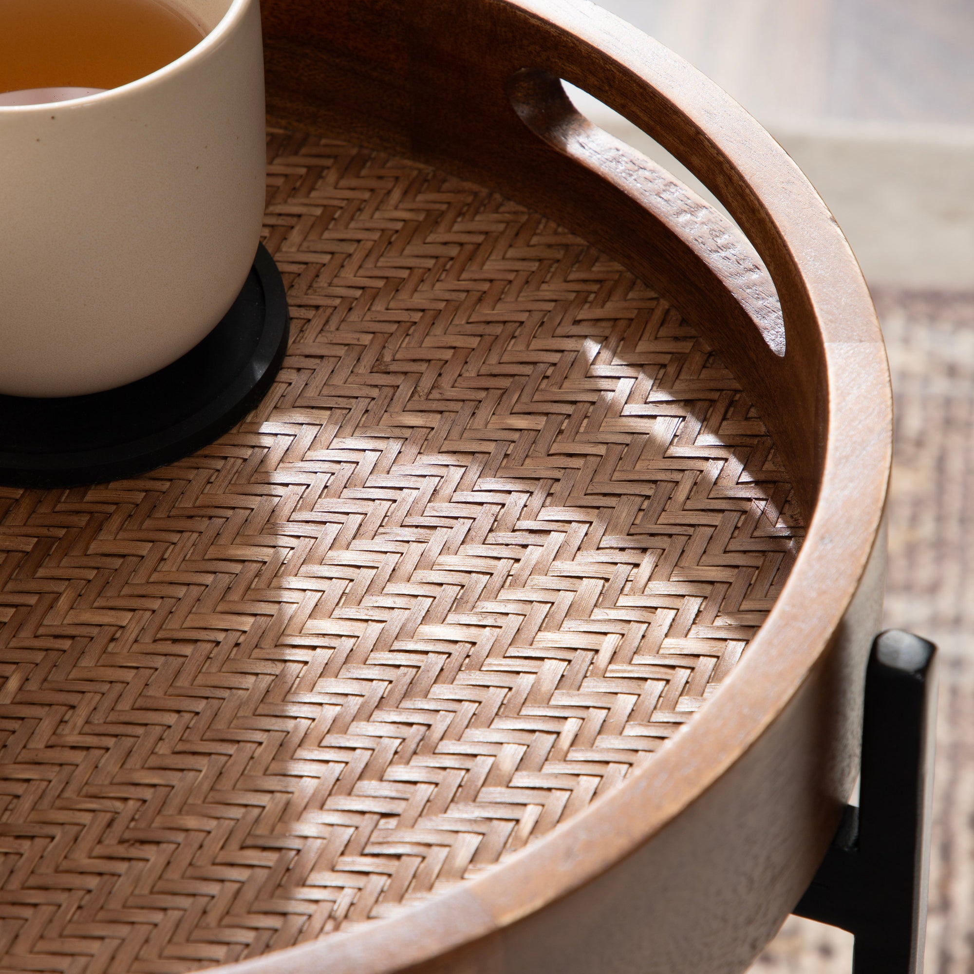 Looking for a versatile and stylish accent table that can complement any room in your home? Look no further than the Kate and Laurel Smita round accent table! One of the standout features of this tray table is its removable wooden tray tabletop, which makes it easy to clean and provides a convenient spot for holding drinks, snacks, or small items like your phone or keys. The tabletop is crafted from solid mango wood, giving you a resilient tray that features a natural woodgrain. The removable tray also features an inset woven cane texture, giving your items more security and your decor an additional touch of refinement.