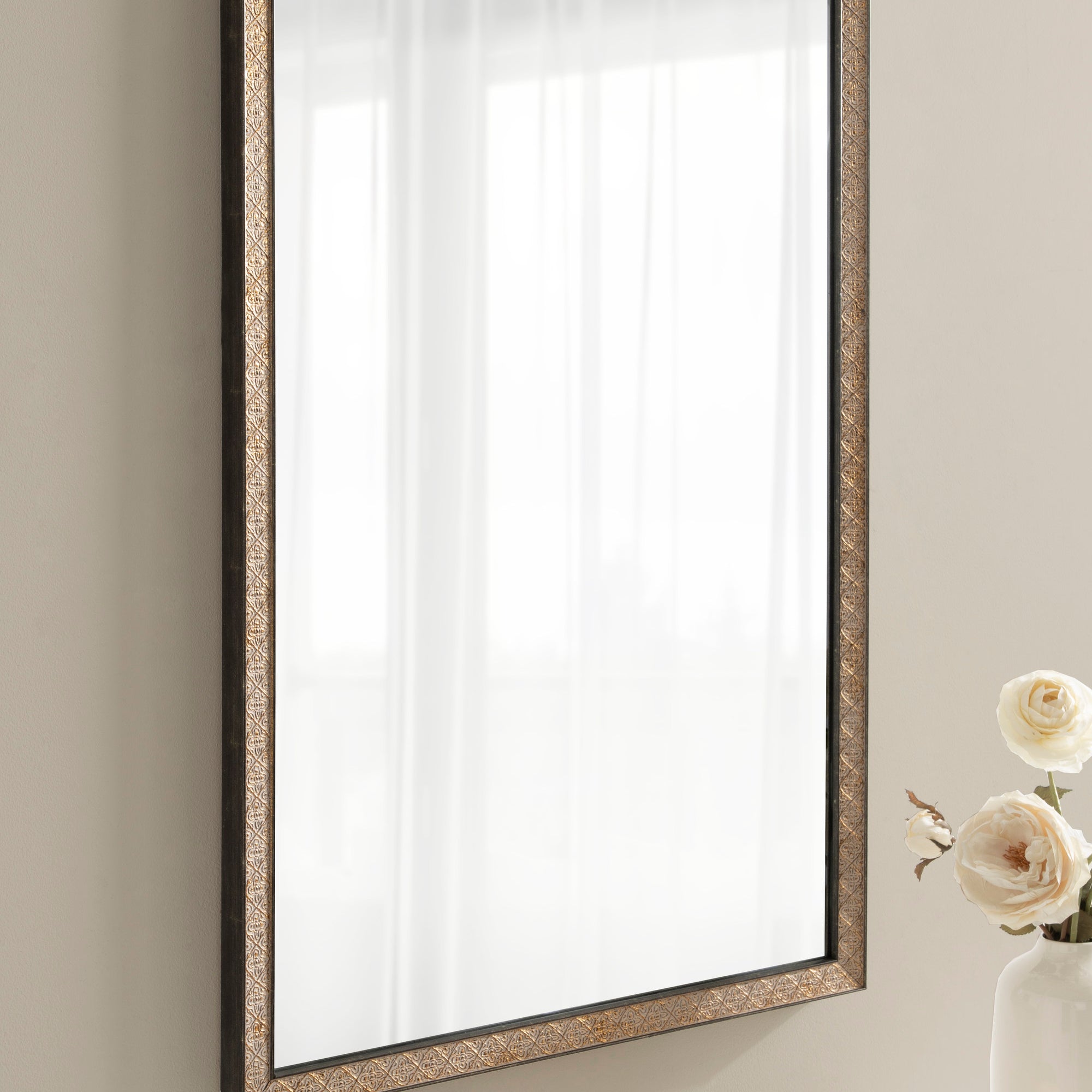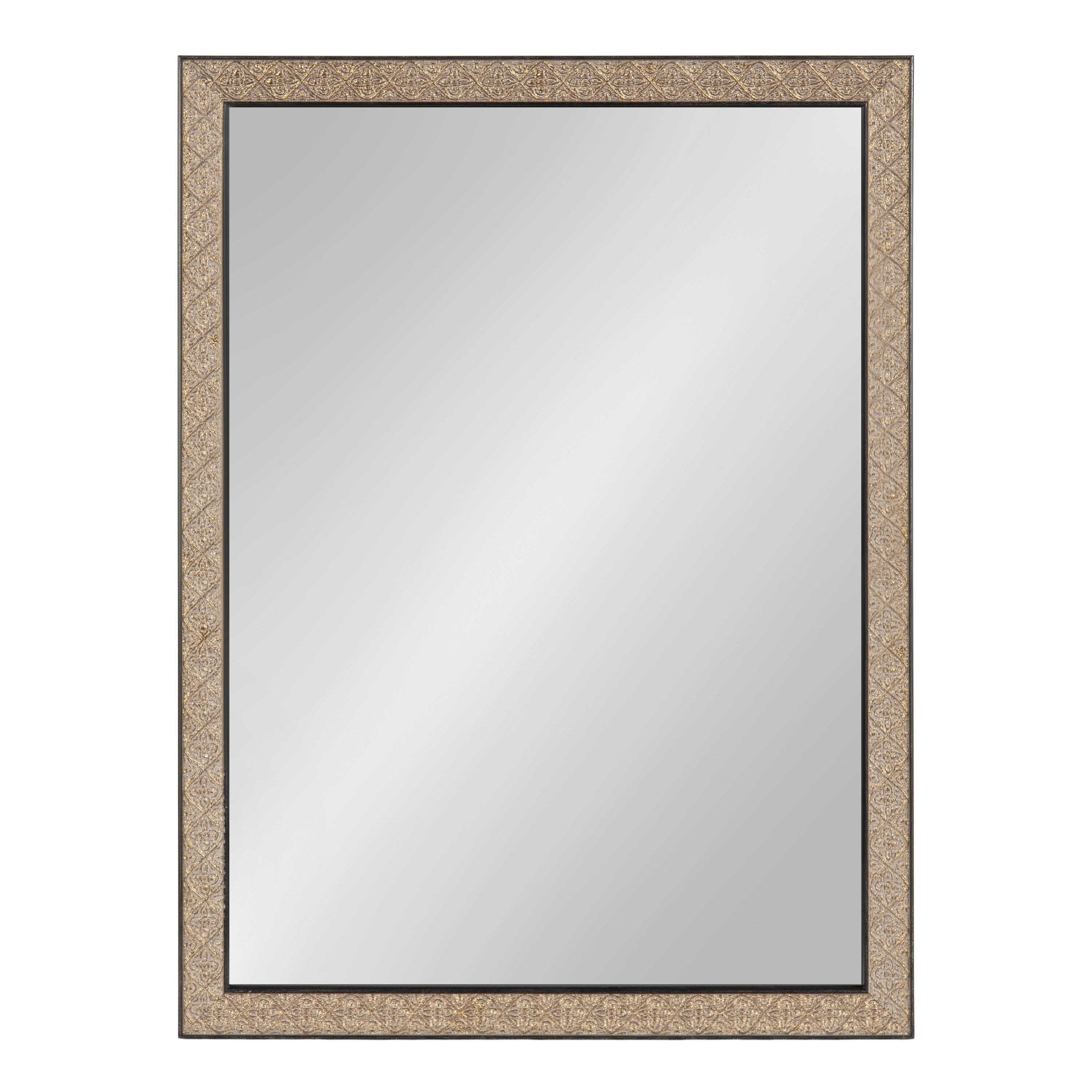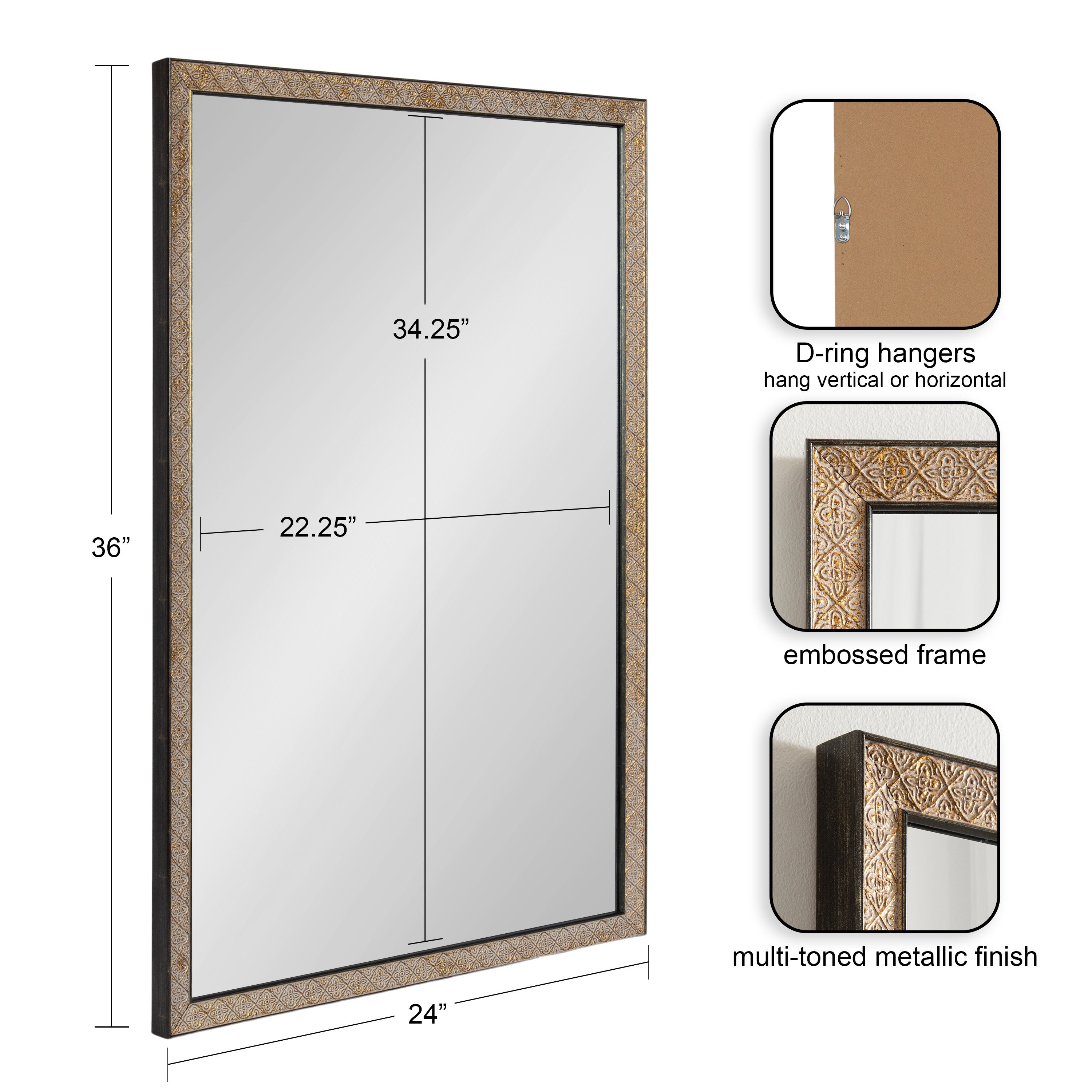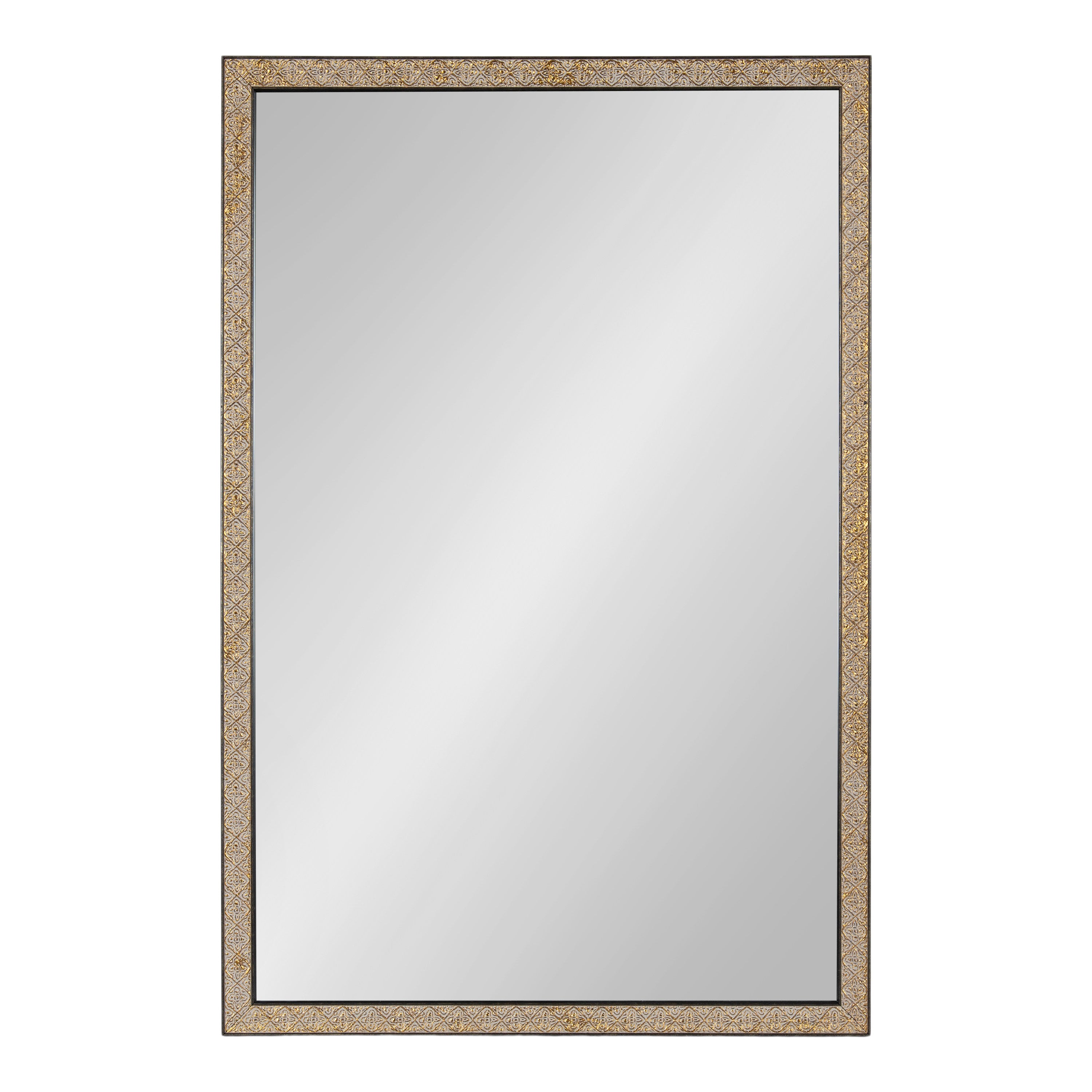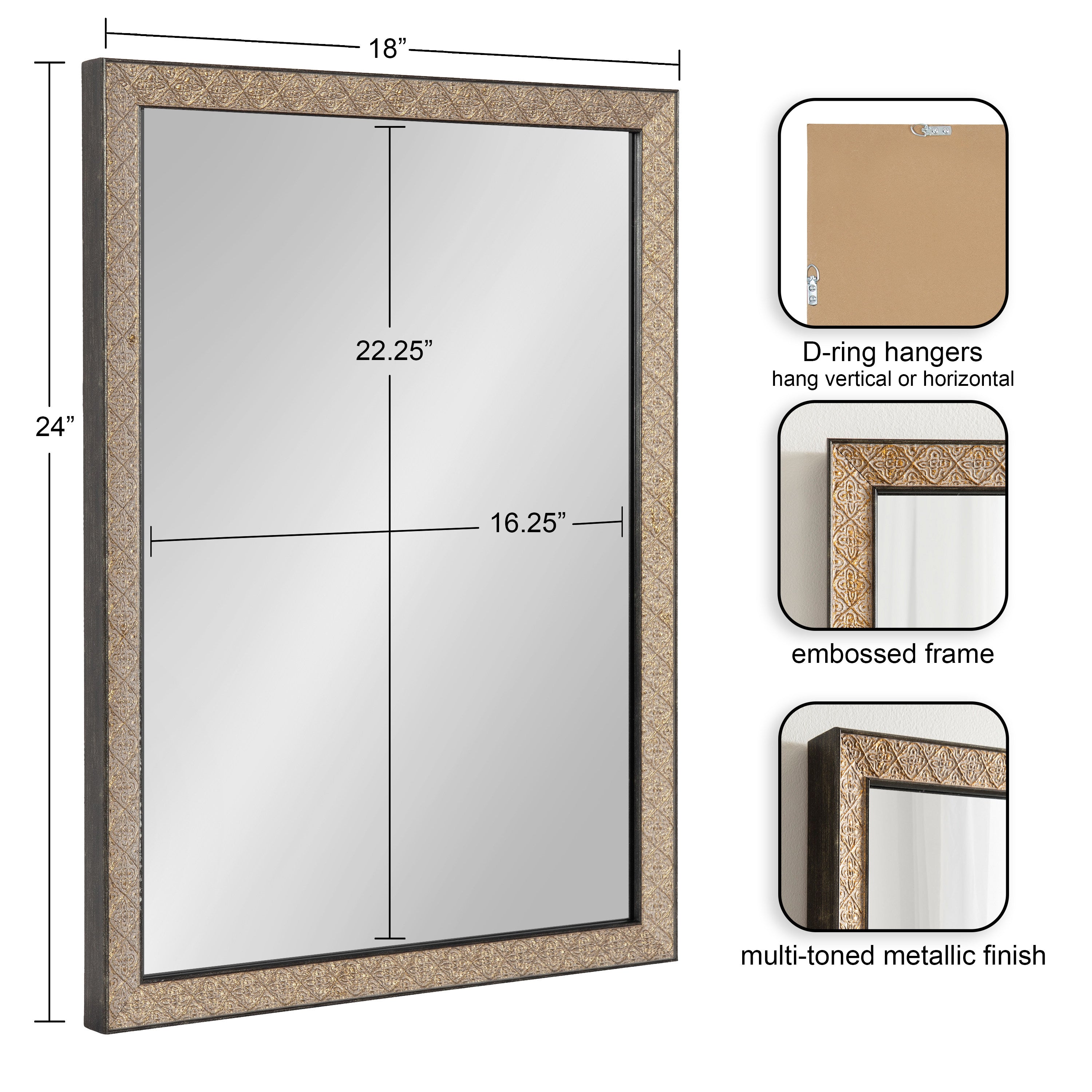 This beautiful mirror boasts a global traditional design with a unique vintage finish and embossed ornate texture. The scrolling ornamental texture and multi-toned metallic finish add an elegant touch to the frame, making it a stylish and sophisticated addition to any room. The rectangular shape of the mirror is perfect for use as a bathroom vanity mirror, providing ample space for getting ready for the day.
