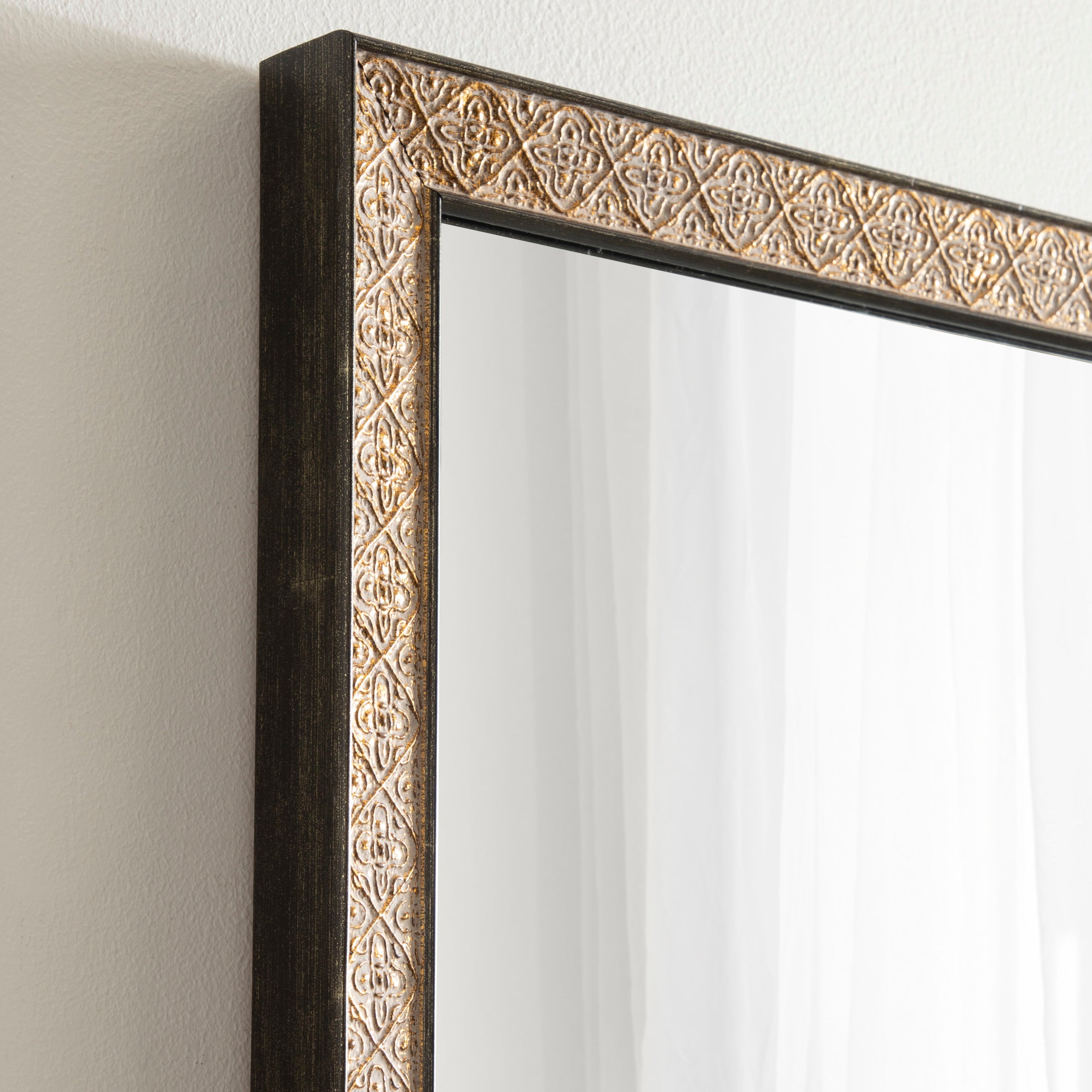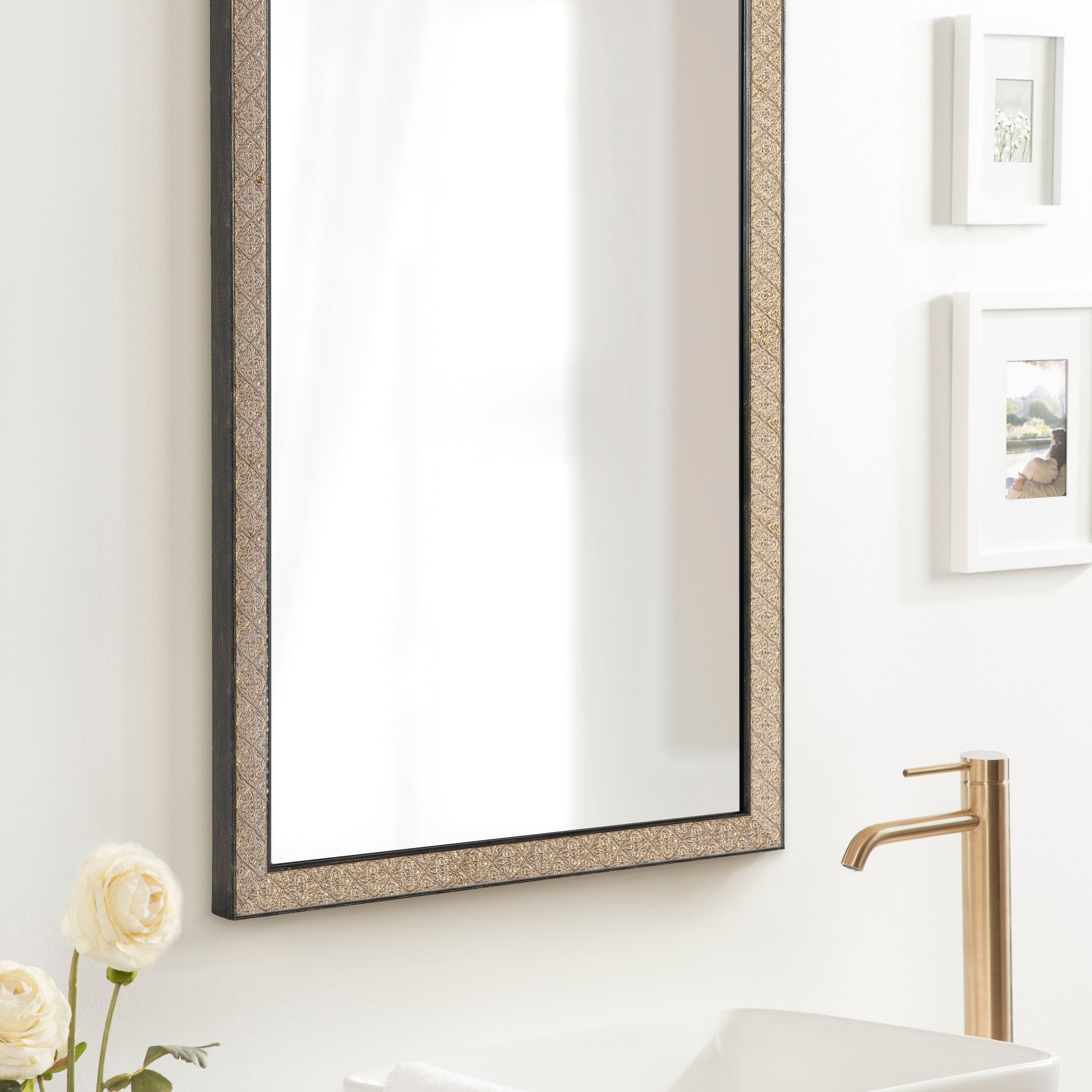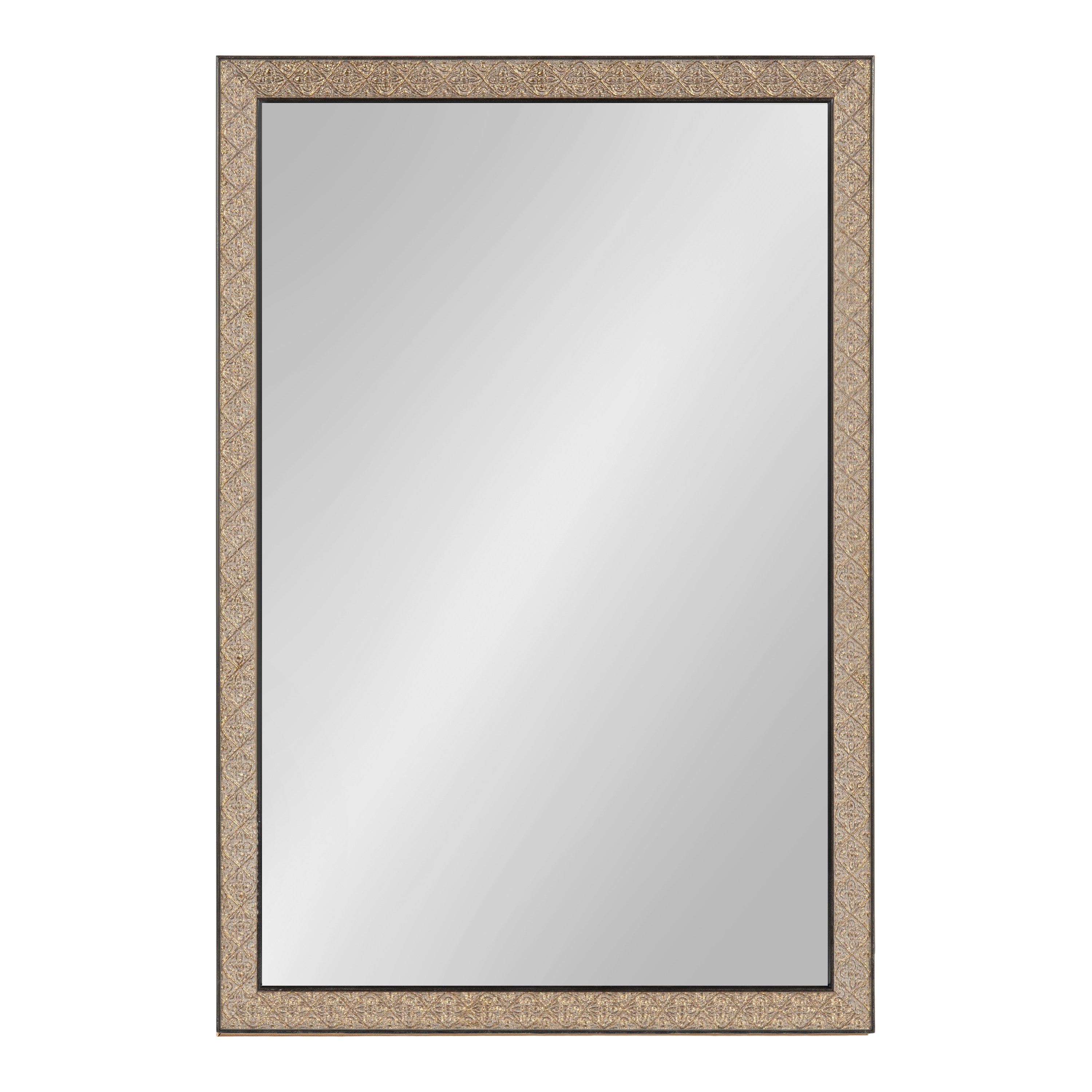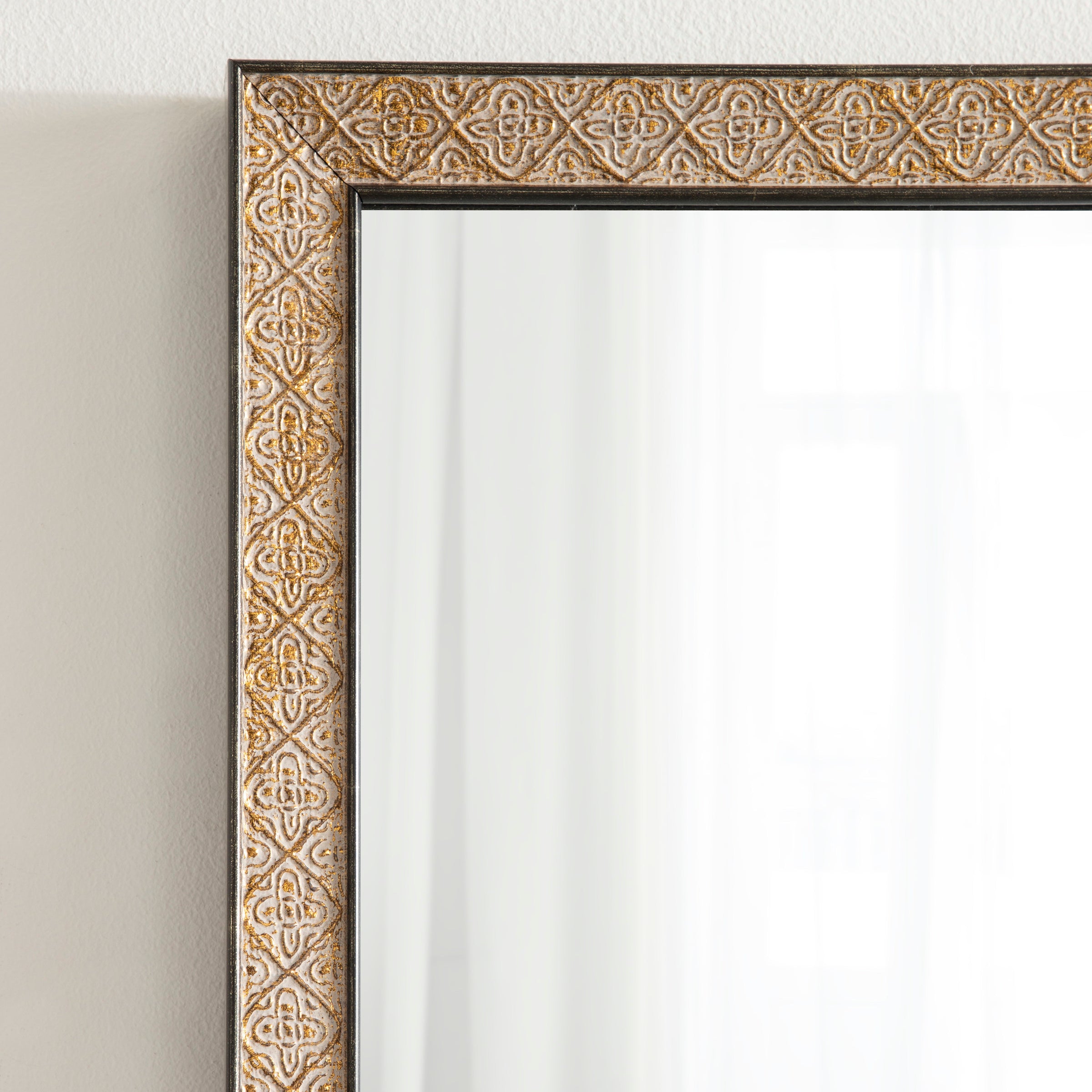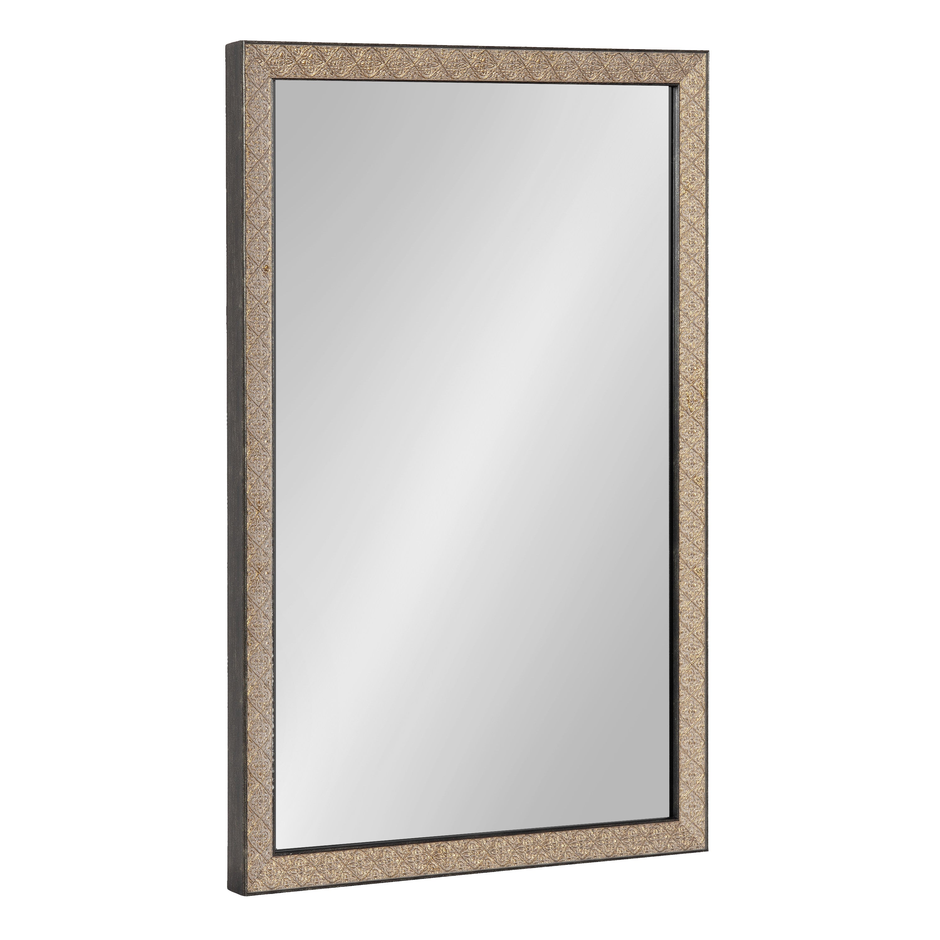 This beautiful mirror boasts a global traditional design with a unique vintage finish and embossed ornate texture. The scrolling ornamental texture and multi-toned metallic finish add an elegant touch to the frame, making it a stylish and sophisticated addition to any room. The rectangular shape of the mirror is perfect for use as a bathroom vanity mirror, providing ample space for getting ready for the day.