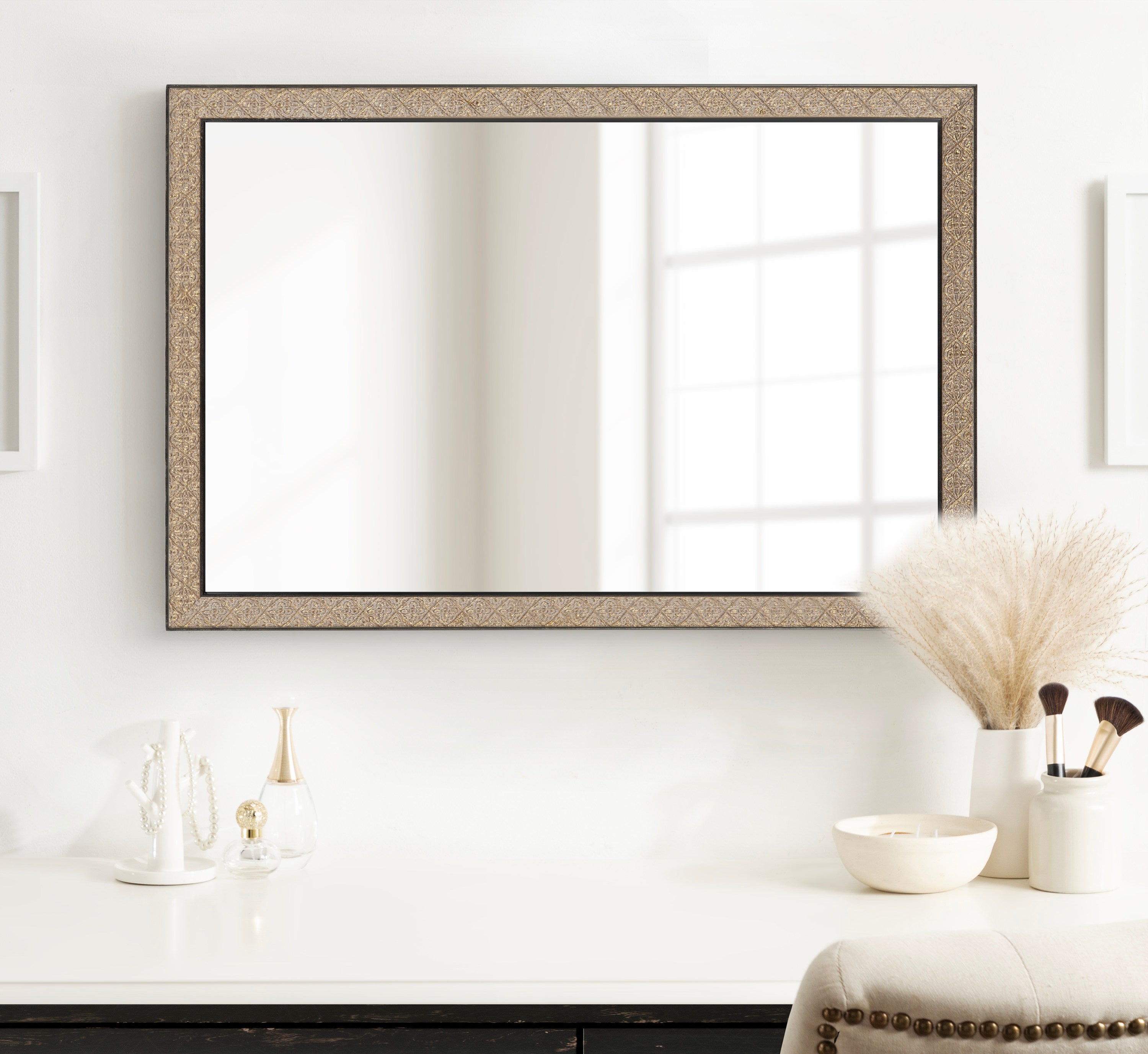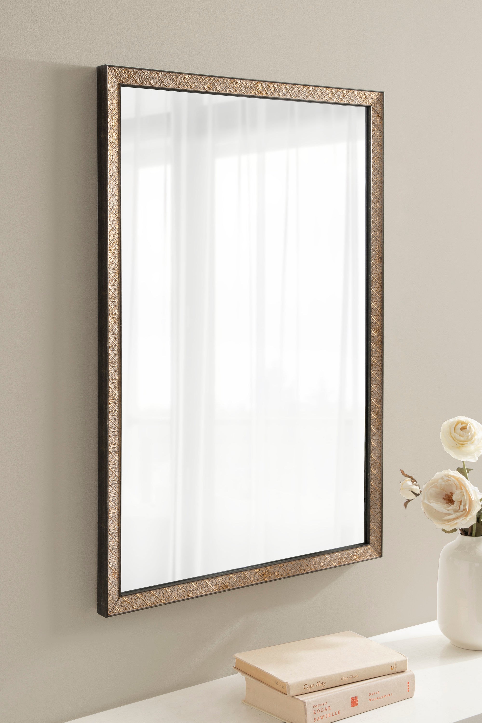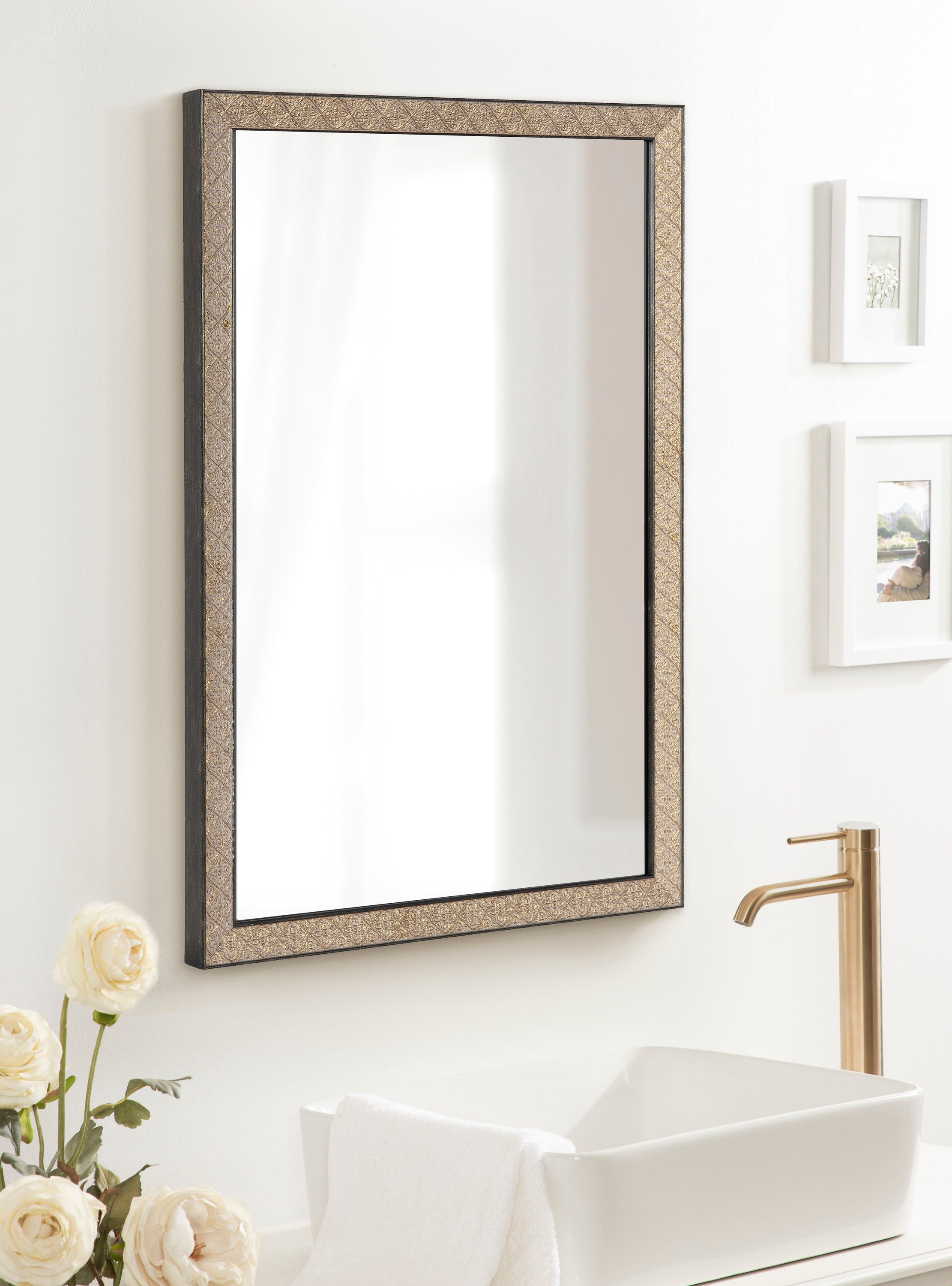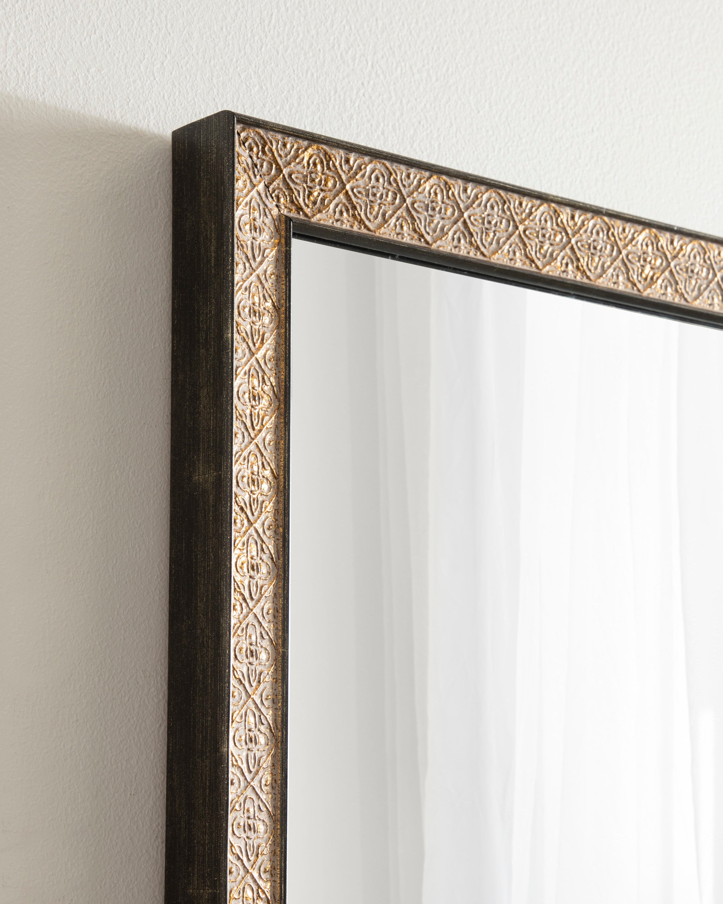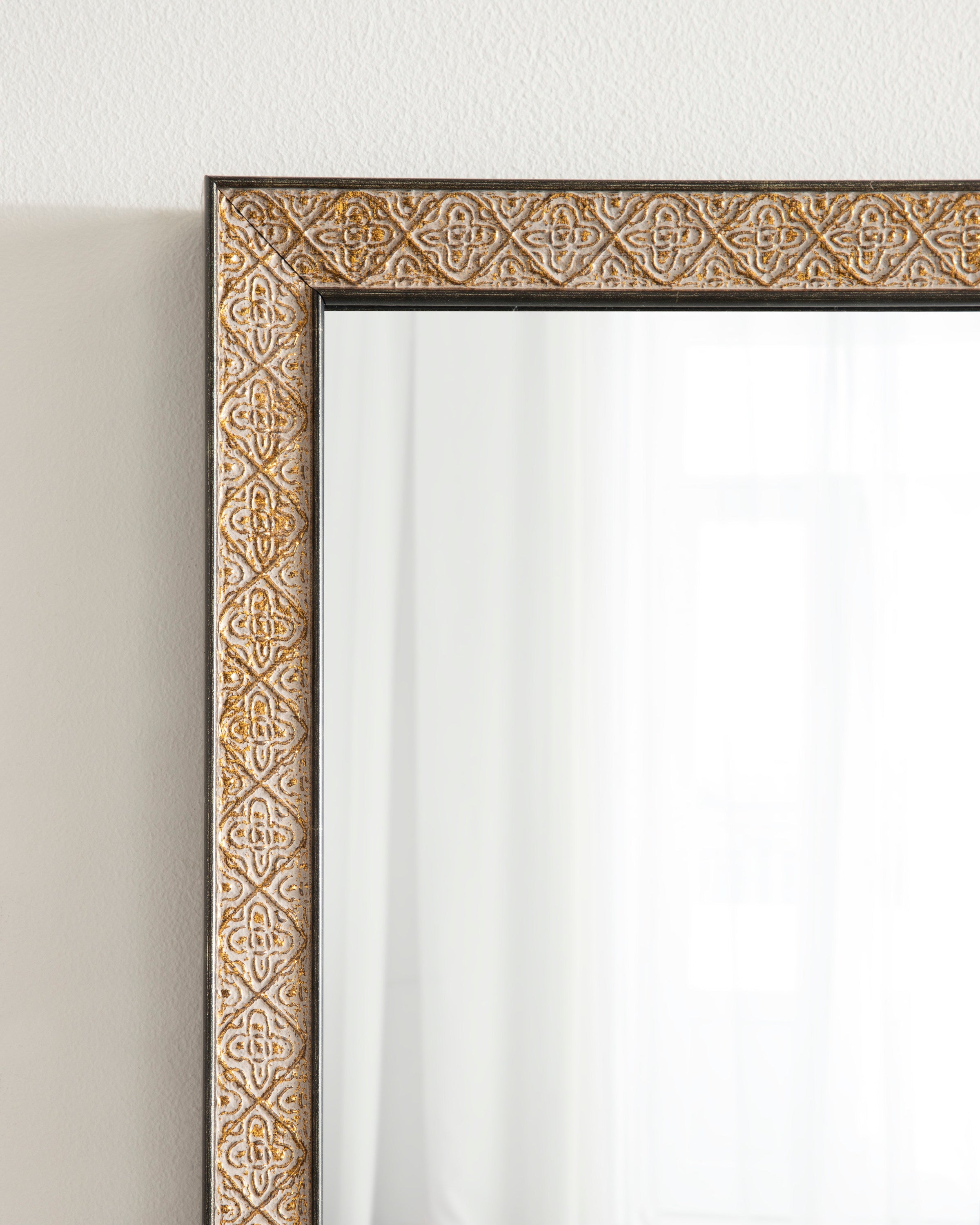 This beautiful mirror boasts a global traditional design with a unique vintage finish and embossed ornate texture. The scrolling ornamental texture and multi-toned metallic finish add an elegant touch to the frame, making it a stylish and sophisticated addition to any room. The rectangular shape of the mirror is perfect for use as a bathroom vanity mirror, providing ample space for getting ready for the day.