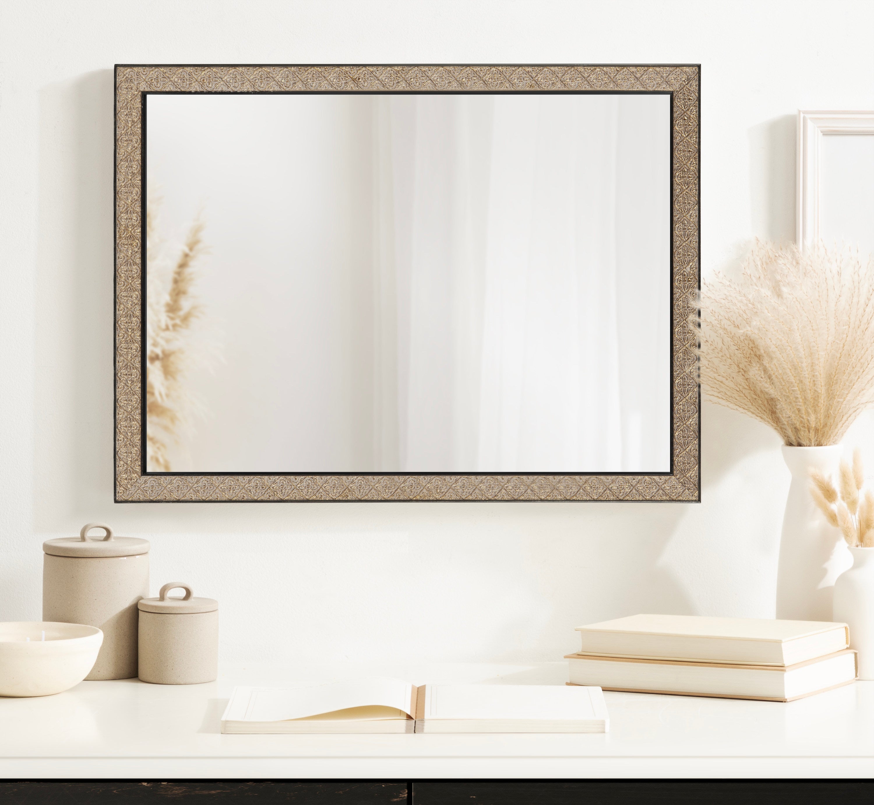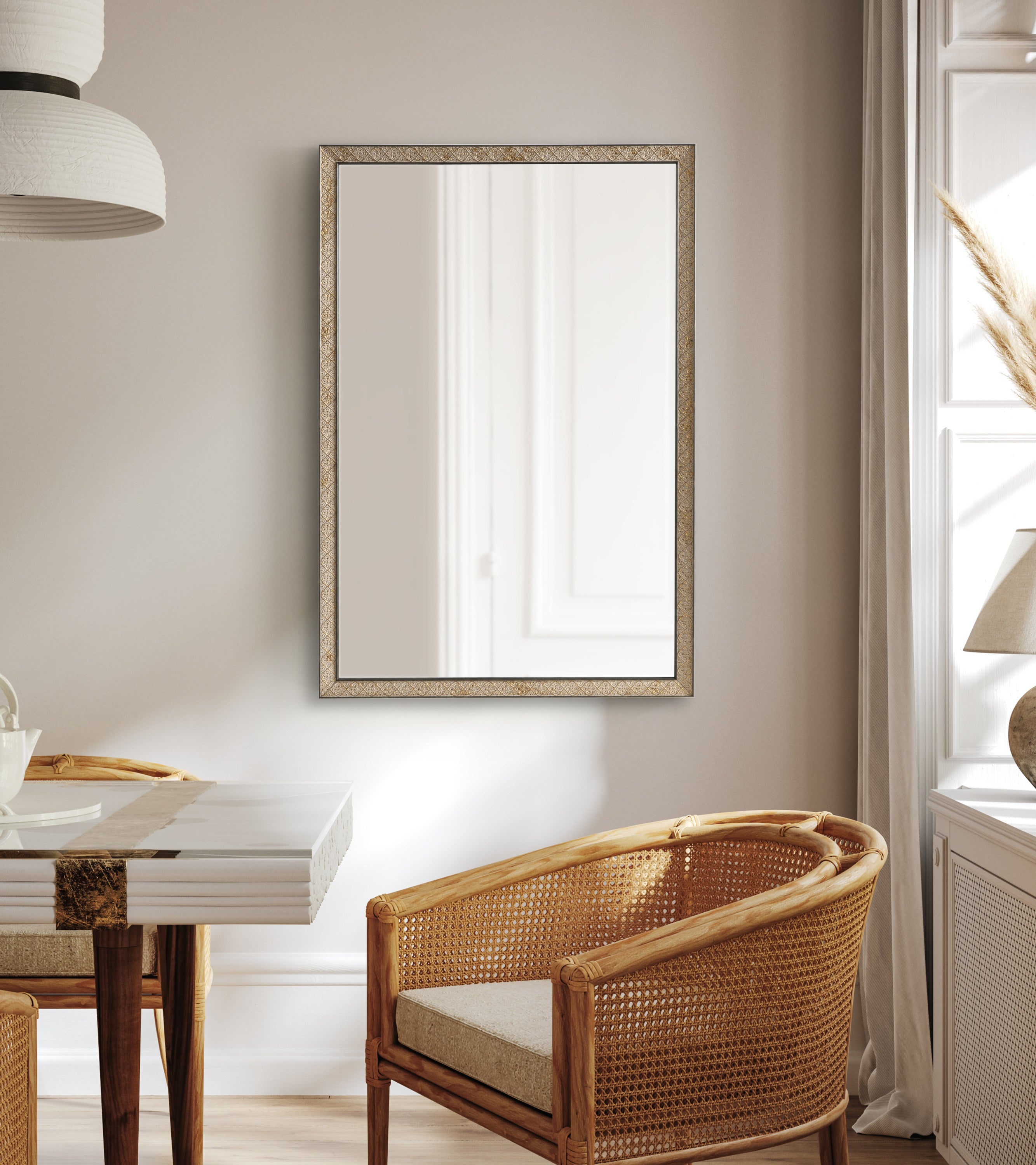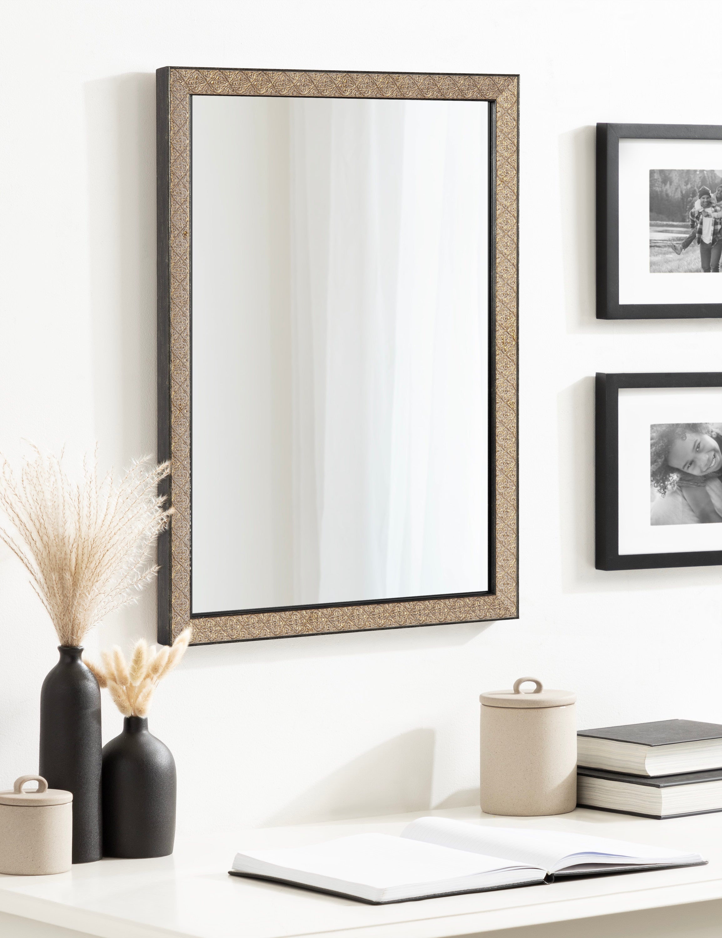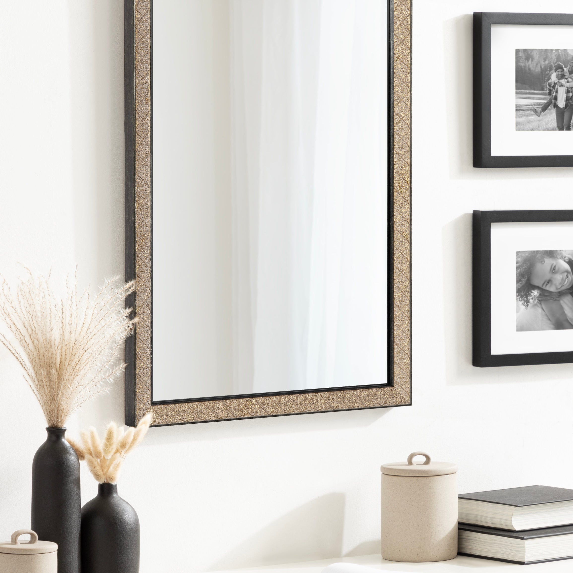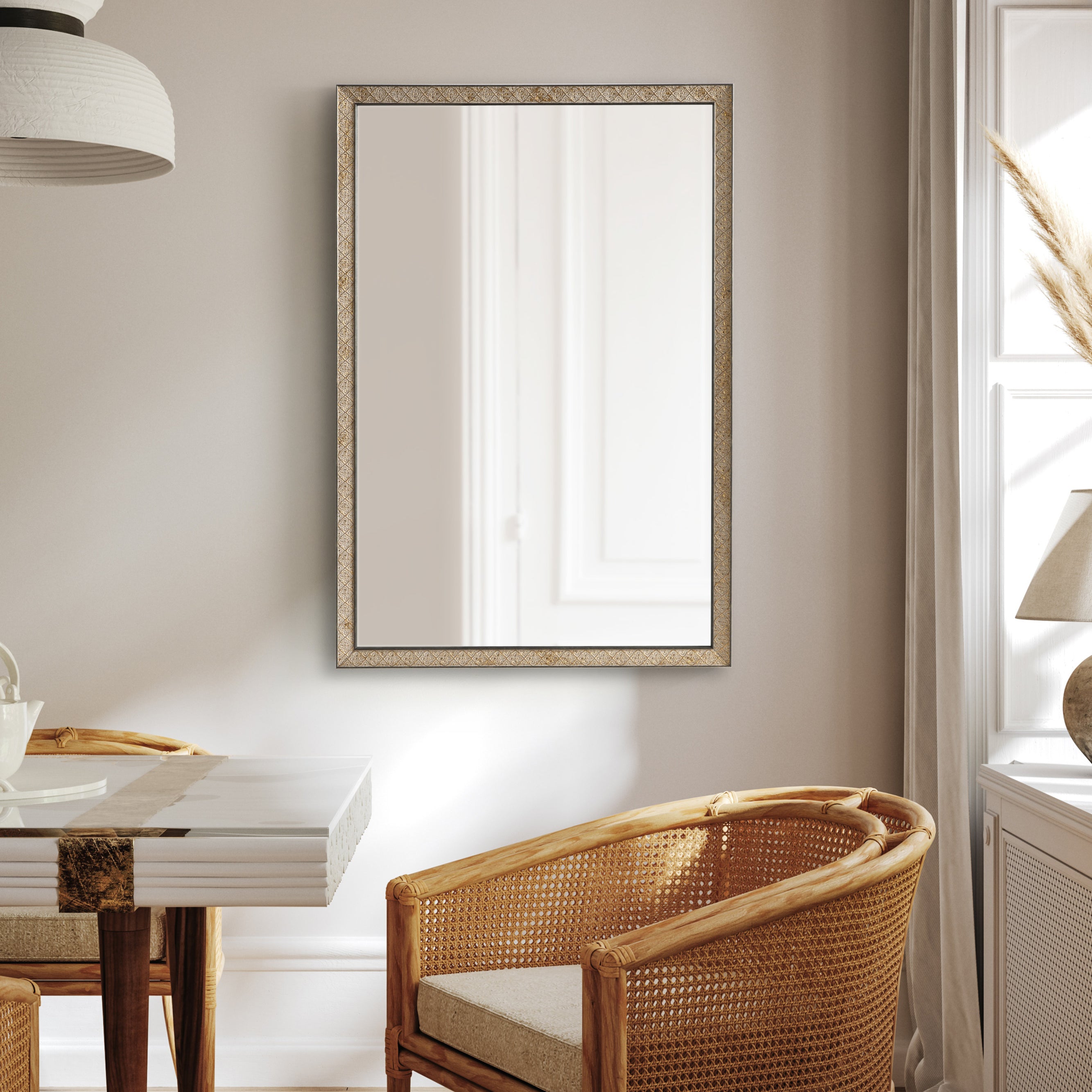 This beautiful mirror boasts a global traditional design with a unique vintage finish and embossed ornate texture. The scrolling ornamental texture and multi-toned metallic finish add an elegant touch to the frame, making it a stylish and sophisticated addition to any room. The rectangular shape of the mirror is perfect for use as a bathroom vanity mirror, providing ample space for getting ready for the day.