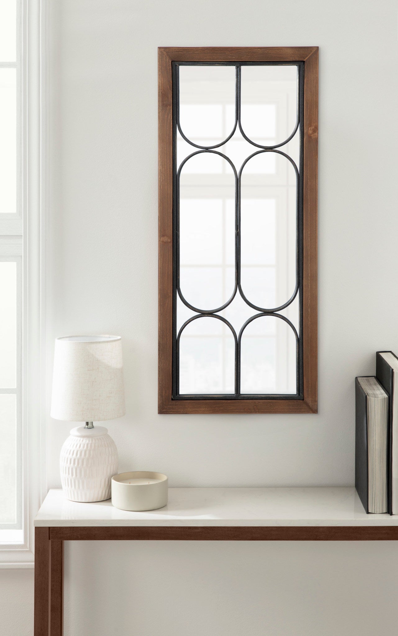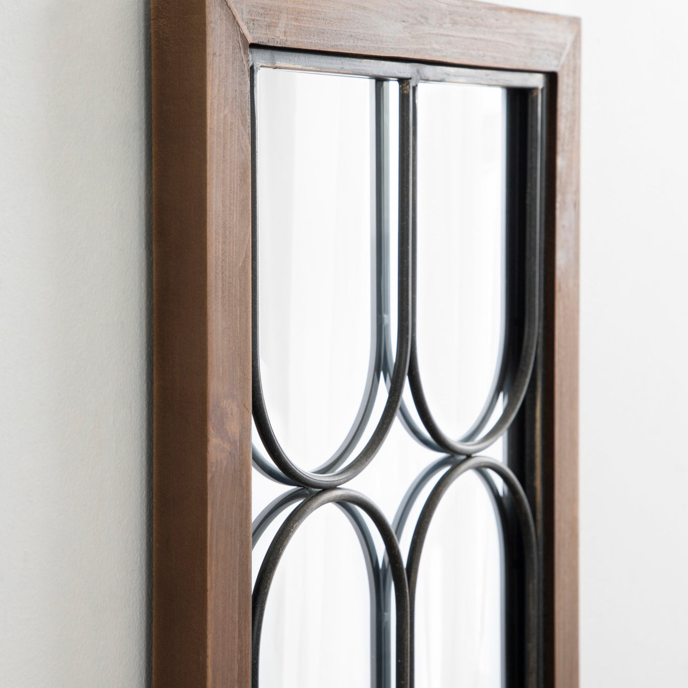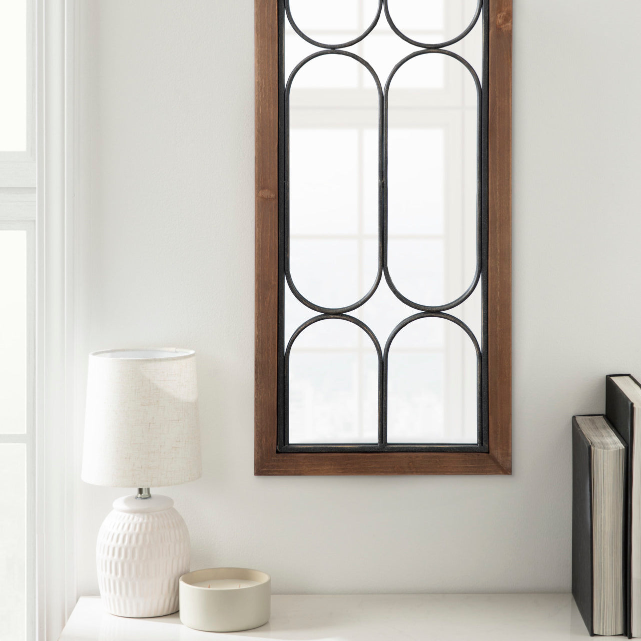 Transform your space with the Spechett framed wall mirror for your home or office depending upon your desired style. Evoking the style of decorative doors or windows, the windowpane inlay adds a distinct dimension beyond your standard rectangle mirror. The combination of natural wood tones and industrial iron lines creates a unique contrast for those seeking to integrate both farmhouse and modern styles into their home decor.