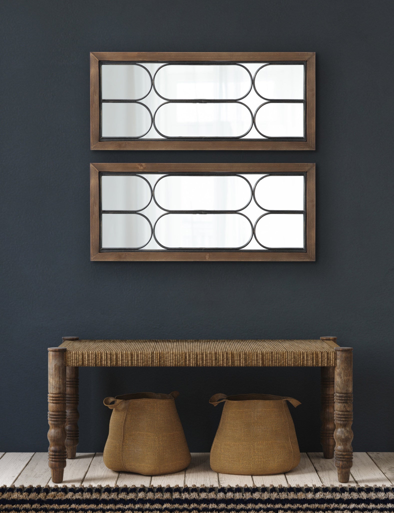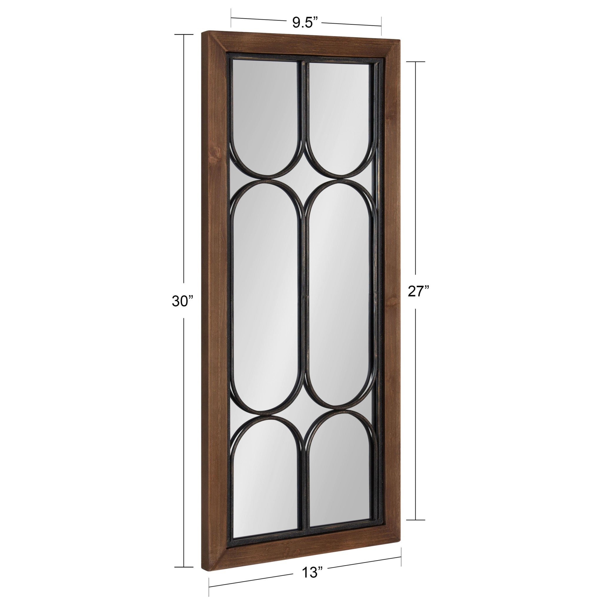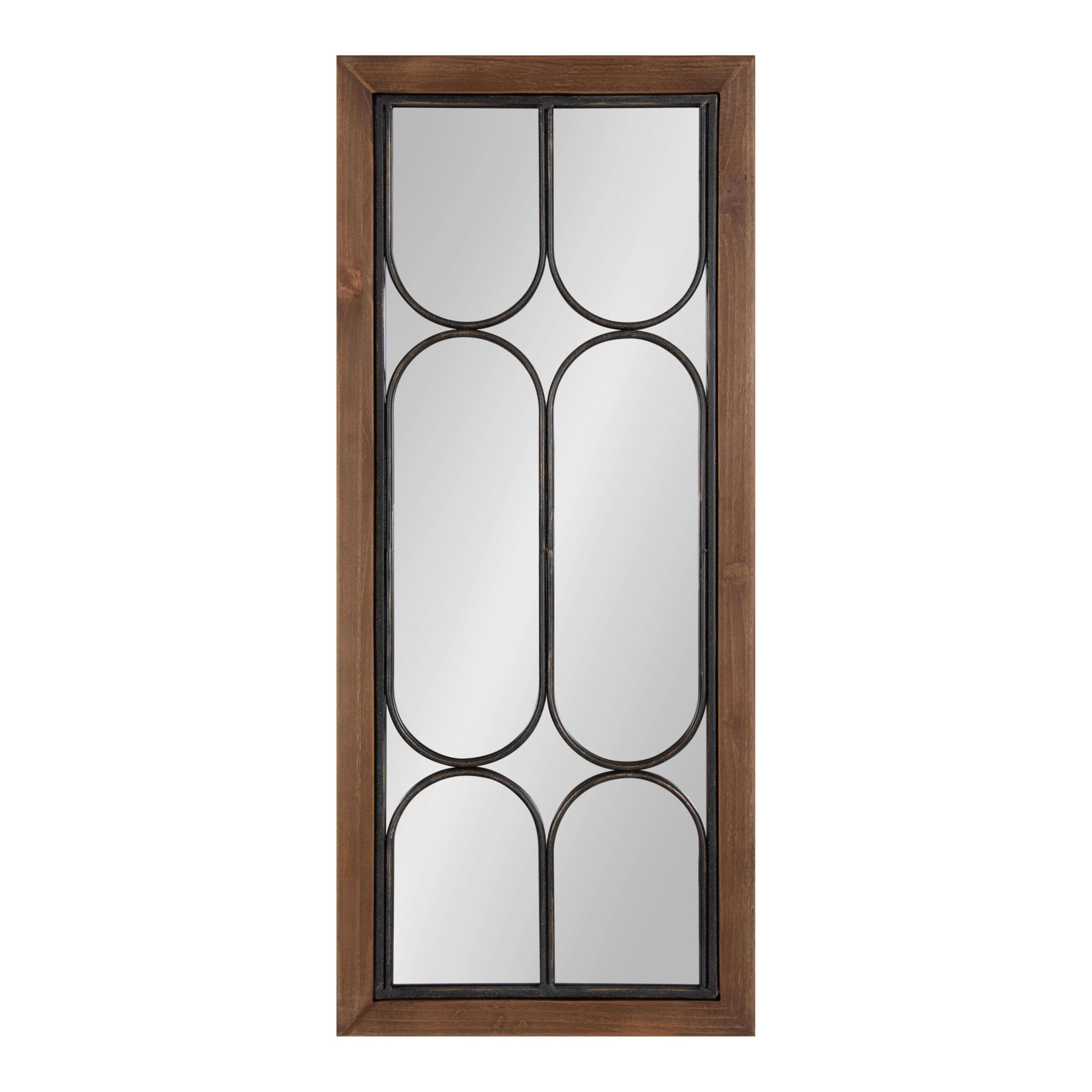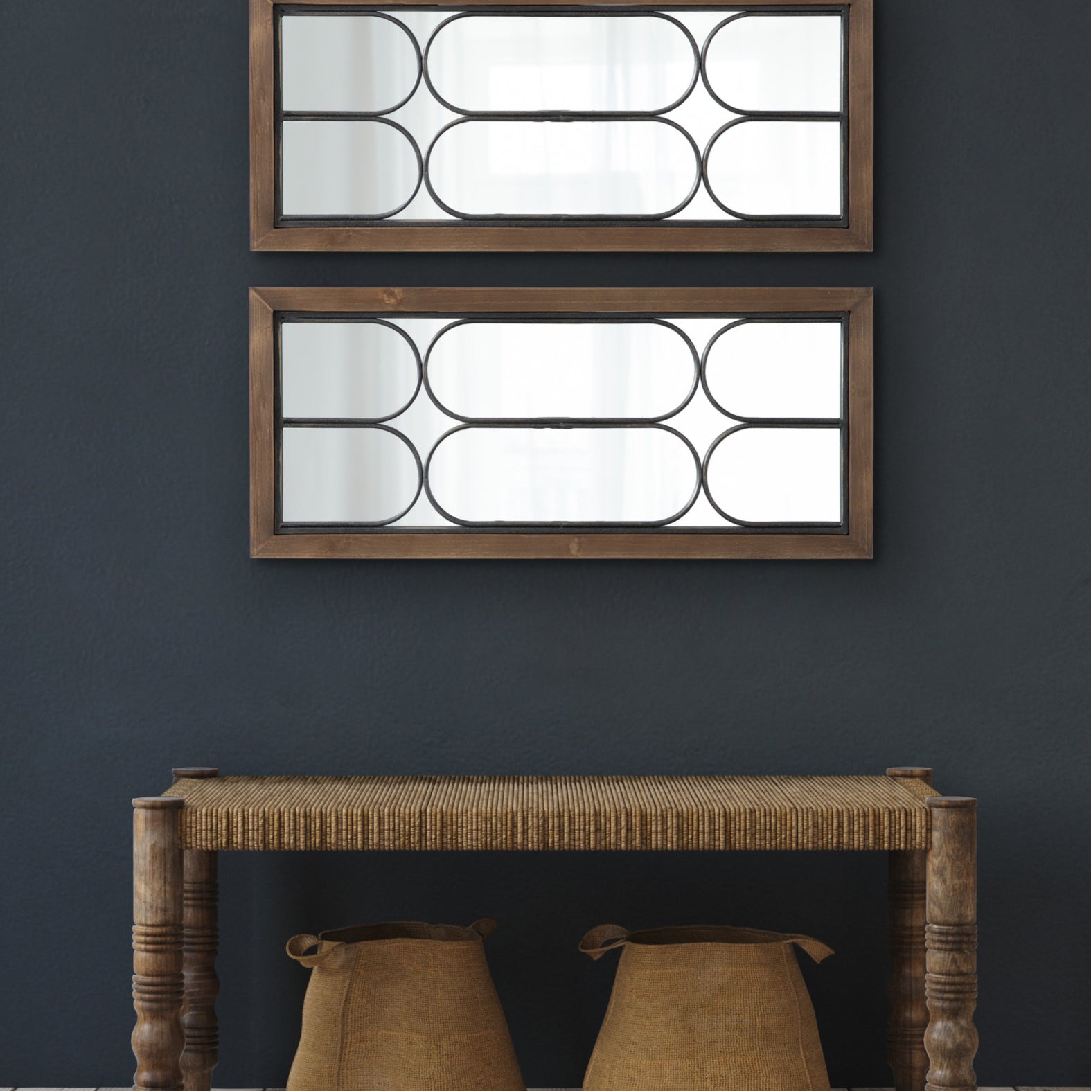 Transform your space with the Spechett framed wall mirror for your home or office depending upon your desired style. Evoking the style of decorative doors or windows, the windowpane inlay adds a distinct dimension beyond your standard rectangle mirror. The combination of natural wood tones and industrial iron lines creates a unique contrast for those seeking to integrate both farmhouse and modern styles into their home decor.