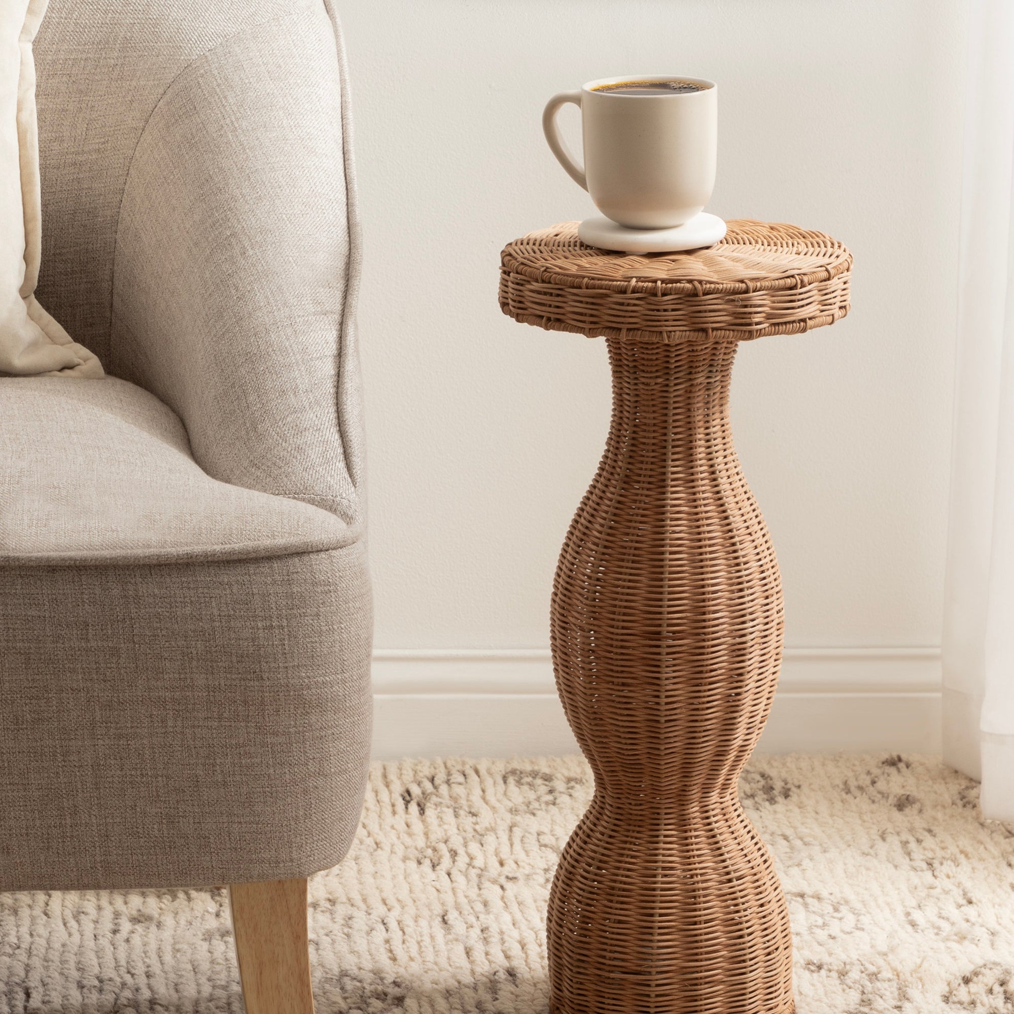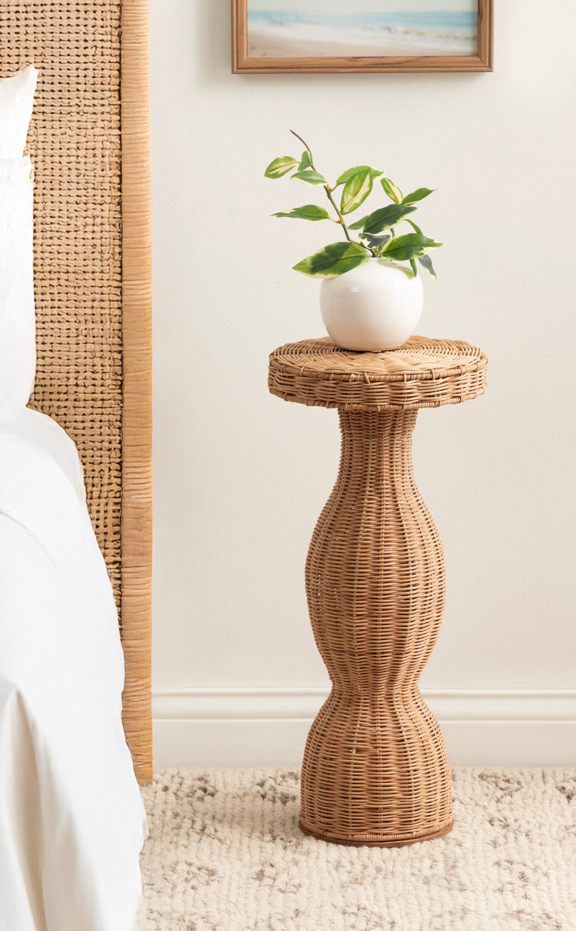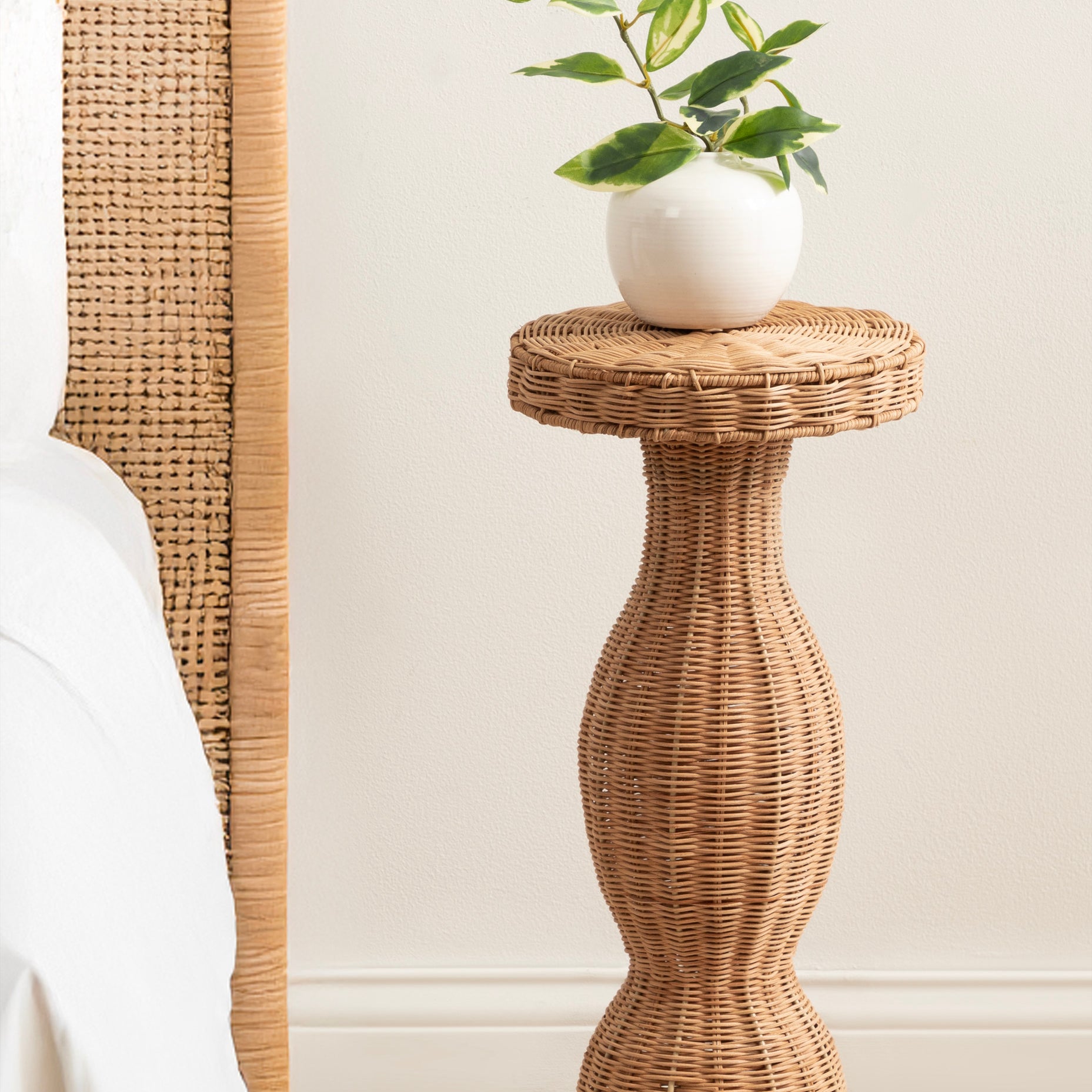 Add a charming accent to your home with this Sula rattan drink table. Between its woven base and tabletop, the table serves as the most delightful display accent. Crafted from premium materials, this table features high-quality rattan for a boho wicker table look. Crafted with soft curvature in mind, the base of this mini table boasts a unique sculptural design. The Sula is the optimal accent table for your living room, bedroom, or home office area. Commonly used as a living room drink table, this table also serves as a lovely boho plant stand. Perfect for a beach house or vacation home, this coastal accent table perfectly accentuates your beachy decor. With its unique design, this coastal drink table comes fully assembled, so you can start enjoying and decorating it at once. Complete your living room or bedroom decor scheme with this boho decor piece.