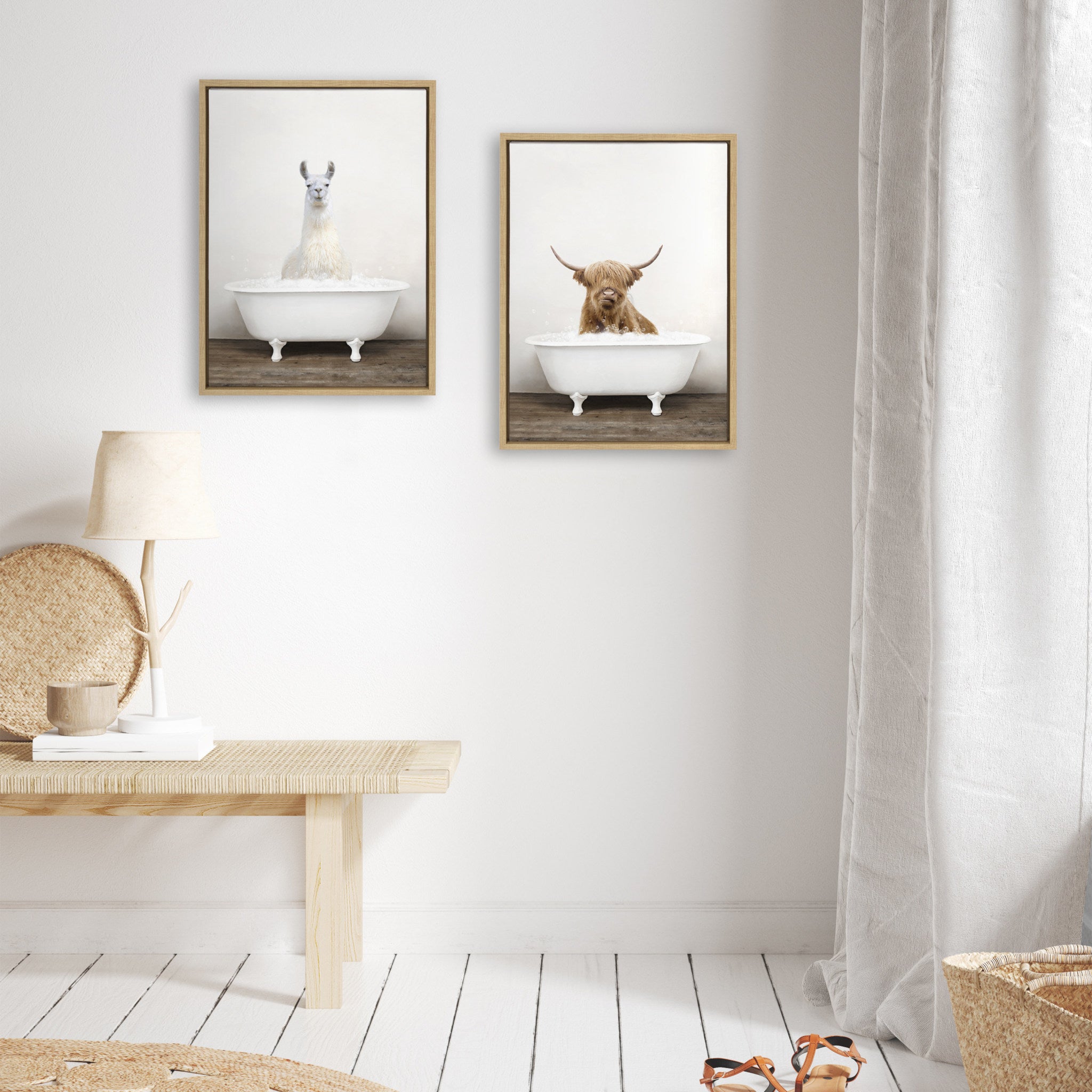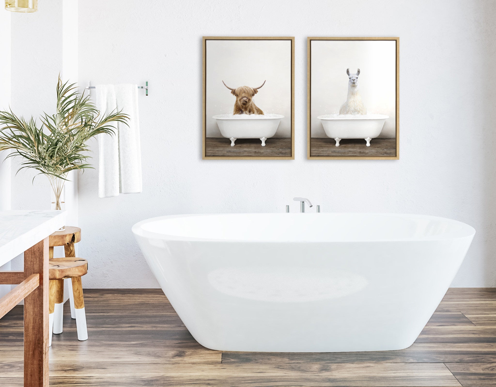 Sylvie Highland Cow Rustic Bubble Bath and Llama Rustic Bubble Bath Framed Canvas by Amy Peterson Art Studio