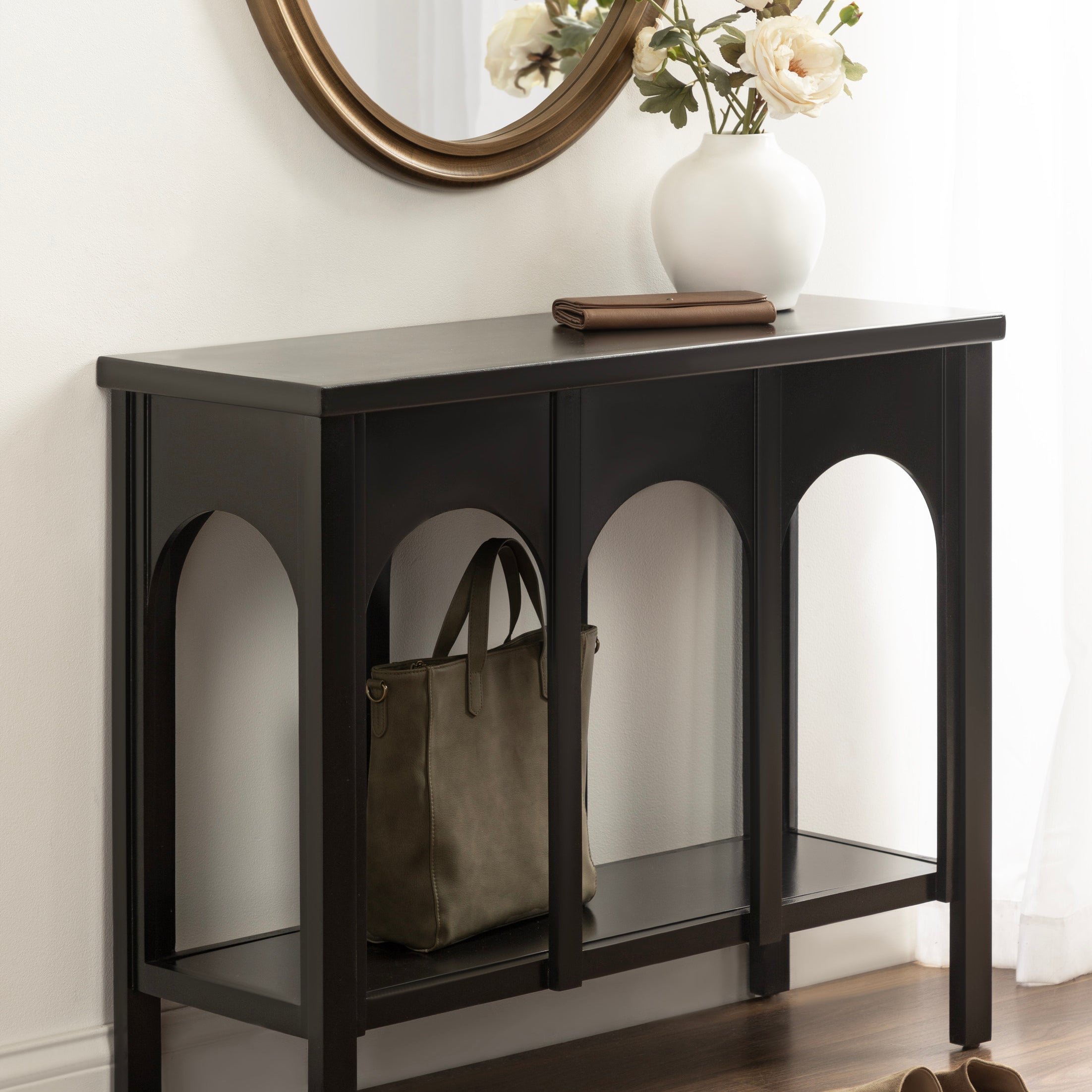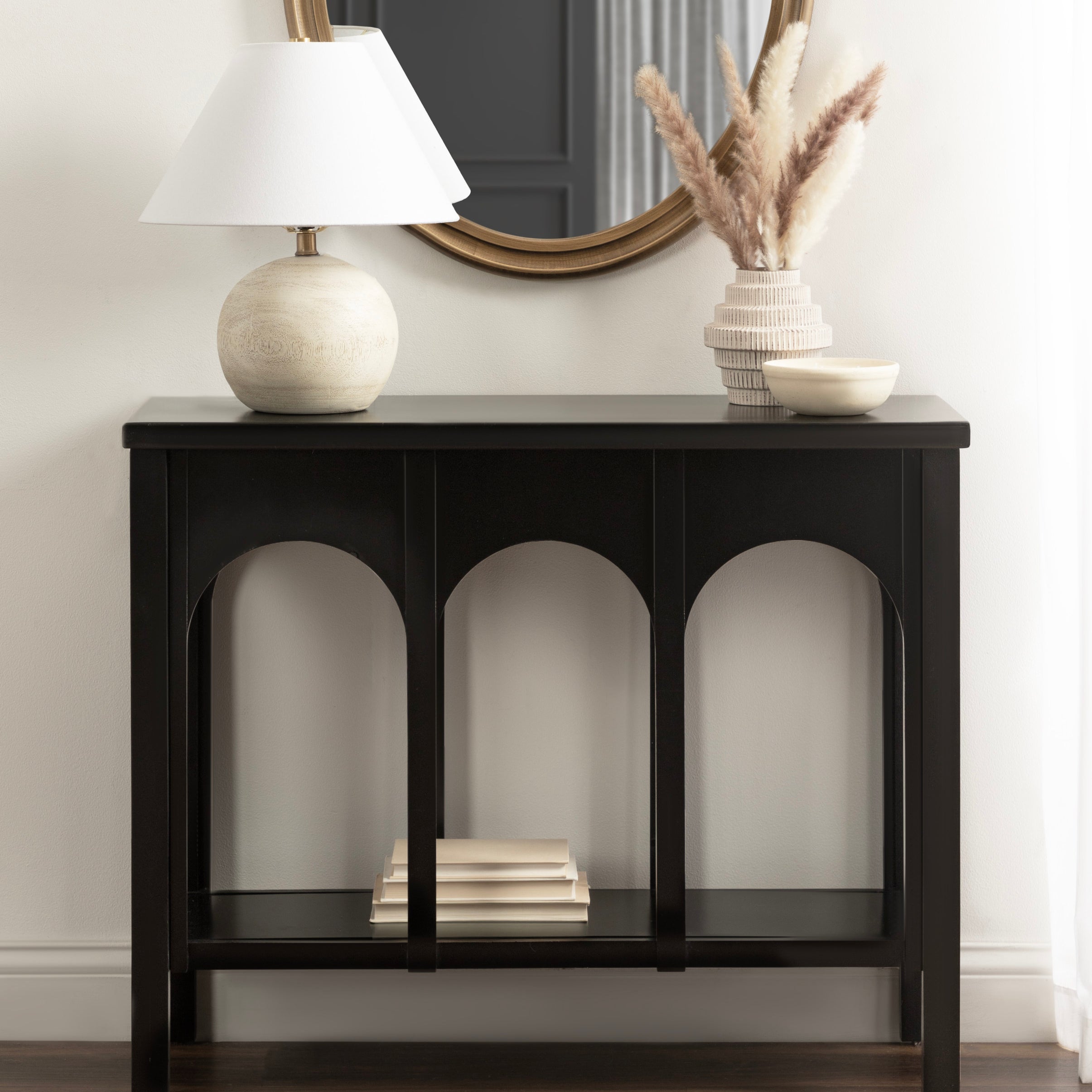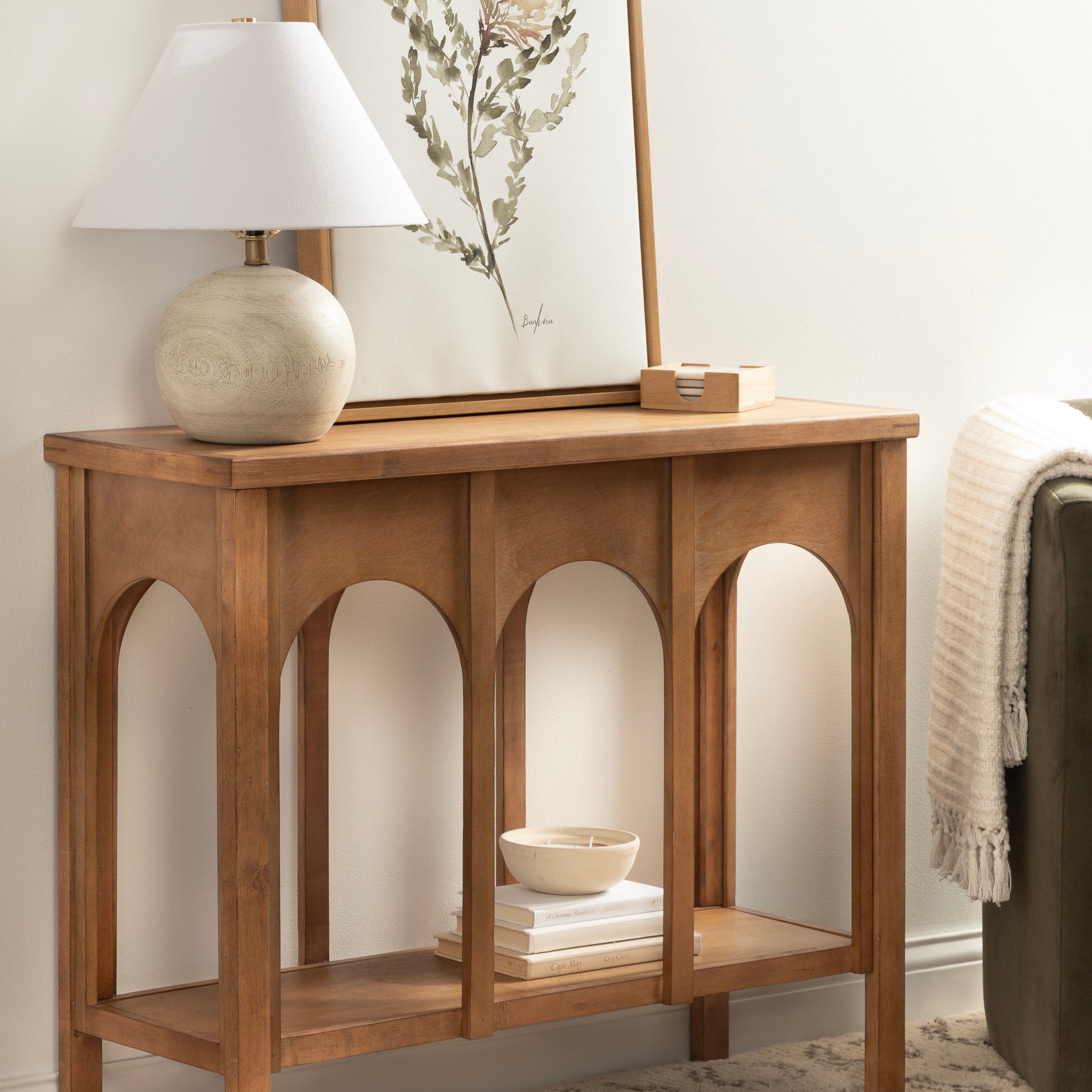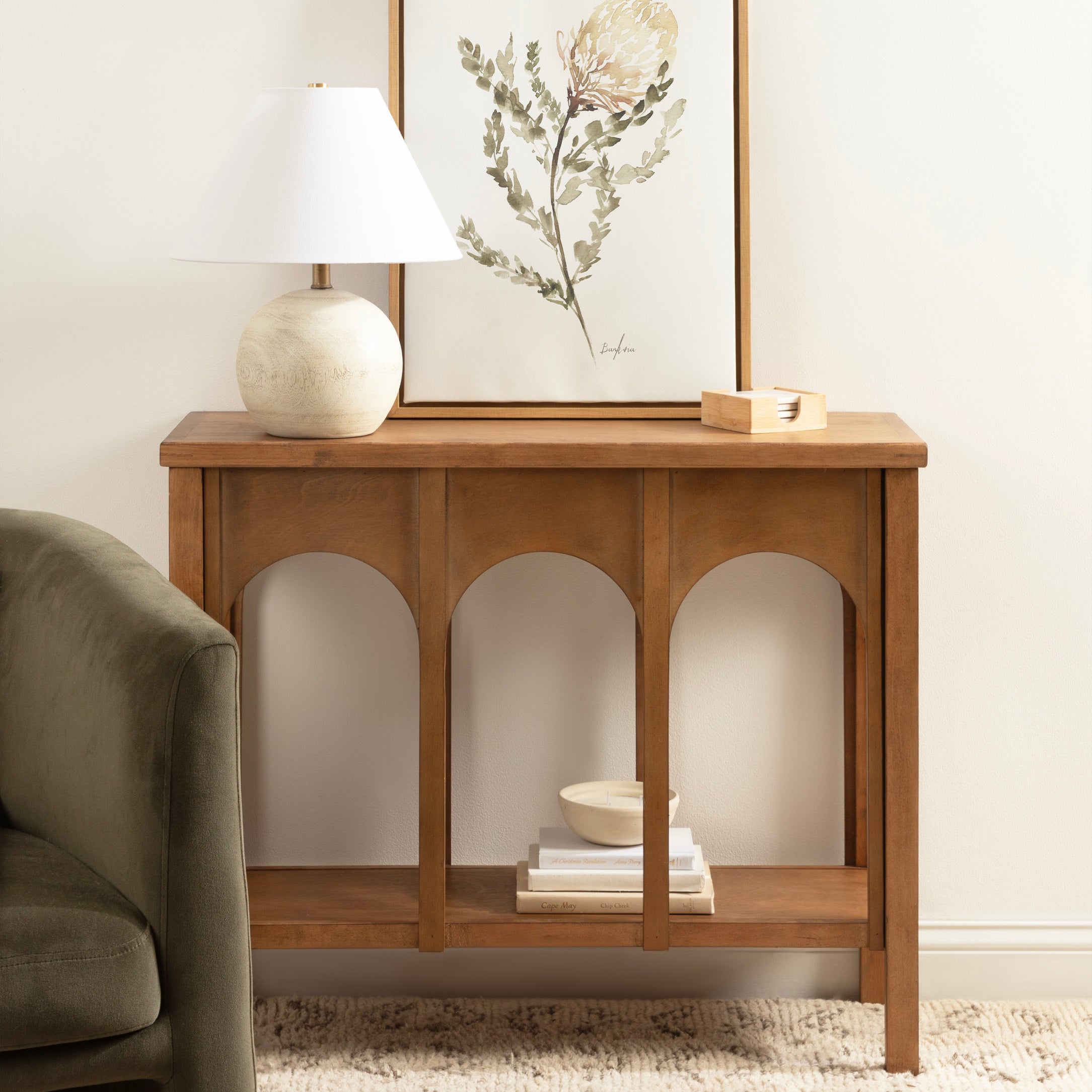 Showcase your transitional-inspired style with the Ulla console table from Kate and Laurel. The specific finish of the table adds a touch of sophistication to any space, while the simple and clean lines of the design make it easy to blend seamlessly with any decor style. The specific design creates modern arches from the negative space between the tabletop and underlying shelf. A careful blend of solid wood and resilient wooden material was used to create this beautiful entryway table, creating a statement that is as durable as it is beautiful. The tabletop is perfect for creating a spacious display area for candles, small lamps, and other decor accents. The bottom shelf of the Ulla is great for storing your favorite household accessories, from blankets and pillows to everyday essentials. Or, use it to store a few pairs of shoes near your entryway. Assemble this table in only a matter of minutes with a straightforward, three-step assembly process.