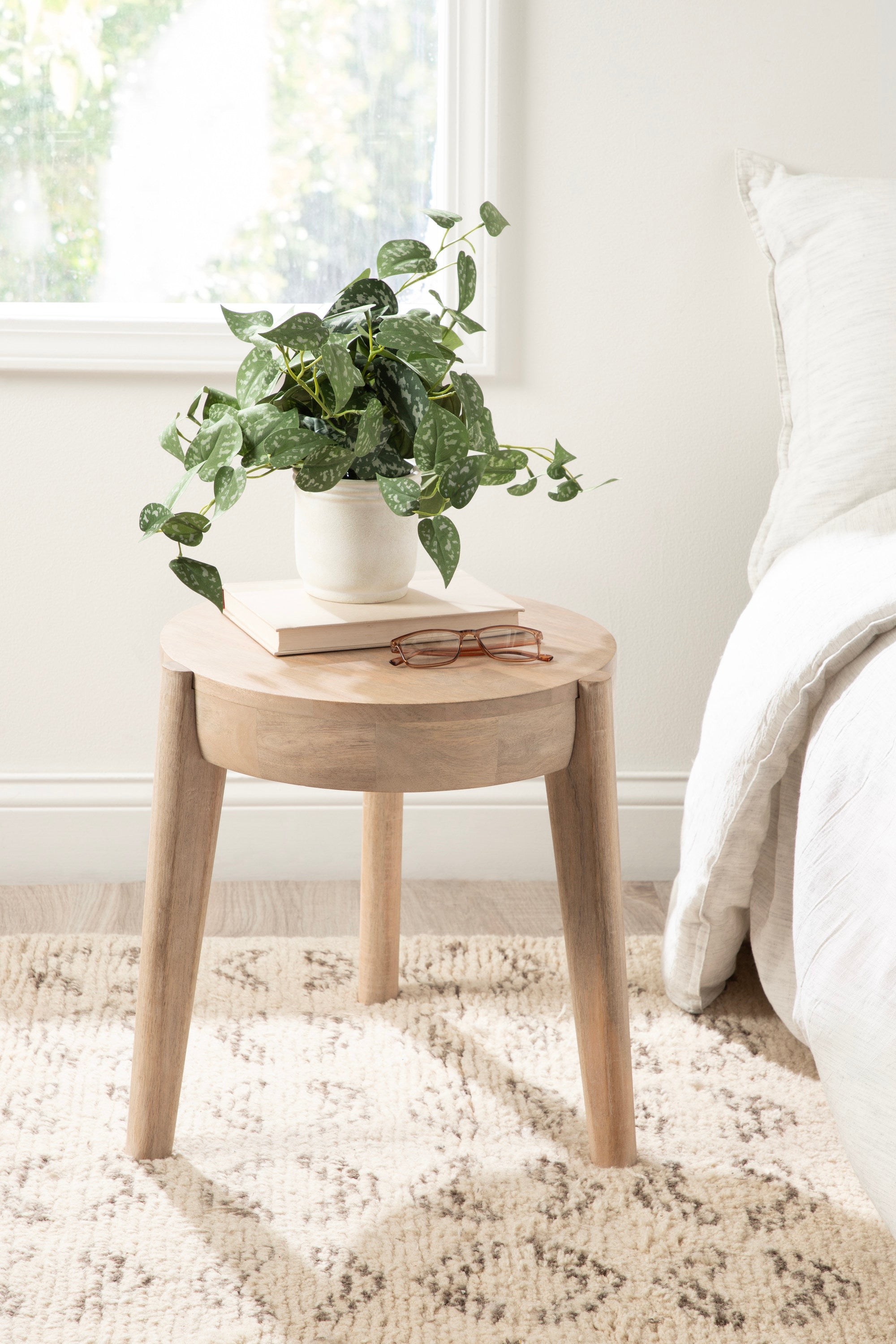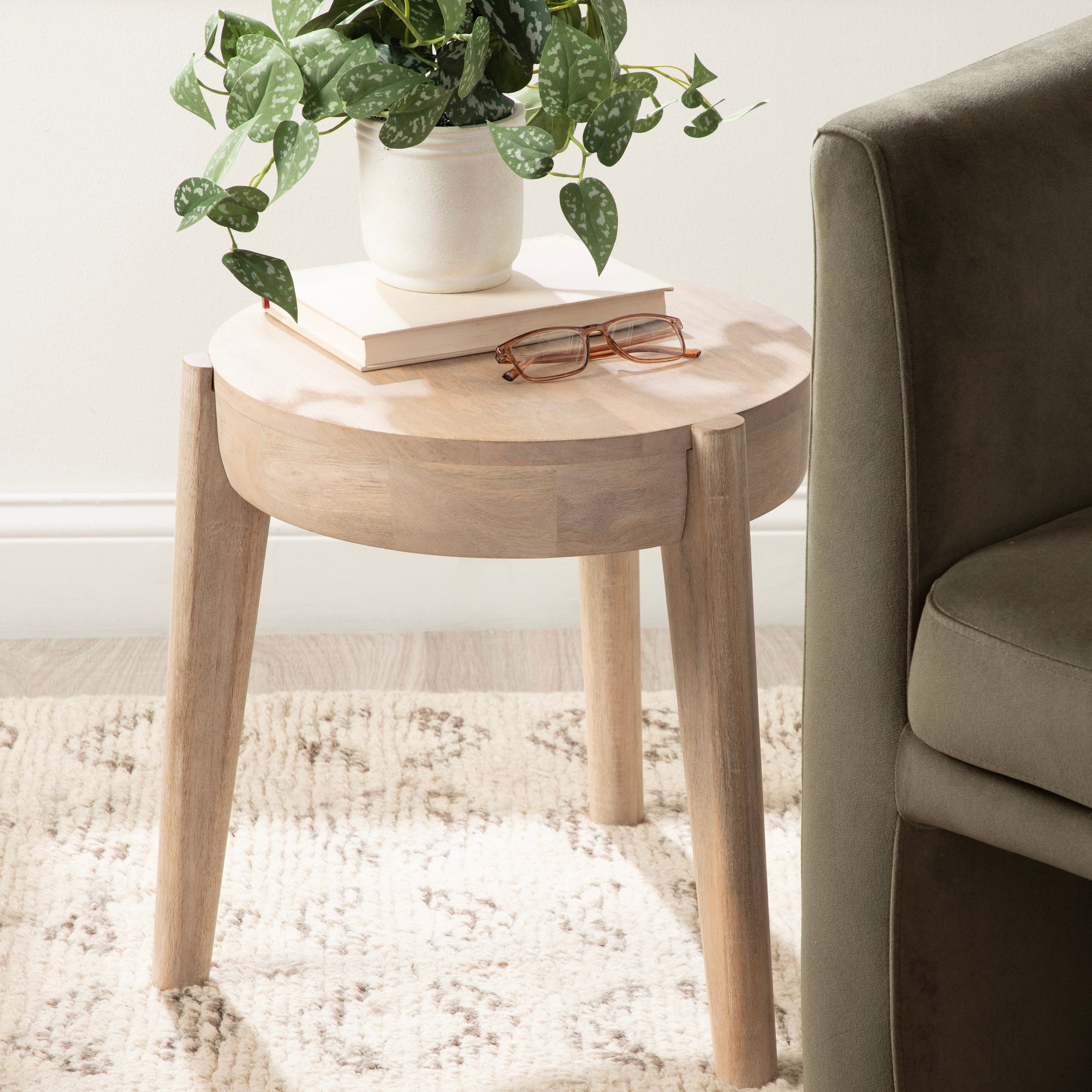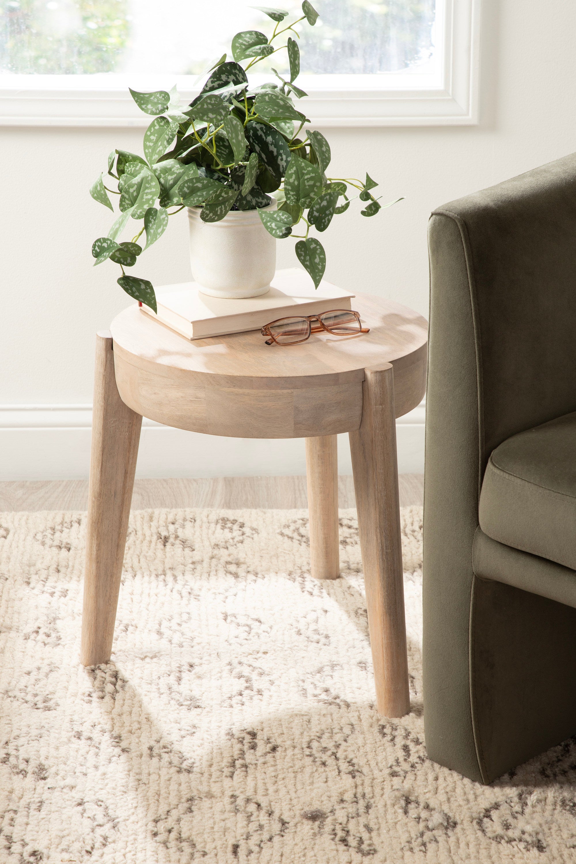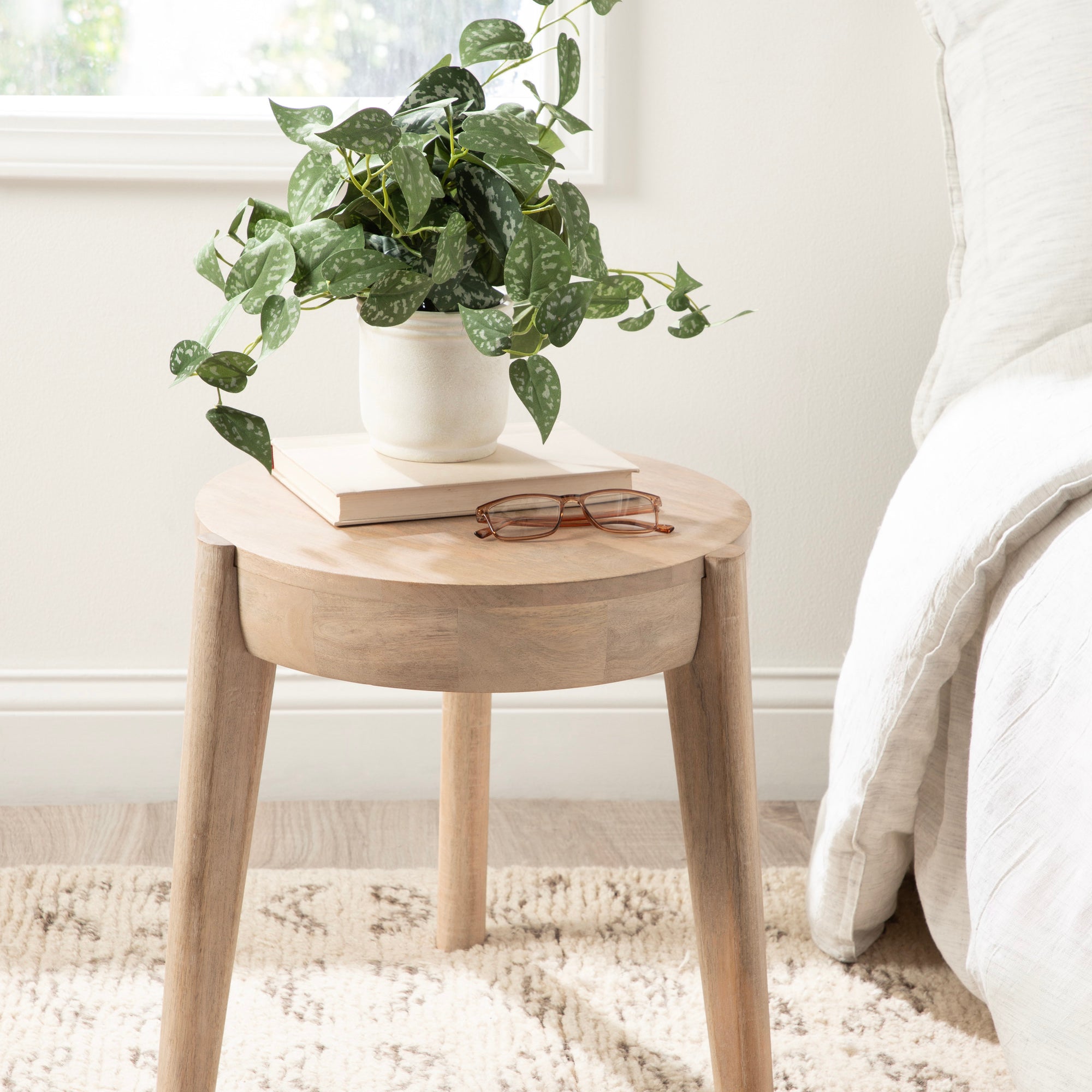 Enhance your home decor with the Kate and Laurel Vola round side table. The circular shape adds a touch of geometric elegance, making it a standout addition to any room. As a stylish mango wood nightstand, it offers ample space for your bedside essentials, from a lamp and alarm clock to your favorite books. In the living room, it serves as an eye-catching pedestal table, ideal for displaying decorative items, plants, or photos. Additionally, it can function as a chic bedroom vanity stool, providing a sturdy and attractive seating option rated to hold up to 225 pounds. The Vola end table is designed with both form and function in mind.