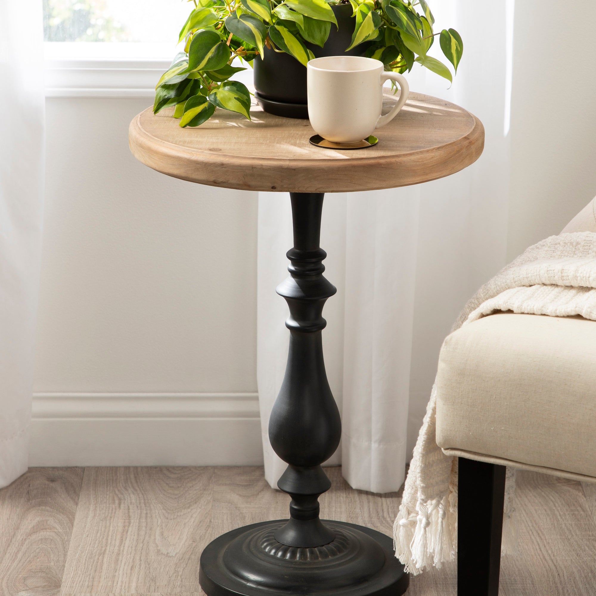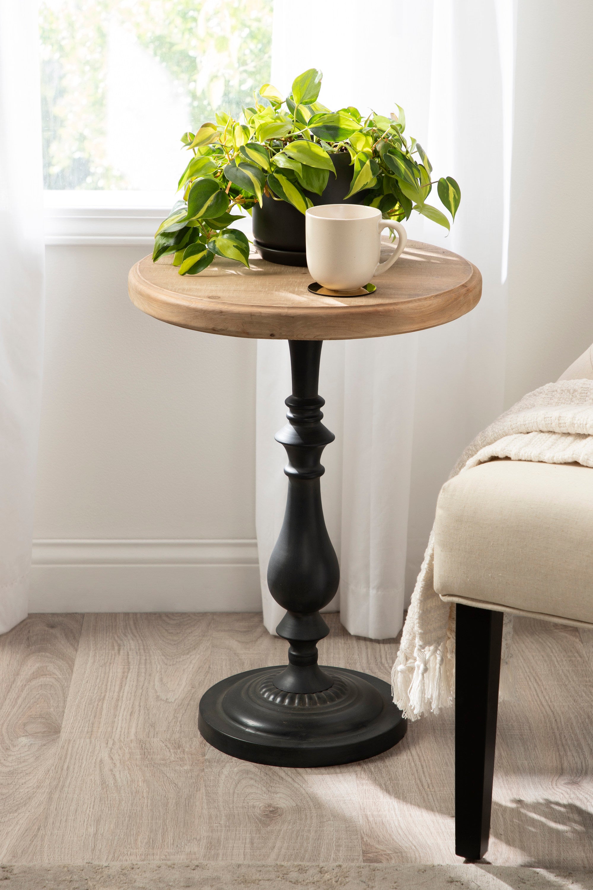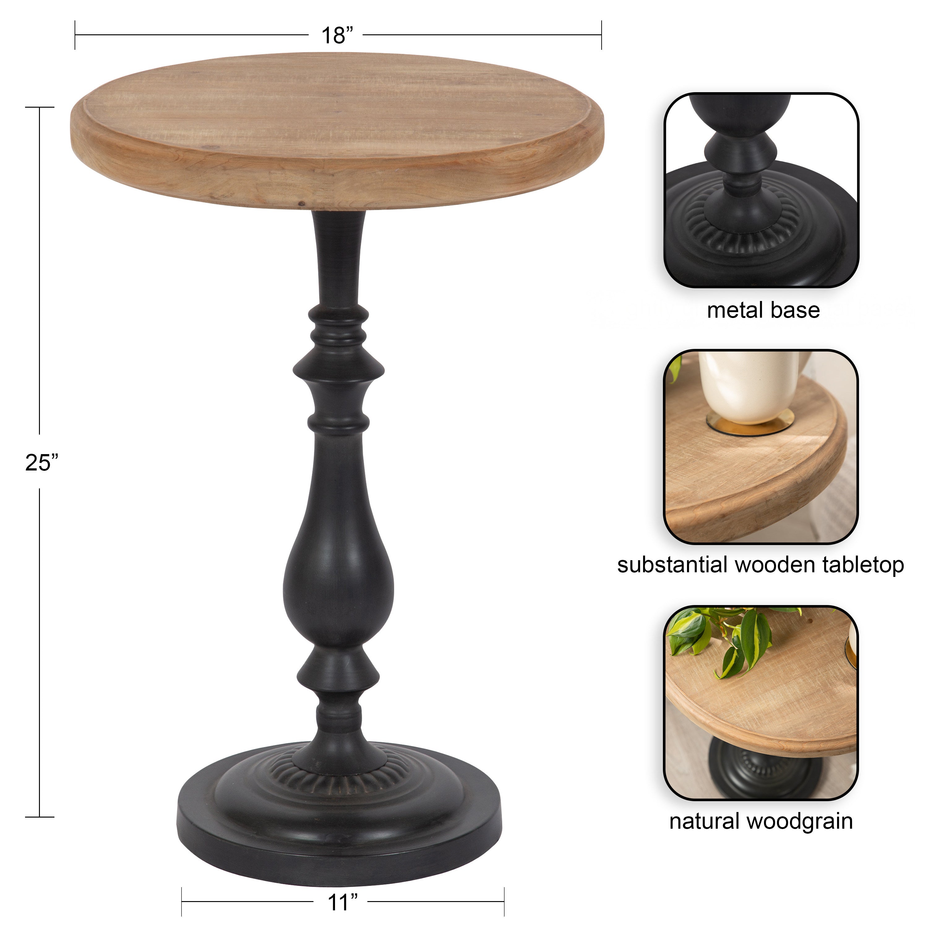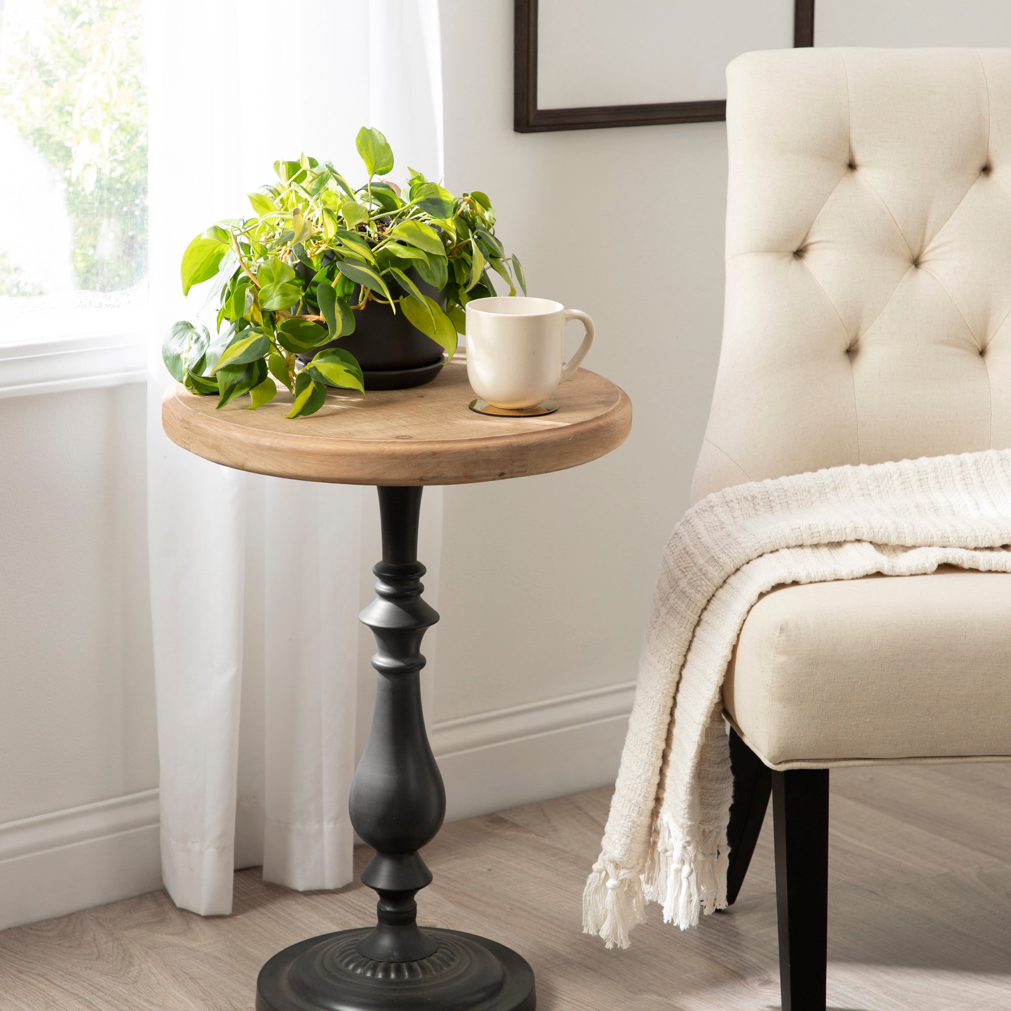 Embrace farmhouse charm with this lovely Wixley round side table. Between its sturdy iron base and its wooden tabletop, this side table boasts a charming mixed materials design. This round pedestal table offers farmhouse style with some traditional accenting between its turned base and beaded detail toward the bottom of the base.