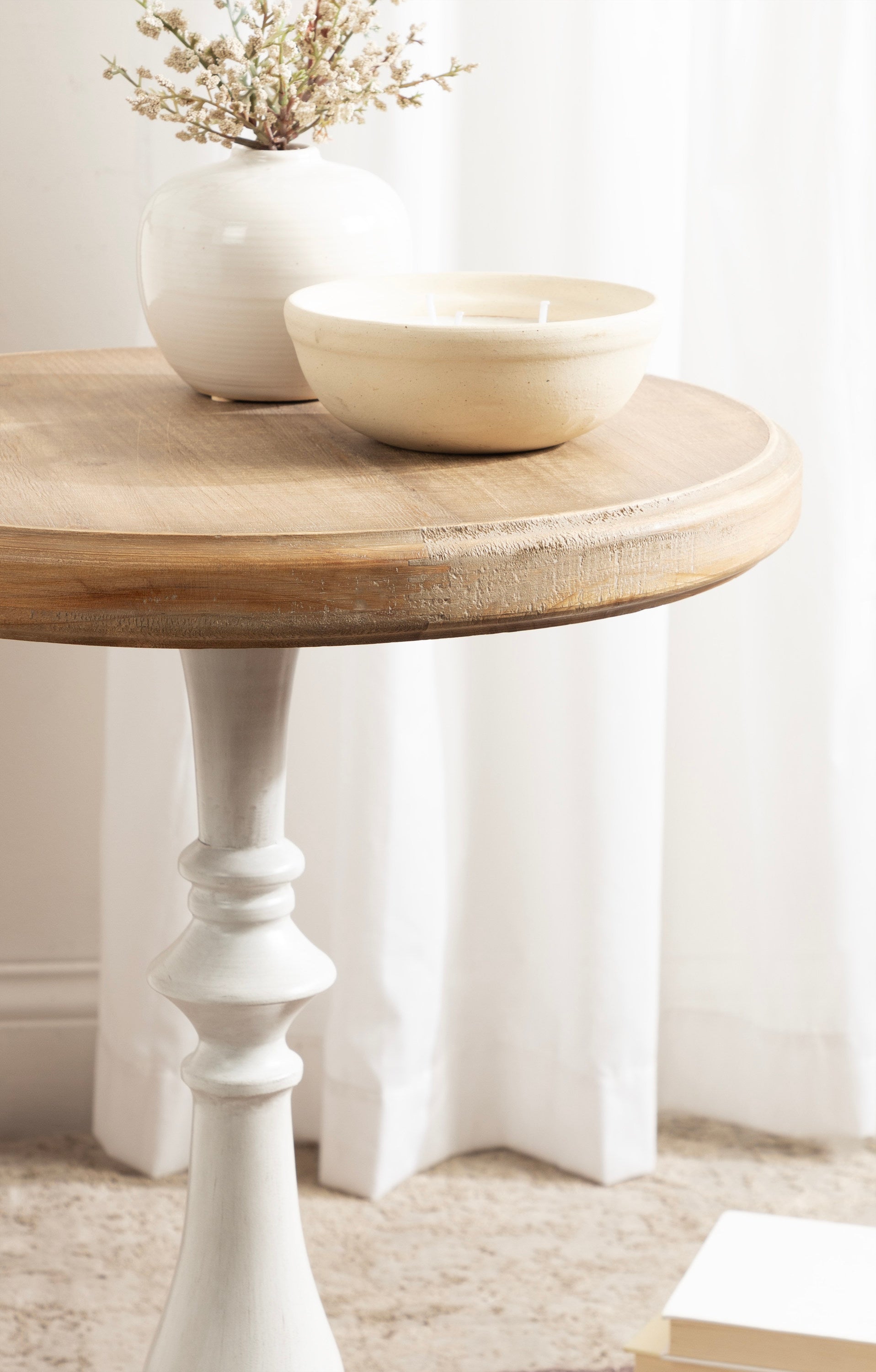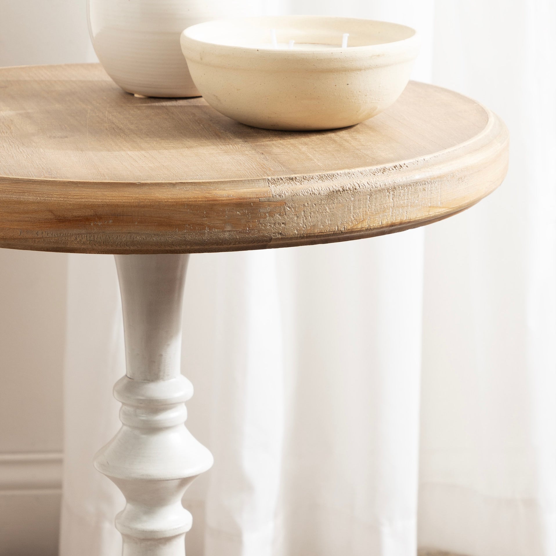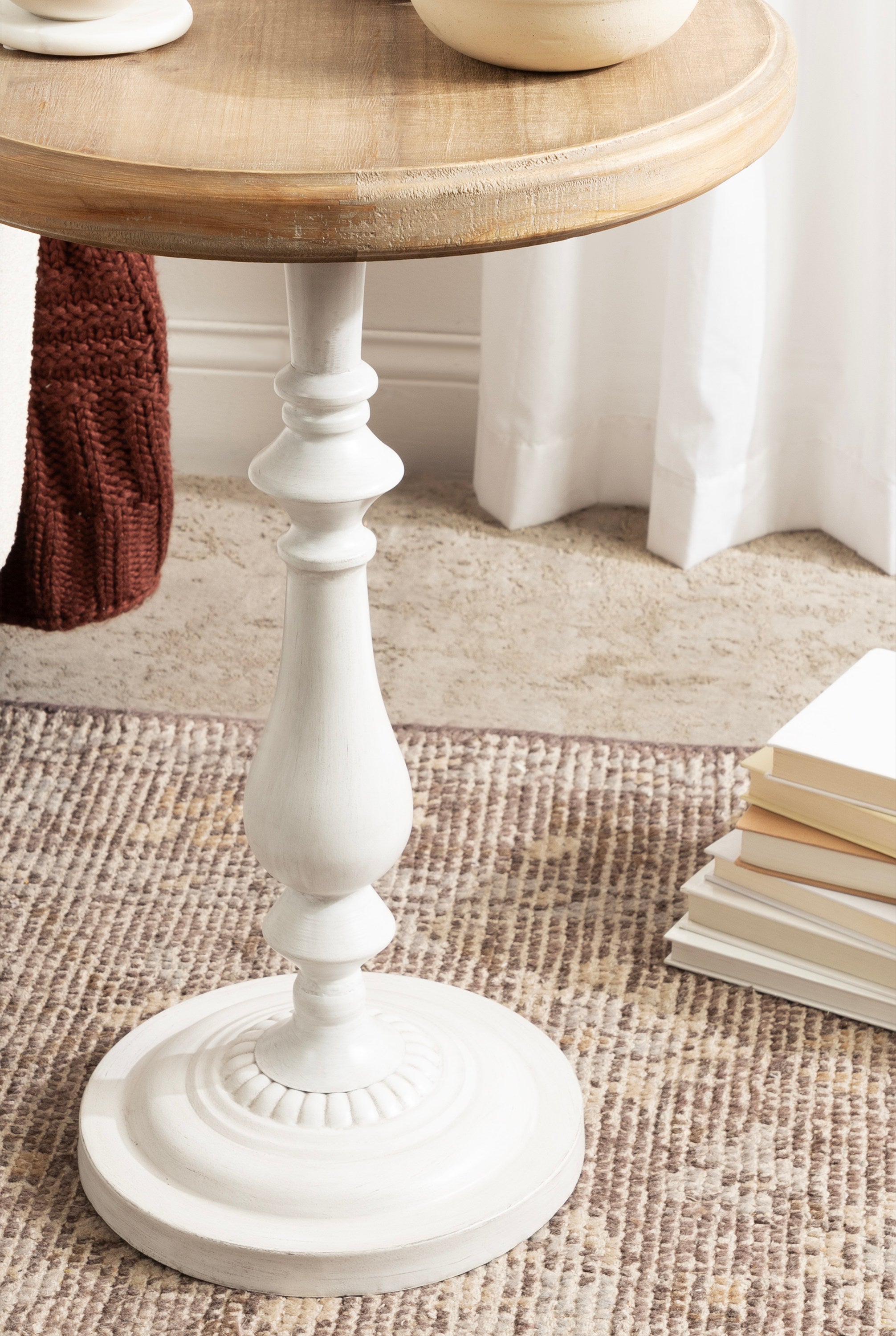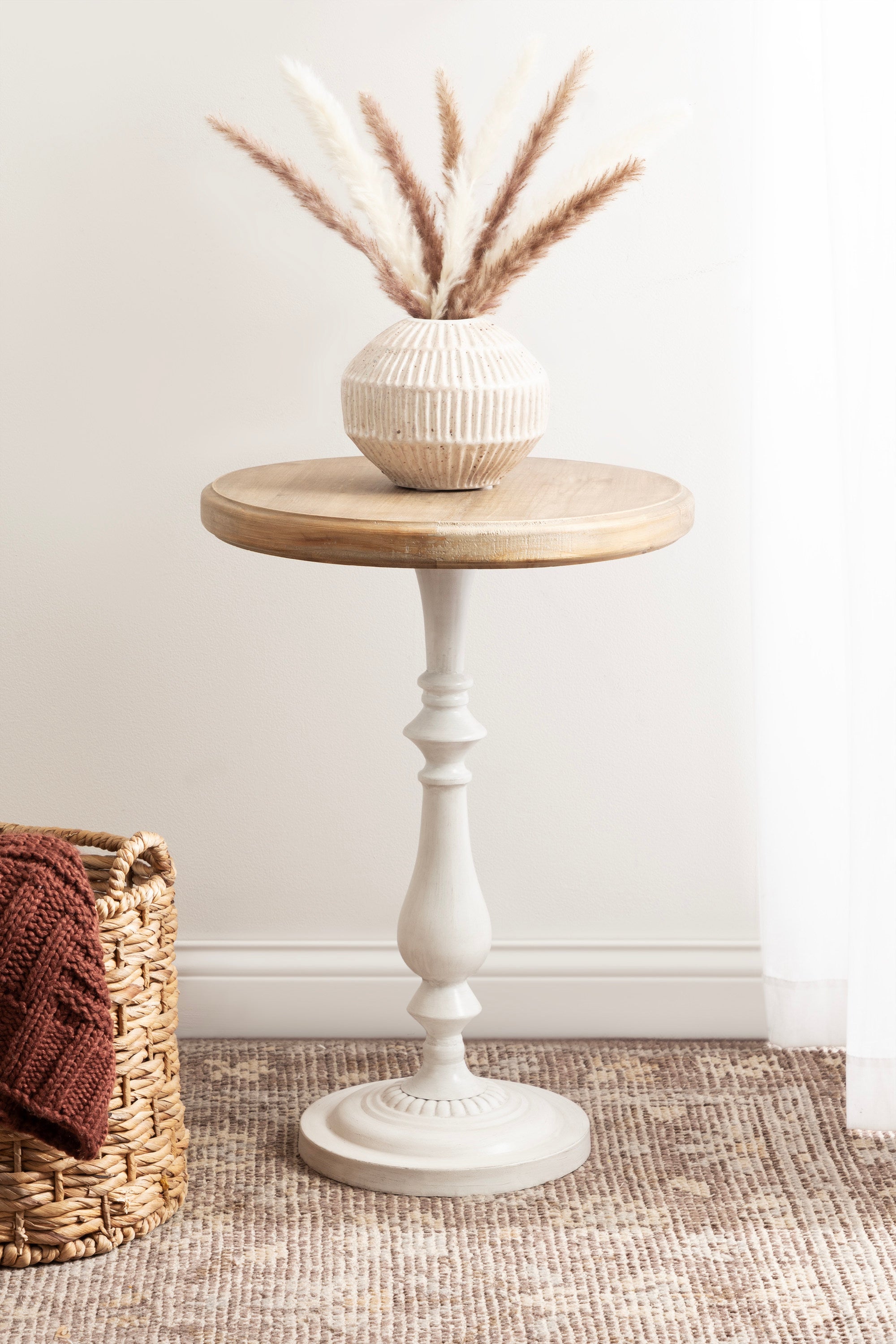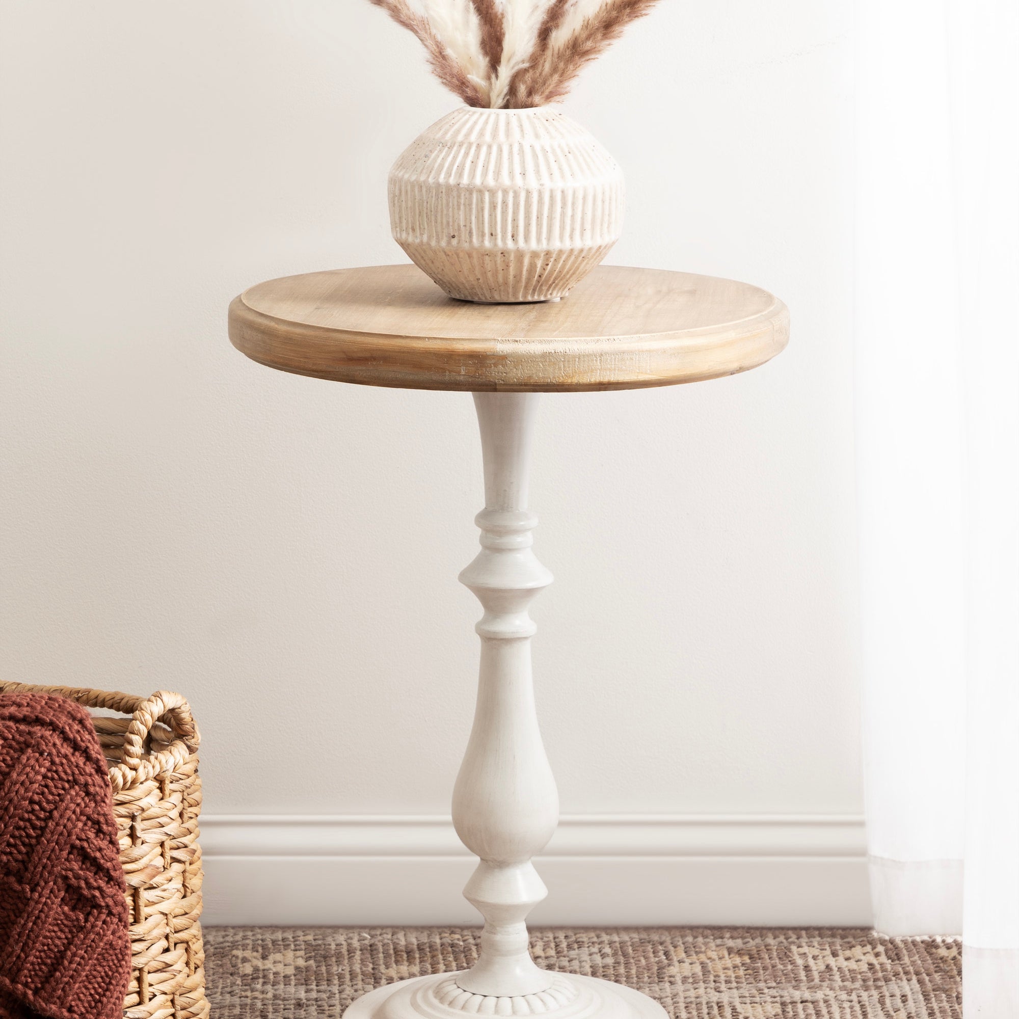 Embrace farmhouse charm with this lovely Wixley round side table. Between its sturdy iron base and its wooden tabletop, this side table boasts a charming mixed materials design. This round pedestal table offers farmhouse style with some traditional accenting between its turned base and beaded detail toward the bottom of the base.