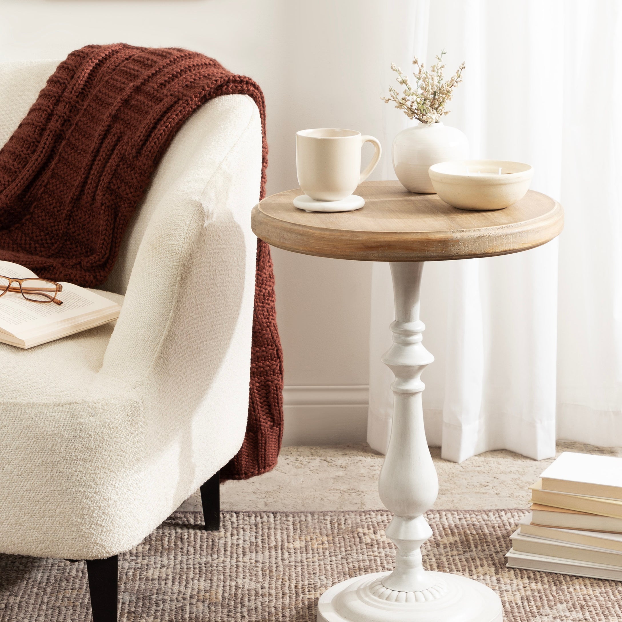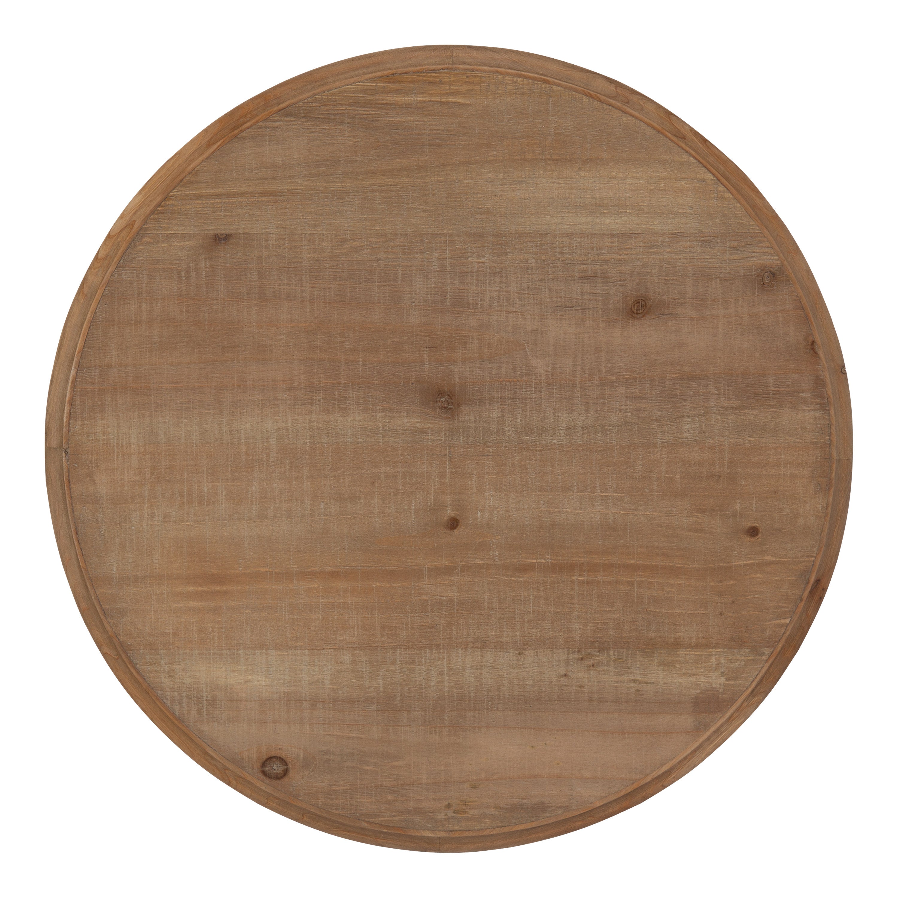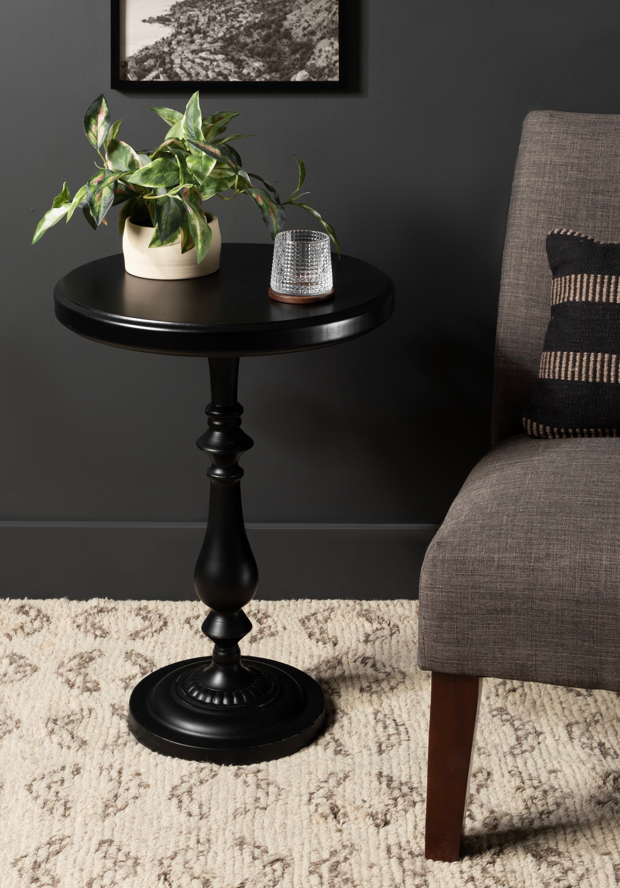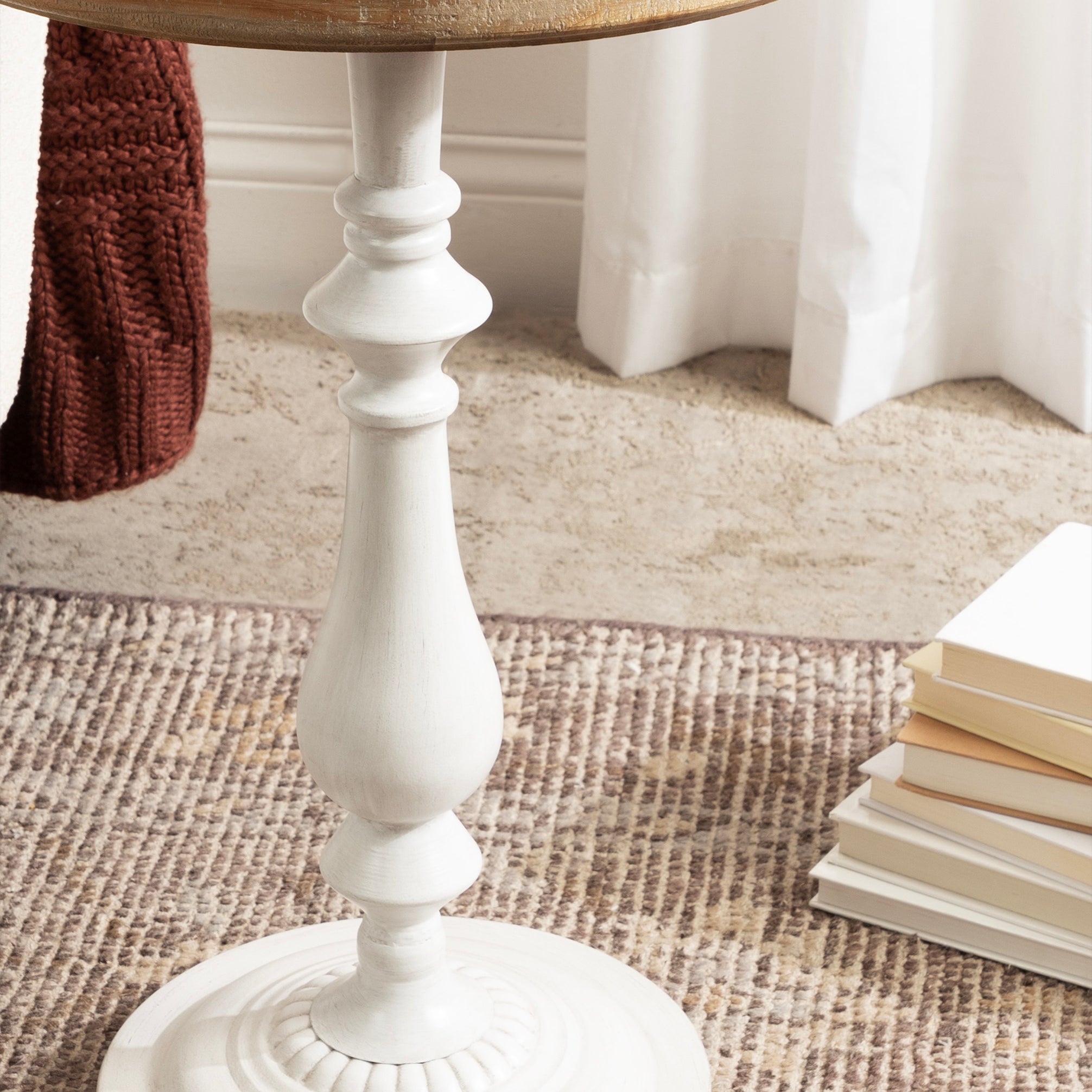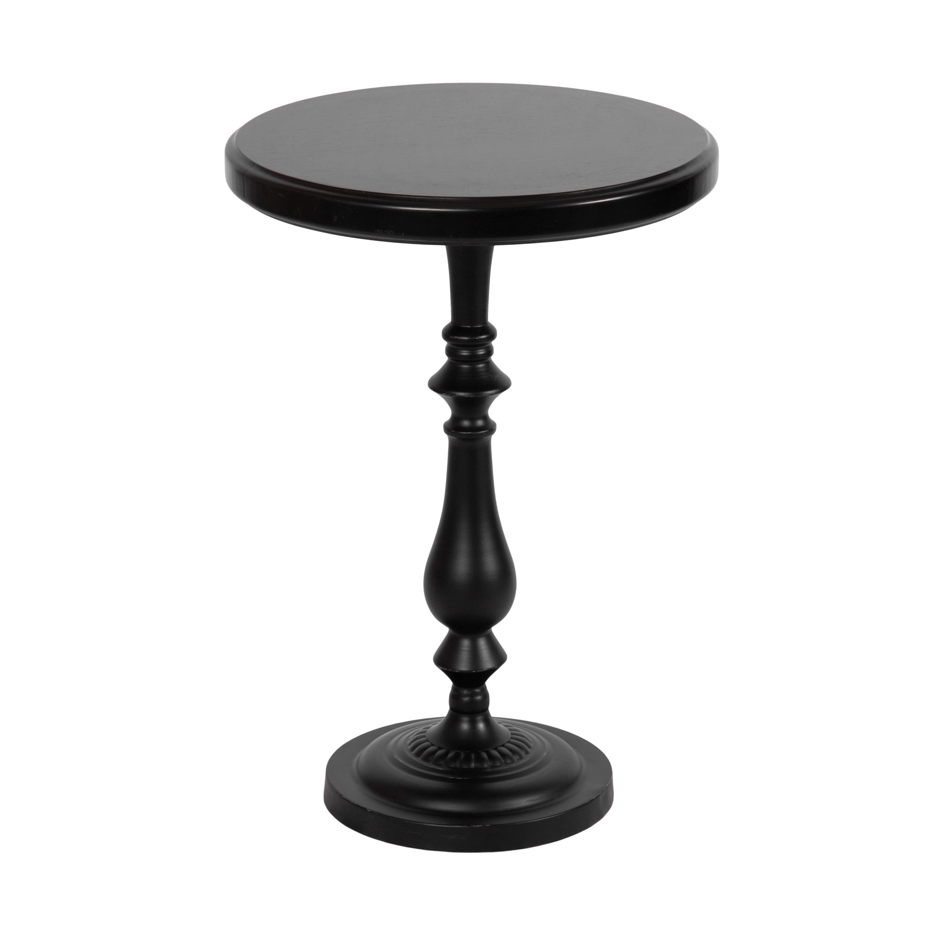 Embrace farmhouse charm with this lovely Wixley round side table. Between its sturdy iron base and its wooden tabletop, this side table boasts a charming mixed materials design. This round pedestal table offers farmhouse style with some traditional accenting between its turned base and beaded detail toward the bottom of the base.