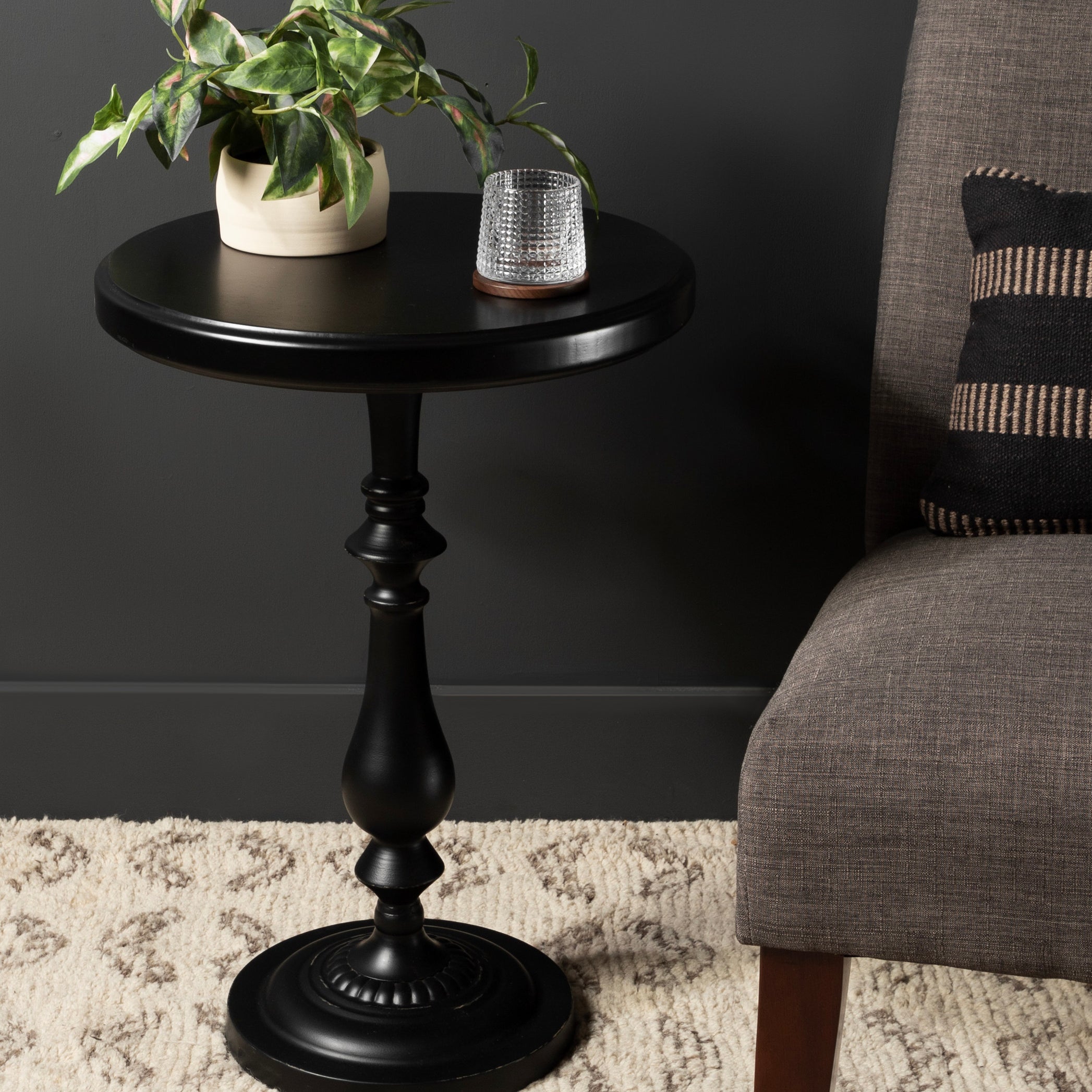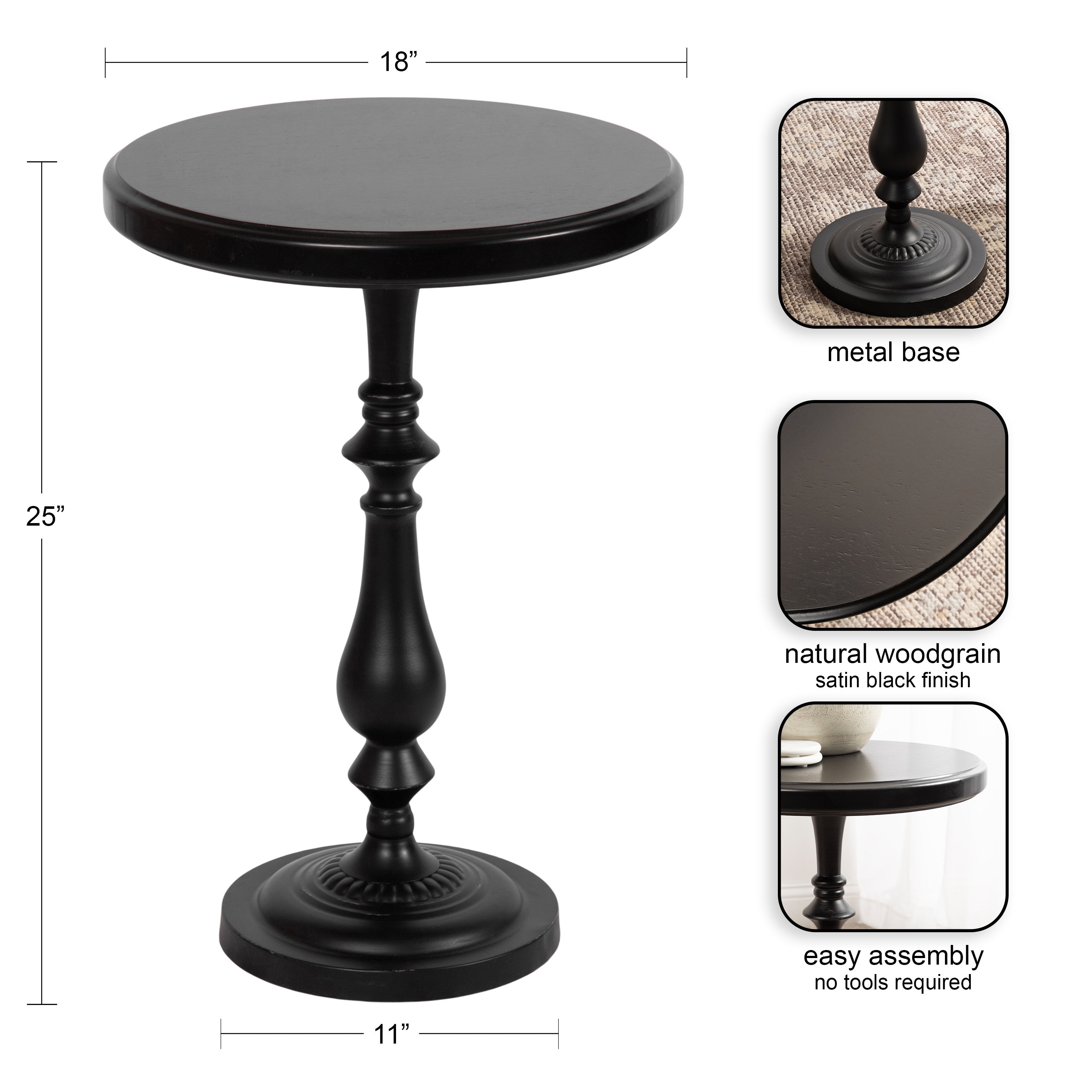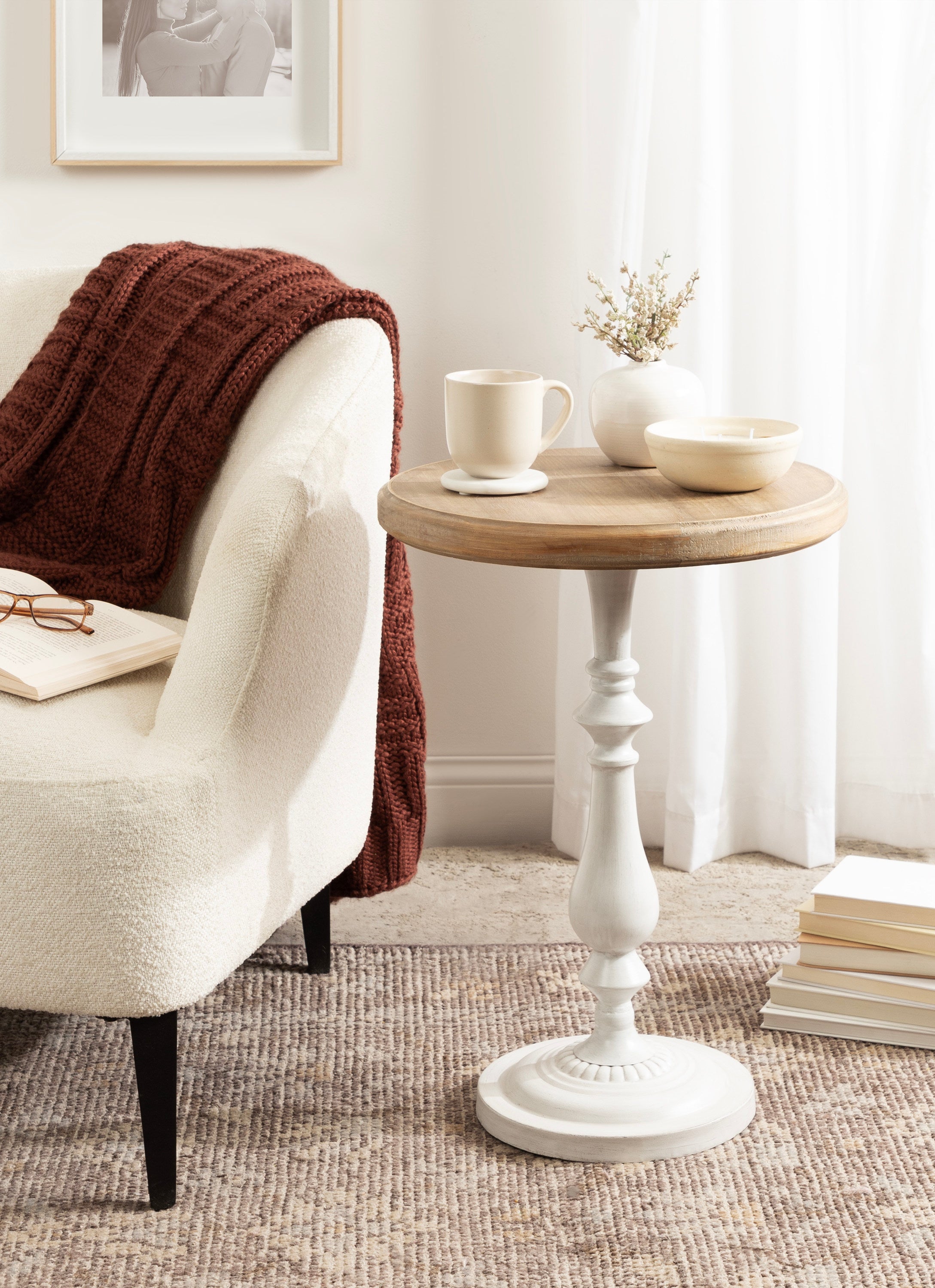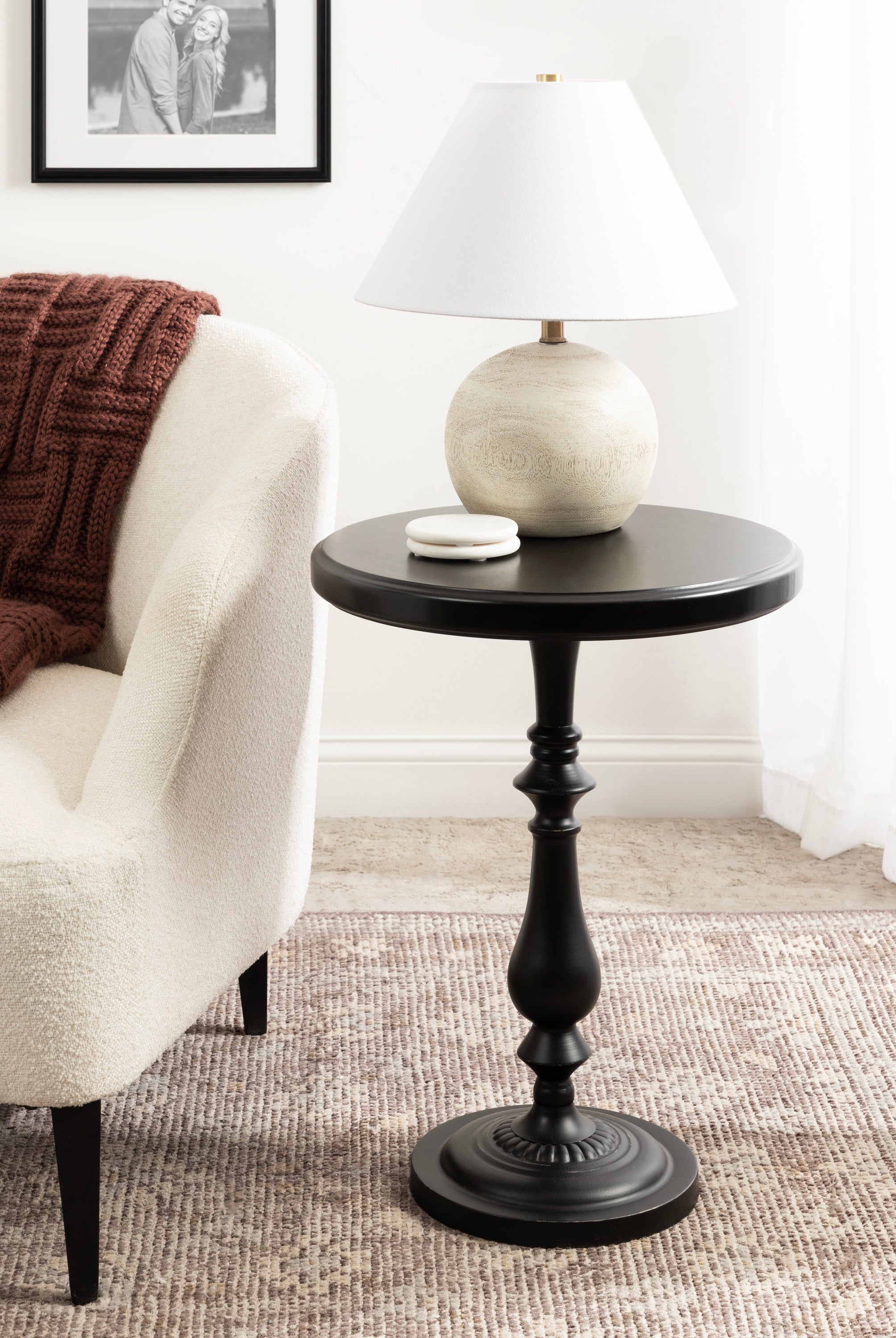 Embrace farmhouse charm with this lovely Wixley round side table. Between its sturdy iron base and its wooden tabletop, this side table boasts a charming mixed materials design. This round pedestal table offers farmhouse style with some traditional accenting between its turned base and beaded detail toward the bottom of the base.