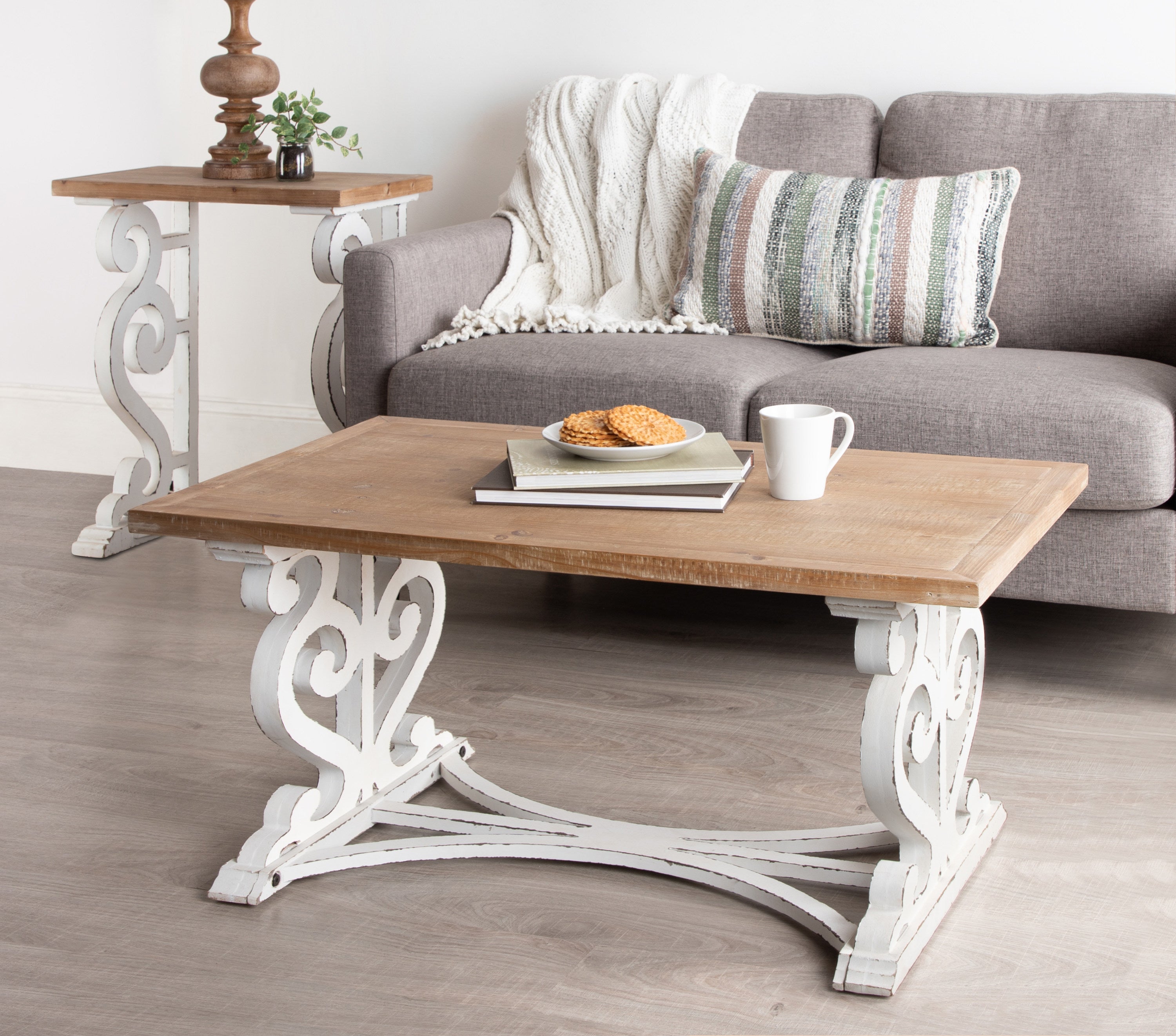 The Wyldwood Coffee Table adds a rustic French provincial accent to your home with real practical use. The hand-distressed, whitewashed finish gives this functional piece an aesthetic that's truly one-of-a-kind. Display your favorite photos, small decor, and novelties or serve drinks and charcuterie on its generous surface area.