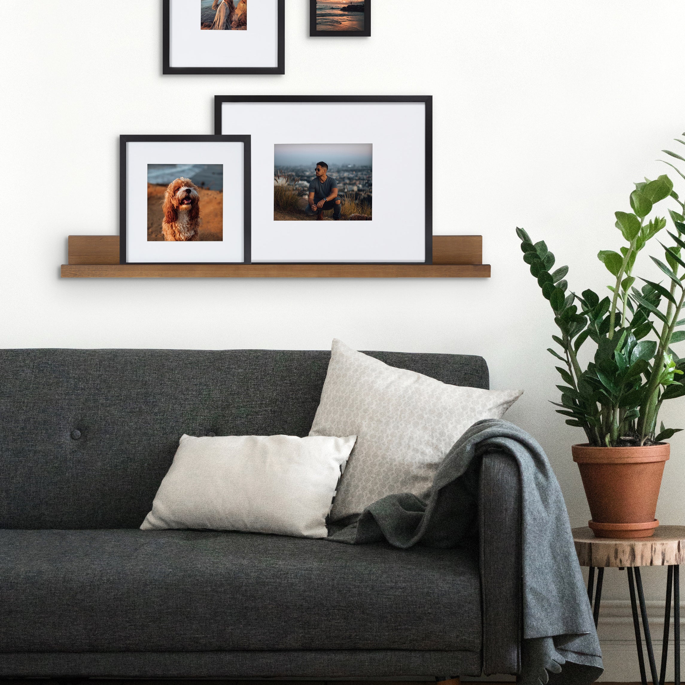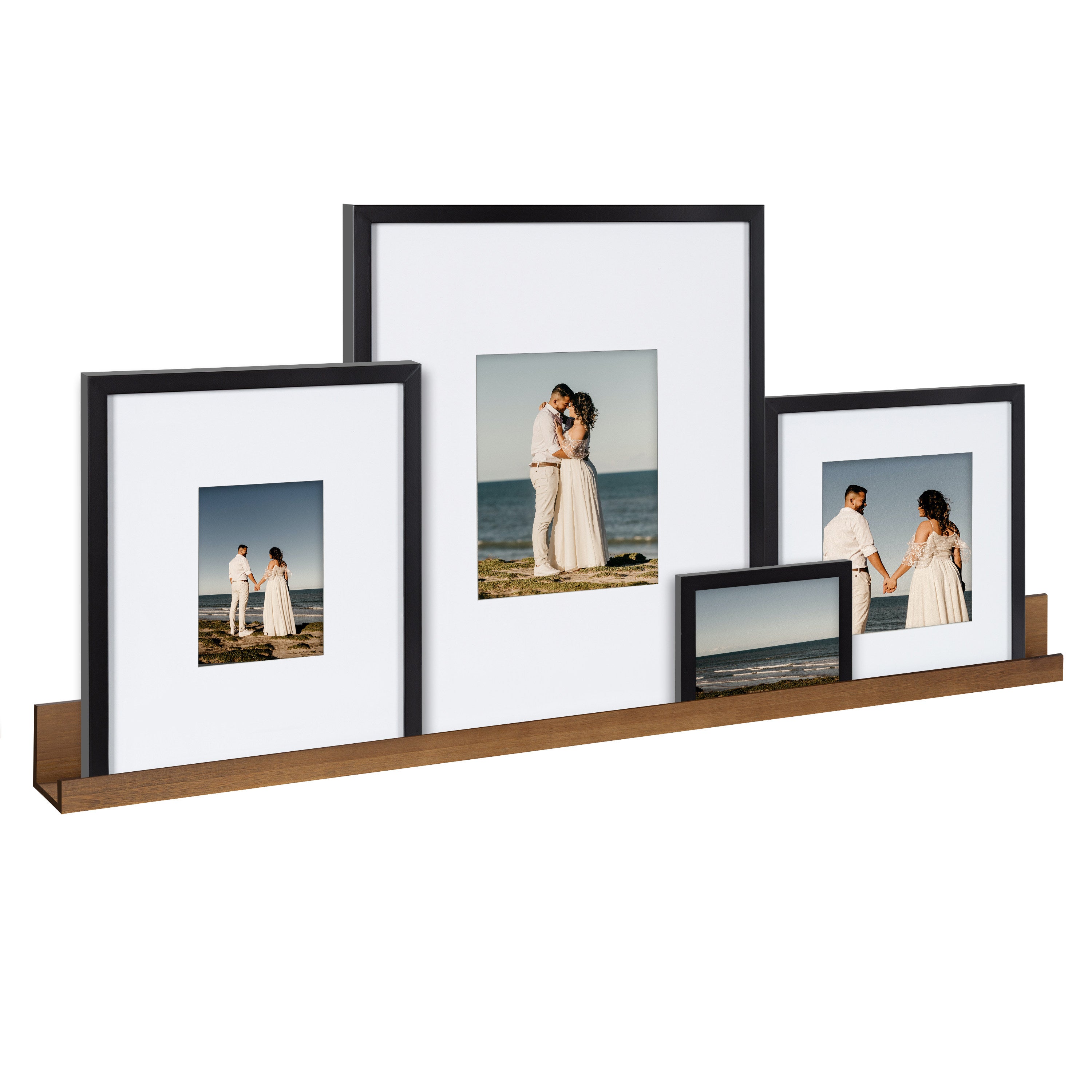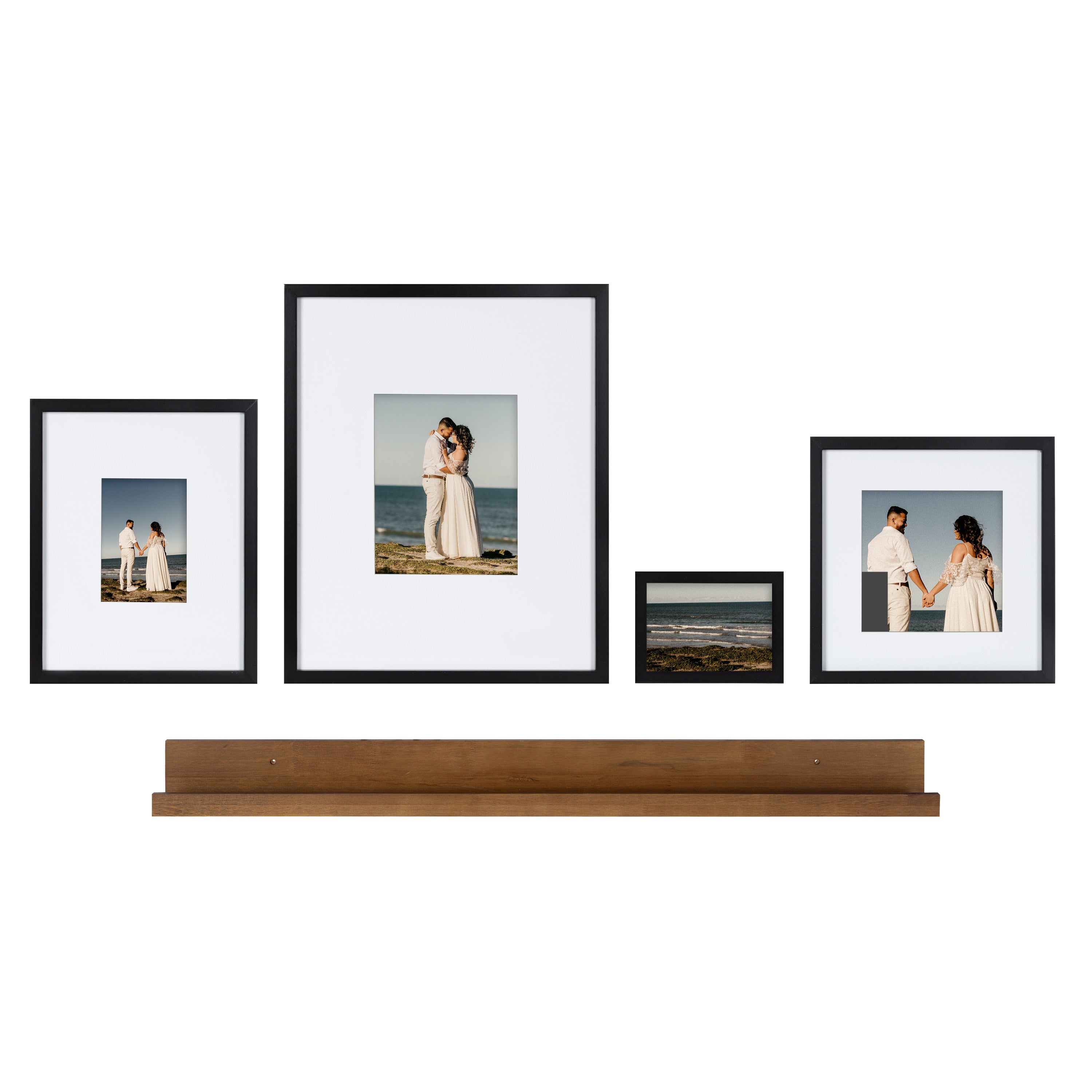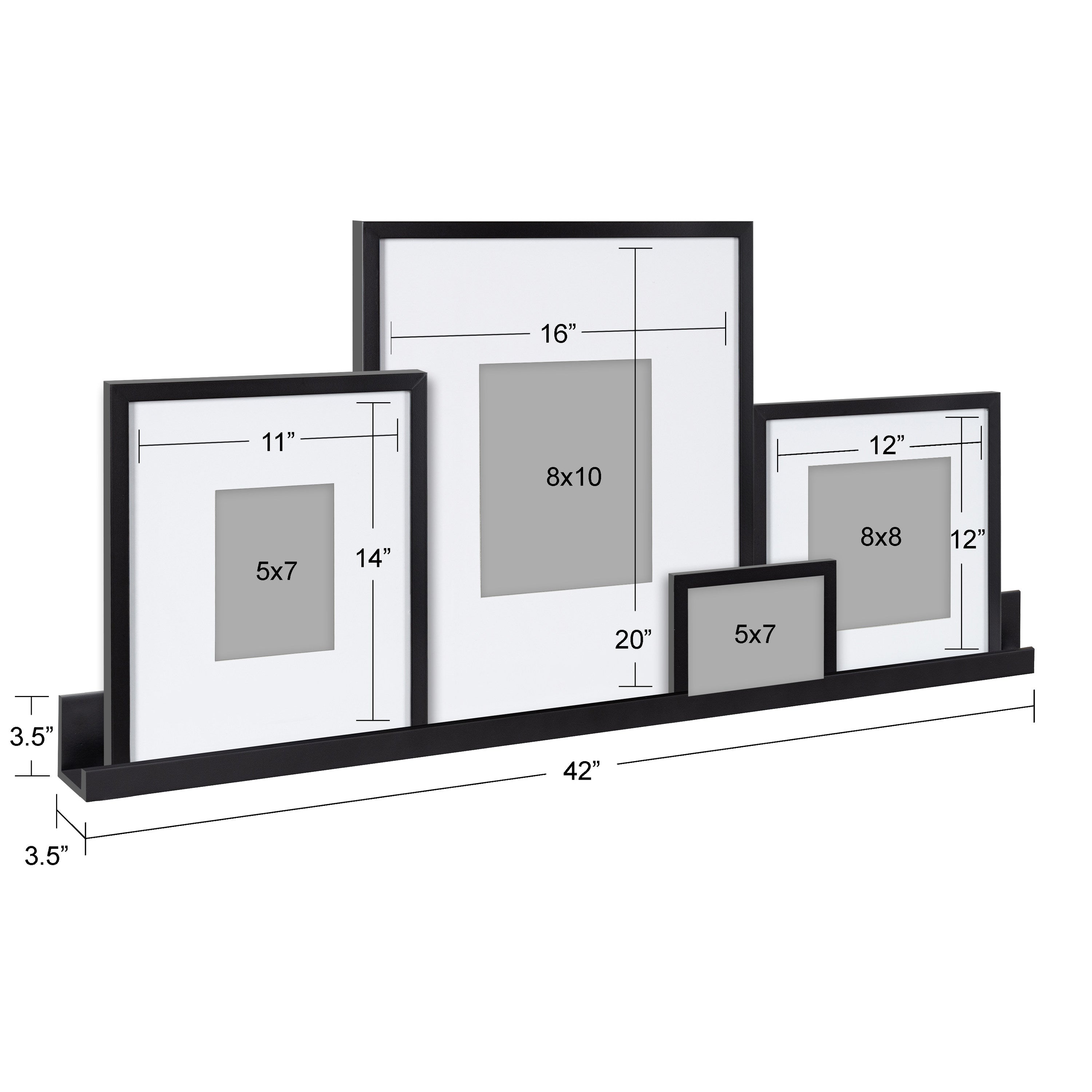 This sophisticated collection of wall frames is perfect for showcasing your prized and treasured memories. Inspired by farmhouse aesthetics and streamlined simplicity, the Gallery wall frames utilize a slim profile and a modern finish, capable of blending into a variety of decor aesthetics. The display sizes in this set are as followed: 16x20 matted to 8x10, 11x14 matted to 5x7, 12x12 matted to 8x8, and 5x7. This set also features a narrow shelf that is 42 inches wide, making it a great display surface for this collection. The Gallery set is easy to hang with sawtooth hangers, creating the photo arrangement that completes your decorative aesthetic.