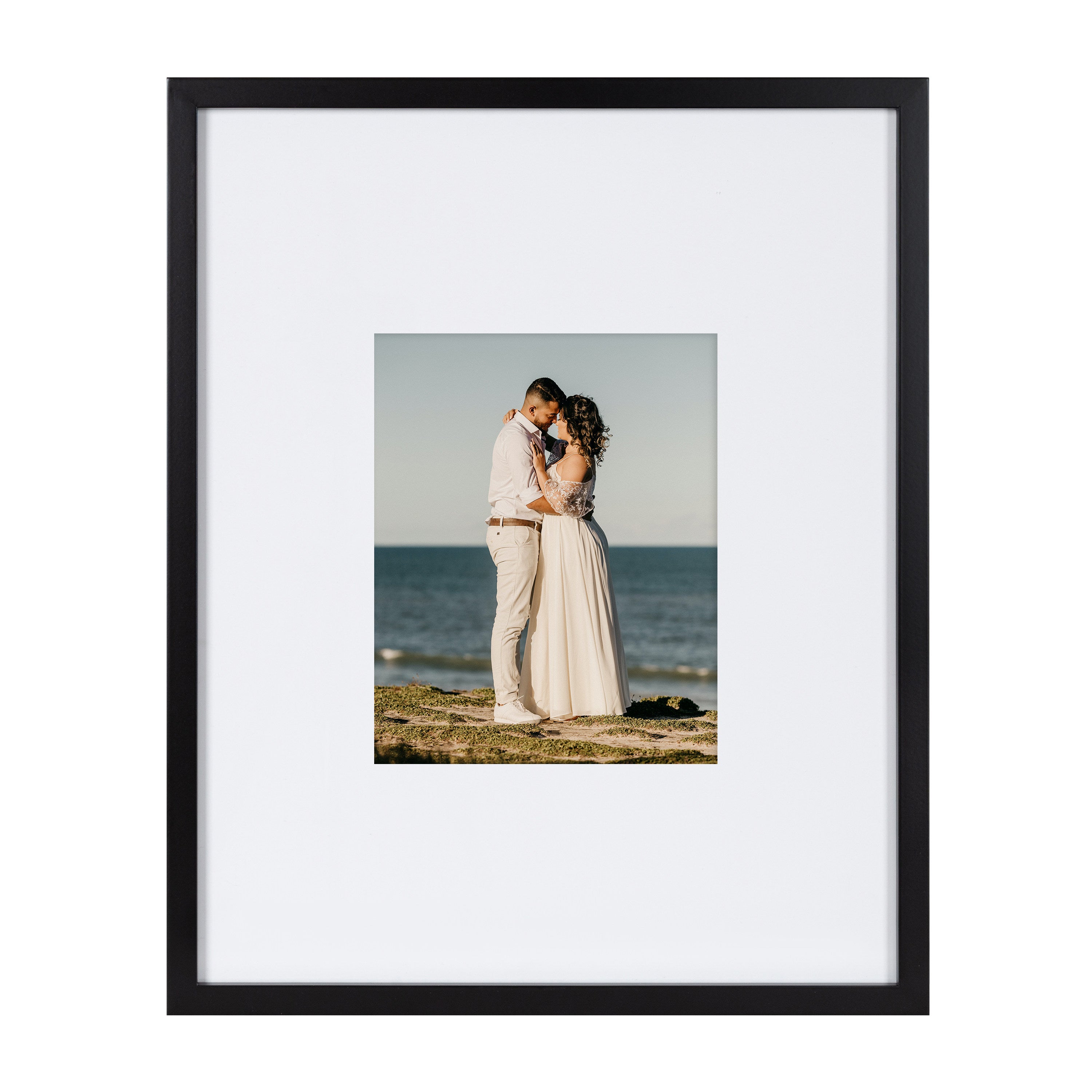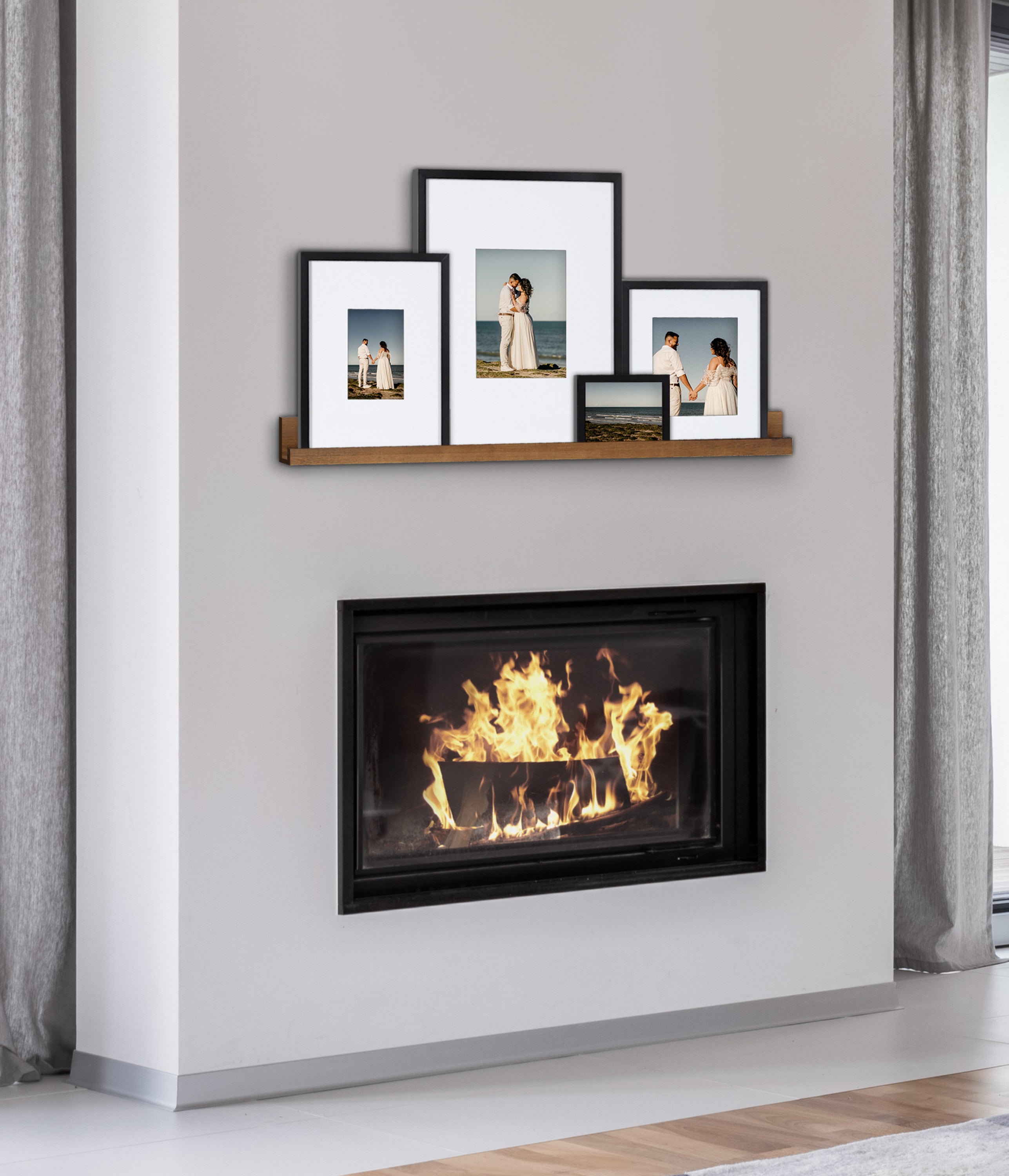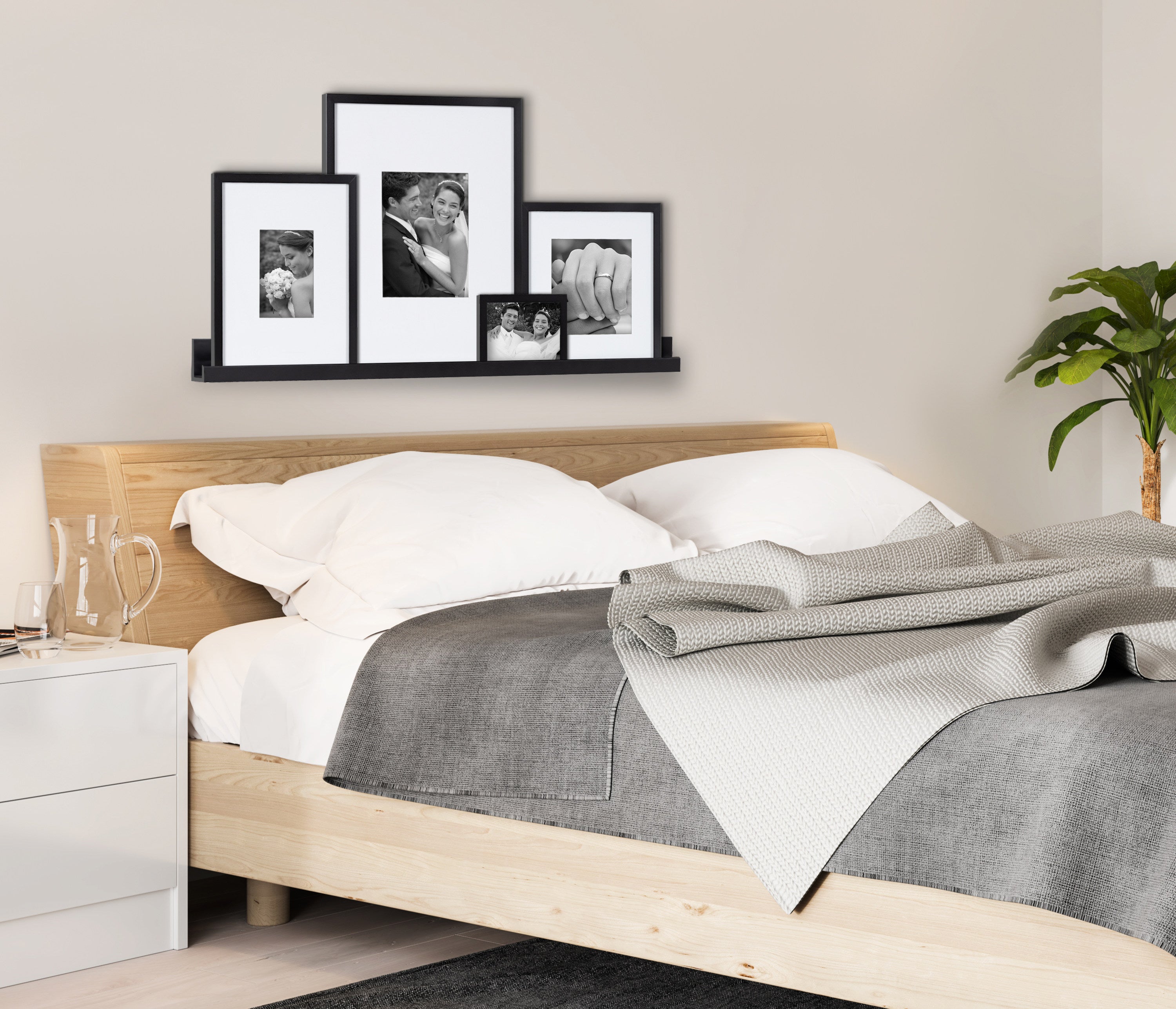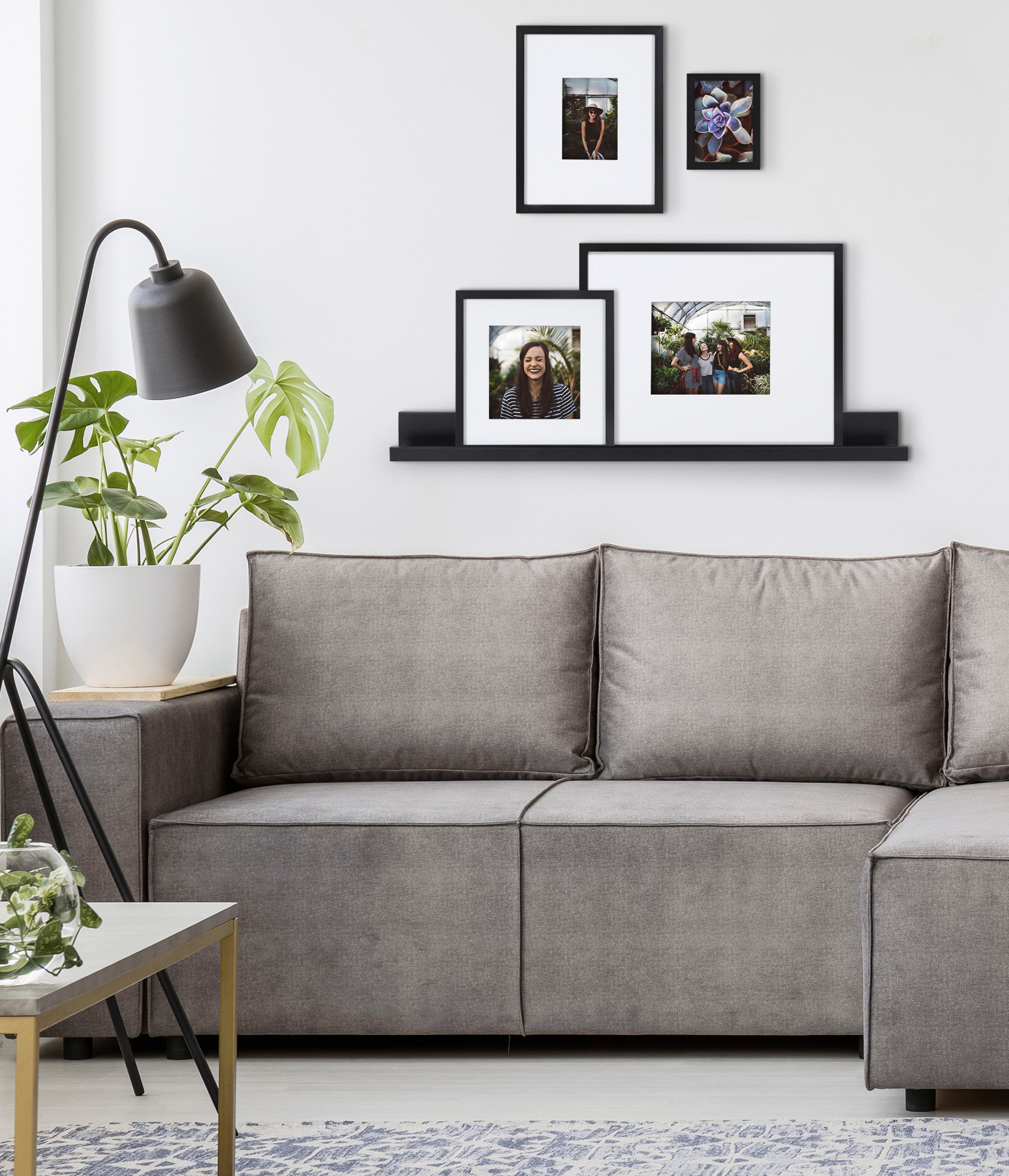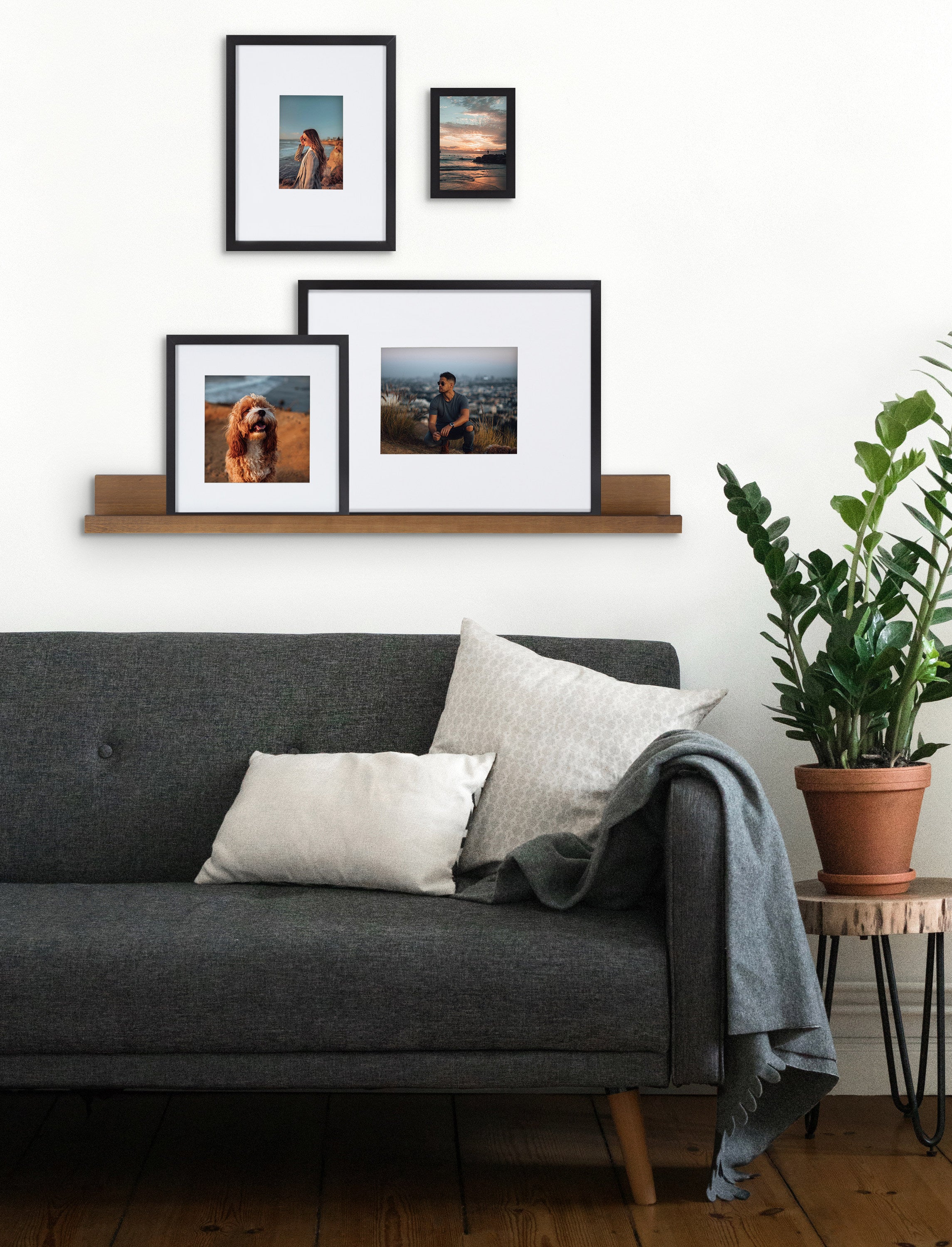 This sophisticated collection of wall frames is perfect for showcasing your prized and treasured memories. Inspired by farmhouse aesthetics and streamlined simplicity, the Gallery wall frames utilize a slim profile and a modern finish, capable of blending into a variety of decor aesthetics. The display sizes in this set are as followed: 16x20 matted to 8x10, 11x14 matted to 5x7, 12x12 matted to 8x8, and 5x7. This set also features a narrow shelf that is 42 inches wide, making it a great display surface for this collection. The Gallery set is easy to hang with sawtooth hangers, creating the photo arrangement that completes your decorative aesthetic.