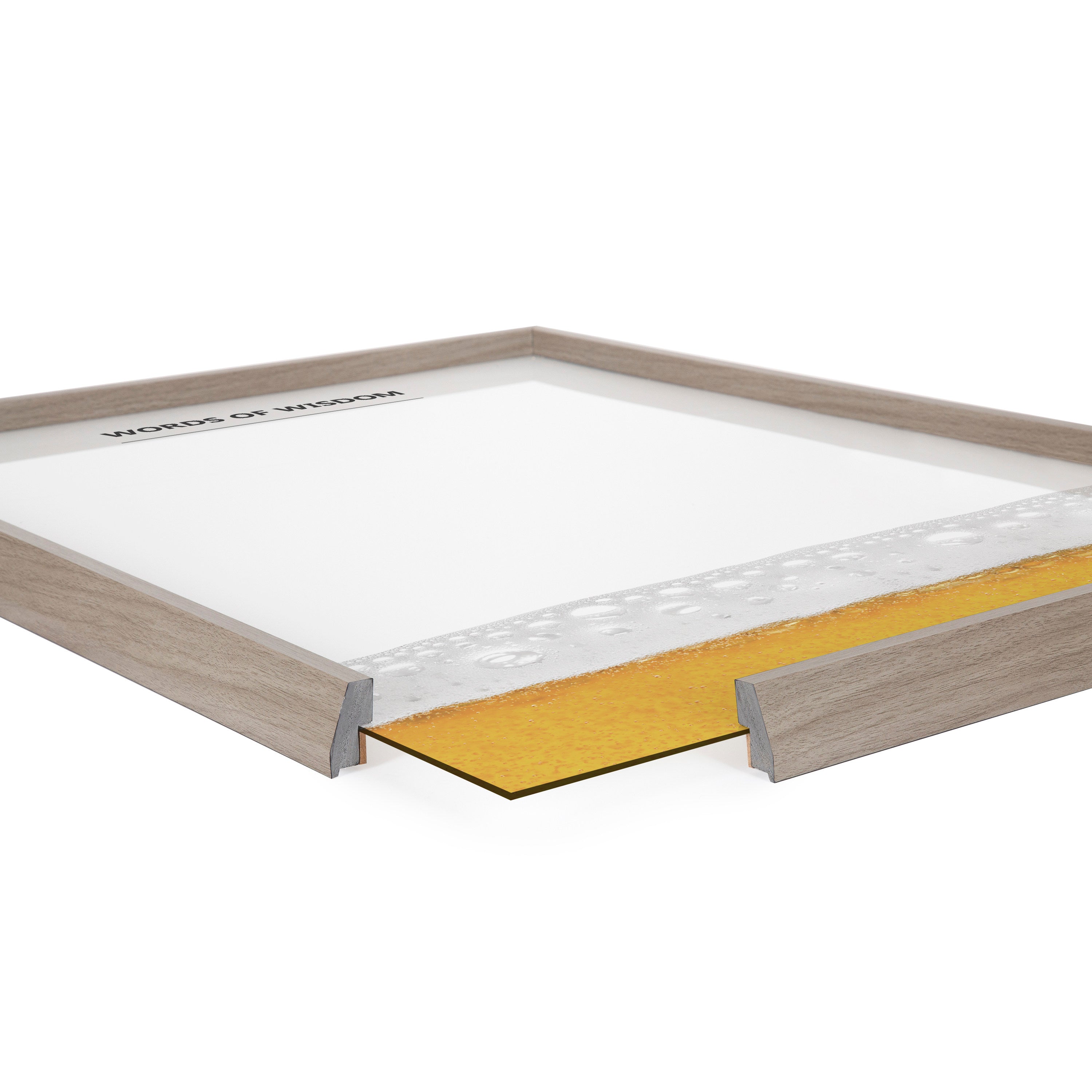 Come up with creative sayings and write down your favorite quotes on this dry-erase glass art that's perfect for your bar or entertaining area! . Printed and framed in the USA in Waunakee, Wisconsin, this framed floating glass art will be a pleasure to look at every day in your living room, bedroom, nursery, or any room in the home. It even doubles as a beautiful dry erase board! Traditional dry erase boards stain over time and become worn within a few uses, while you can use a glass dry-erase board over and over without wearing out. Just wipe clean with an eraser or damp cloth. This art print also makes an excellent gift for a birthday, holiday, or house-warming.