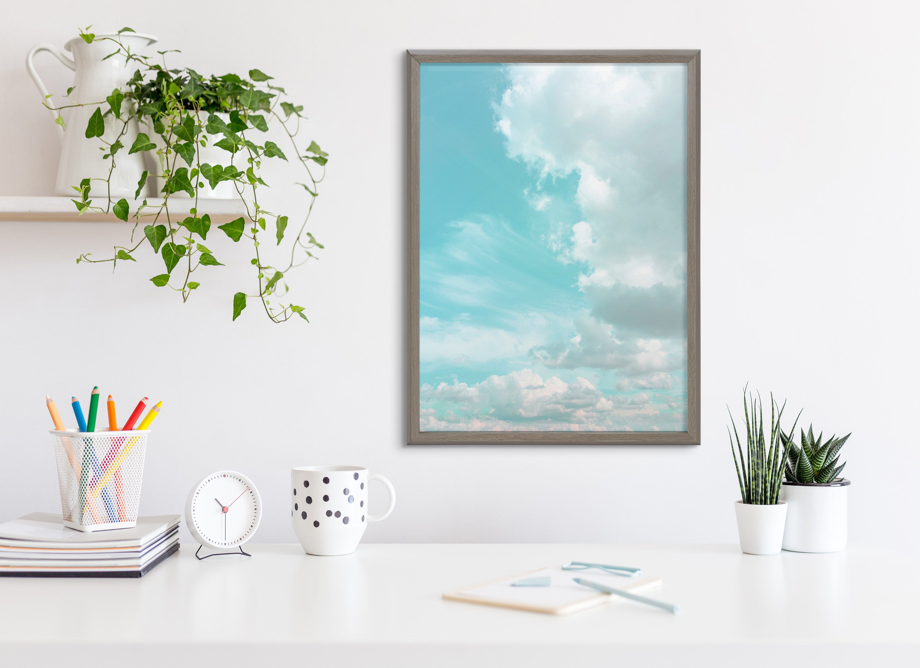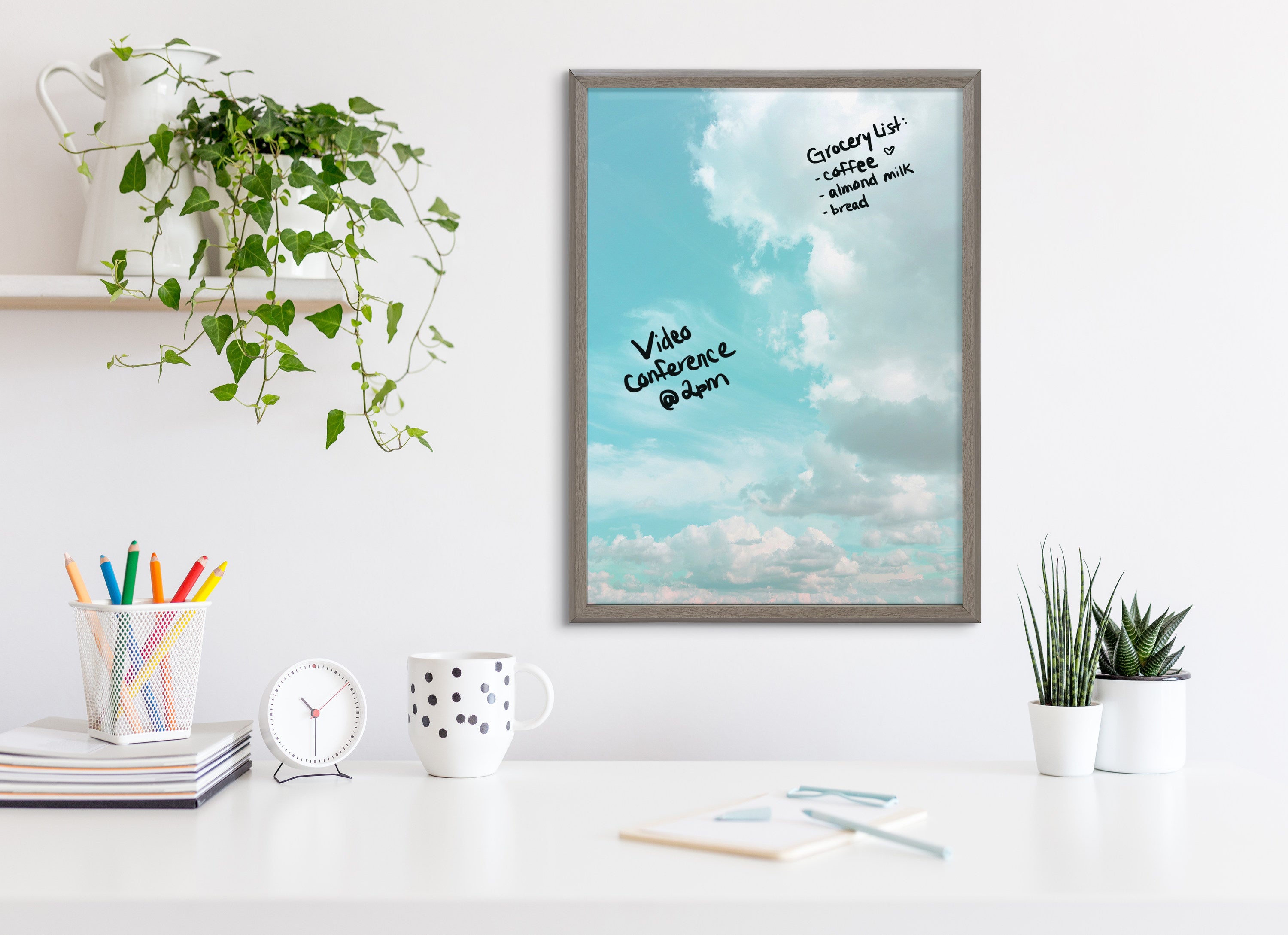 This beautiful cloud print is the perfect complement to a productive office. Printed and framed in the USA in Waunakee, Wisconsin, this framed floating glass art will be a pleasure to look at every day in your living room, bedroom, nursery, or any room in the home. It even doubles as a beautiful dry erase board! Traditional dry erase boards stain over time and become worn within a few uses, while you can use a glass dry-erase board over and over without wearing out. Just wipe clean with an eraser or damp cloth.