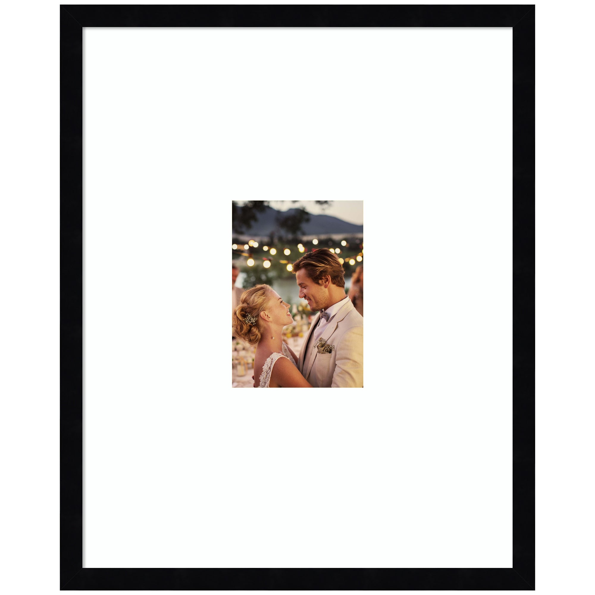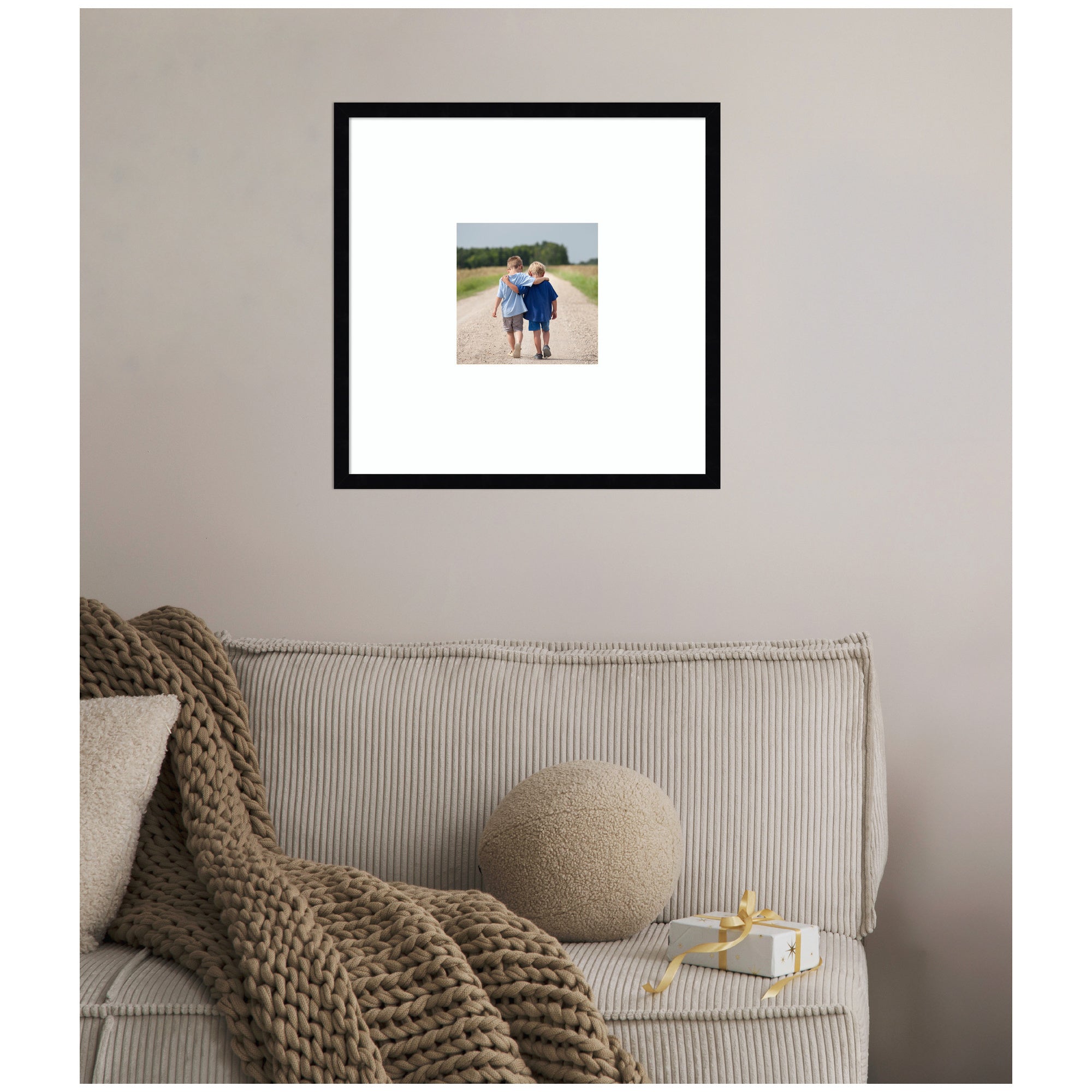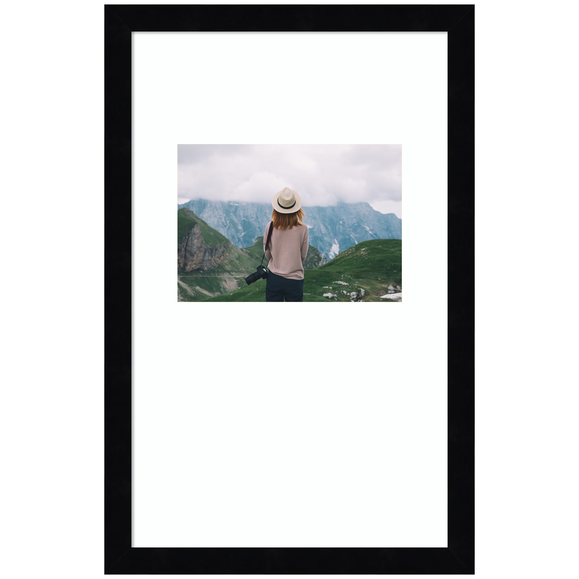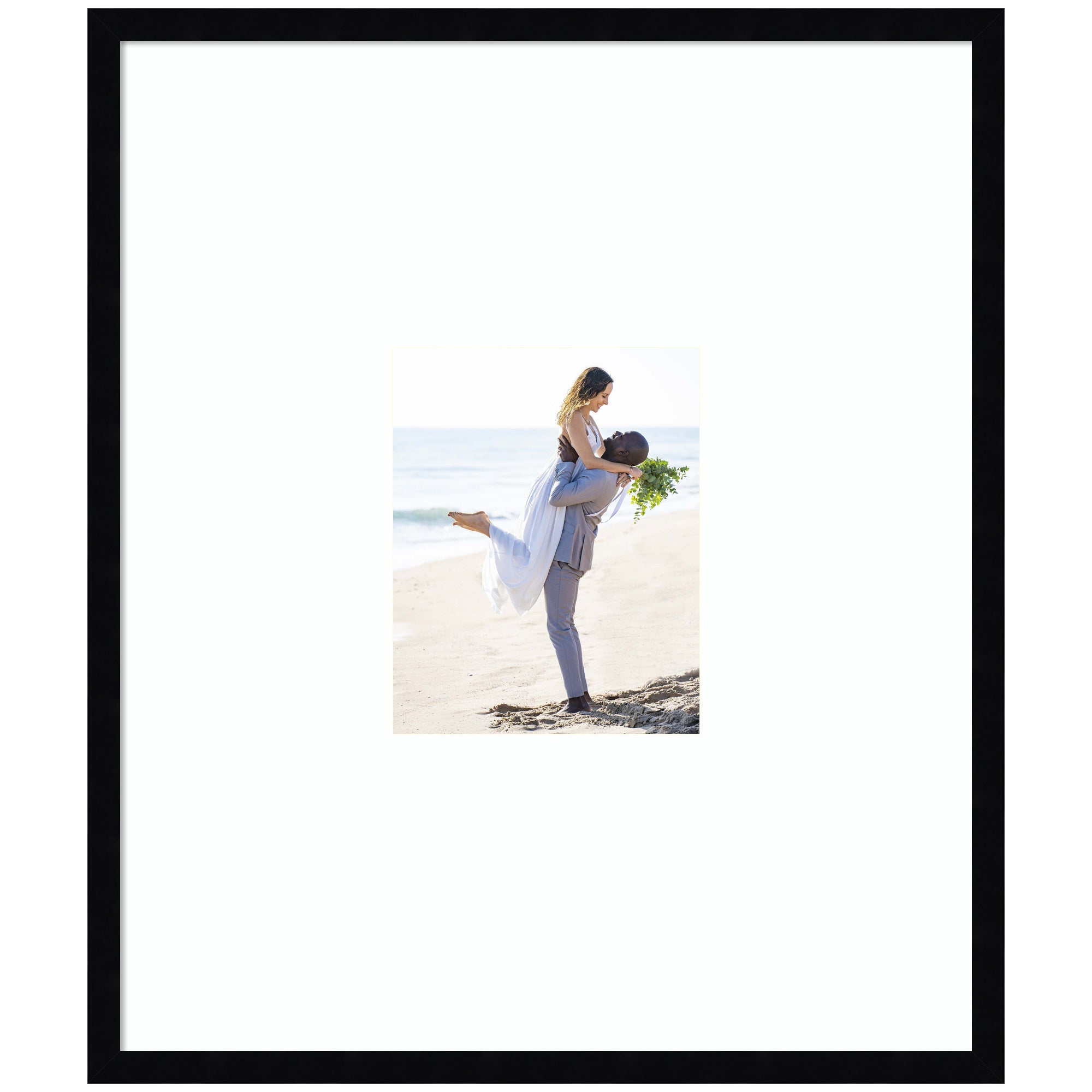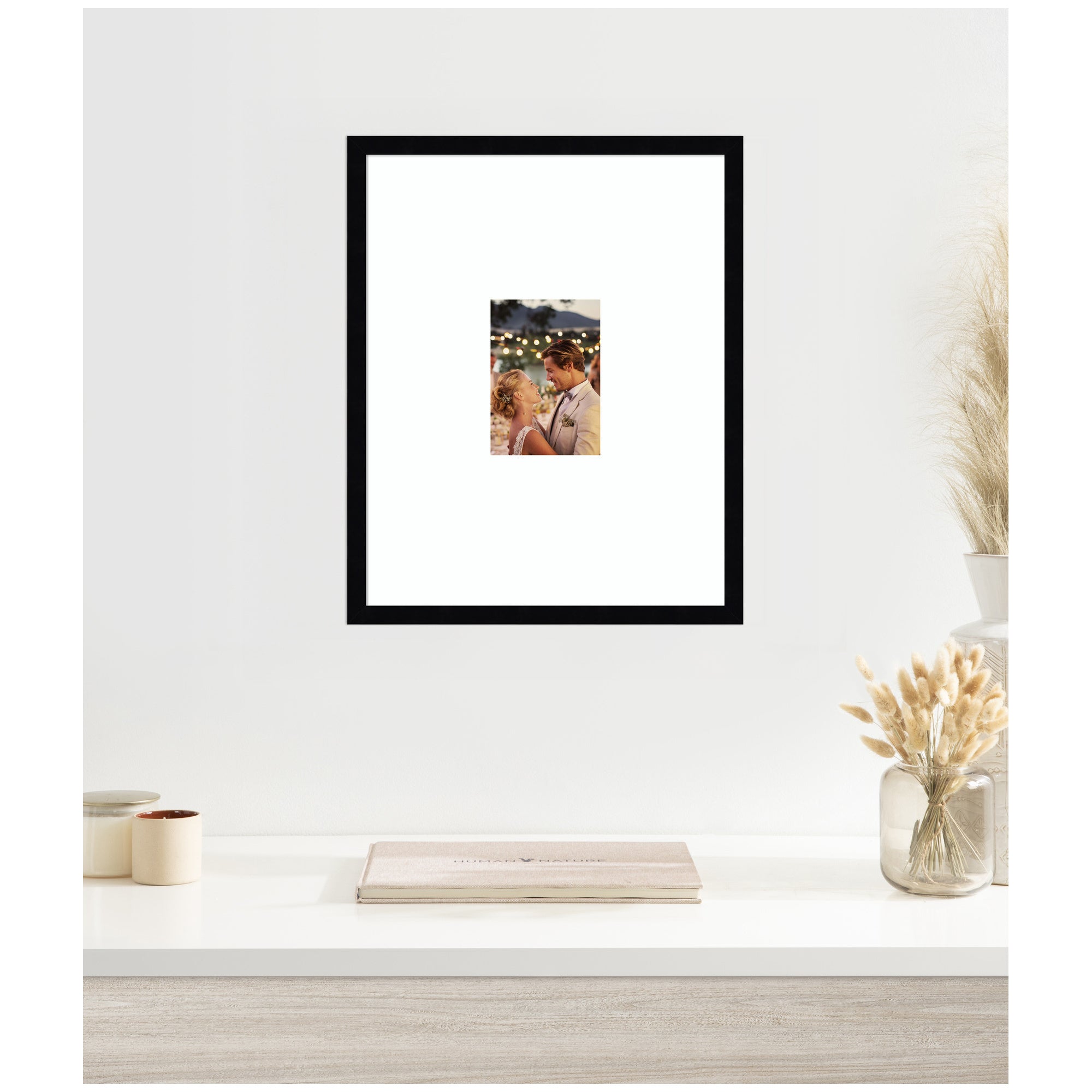 Make a statement with your photos using this stunning picture frame. Thoughtfully designed and beautifully framed by hand in Madison, WI, this photo frame is crafted to elevate any space. Featuring a specialty mat, it creates a striking presentation for your favorite photo, artwork, or award. Your image is protected with gallery-quality acrylic that provides crystal clear visibility and fade resistance. Stronger and safer than glass, it helps shield your photo from UV rays and light damage, ensuring it remains beautifully displayed for years to come. Set in the Svelte Noir Black designer moulding, this modern contemporary accent is made to stand out, whether styled in a living room, bedroom, office, or hallway. It also makes a meaningful gift for housewarmings, birthdays, or any special occasion.