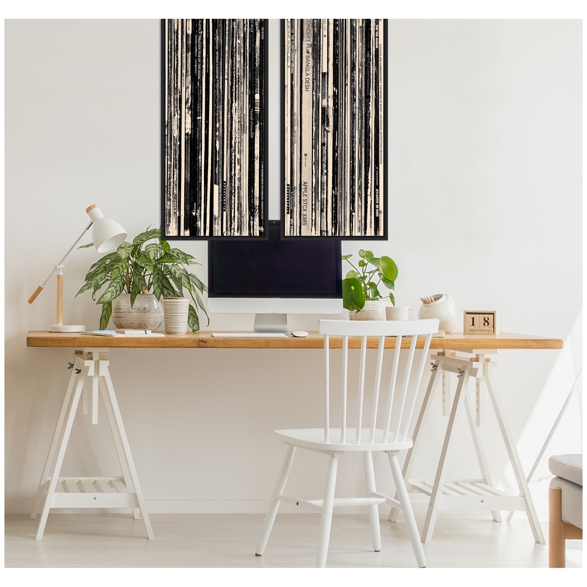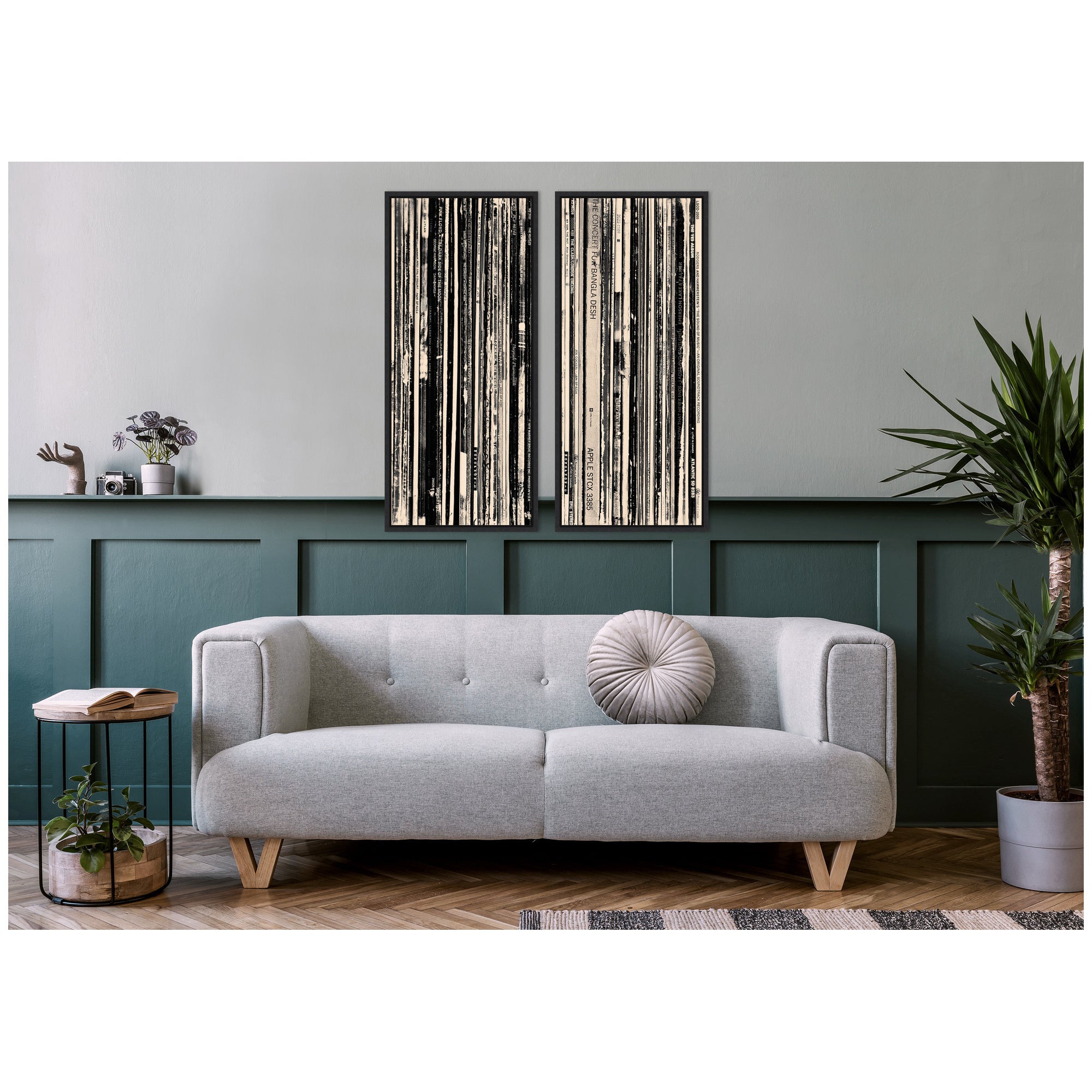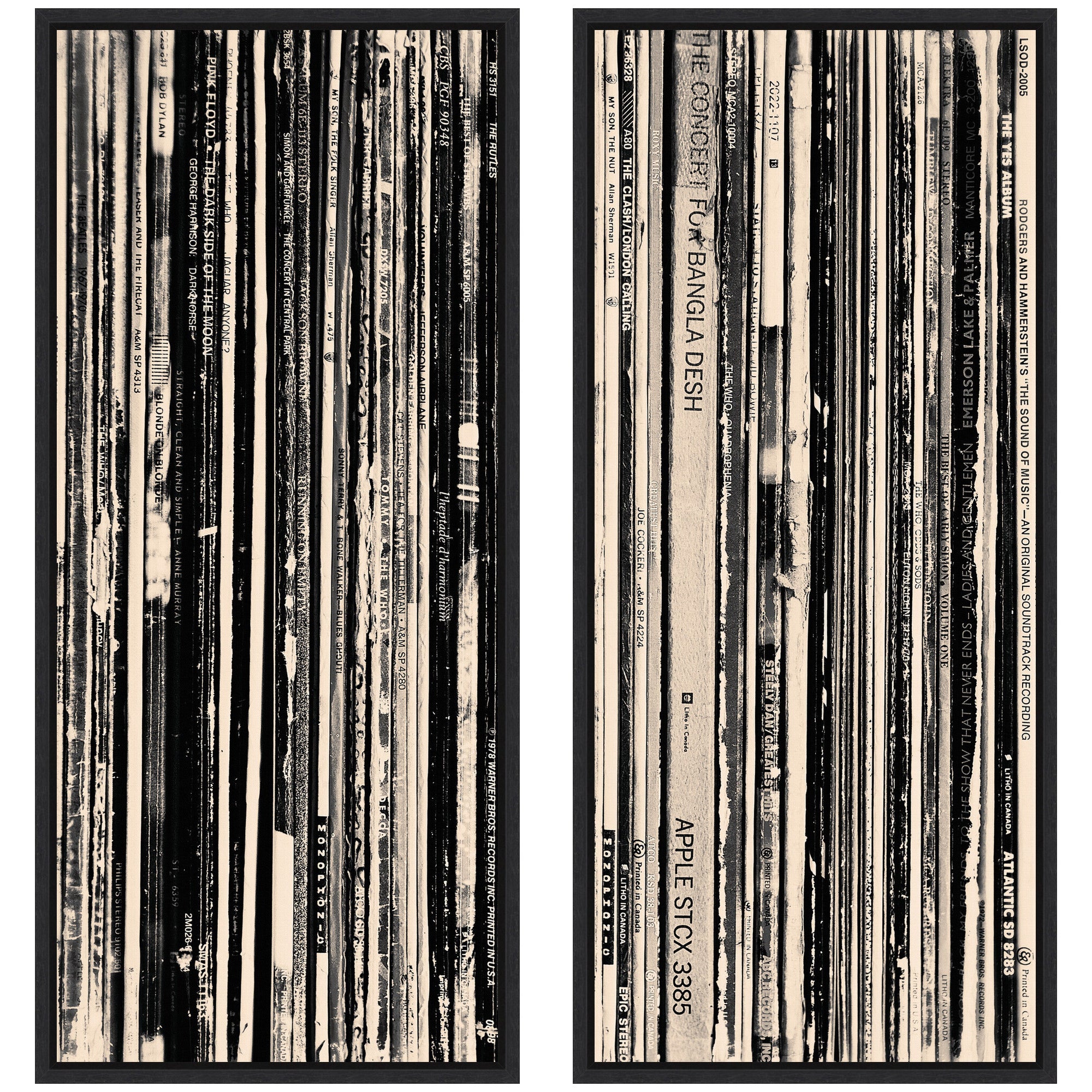 - 33 RPM Black and White Panel No. 1 & 2 2 Piece framed canvas set is giclee printed using fade-resistant inks, ensuring every detail comes to life in rich, lasting color