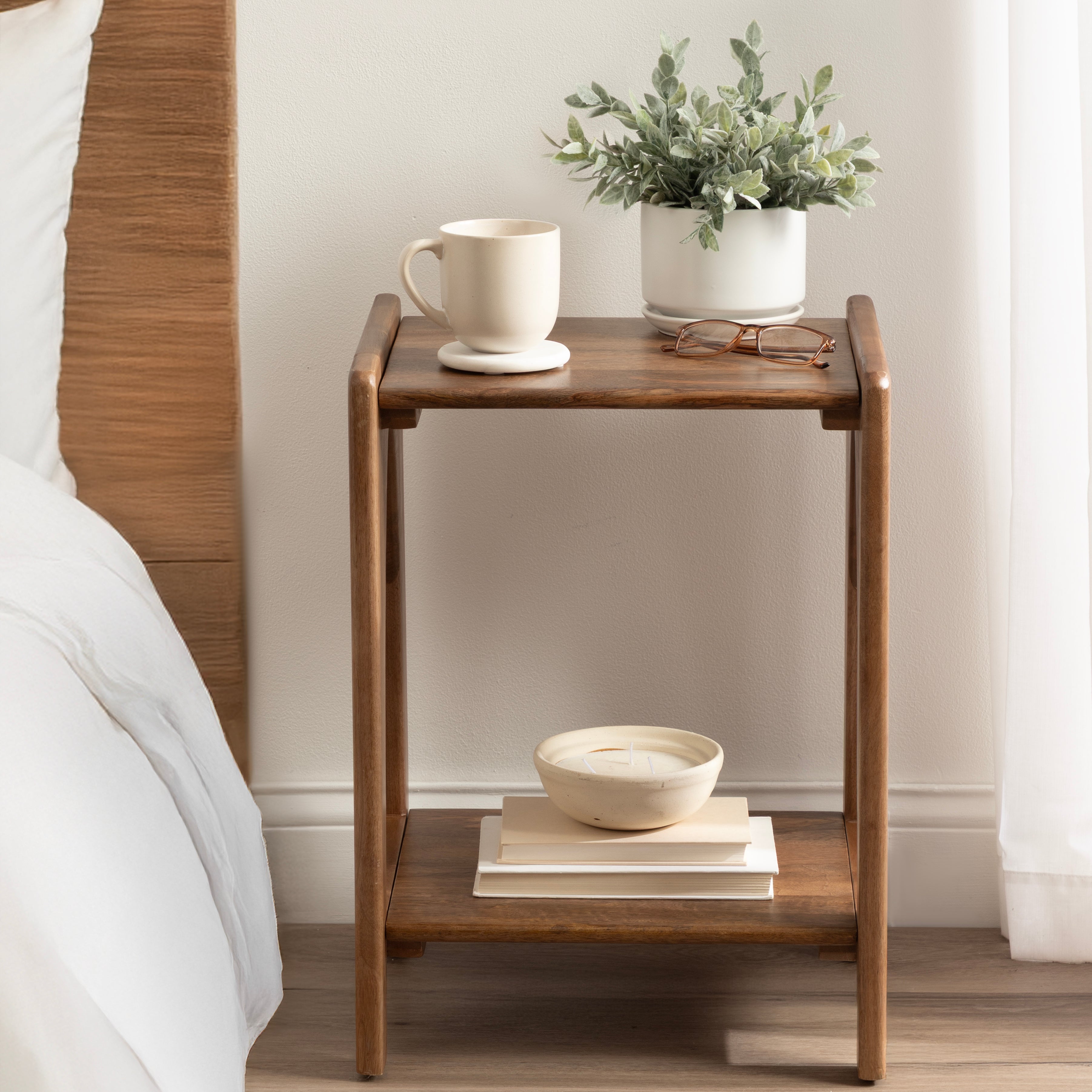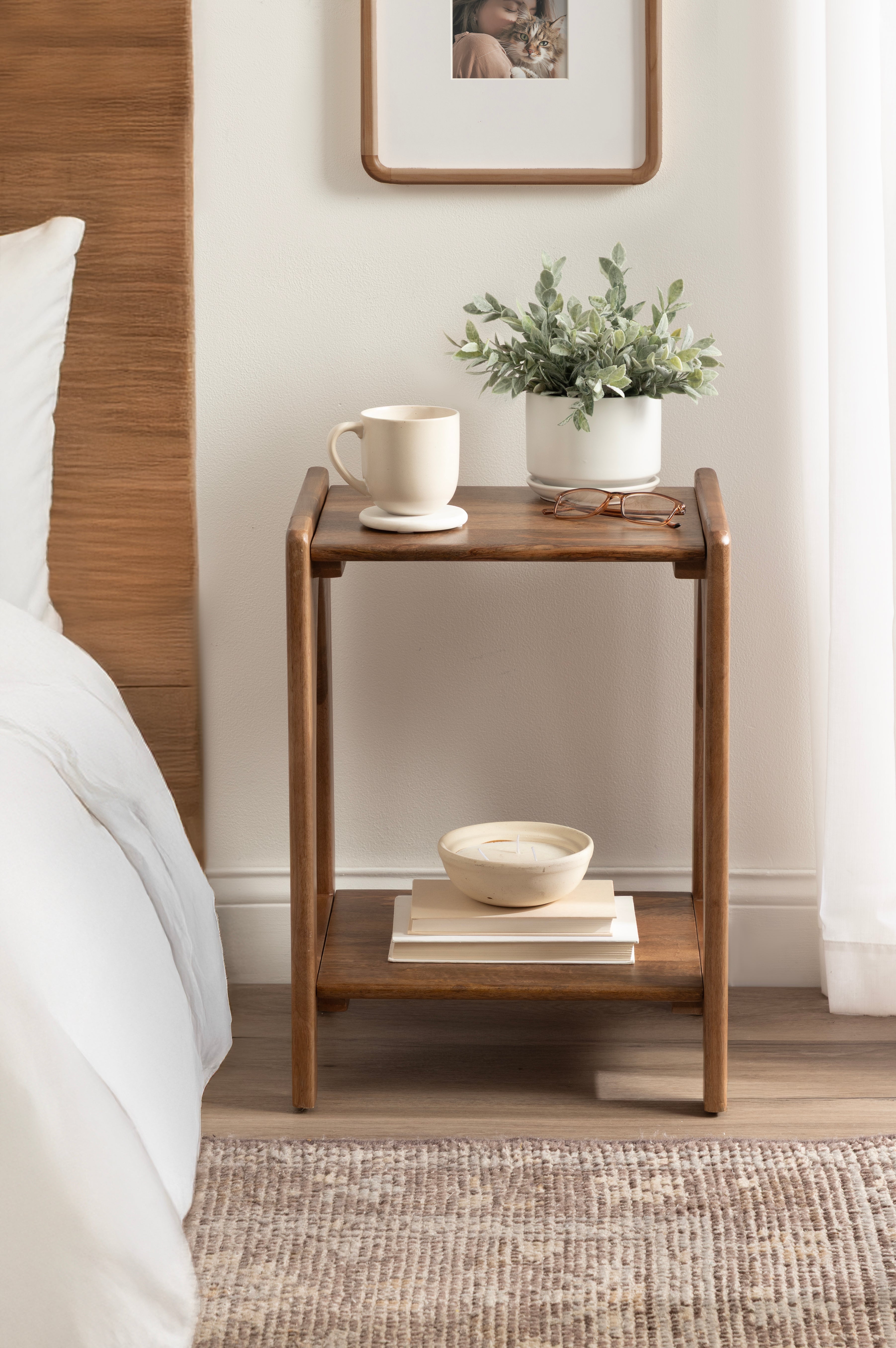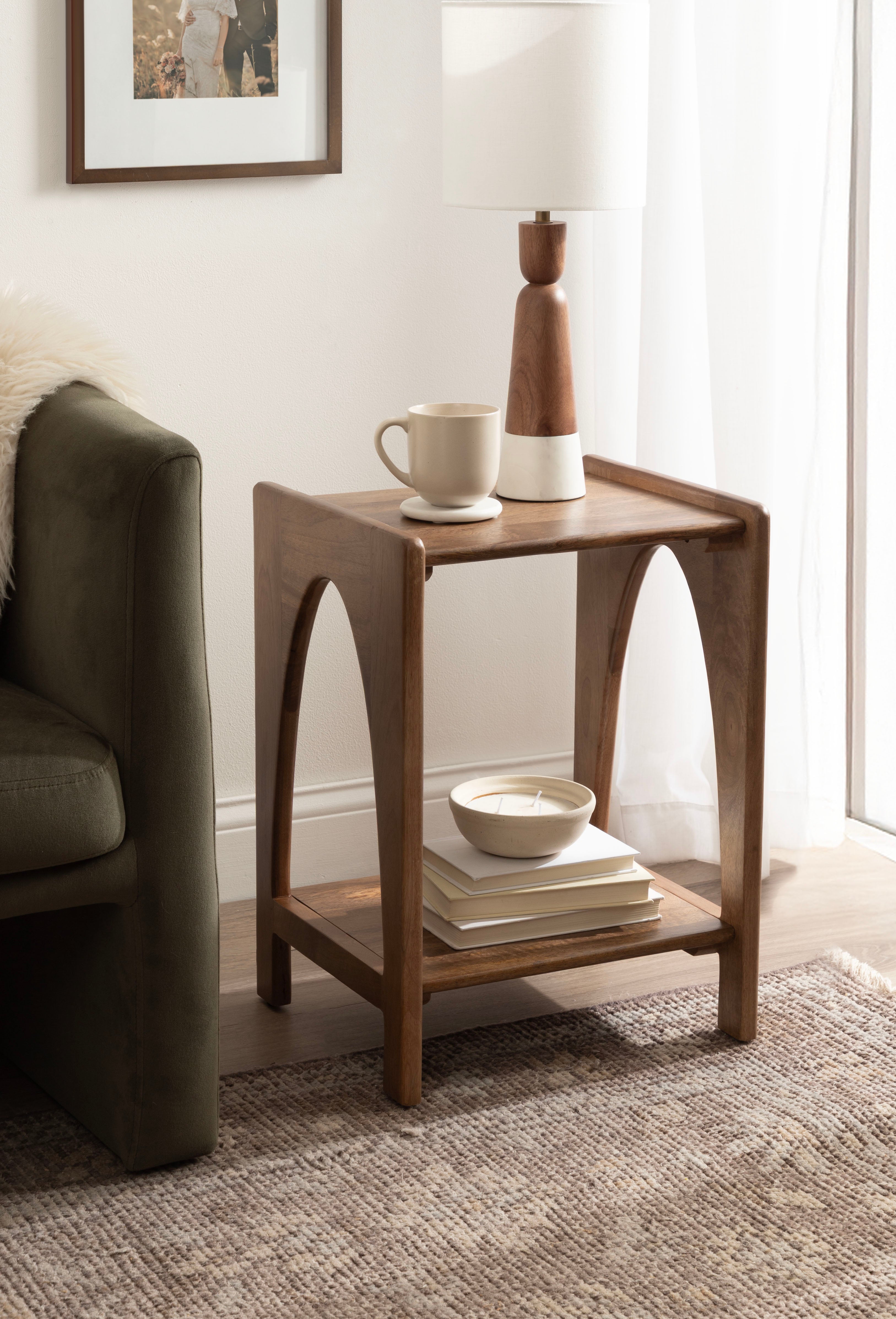 Blend your love of modern style with a dash of transitional functionality with the Aarstad side table. This rectangular table embraces a classic, uncomplicated design with its unique table shape and soft bullnosed edges. Skilled artisans craft the Aarstad by hand, and due to this careful, delicate crafting, each piece is one-of-a-kind in finish and woodgrain. It is made of 100% solid mango wood for a table that looks and feels rich and high-quality. It not only looks good; however, it also features two tiers of mango wood that can serve various purposes throughout your home. It is a perfect pairing next to a sofa, by your bed, or flanking your entryway. Assembly for this minimal table takes a matter of minutes with a simple 3-step process will have your new end table ready in no time.