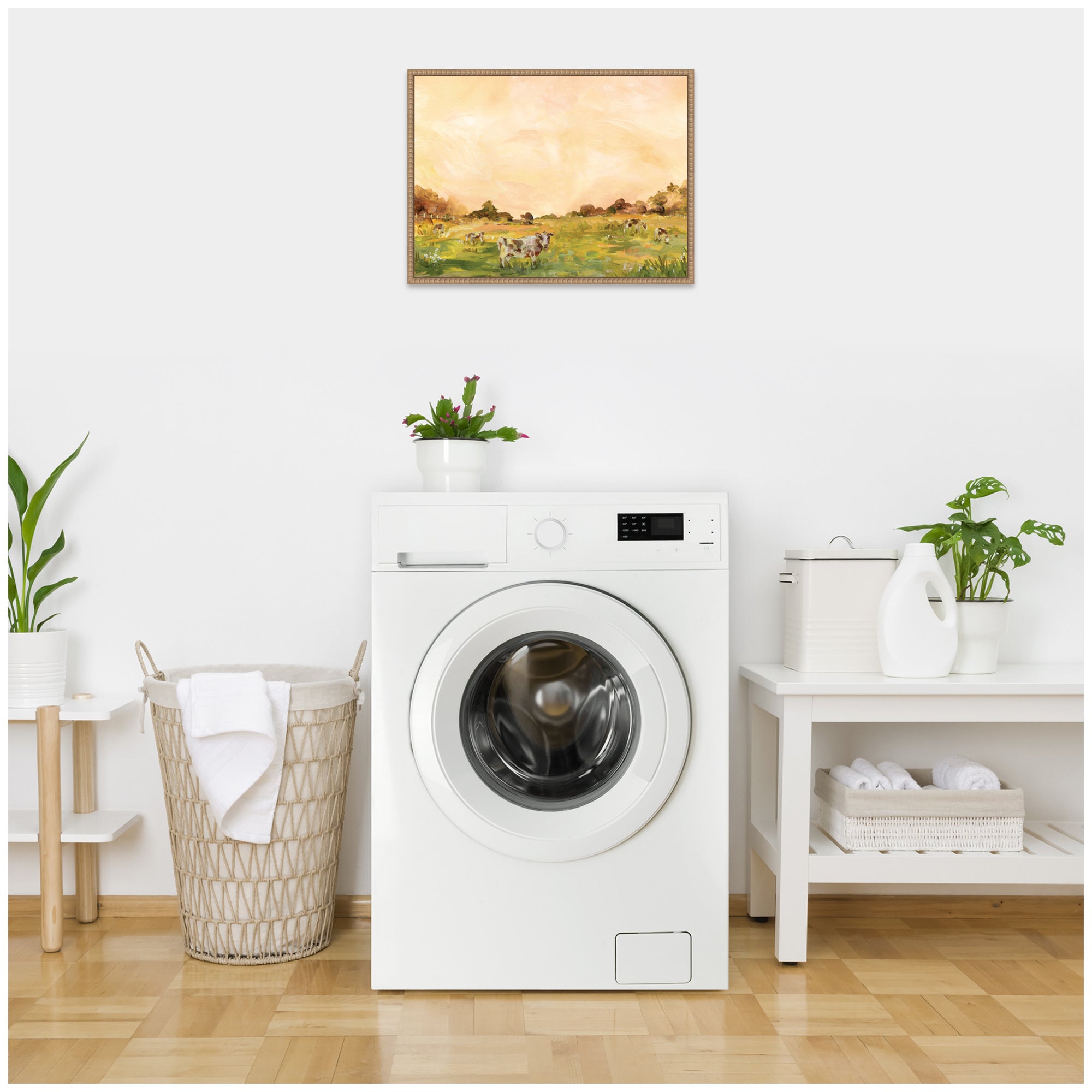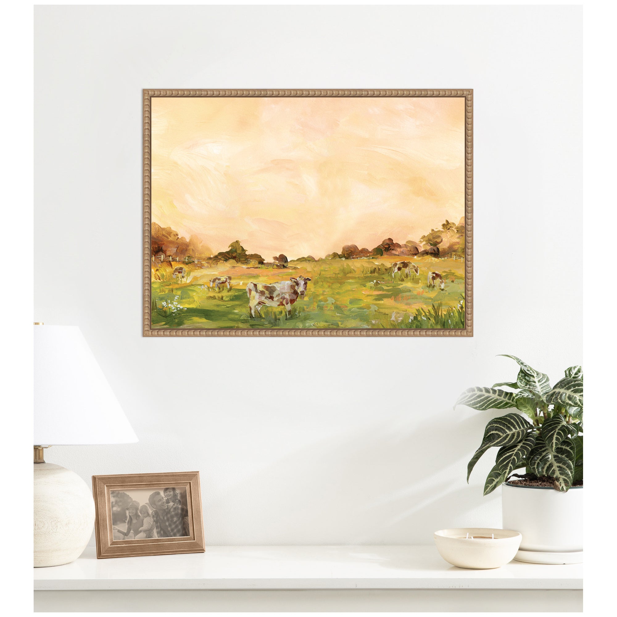 - Gallery Quality Art: Measuring 24 x 18 inches, this is beautifully presented in Sylvie Beaded Rustic Natural frame - a float frame featuring a beaded ornate design with natural woodgrain coloring and dramatic depth.. Expressive Wall Art Story:The artwork depicts a tranquil pastoral scene with cows grazing in a sunlit field. The landscape is bathed in warm hues of a sunset, adding a serene and idyllic atmosphere. The soft brushstrokes convey a sense of peace and natural beauty.