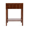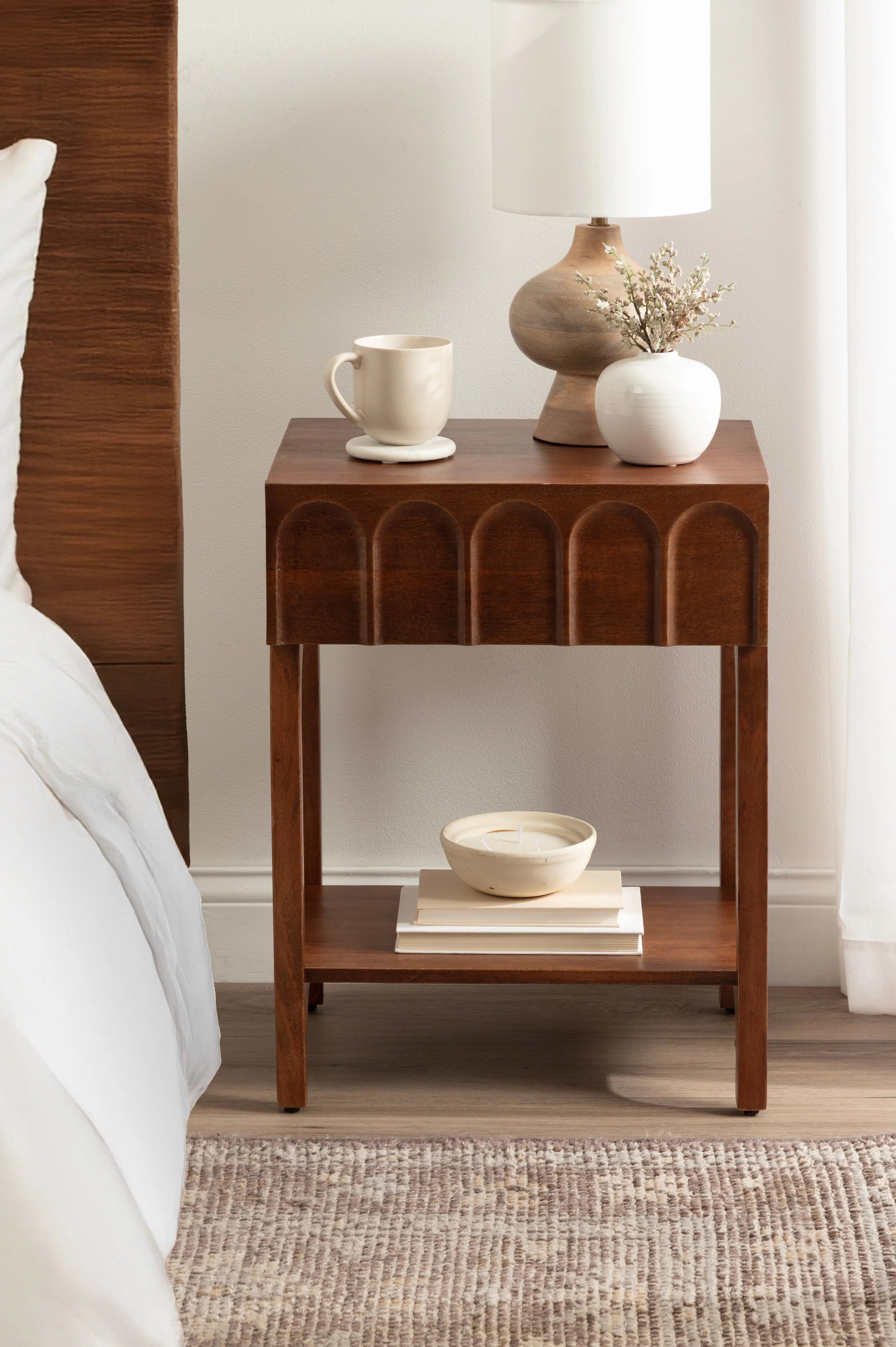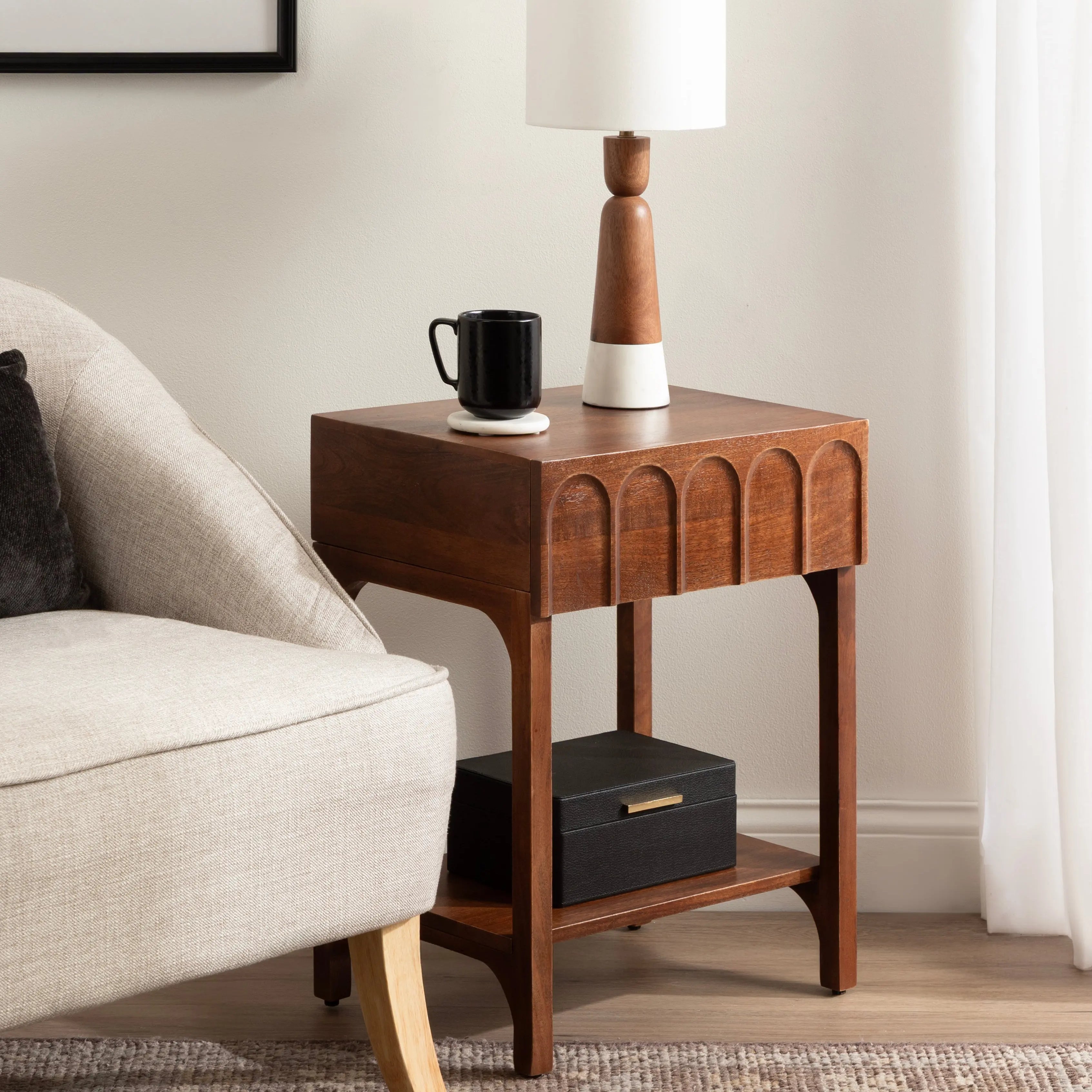 Introducing the Kate and Laurel Archvale wooden side table, a versatile and stylish piece that combines functionality and modern design. This beautifully crafted nightstand features a stunning finish, a functional drawer, and an underlying wooden shelf, offering ample storage space for your bedside essentials. Along the drawer face of this end table is carved arch detailing to provide your space with interesting dimensionality. Constructed with high-quality materials, this side table is built to last. Crafted from solid mango wood in India, each woodgrain and table is truly one-of-a-kind. The wooden shelf below adds extra storage space and is perfect for storing magazines, books, or other items you want to keep within reach. The Archvale side table is not only practical, but also a great accent piece for any room in your home. Use it in your living room, bedroom, or home office for a functional and stylish addition to your space.
