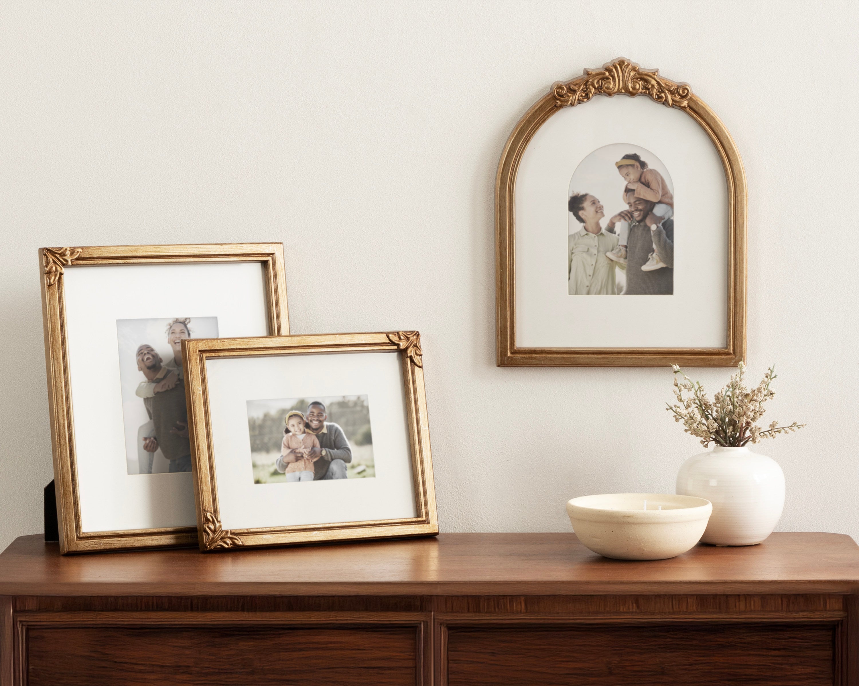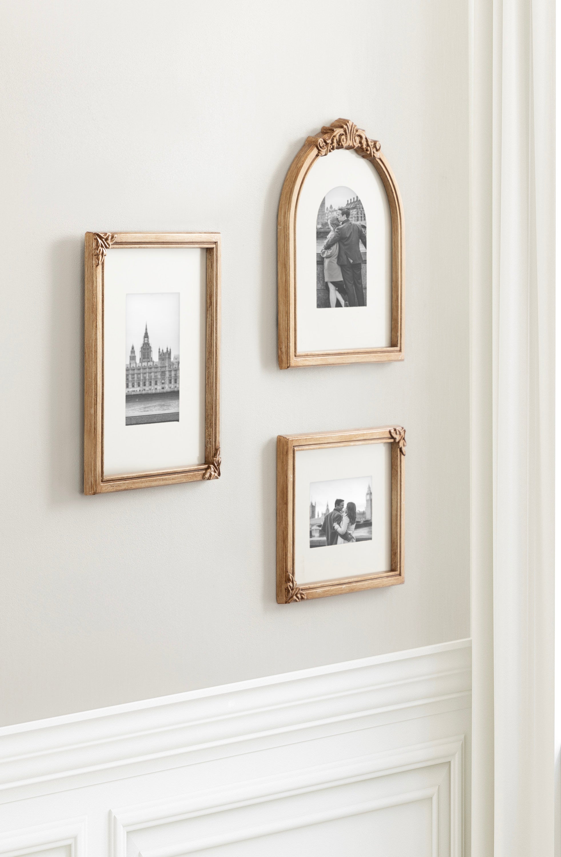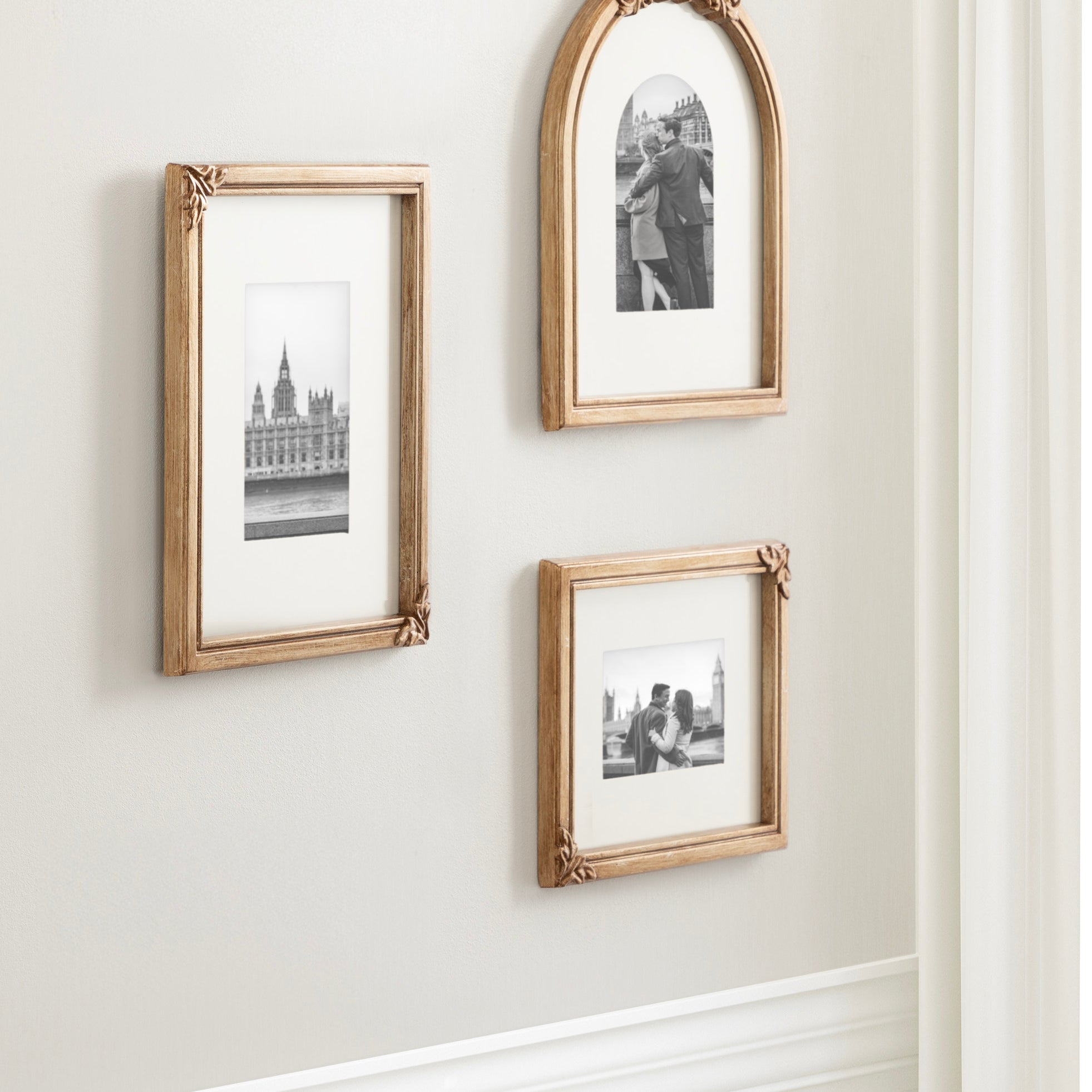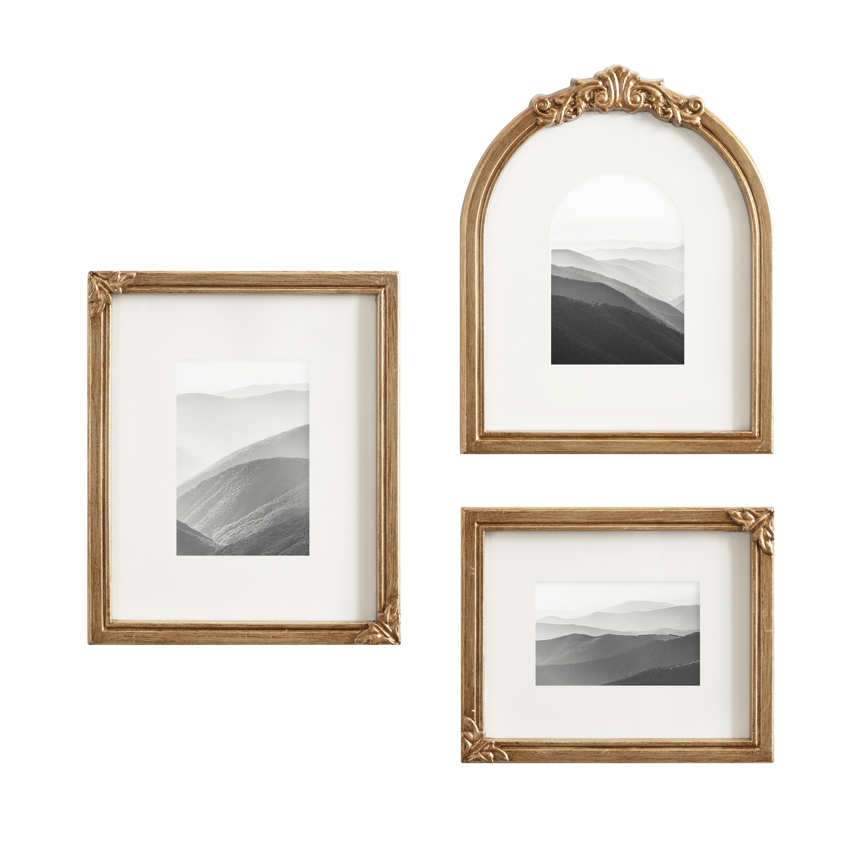 Add a trio of stunning picture frames to your wall decor with this photo frame set from Kate and Laurel. Crafted to meld well with a variety of decor styles, this picture frame set features an antique gold finish. The gallery wall set includes two different rectangular frames and a delightful arched picture frame. Their cohesive look allows you to showcase them together as a trio or spread out throughout your gallery wall or the rest of your home. Separating itself from a standard frame set, this frame trio includes vintage detailing along the frames to further accentuate your photographs. Both of the rectangle frames can be hung vertically or horizontally based on your preference or available wall space. The arched frame resembles the crown of our popular Arendahl mirror collection.