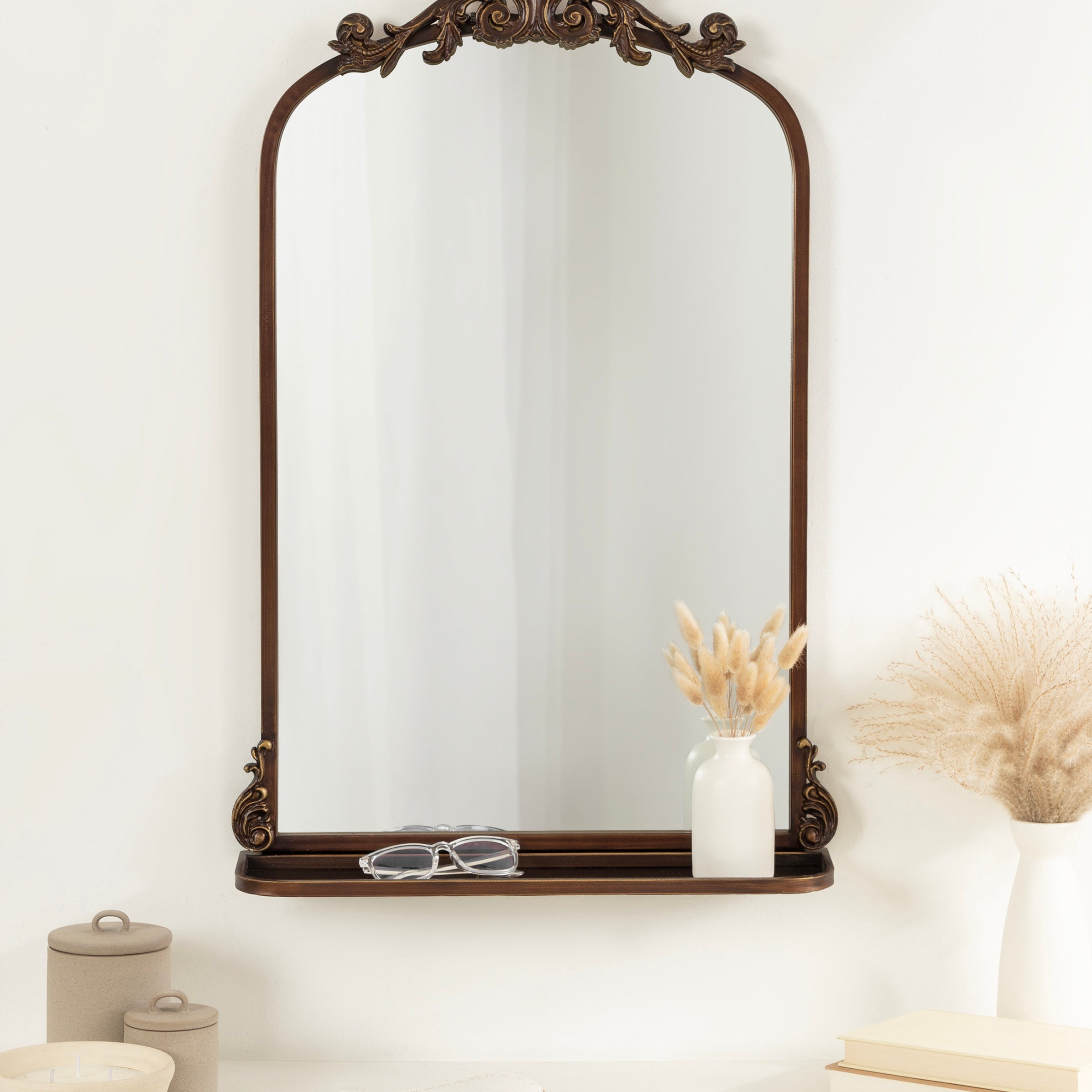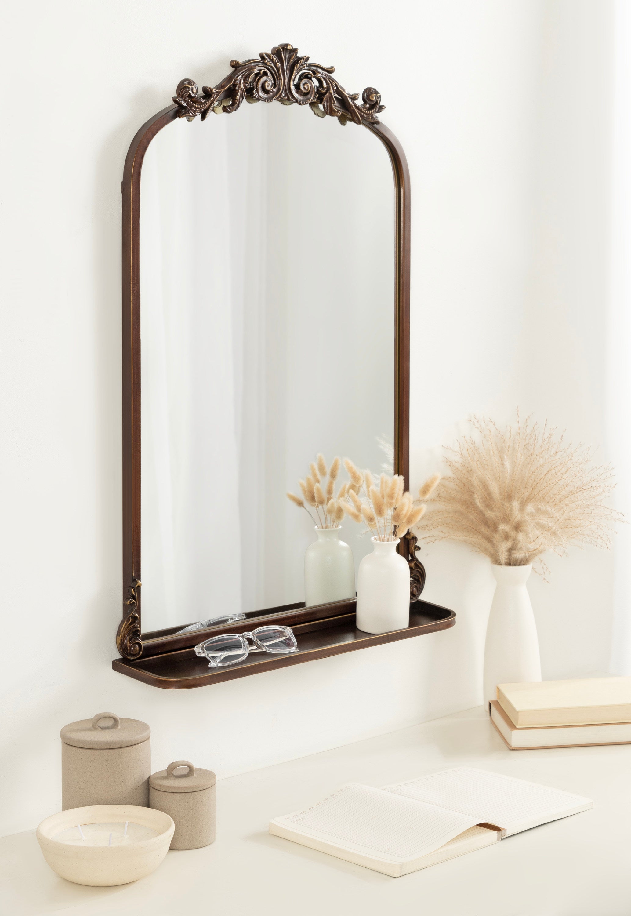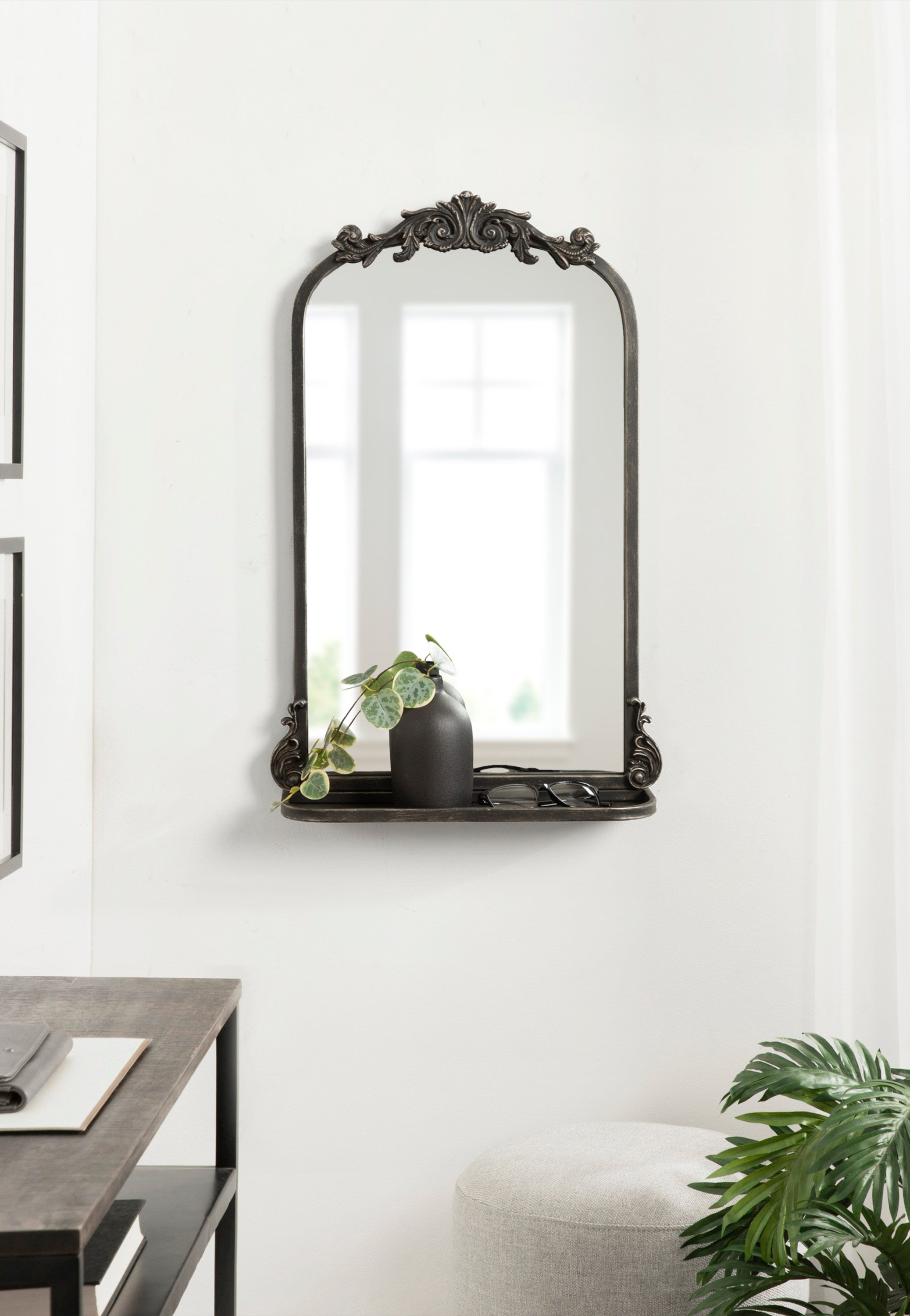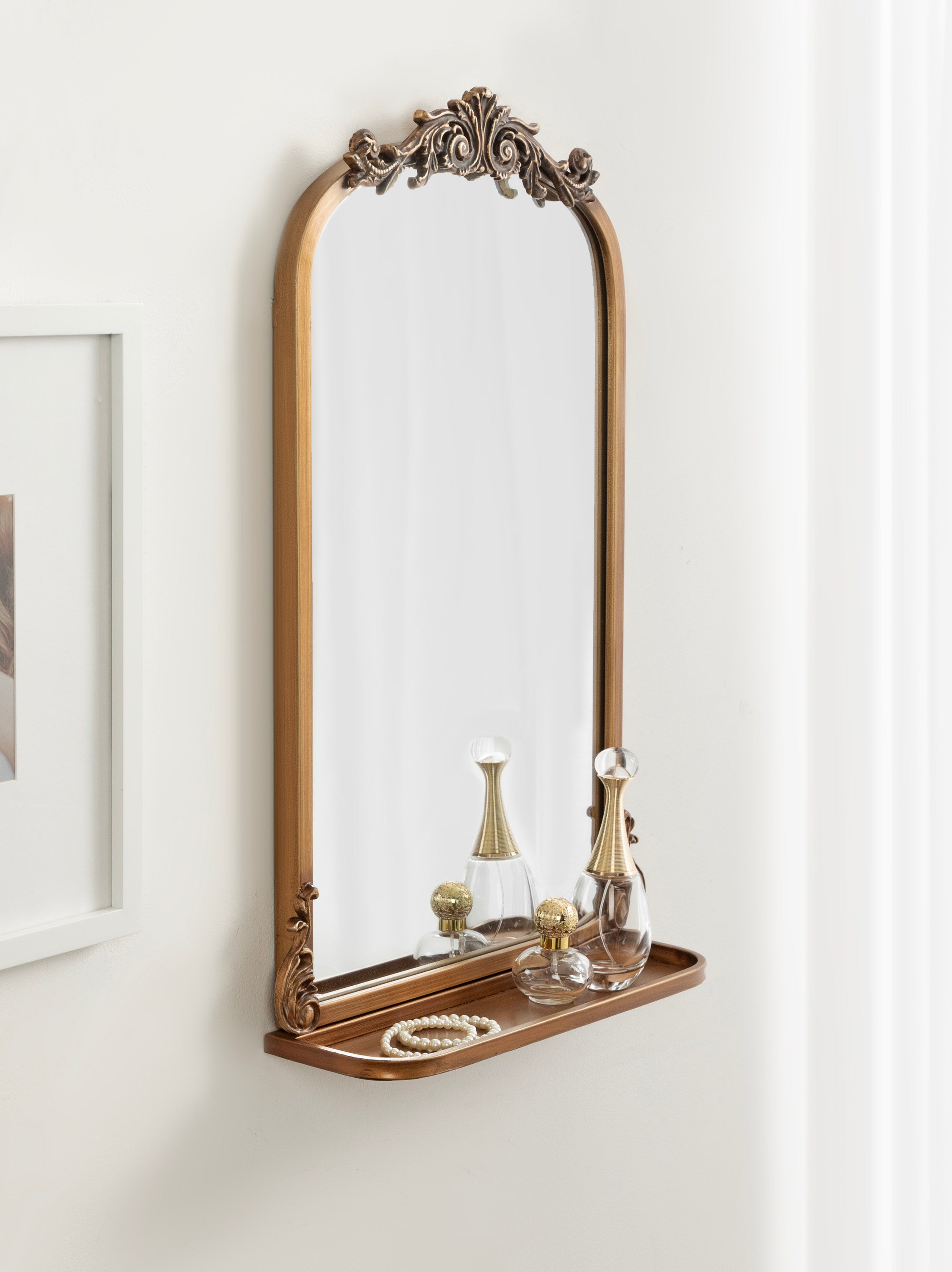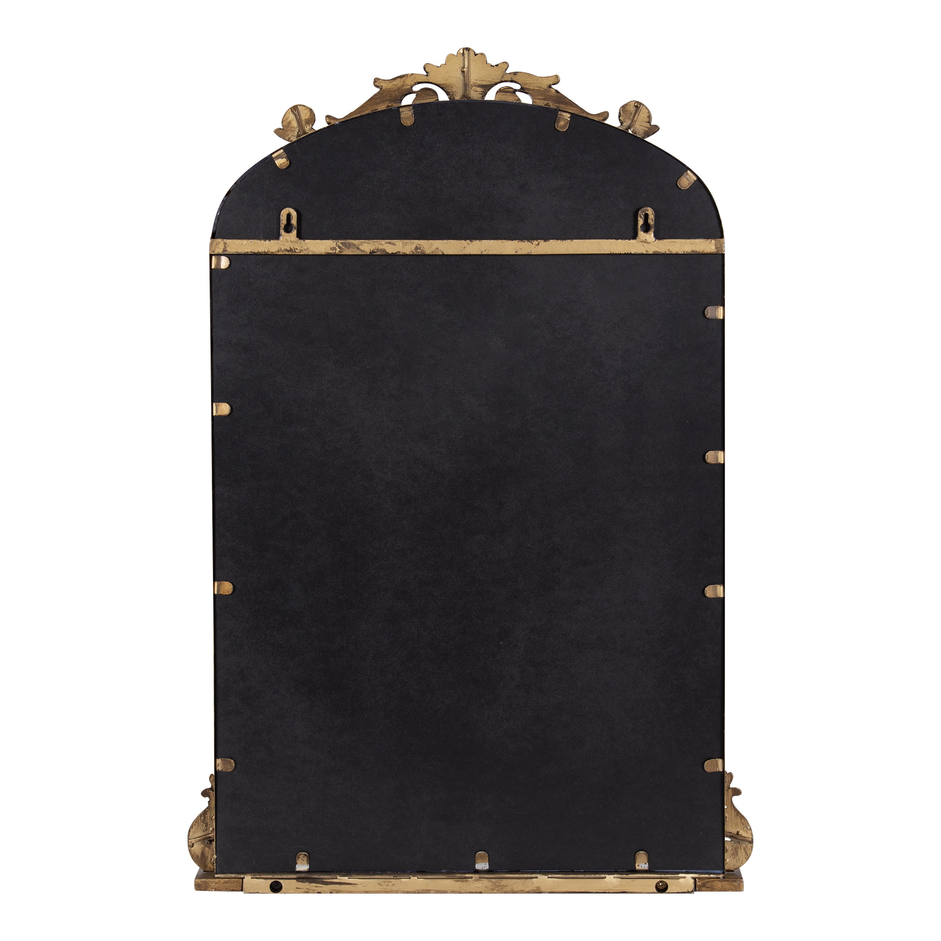 The Arendahl wall mirror brings a brilliant and decadent accent to any traditional home design. This wall mirror features a baroque-inspired design, with a resin garland crown cascading down a wide arched iron frame. The stunning antique finish brings it together as a vintage piece to display anywhere in your home. This version of the Arendahl features a functional shelf to place some small decor accents or necessary household items. Use the fabulous Arendahl wall mirror to bring dimension to your smaller spaces, opening up the area, and illuminating the darker corners. This framed mirror is also easy to hang, with metal keyhole wall hangers discreetly and securely attached to the back. Assembling this arch mirror is simple with a one-step assembly process to attach the shelf to the mirror.