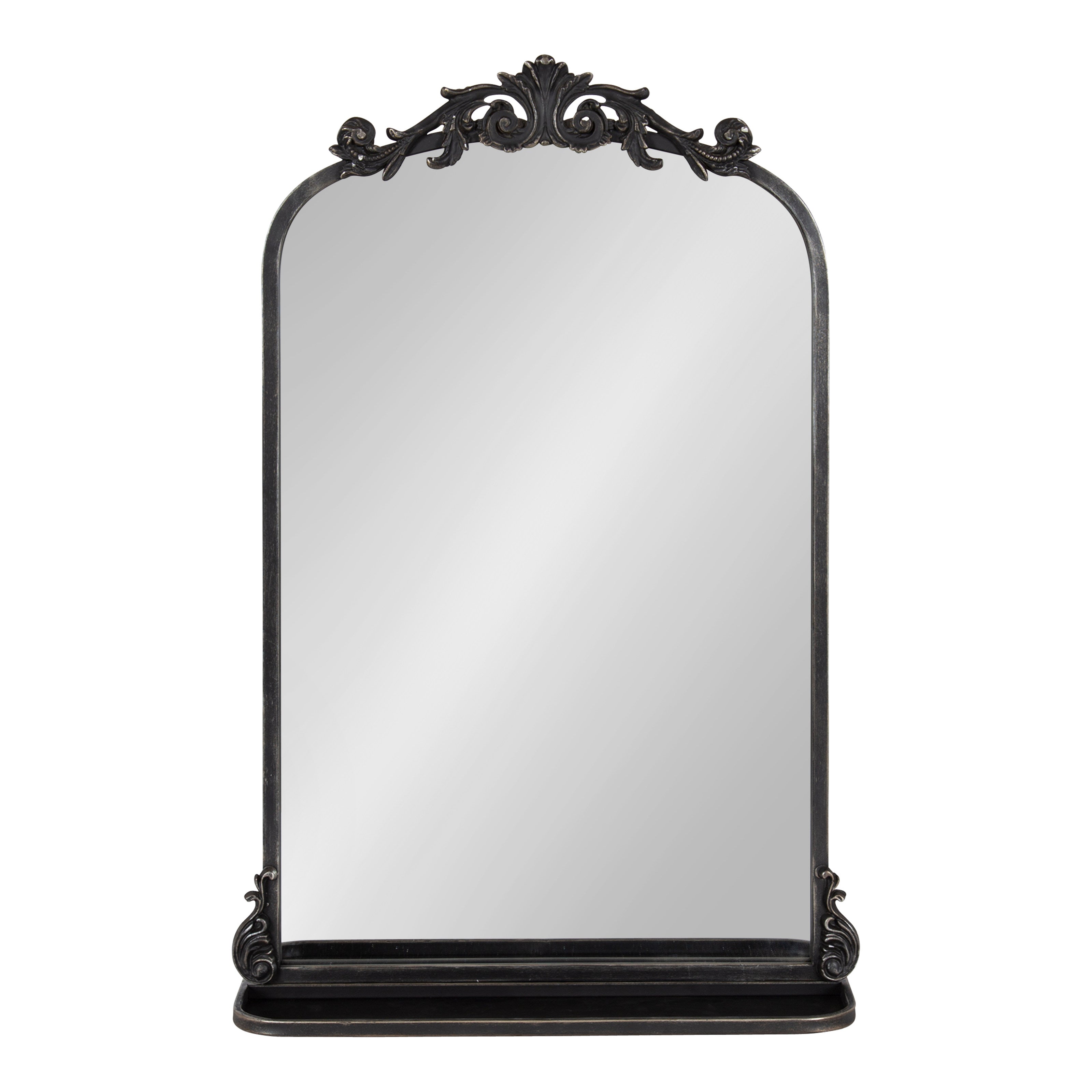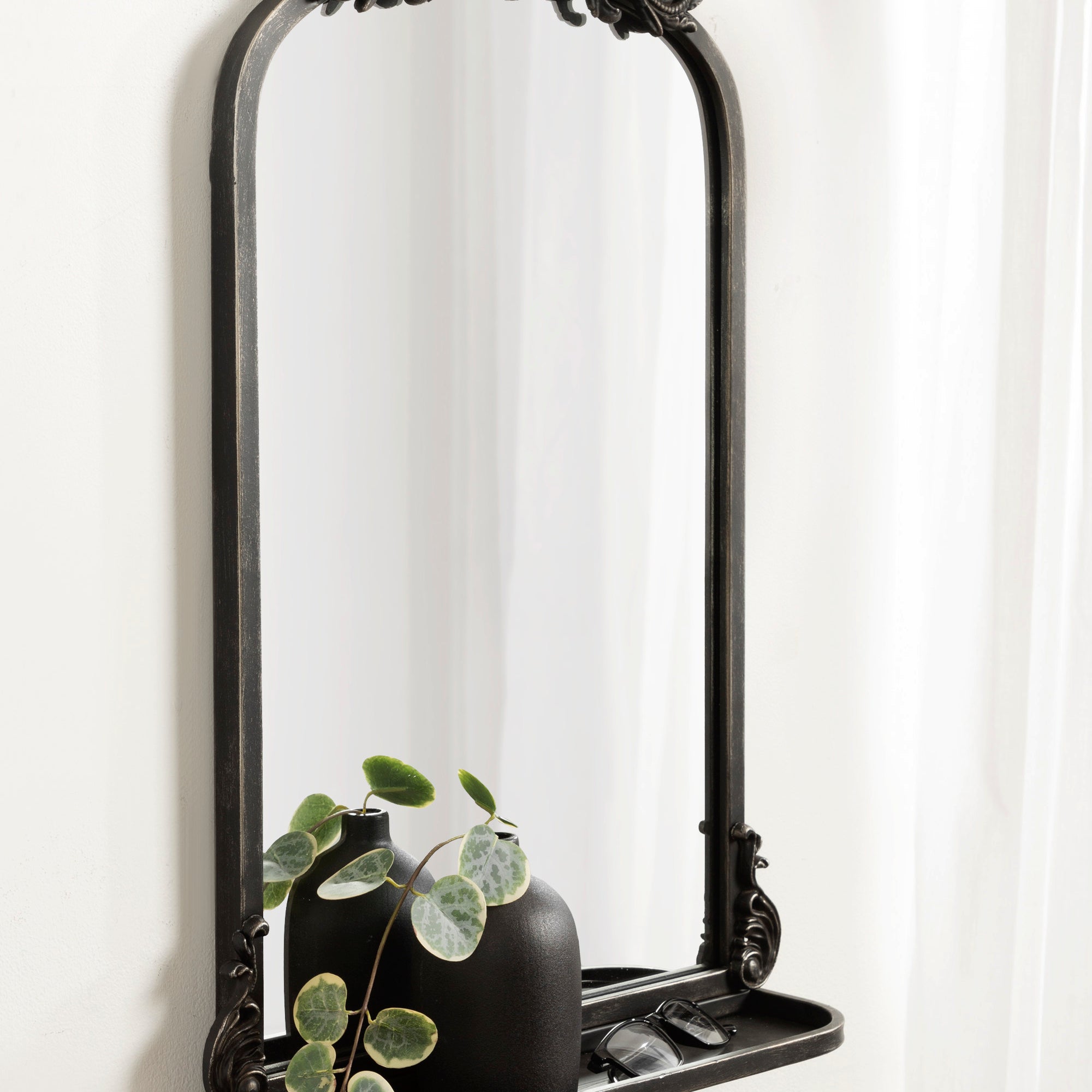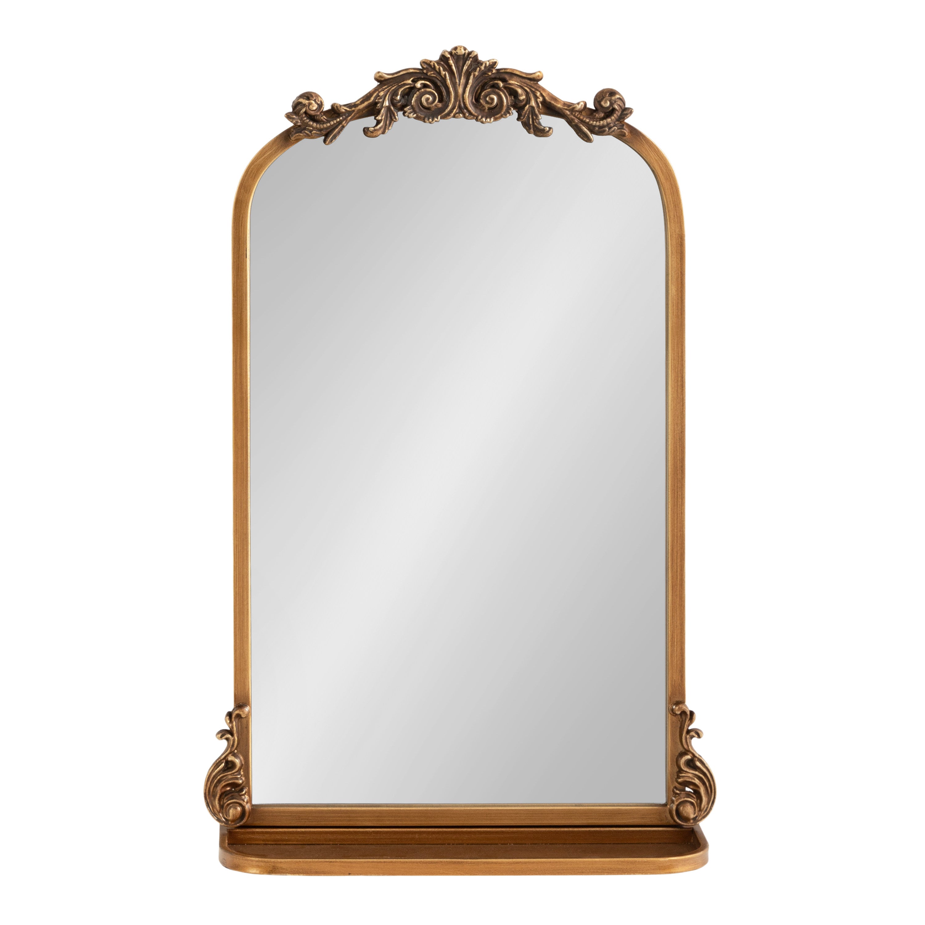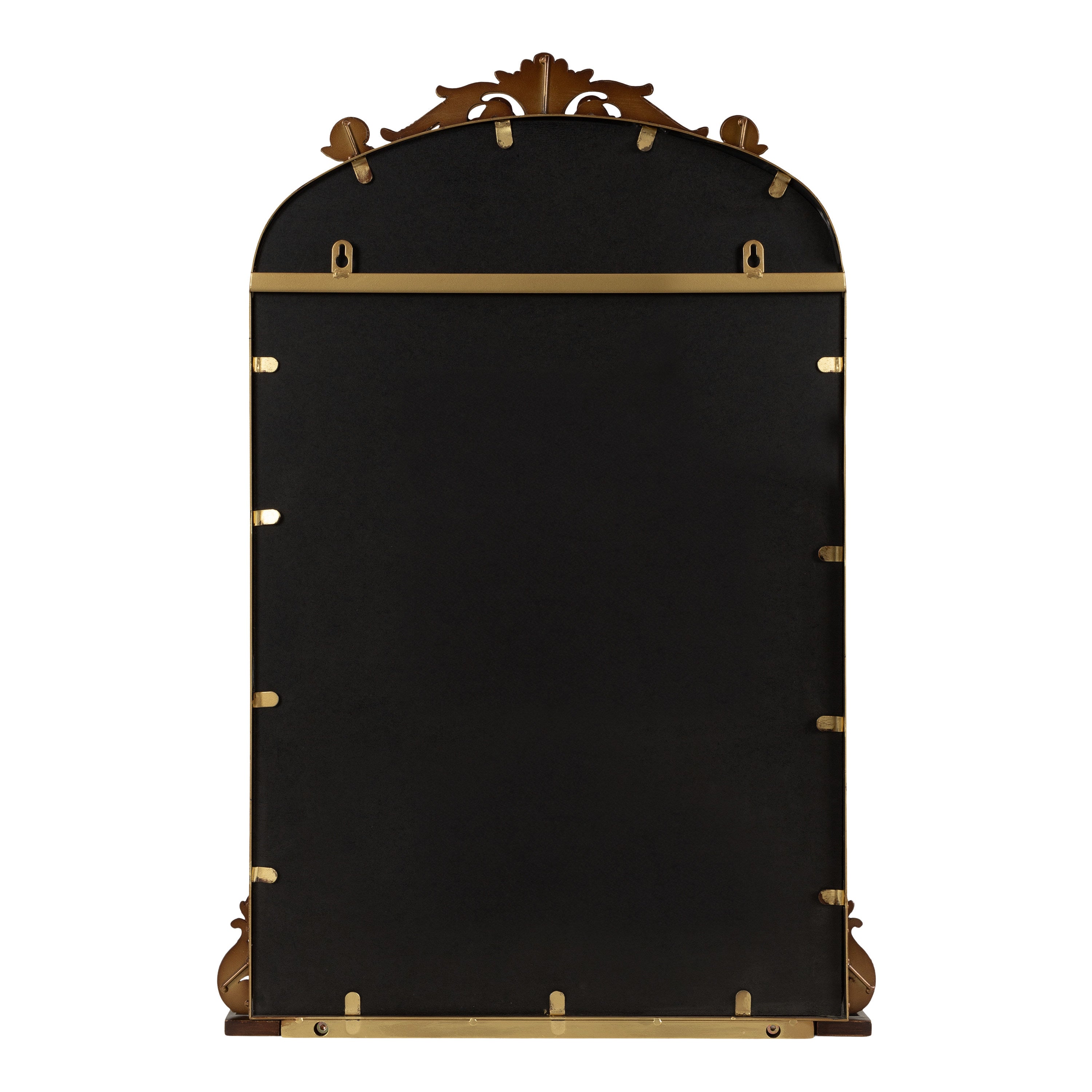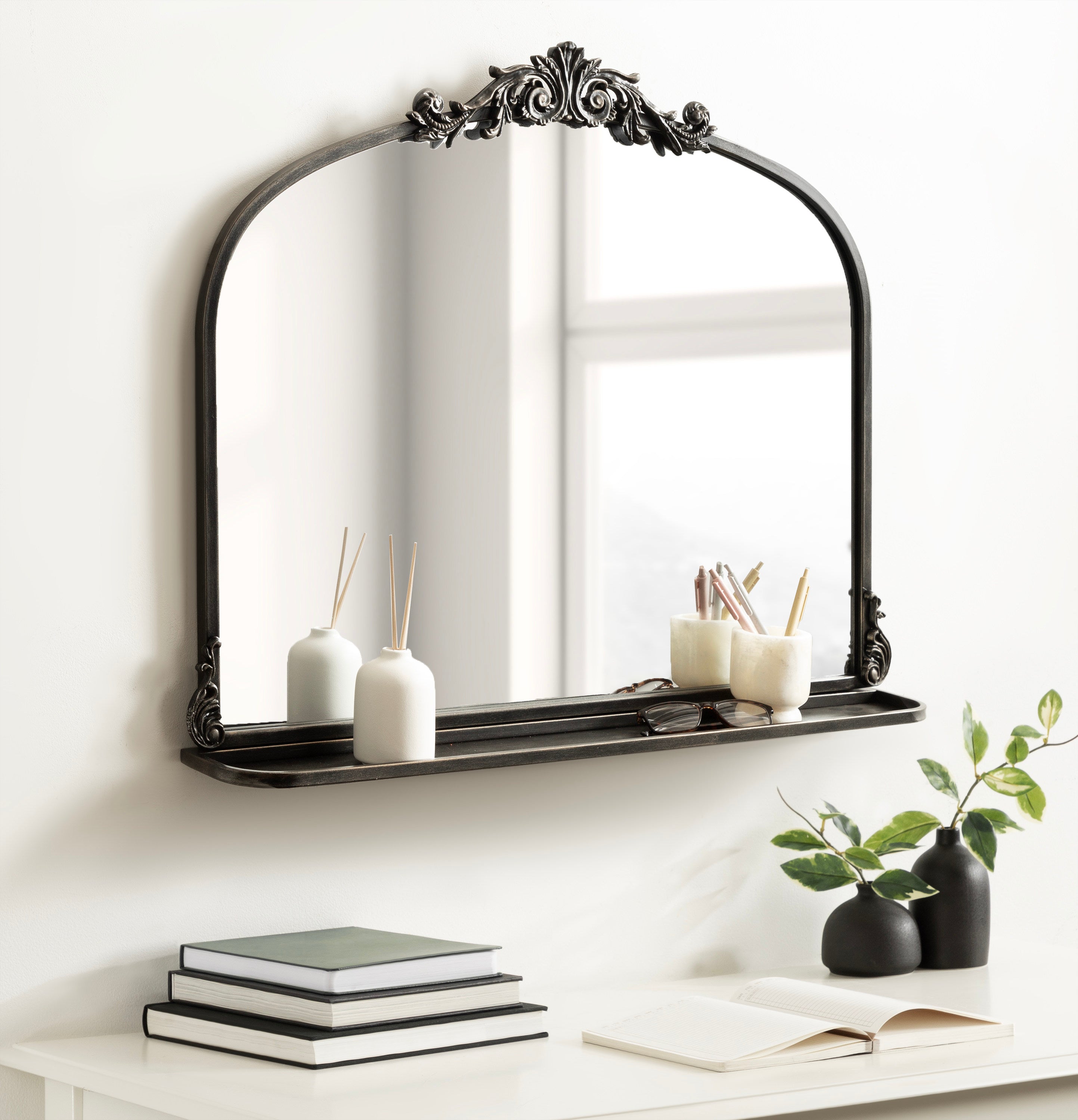 The Arendahl wall mirror brings a brilliant and decadent accent to any traditional home design. This wall mirror features a baroque-inspired design, with a resin garland crown cascading down a wide arched iron frame. The stunning antique finish brings it together as a vintage piece to display anywhere in your home. This version of the Arendahl features a functional shelf to place some small decor accents or necessary household items. Use the fabulous Arendahl wall mirror to bring dimension to your smaller spaces, opening up the area, and illuminating the darker corners. This framed mirror is also easy to hang, with metal keyhole wall hangers discreetly and securely attached to the back. Assembling this arch mirror is simple with a one-step assembly process to attach the shelf to the mirror.