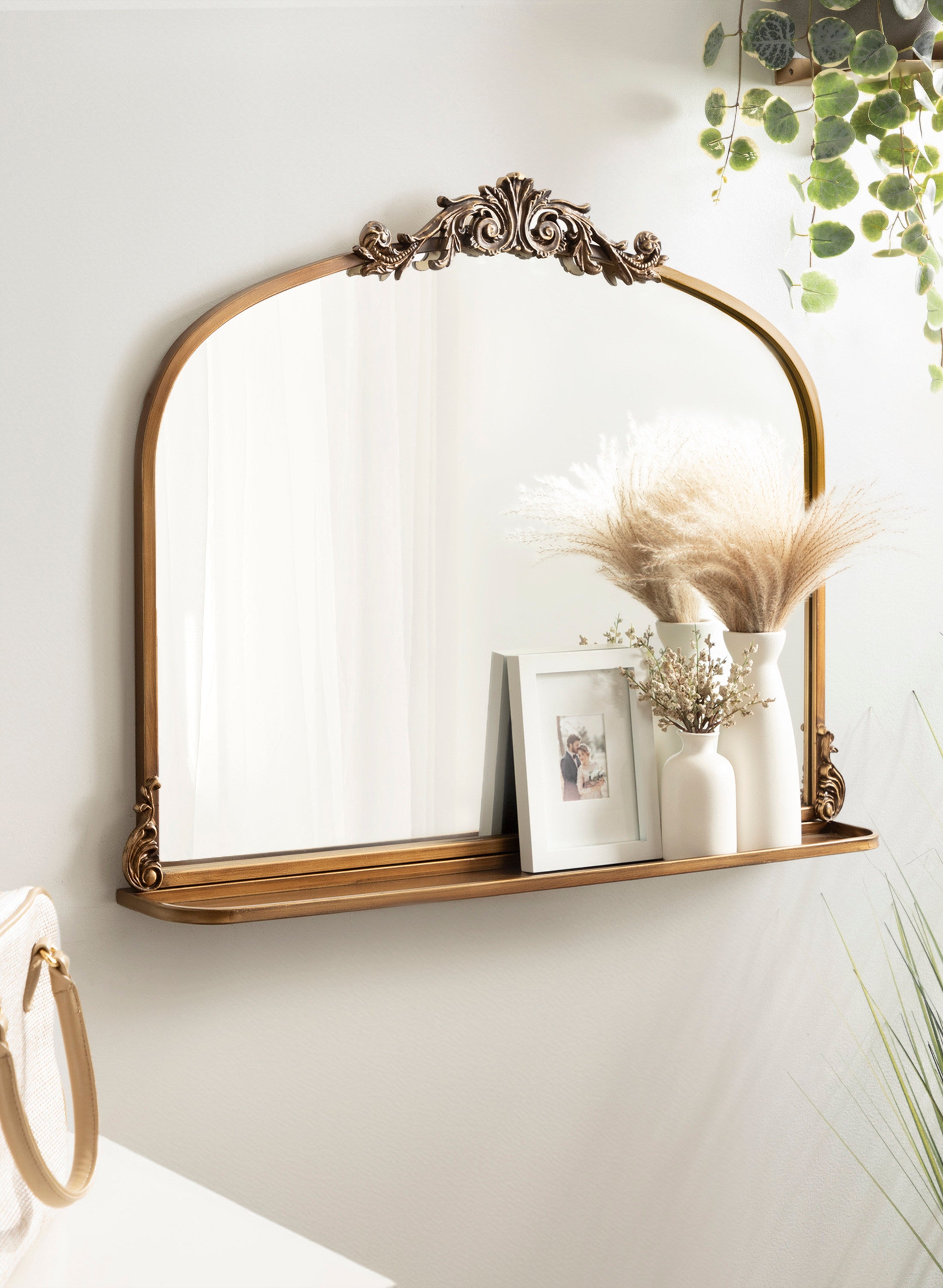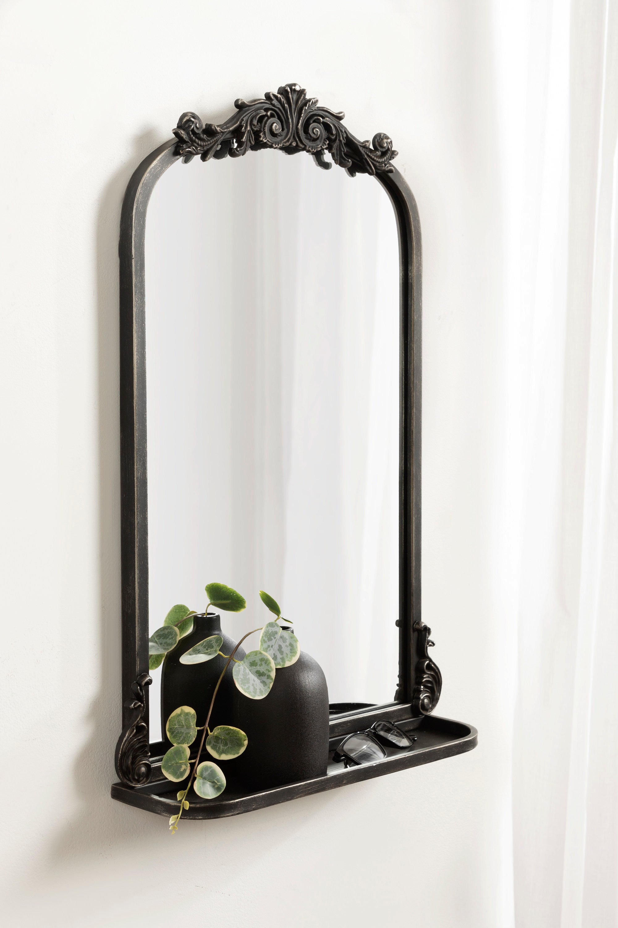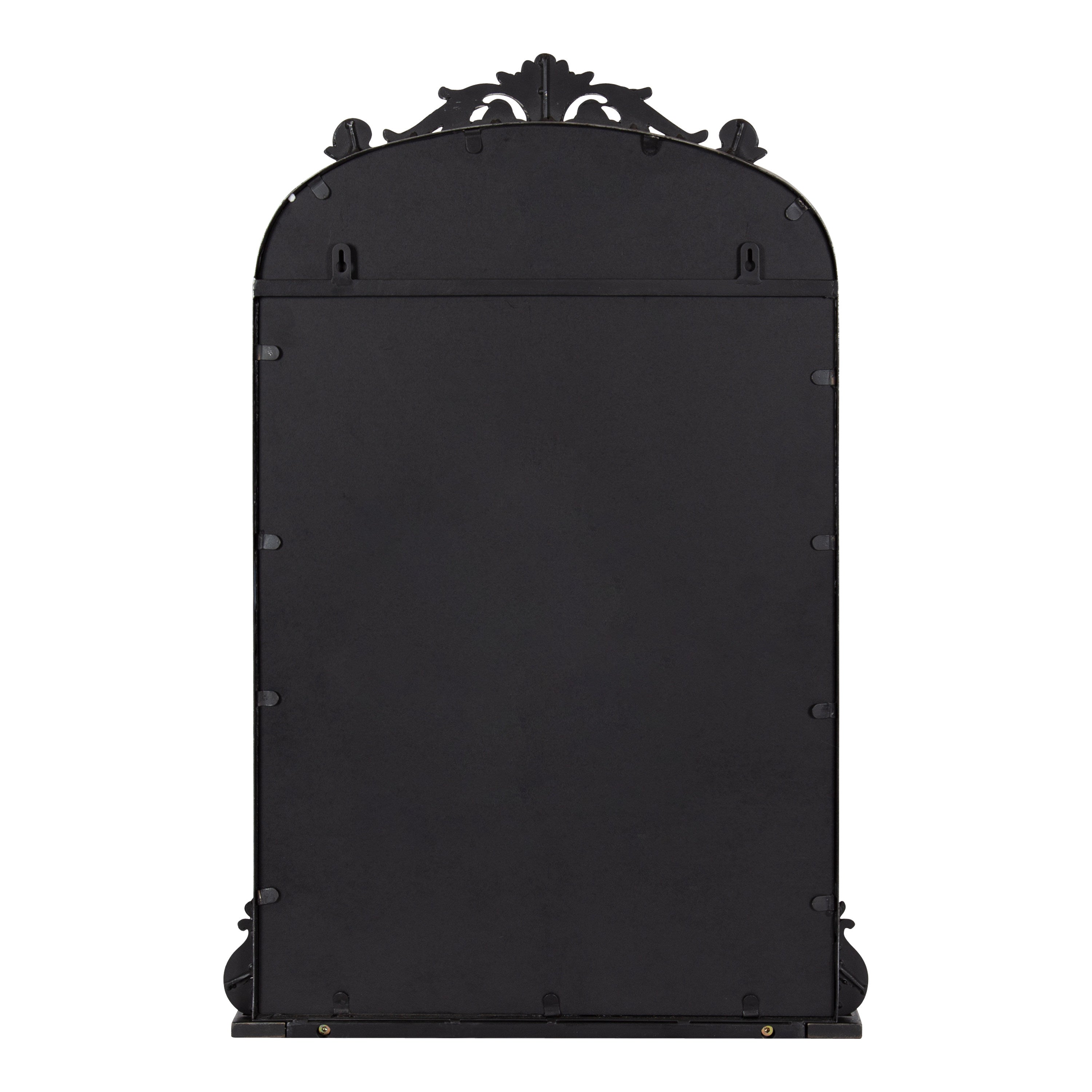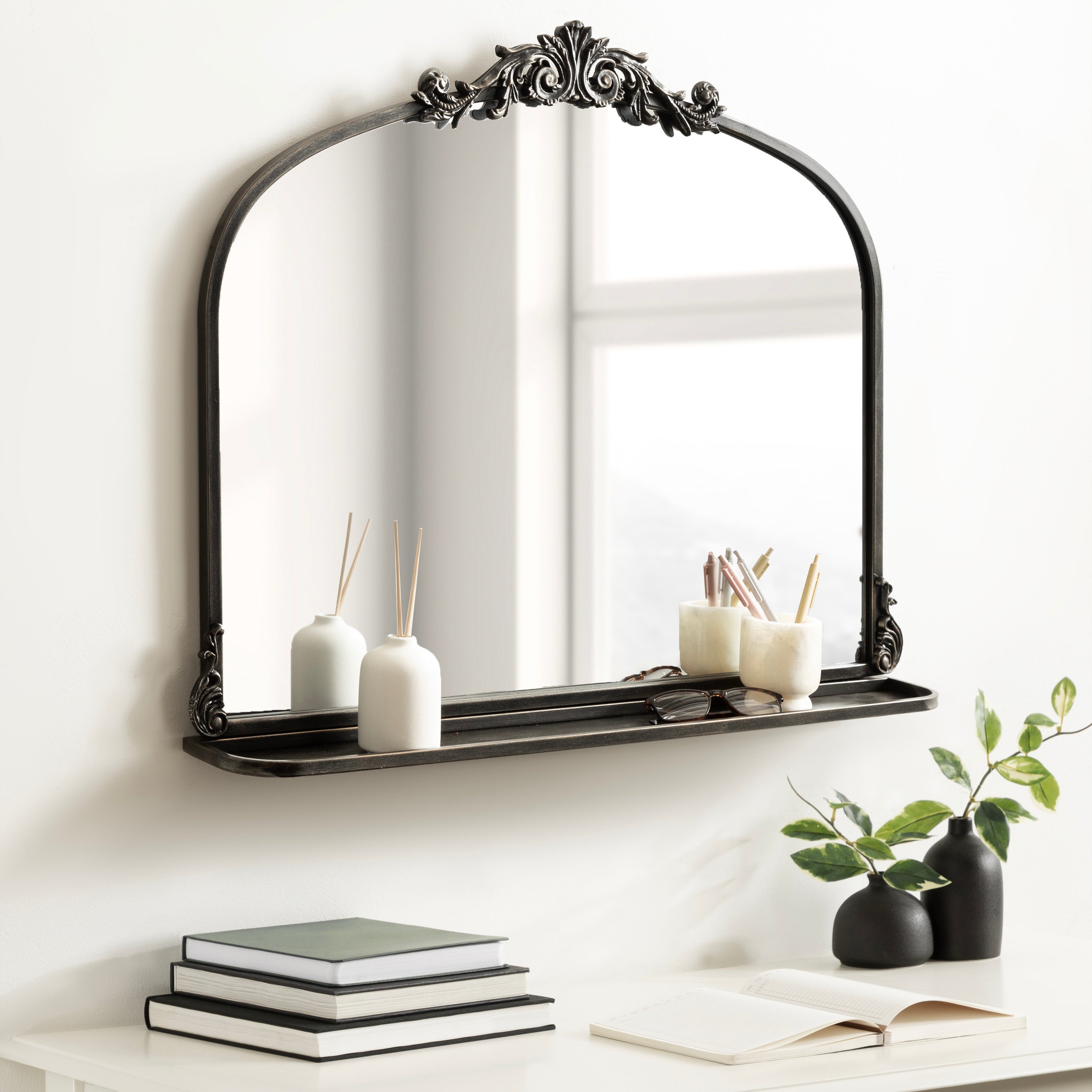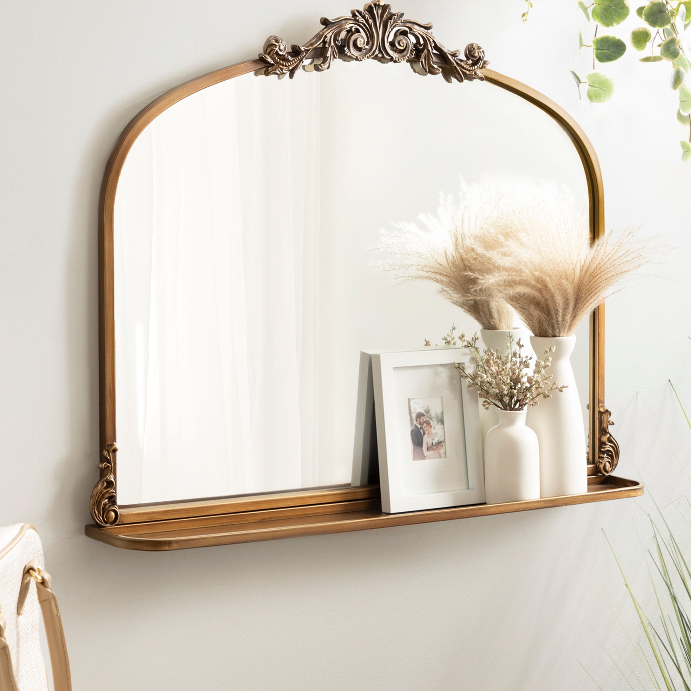 The Arendahl wall mirror brings a brilliant and decadent accent to any traditional home design. This wall mirror features a baroque-inspired design, with a resin garland crown cascading down a wide arched iron frame. The stunning antique finish brings it together as a vintage piece to display anywhere in your home. This version of the Arendahl features a functional shelf to place some small decor accents or necessary household items. Use the fabulous Arendahl wall mirror to bring dimension to your smaller spaces, opening up the area, and illuminating the darker corners. This framed mirror is also easy to hang, with metal keyhole wall hangers discreetly and securely attached to the back. Assembling this arch mirror is simple with a one-step assembly process to attach the shelf to the mirror.