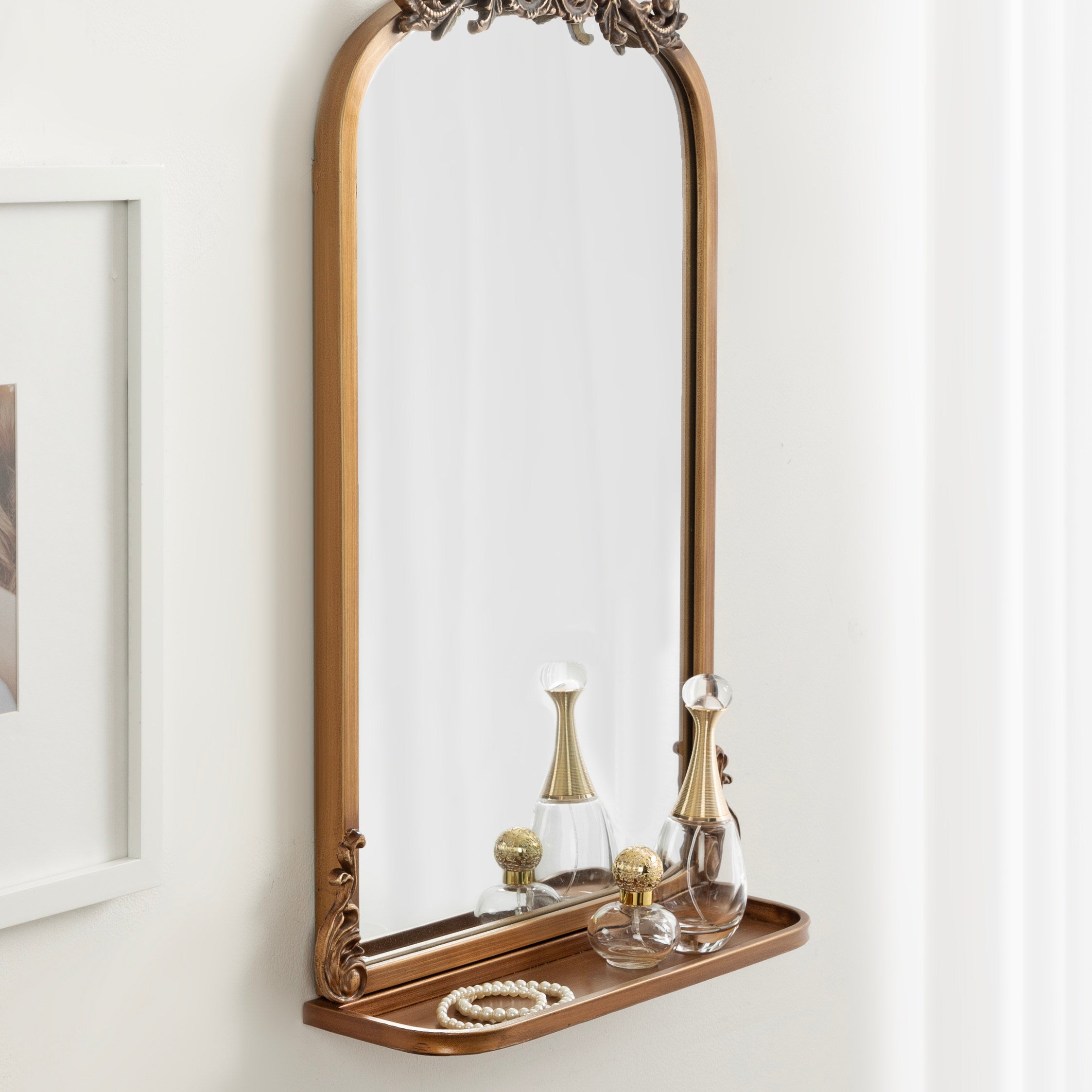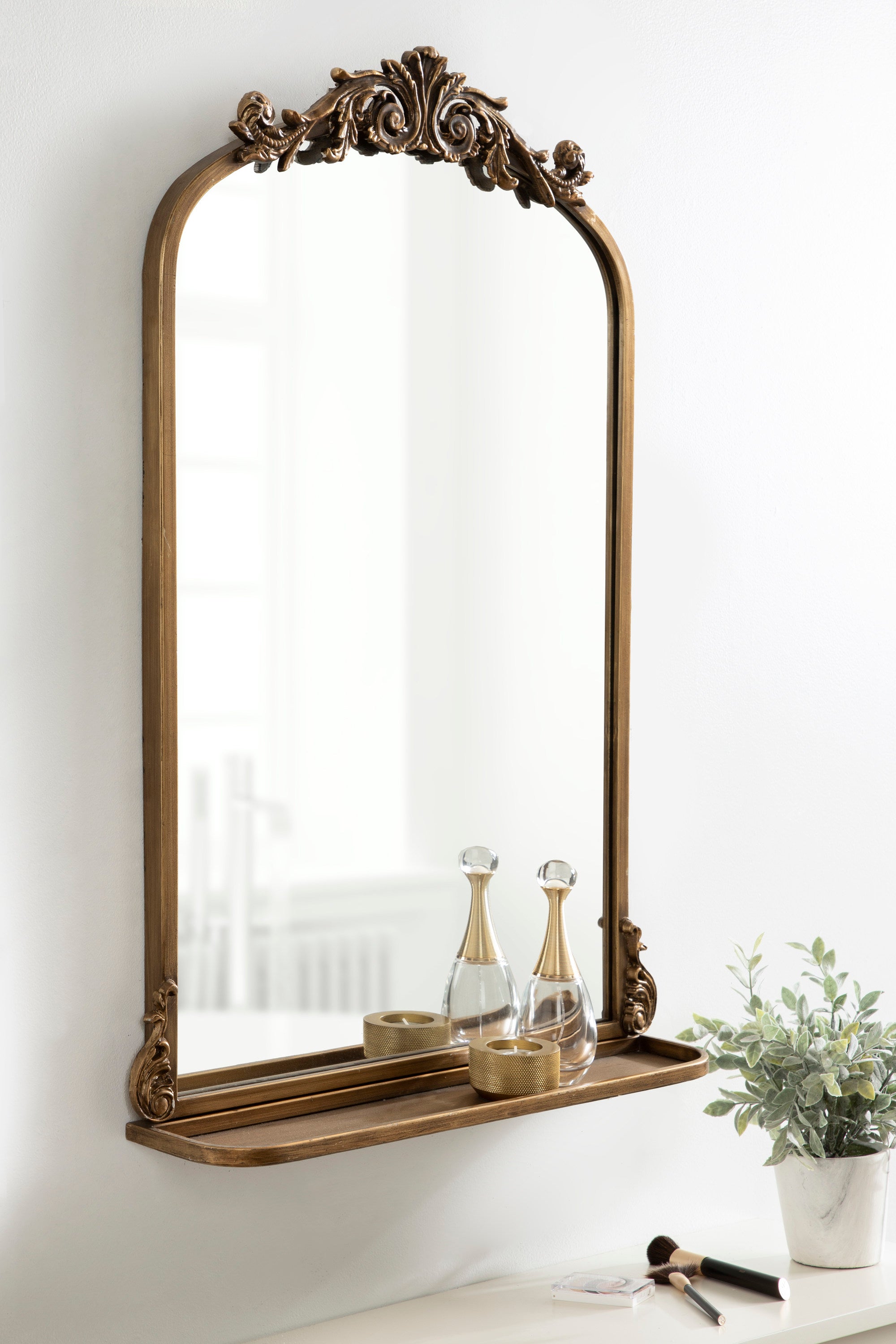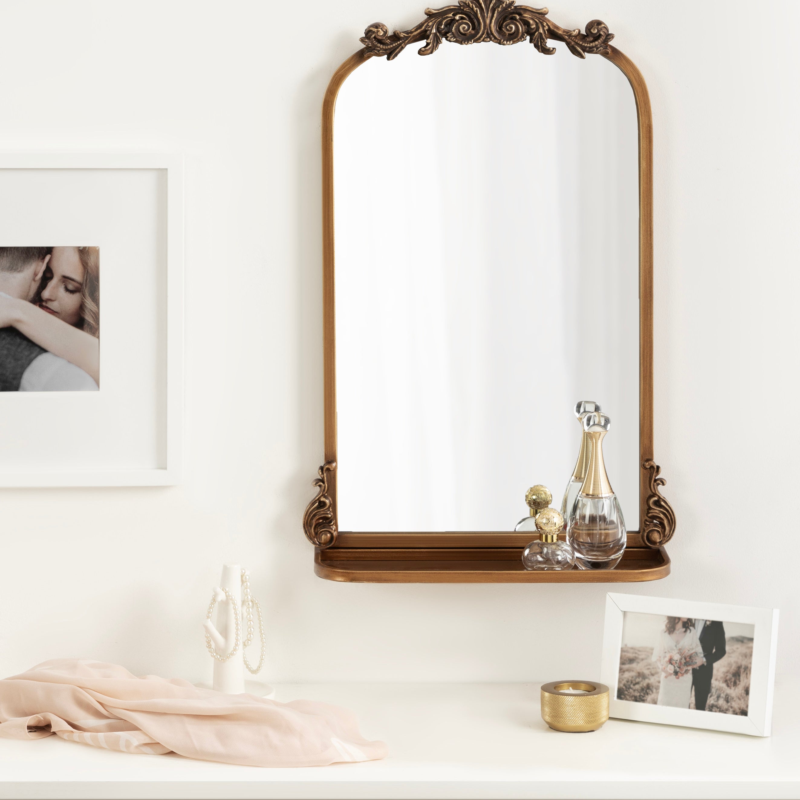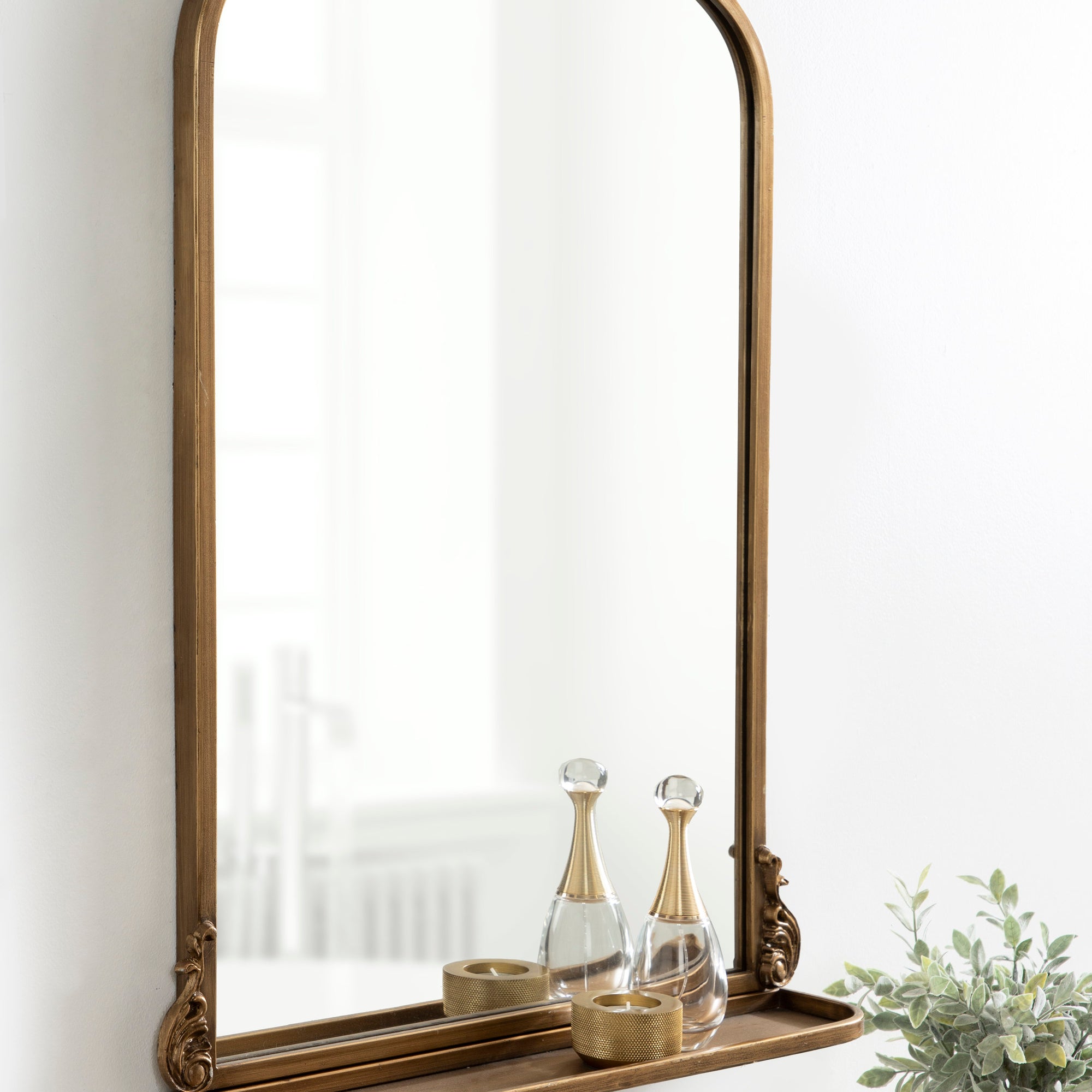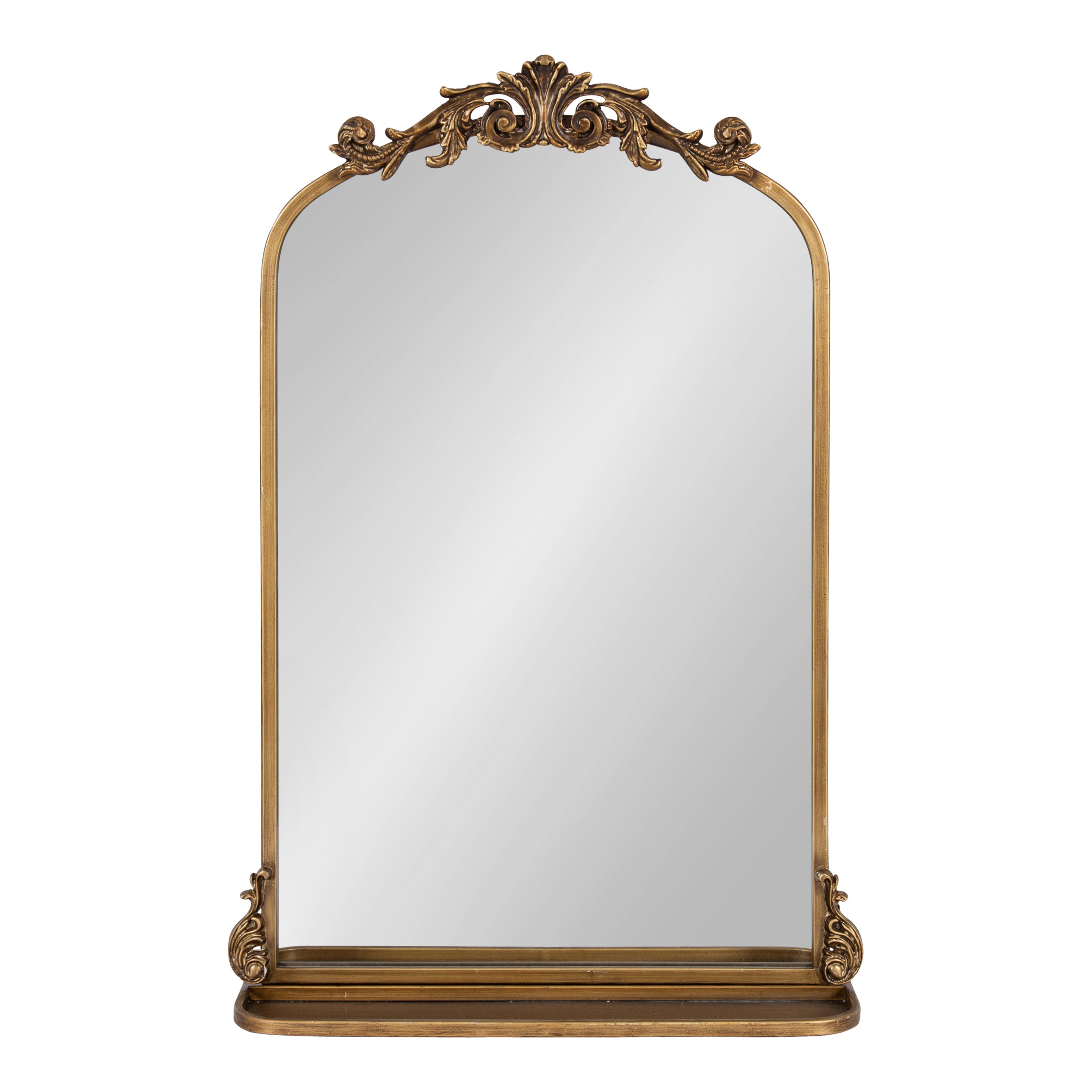 The Arendahl wall mirror brings a brilliant and decadent accent to any traditional home design. This wall mirror features a baroque-inspired design, with a resin garland crown cascading down a wide arched iron frame. The stunning antique finish brings it together as a vintage piece to display anywhere in your home. This version of the Arendahl features a functional shelf to place some small decor accents or necessary household items. Use the fabulous Arendahl wall mirror to bring dimension to your smaller spaces, opening up the area, and illuminating the darker corners. This framed mirror is also easy to hang, with metal keyhole wall hangers discreetly and securely attached to the back. Assembling this arch mirror is simple with a one-step assembly process to attach the shelf to the mirror.