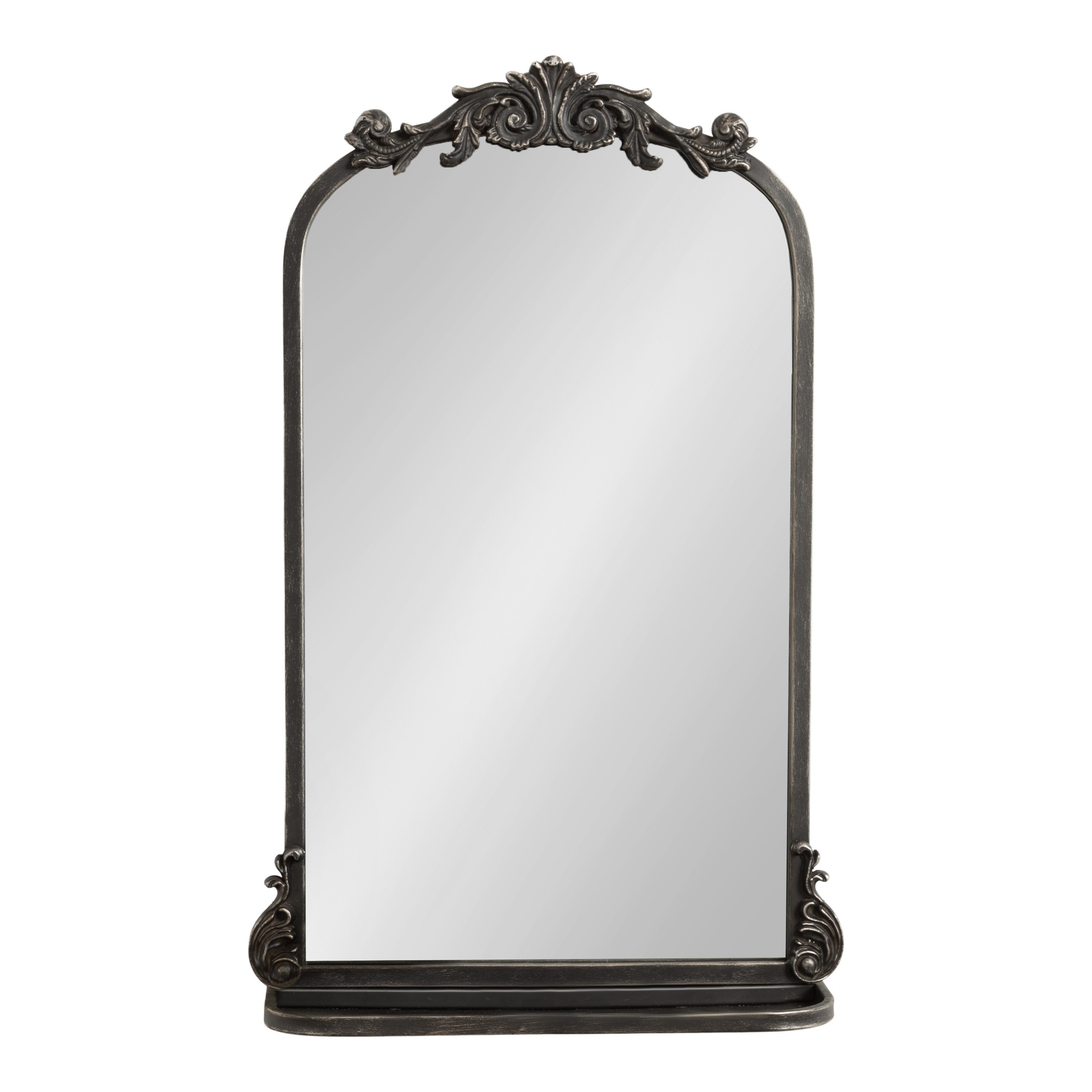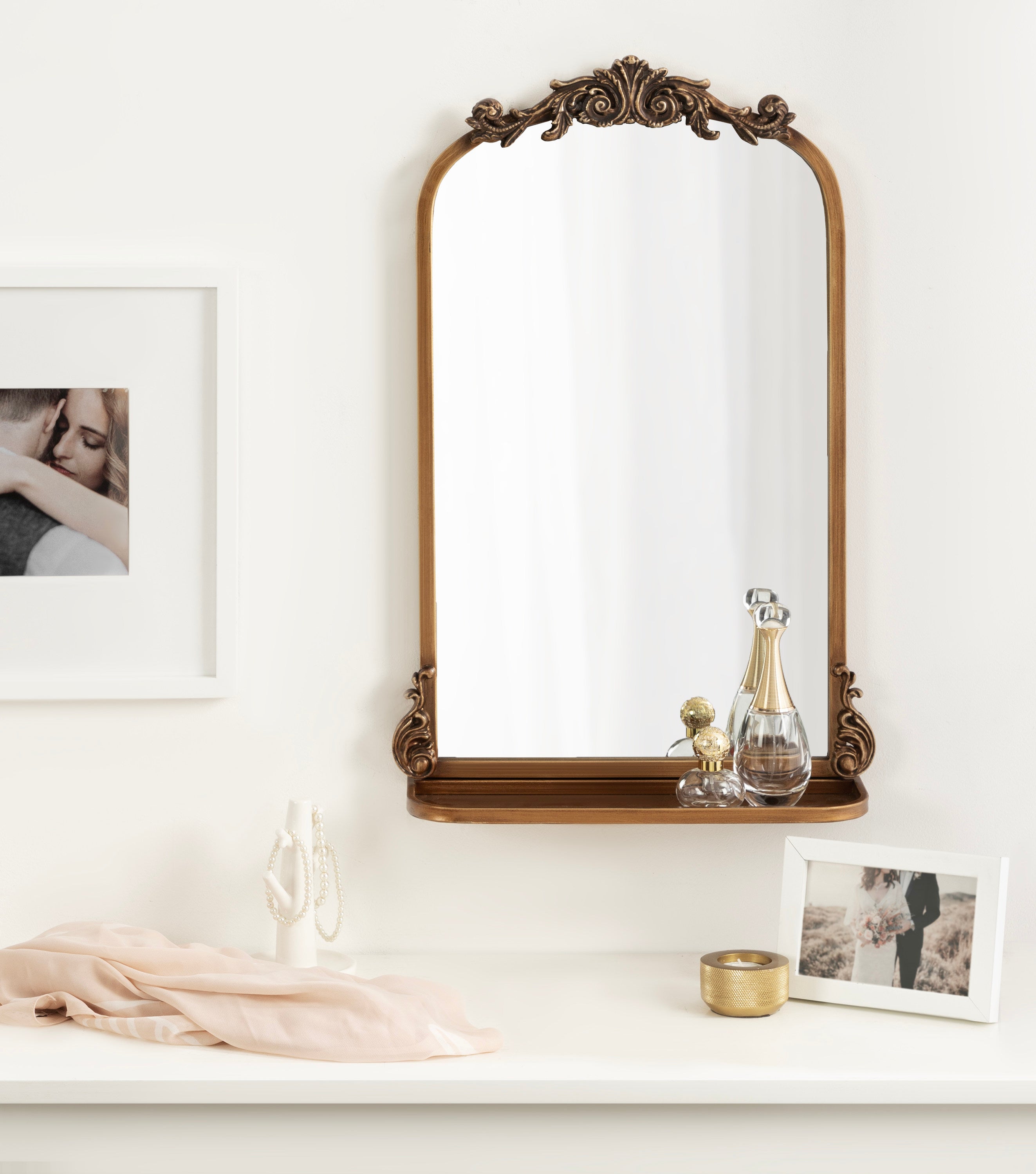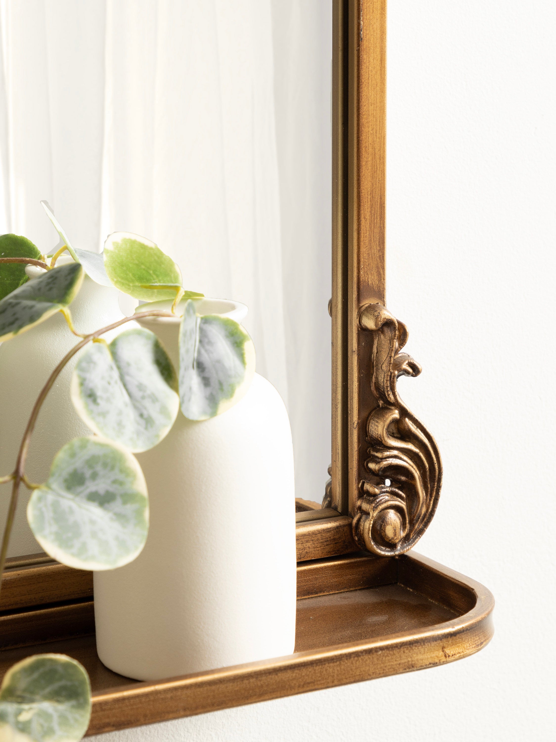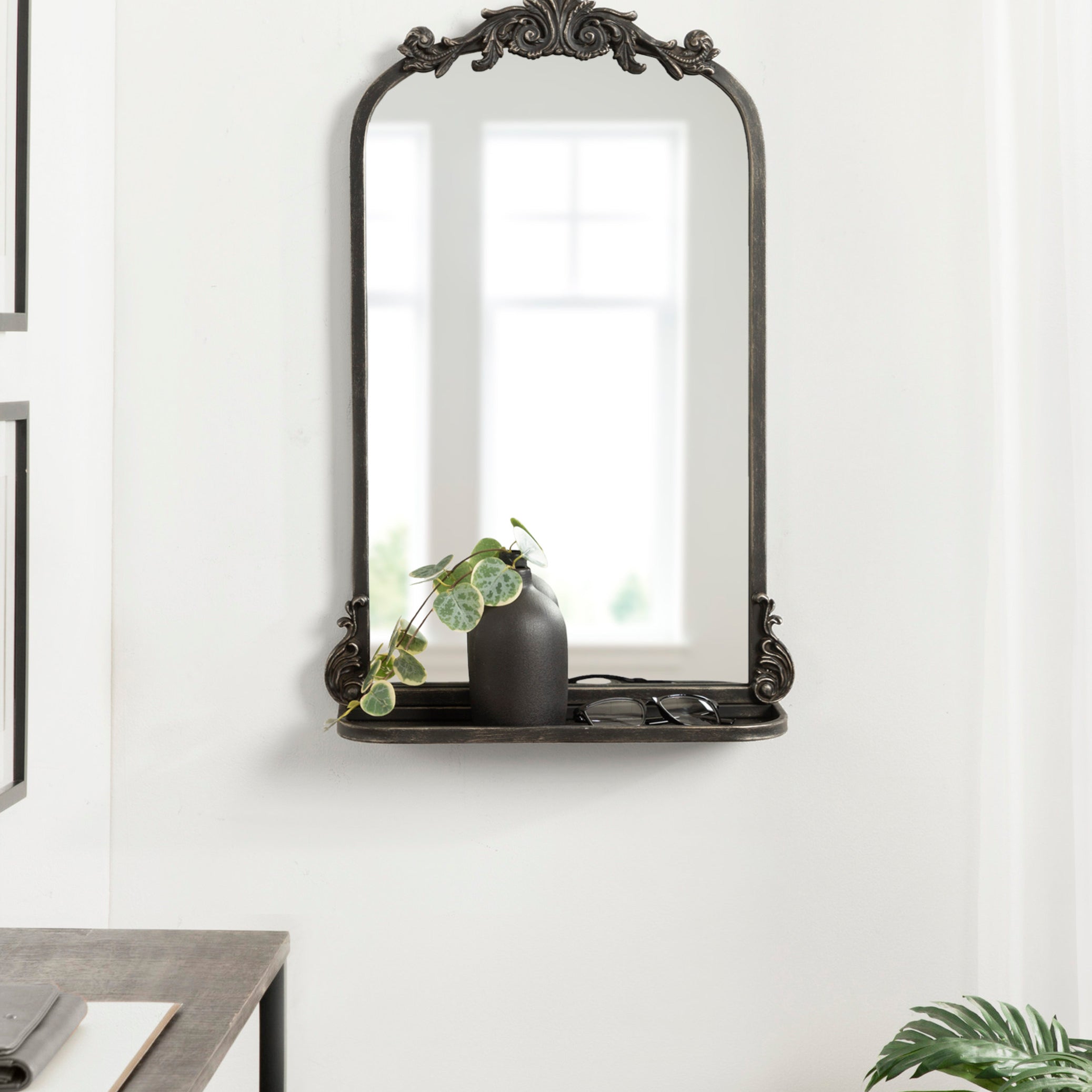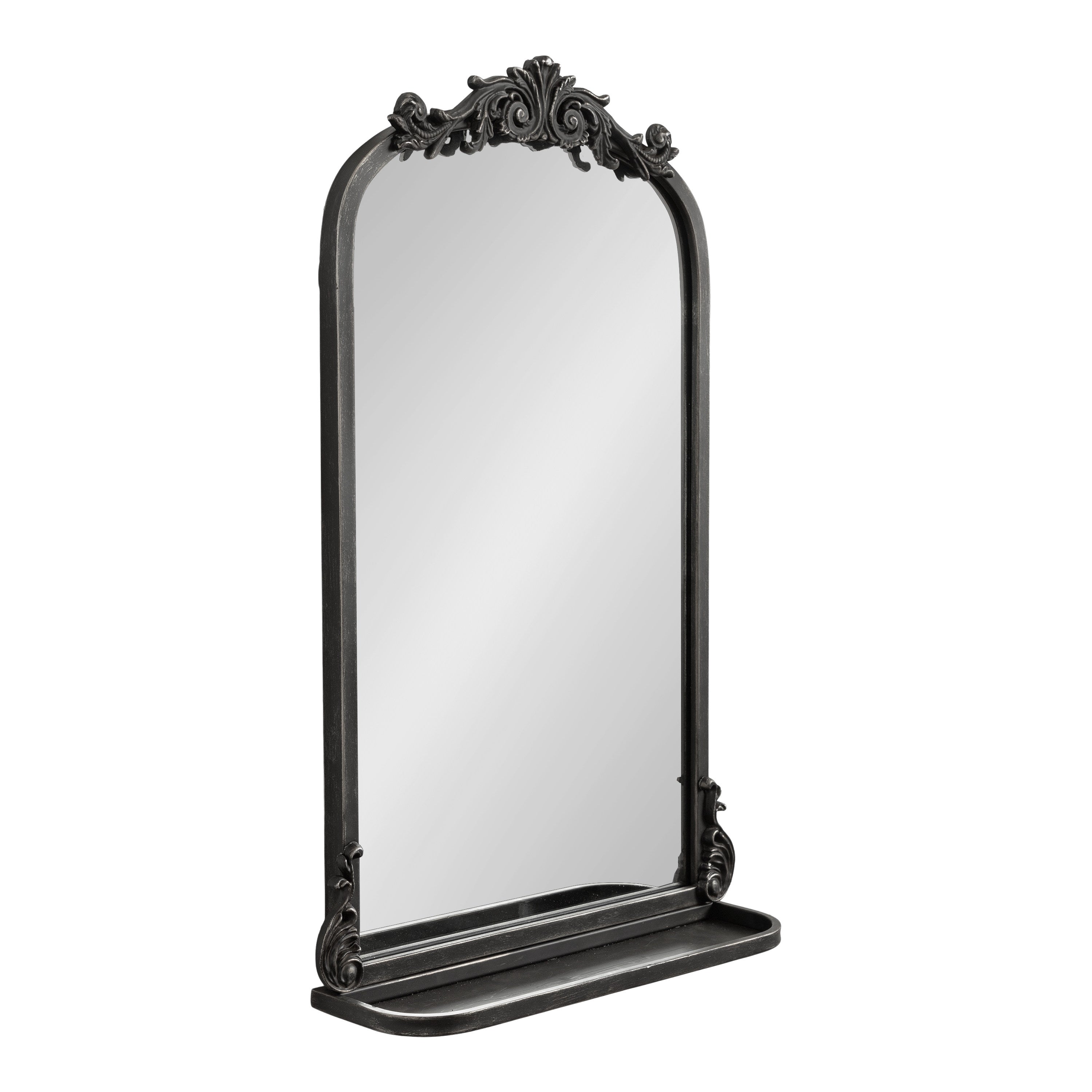 The Arendahl wall mirror brings a brilliant and decadent accent to any traditional home design. This wall mirror features a baroque-inspired design, with a resin garland crown cascading down a wide arched iron frame. The stunning antique finish brings it together as a vintage piece to display anywhere in your home. This version of the Arendahl features a functional shelf to place some small decor accents or necessary household items. Use the fabulous Arendahl wall mirror to bring dimension to your smaller spaces, opening up the area, and illuminating the darker corners. This framed mirror is also easy to hang, with metal keyhole wall hangers discreetly and securely attached to the back. Assembling this arch mirror is simple with a one-step assembly process to attach the shelf to the mirror.