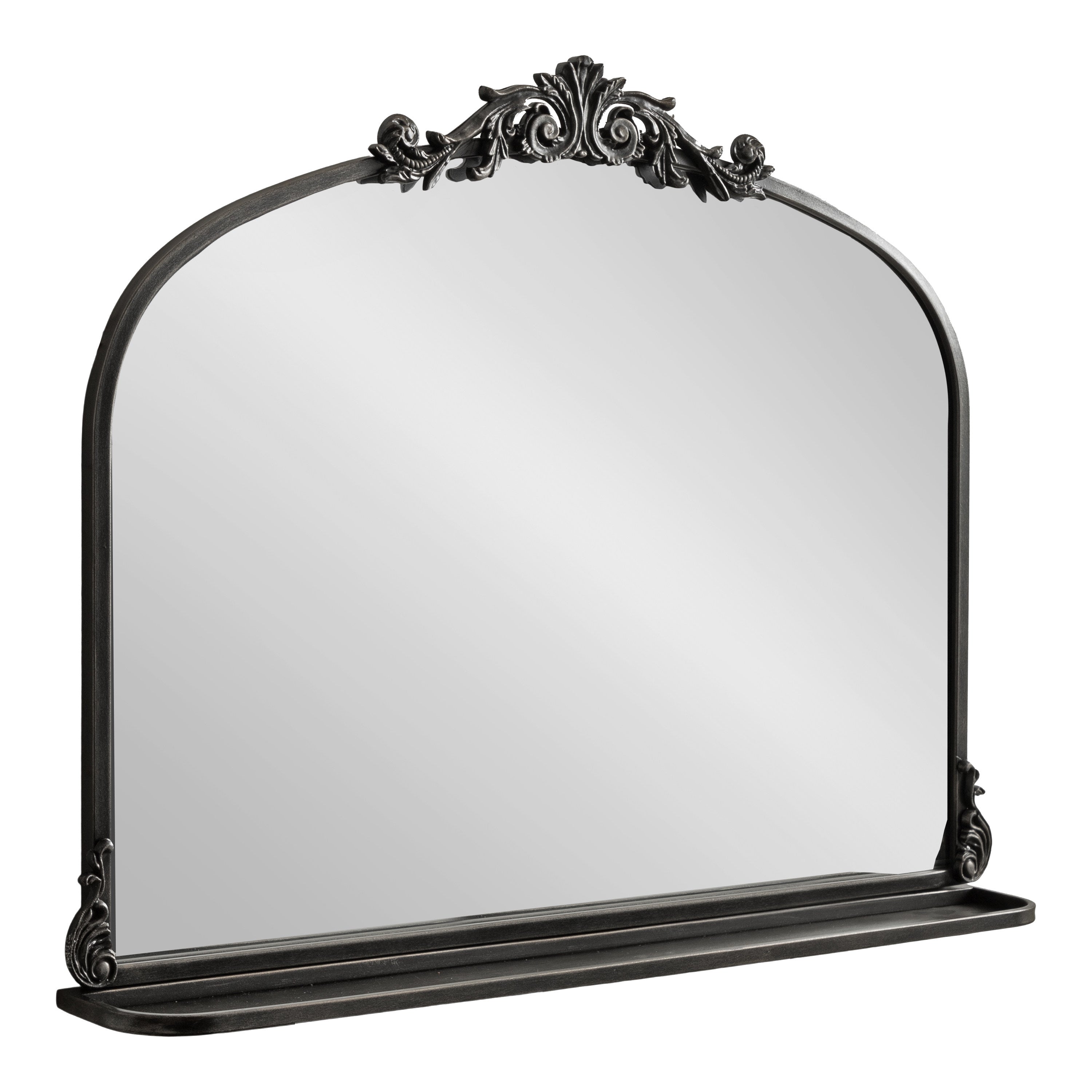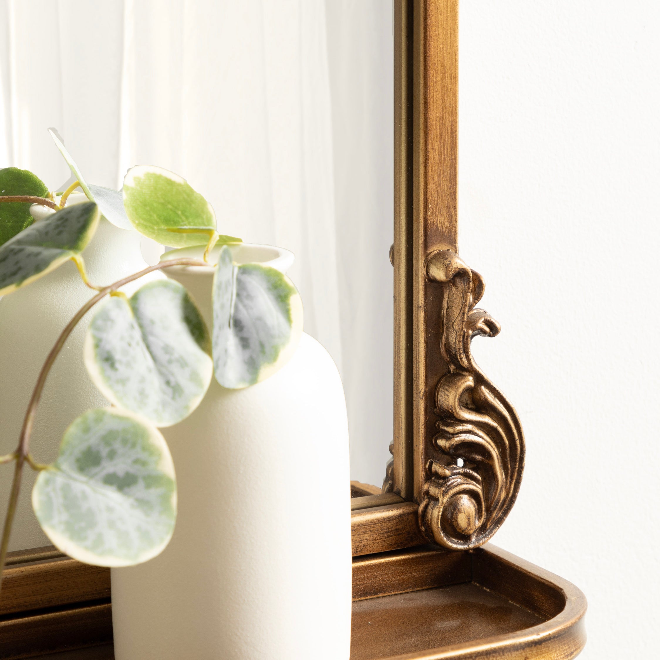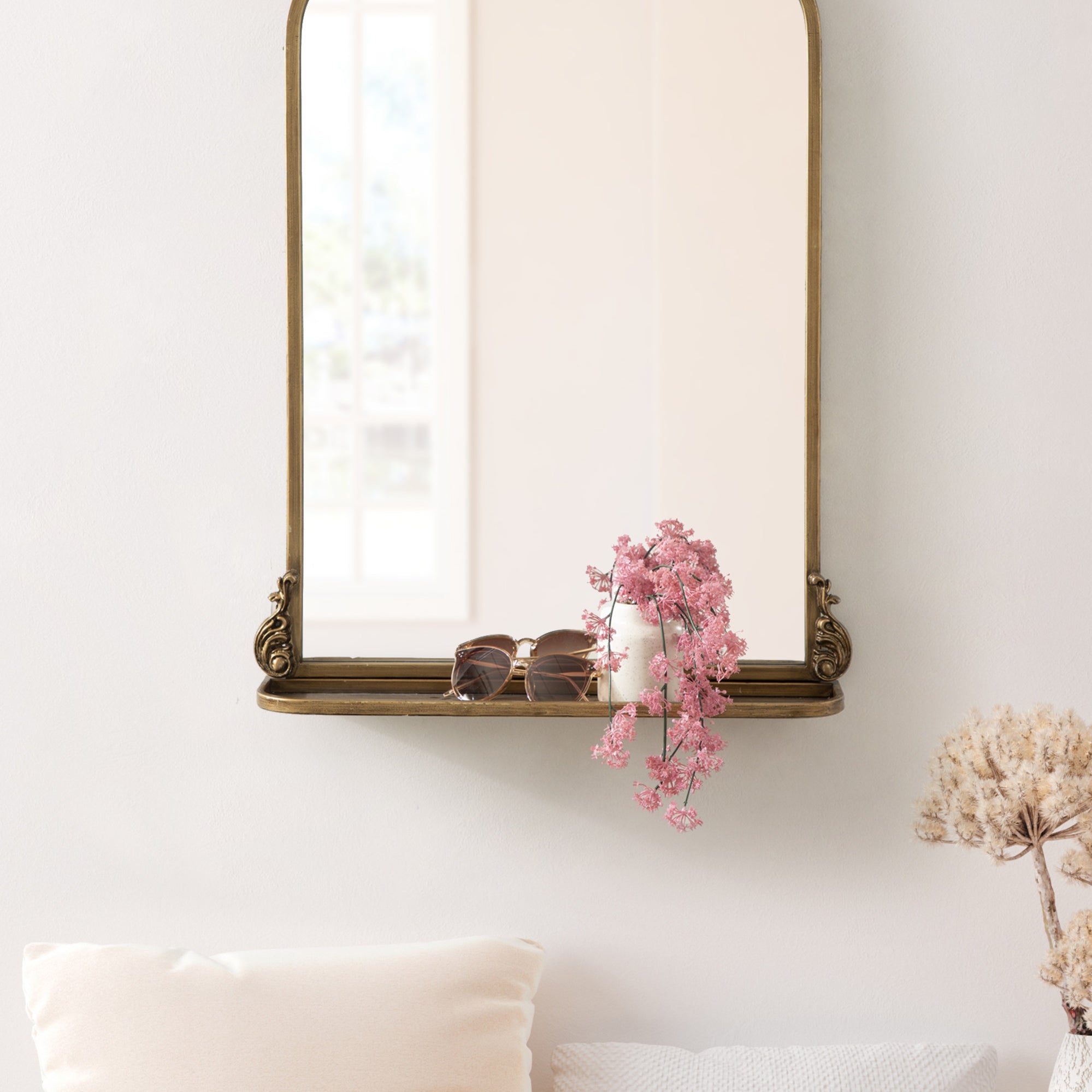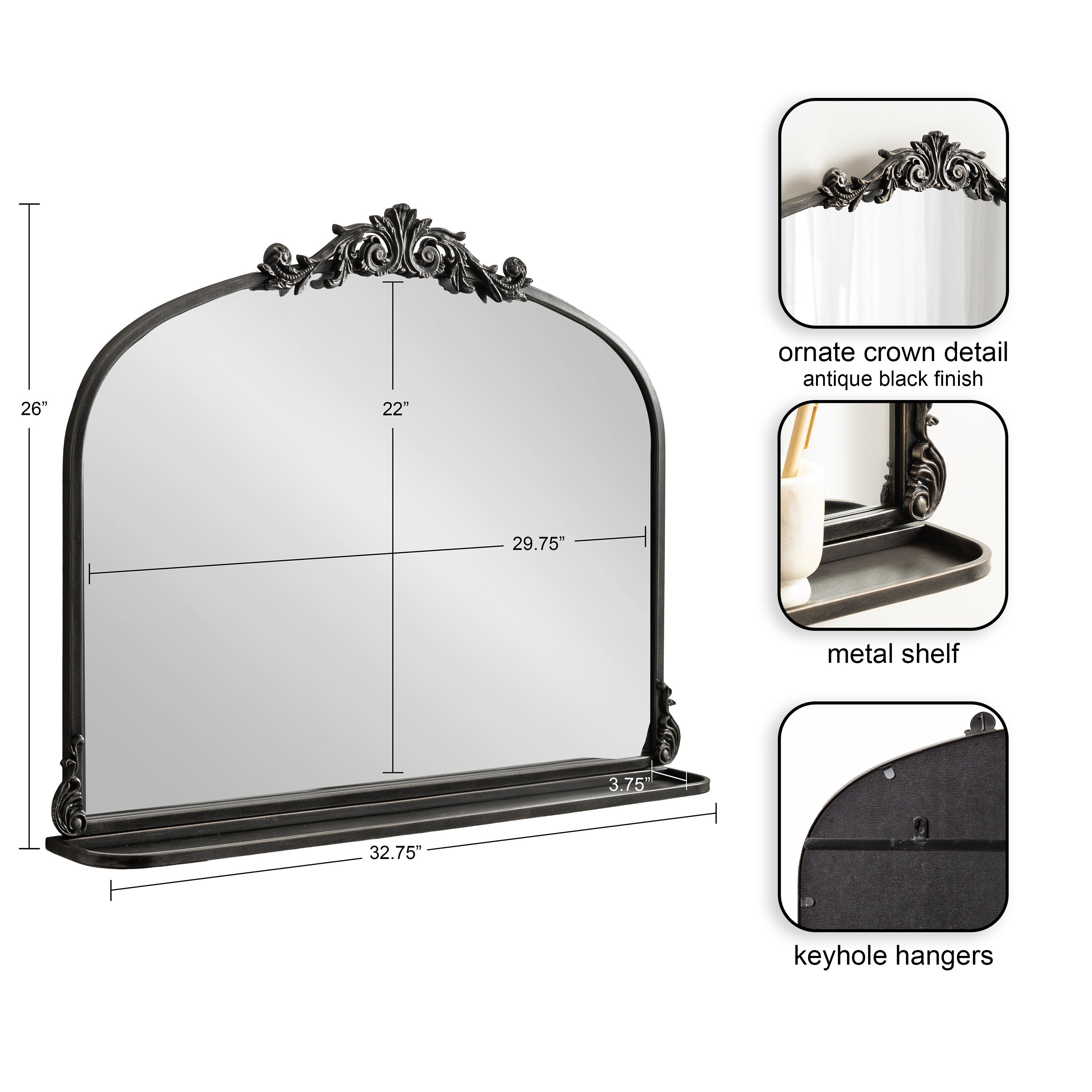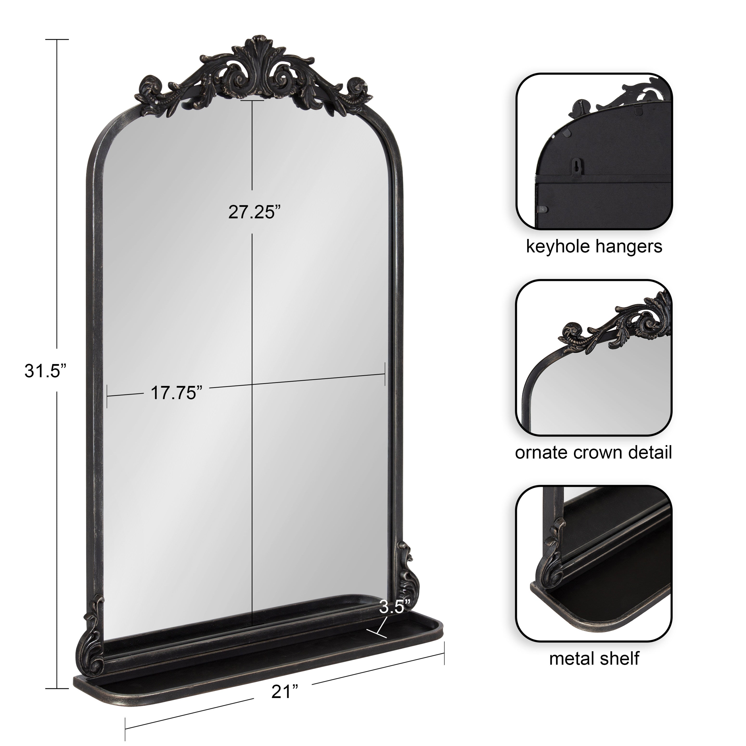 The Arendahl wall mirror brings a brilliant and decadent accent to any traditional home design. This wall mirror features a baroque-inspired design, with a resin garland crown cascading down a wide arched iron frame. The stunning antique finish brings it together as a vintage piece to display anywhere in your home. This version of the Arendahl features a functional shelf to place some small decor accents or necessary household items. Use the fabulous Arendahl wall mirror to bring dimension to your smaller spaces, opening up the area, and illuminating the darker corners. This framed mirror is also easy to hang, with metal keyhole wall hangers discreetly and securely attached to the back. Assembling this arch mirror is simple with a one-step assembly process to attach the shelf to the mirror.