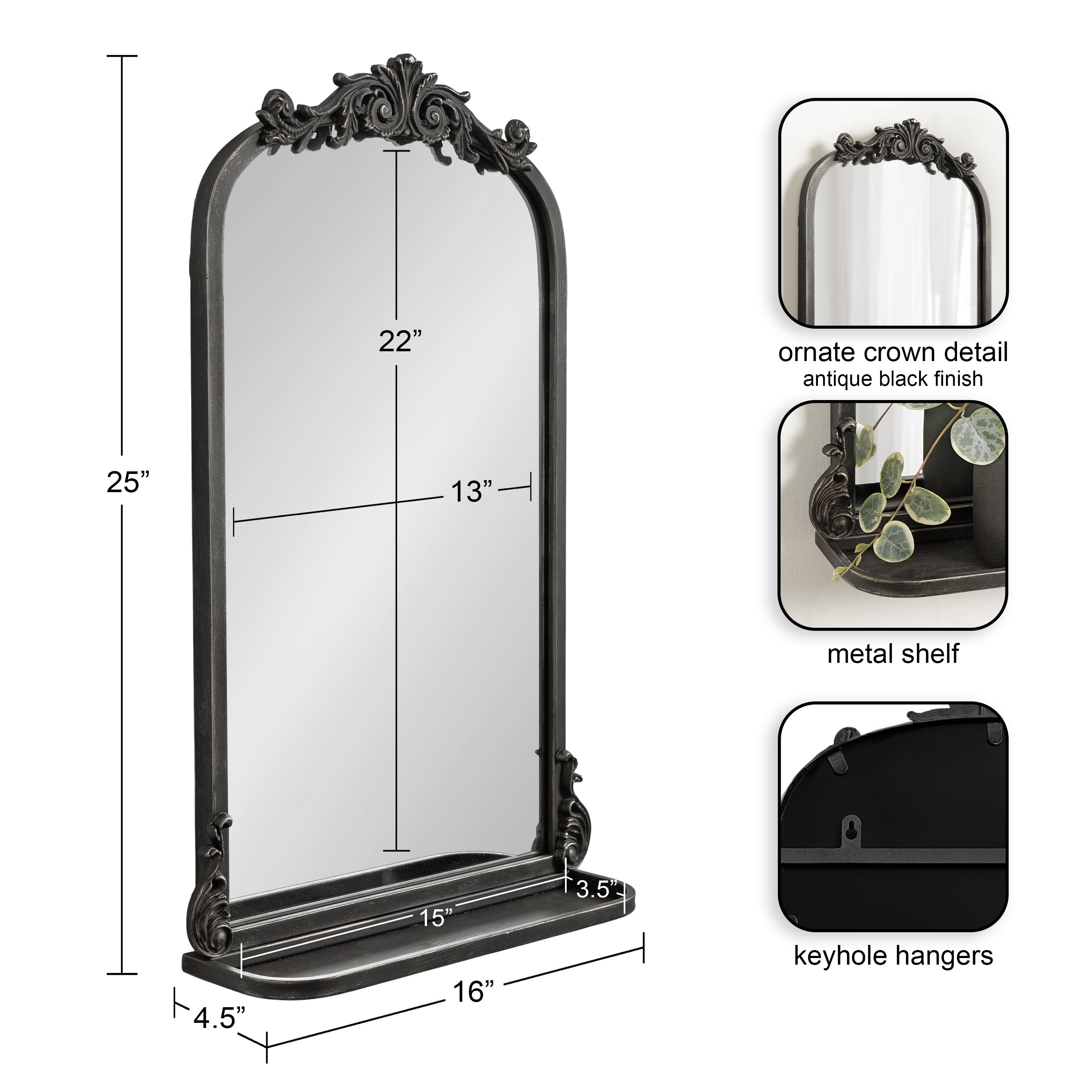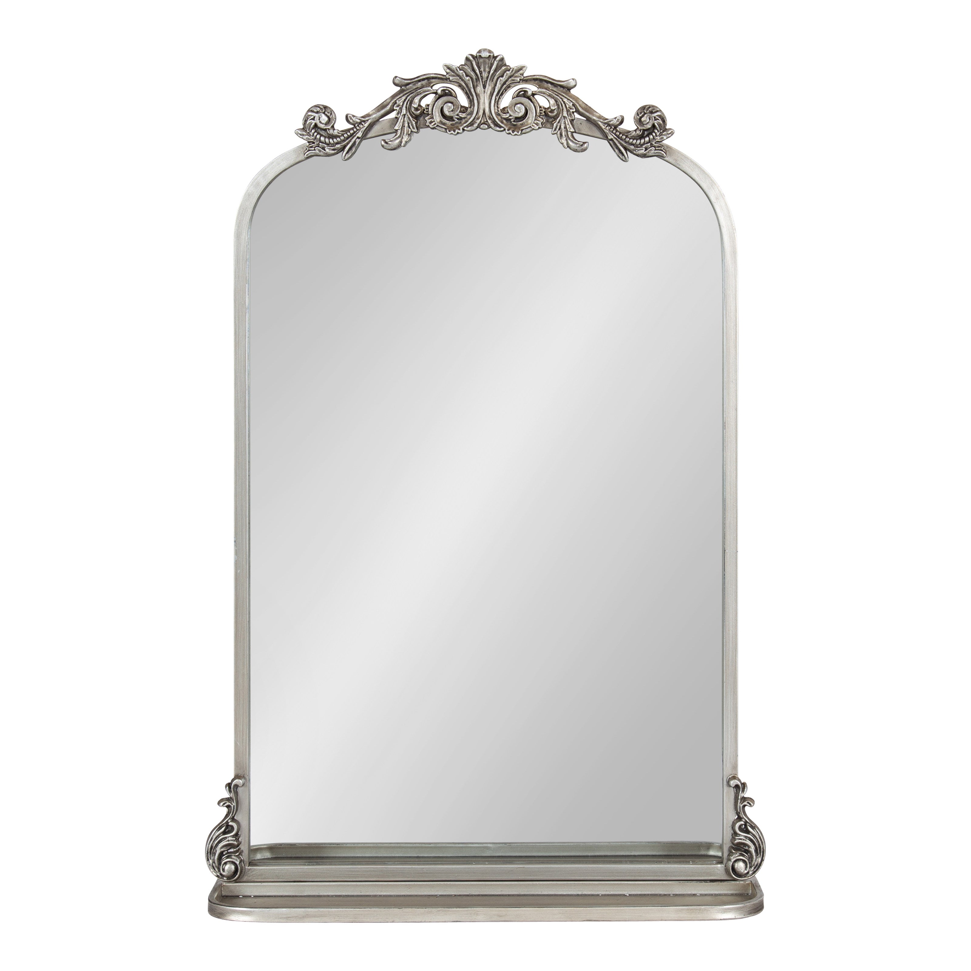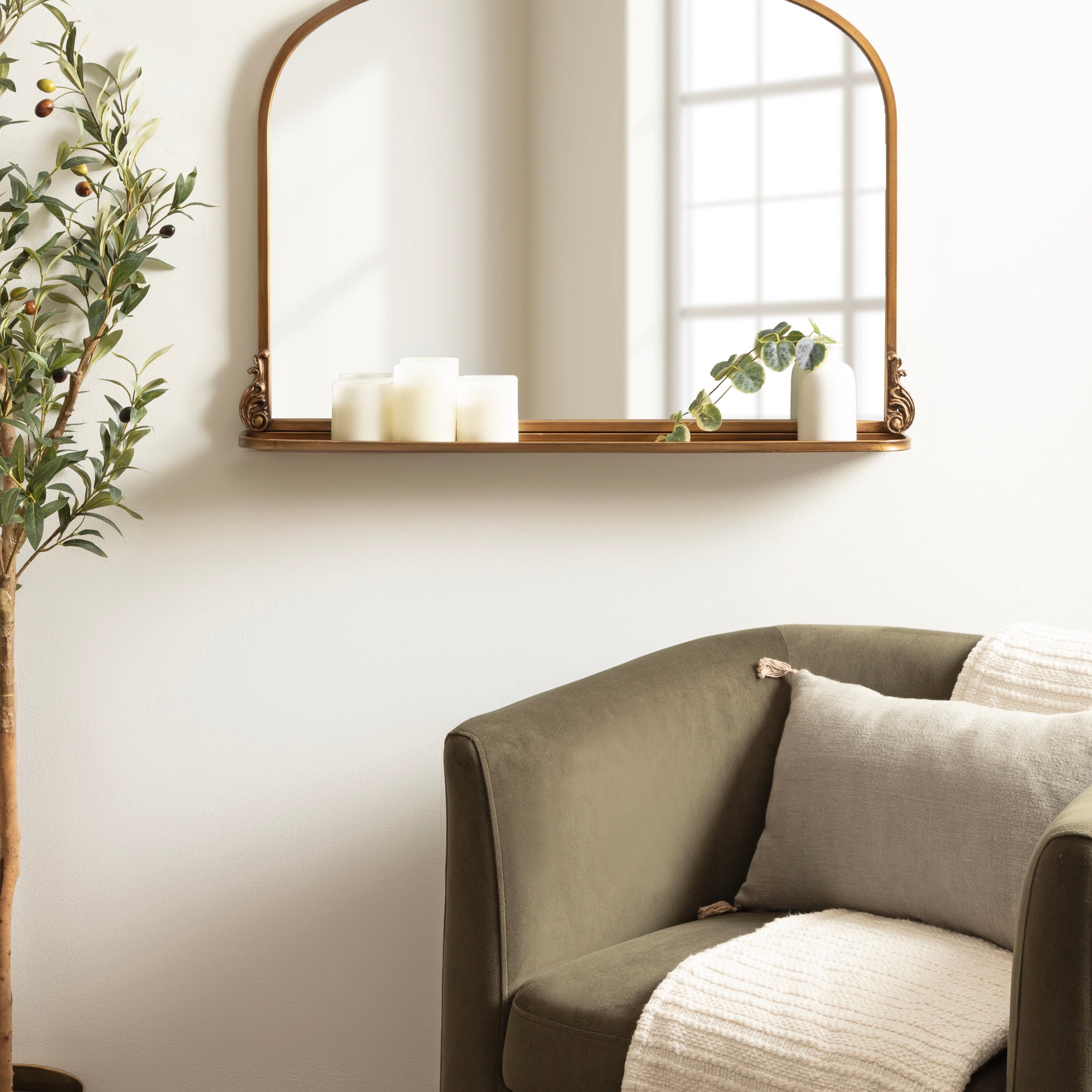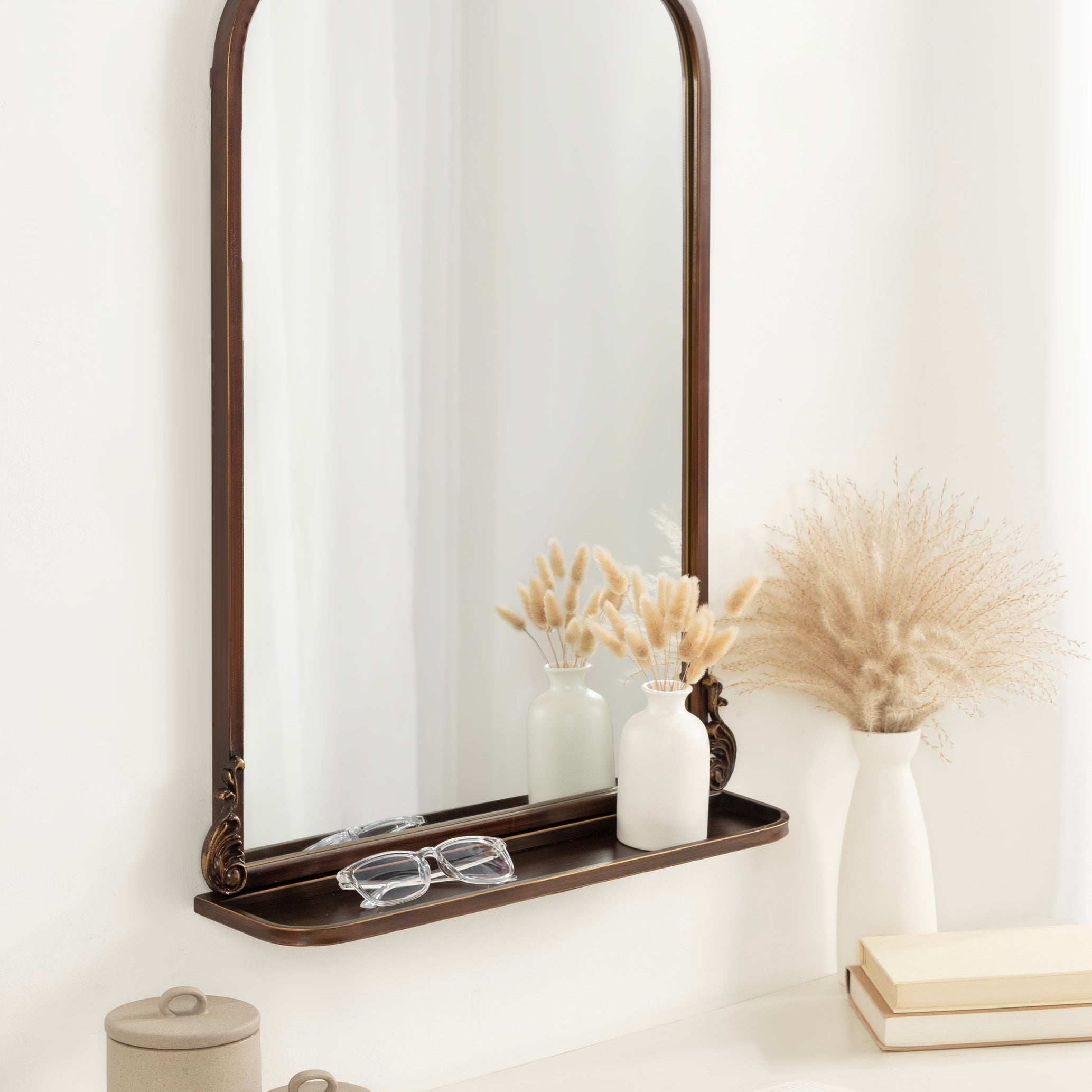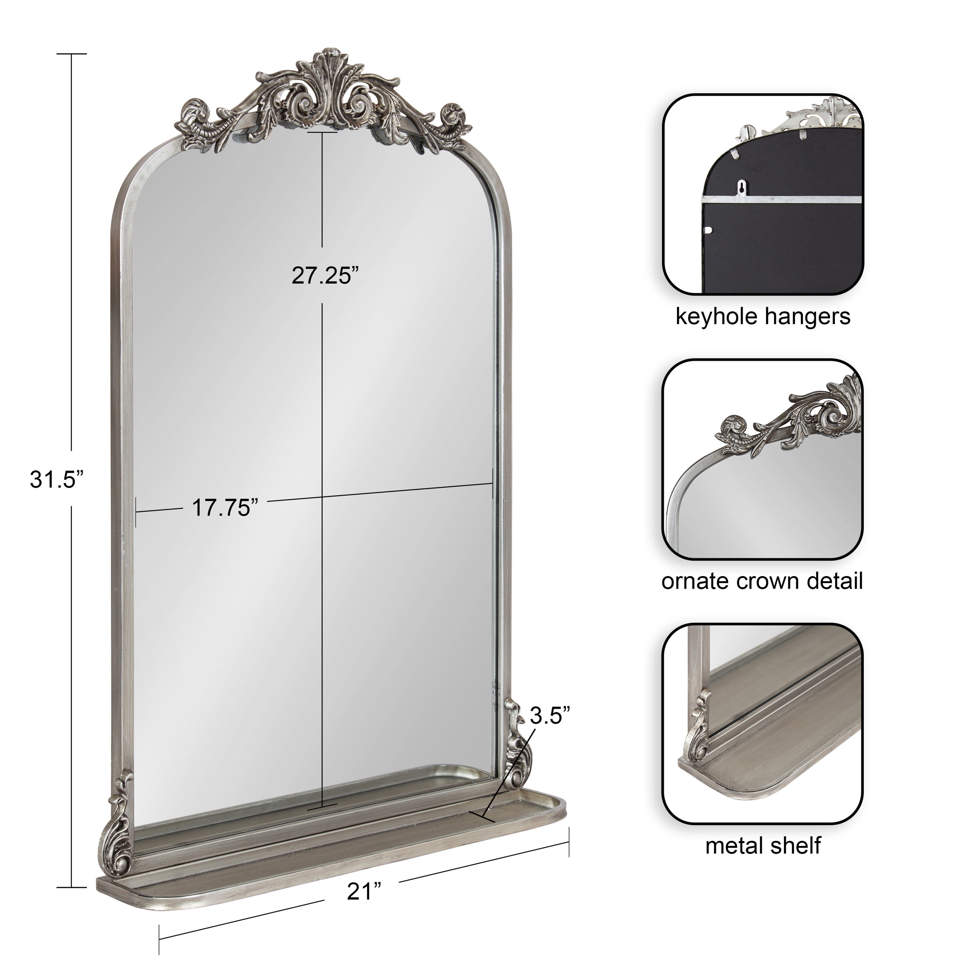 The Arendahl wall mirror brings a brilliant and decadent accent to any traditional home design. This wall mirror features a baroque-inspired design, with a resin garland crown cascading down a wide arched iron frame. The stunning antique finish brings it together as a vintage piece to display anywhere in your home. This version of the Arendahl features a functional shelf to place some small decor accents or necessary household items. Use the fabulous Arendahl wall mirror to bring dimension to your smaller spaces, opening up the area, and illuminating the darker corners. This framed mirror is also easy to hang, with metal keyhole wall hangers discreetly and securely attached to the back. Assembling this arch mirror is simple with a one-step assembly process to attach the shelf to the mirror.