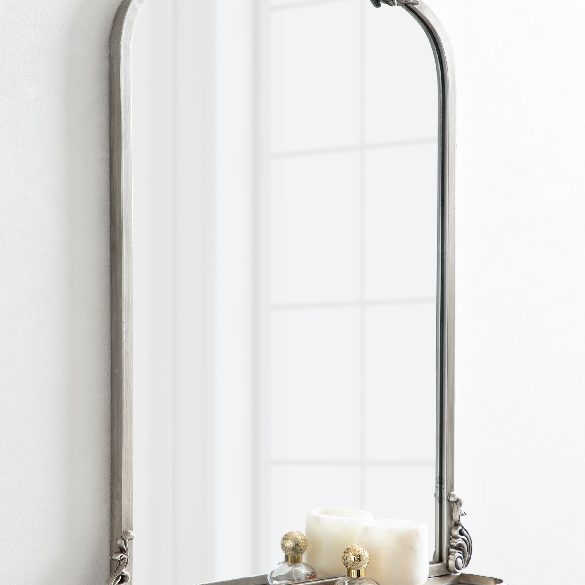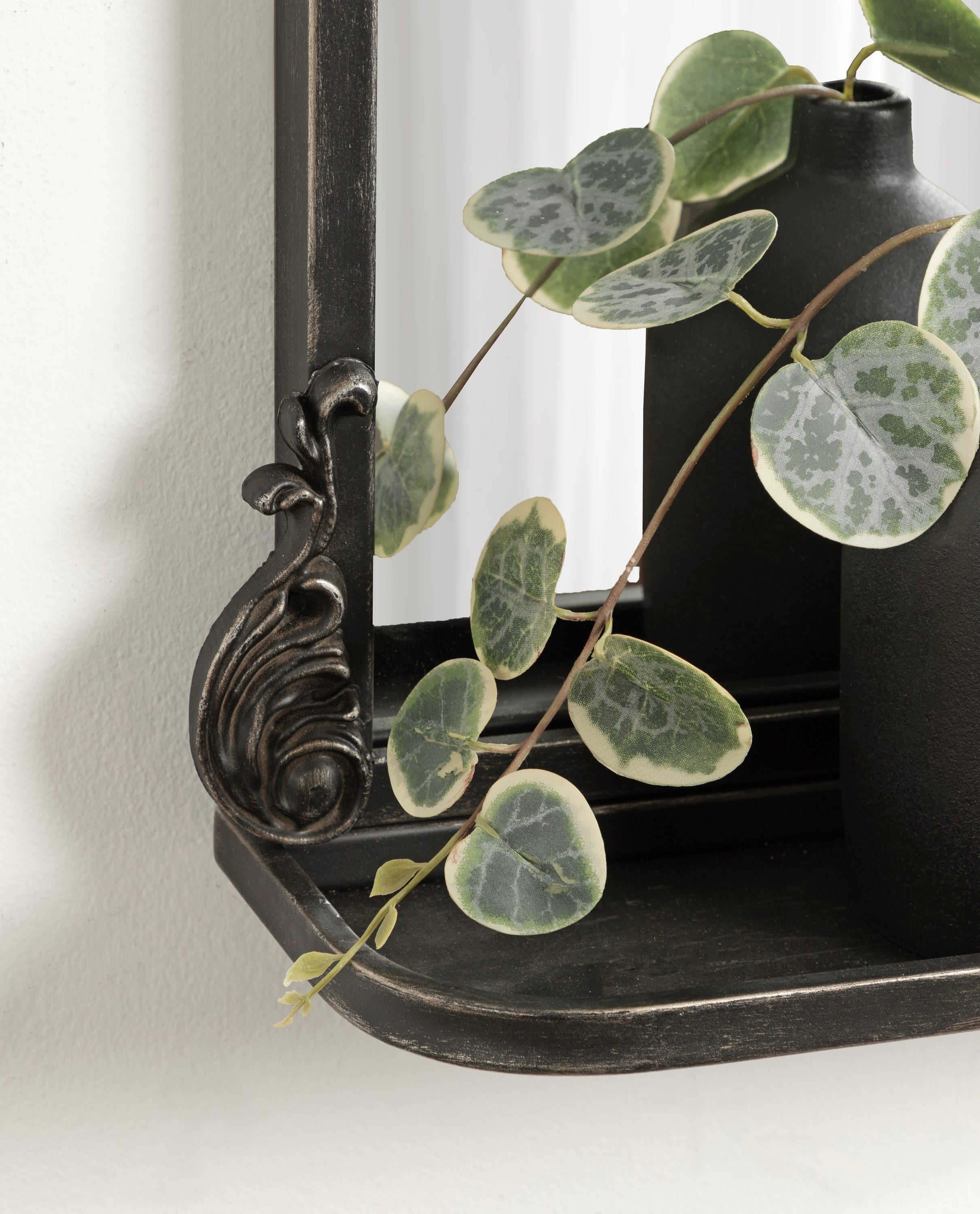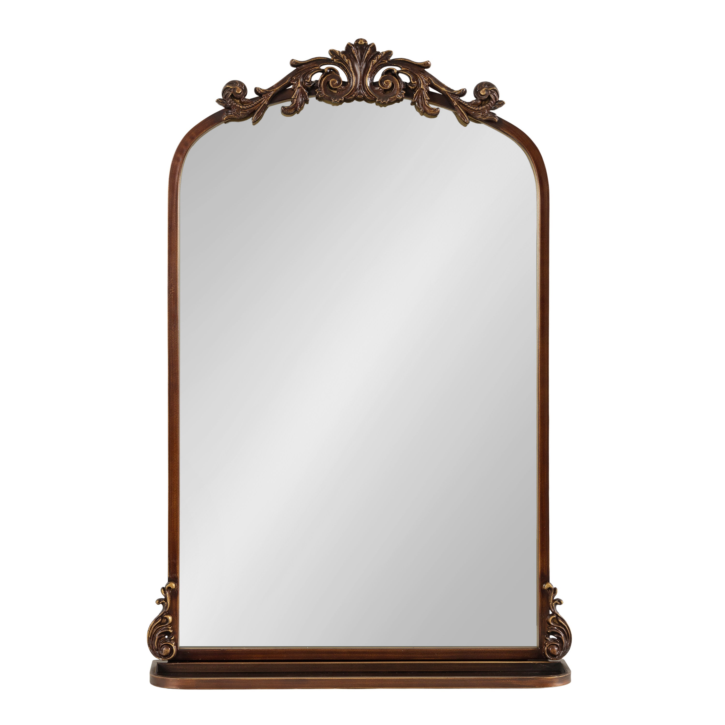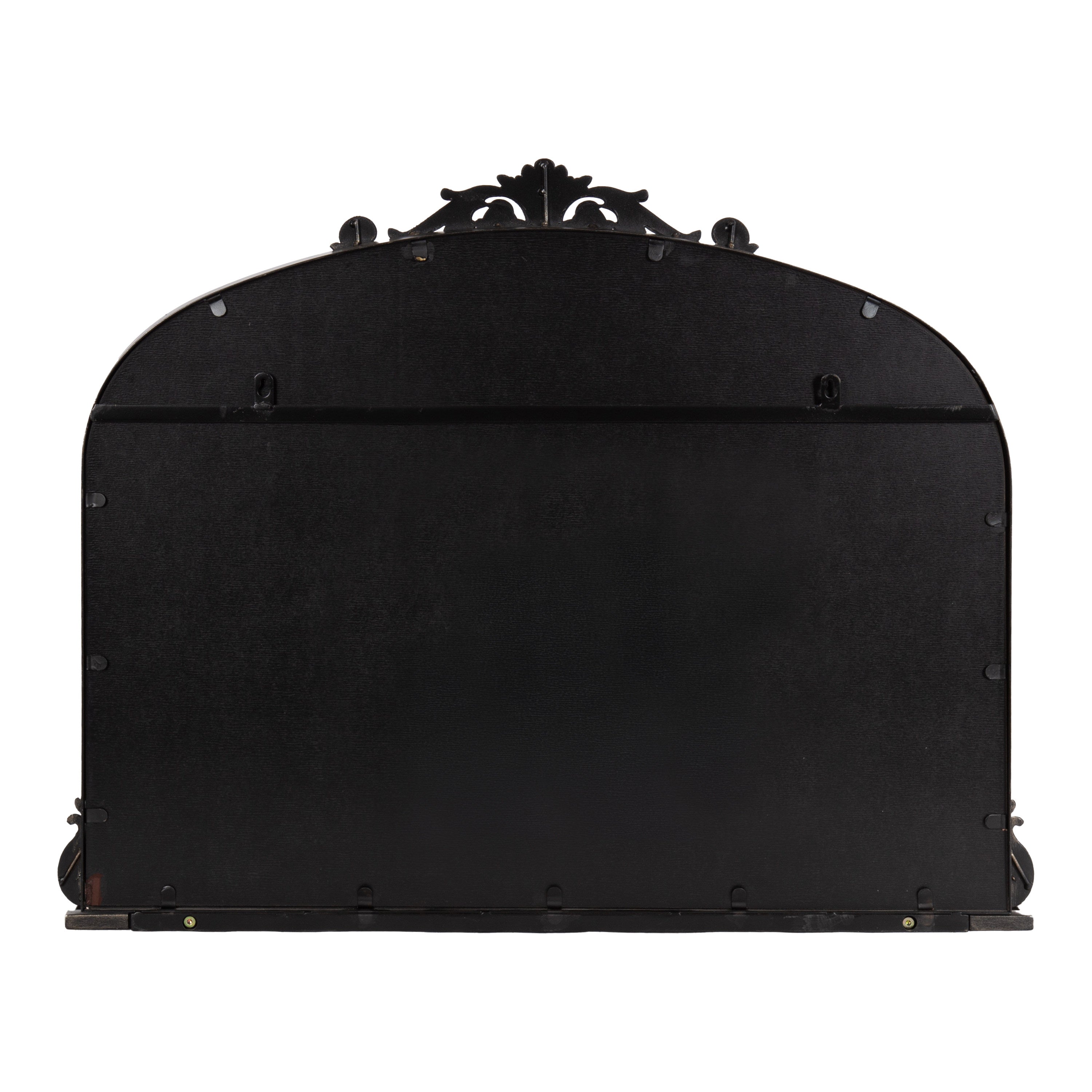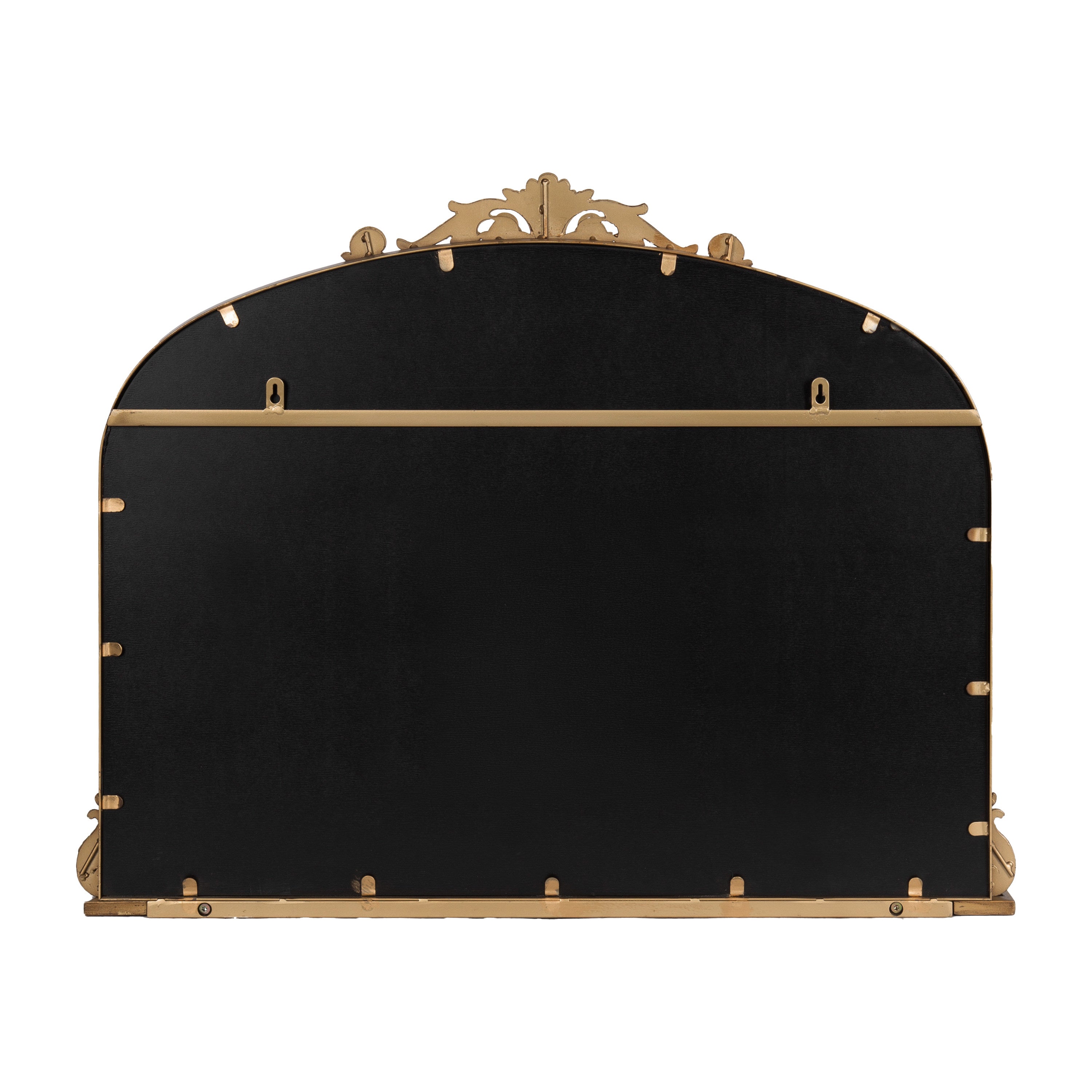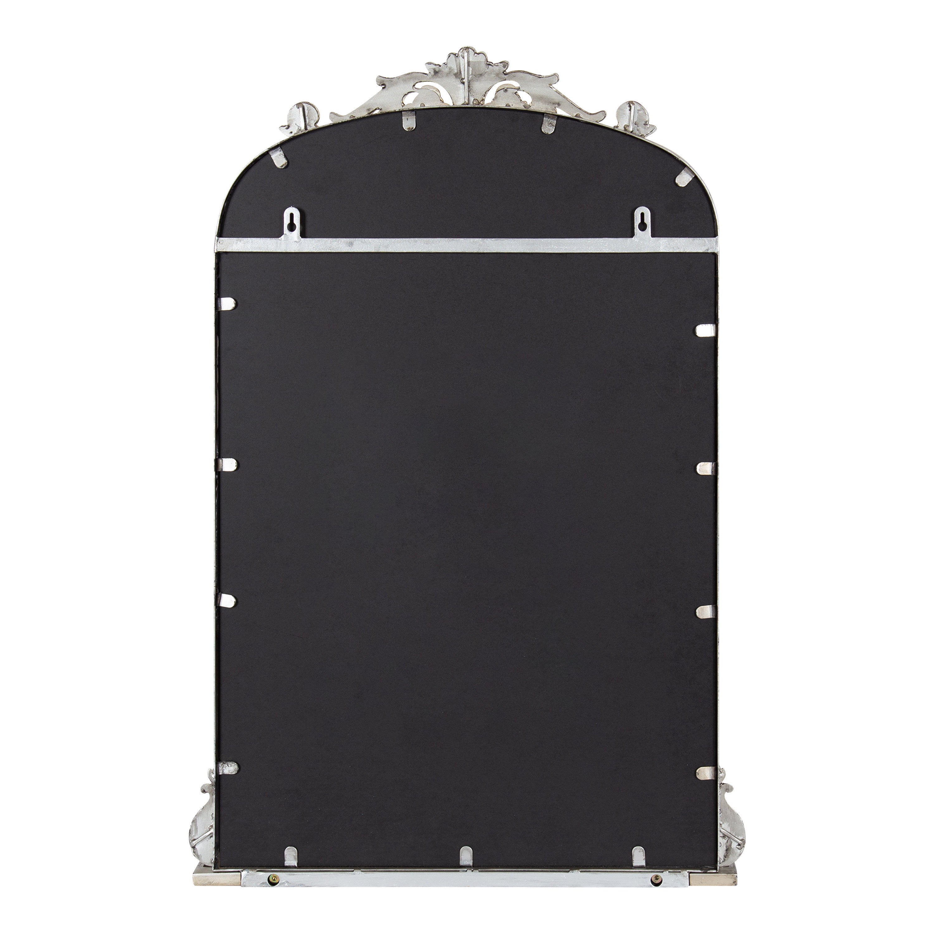 The Arendahl wall mirror brings a brilliant and decadent accent to any traditional home design. This wall mirror features a baroque-inspired design, with a resin garland crown cascading down a wide arched iron frame. The stunning antique finish brings it together as a vintage piece to display anywhere in your home. This version of the Arendahl features a functional shelf to place some small decor accents or necessary household items. Use the fabulous Arendahl wall mirror to bring dimension to your smaller spaces, opening up the area, and illuminating the darker corners. This framed mirror is also easy to hang, with metal keyhole wall hangers discreetly and securely attached to the back. Assembling this arch mirror is simple with a one-step assembly process to attach the shelf to the mirror.
