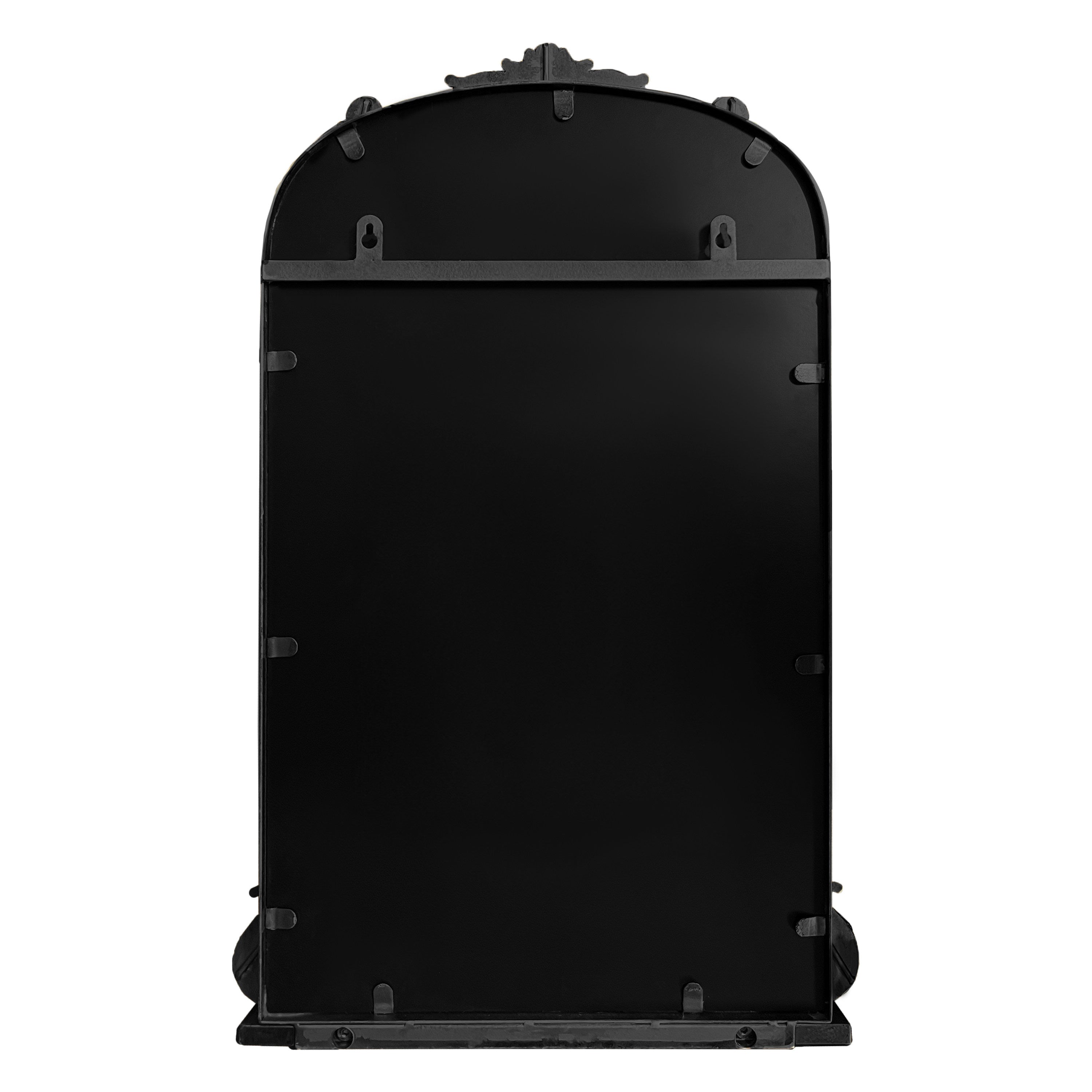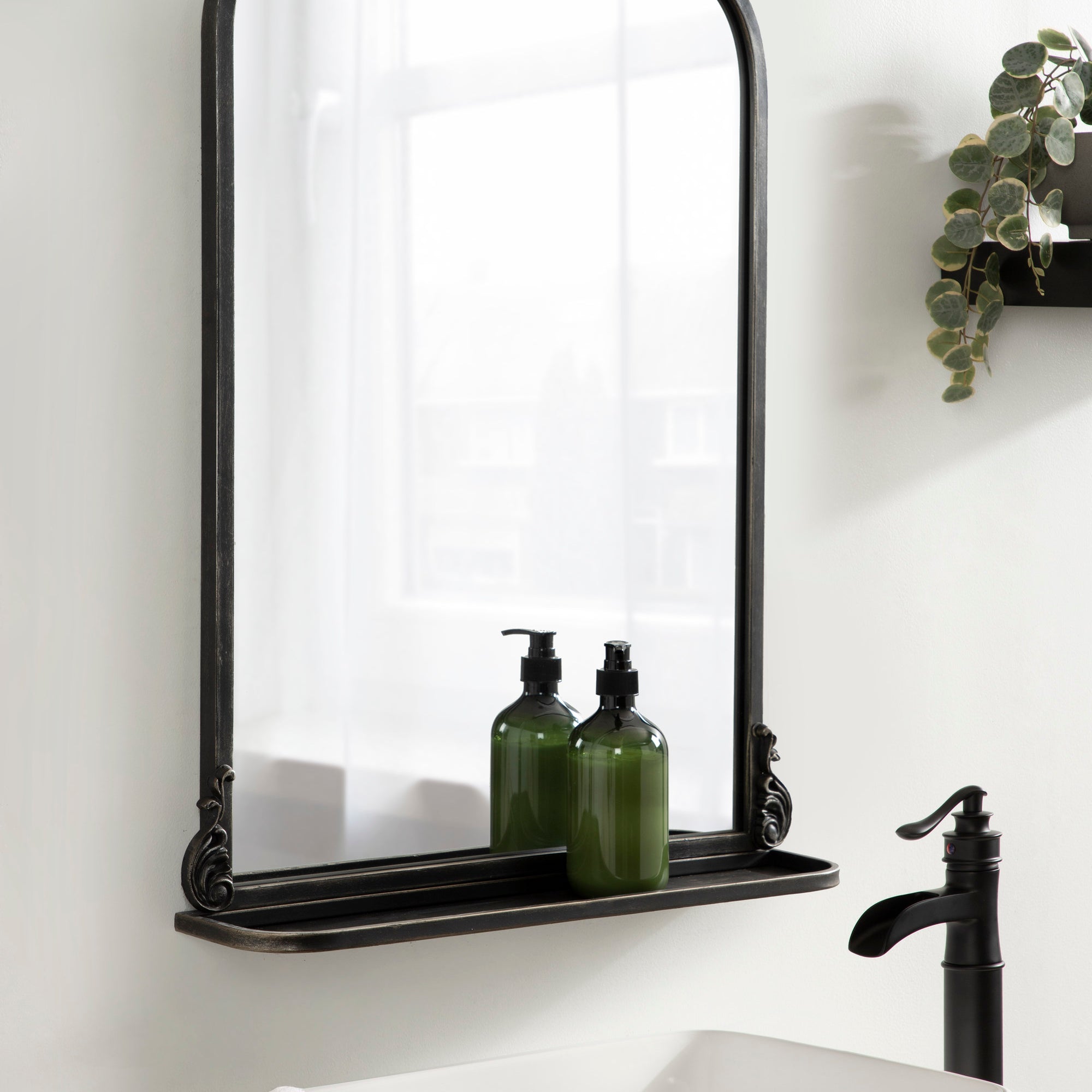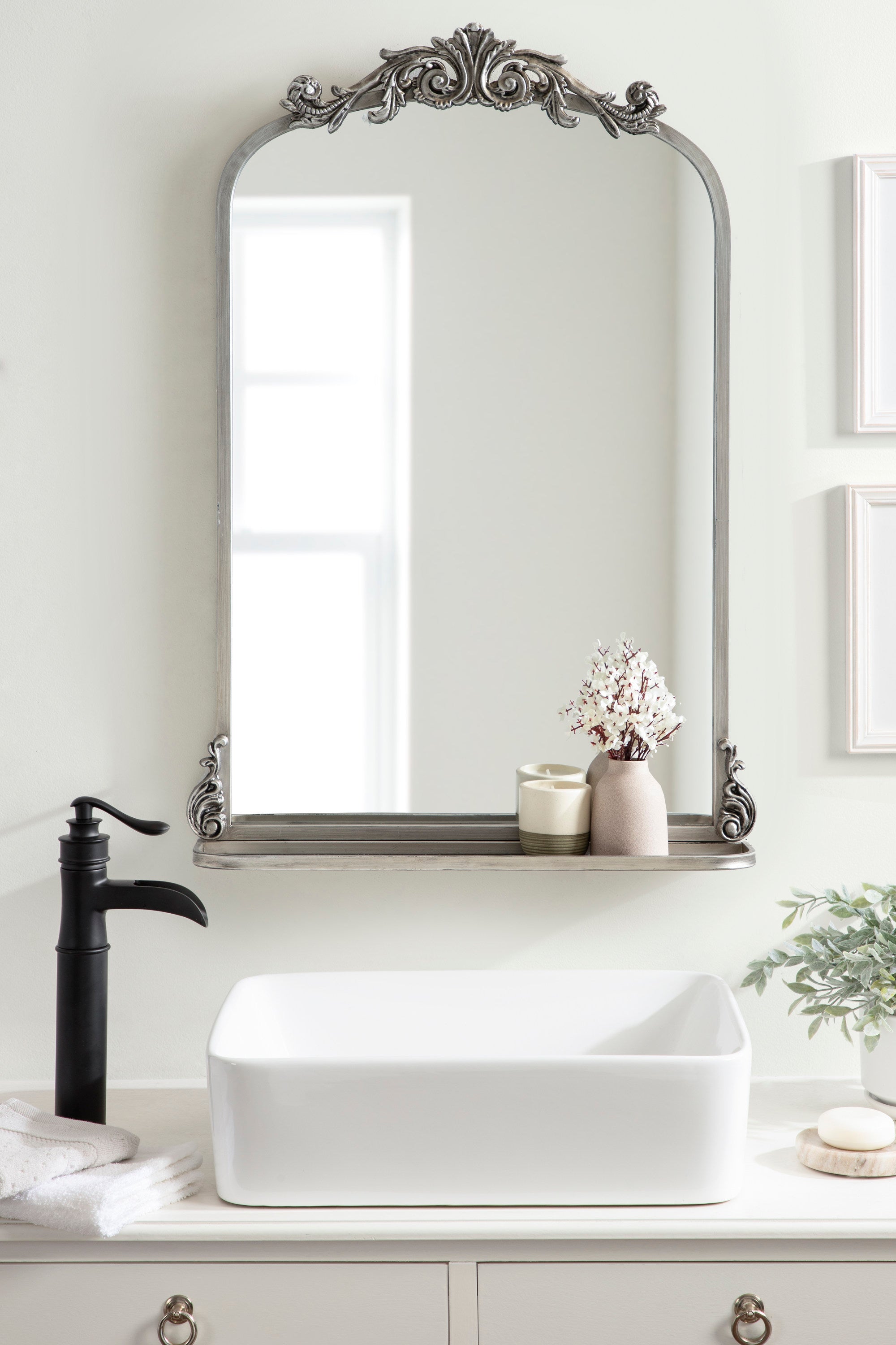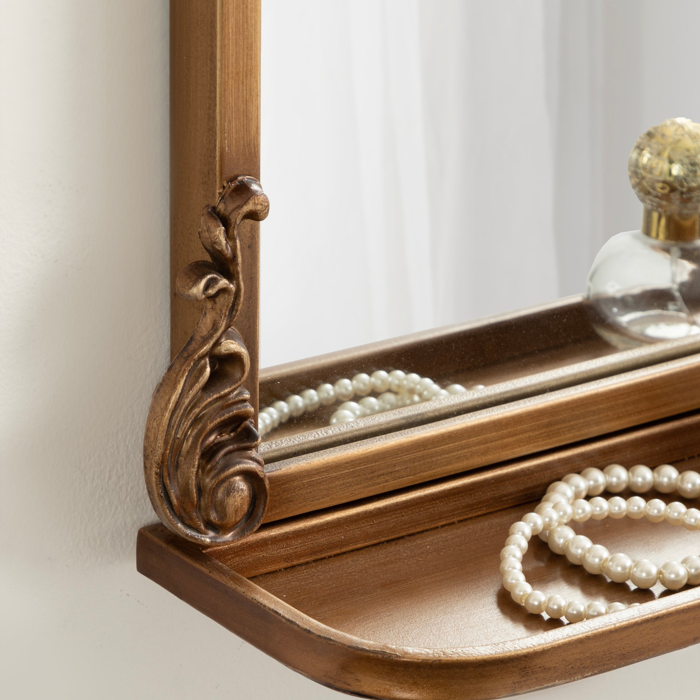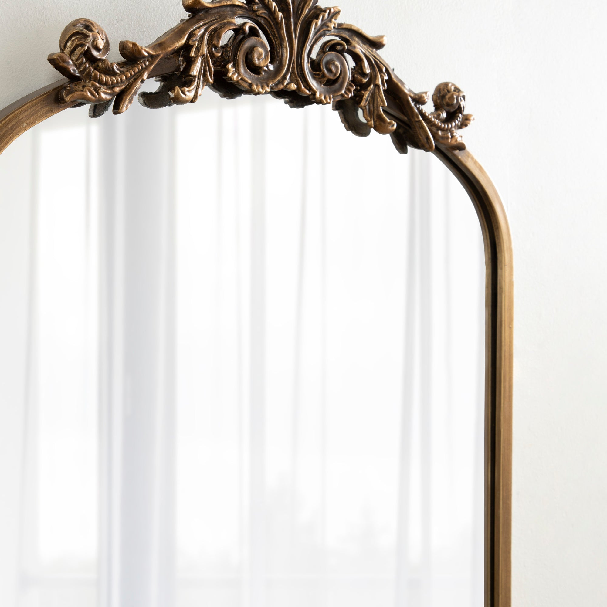The Arendahl wall mirror brings a brilliant and decadent accent to any traditional home design. This wall mirror features a baroque-inspired design, with a resin garland crown cascading down a wide arched iron frame. The stunning antique finish brings it together as a vintage piece to display anywhere in your home. This version of the Arendahl features a functional shelf to place some small decor accents or necessary household items. Use the fabulous Arendahl wall mirror to bring dimension to your smaller spaces, opening up the area, and illuminating the darker corners. This framed mirror is also easy to hang, with metal keyhole wall hangers discreetly and securely attached to the back. Assembling this arch mirror is simple with a one-step assembly process to attach the shelf to the mirror.
