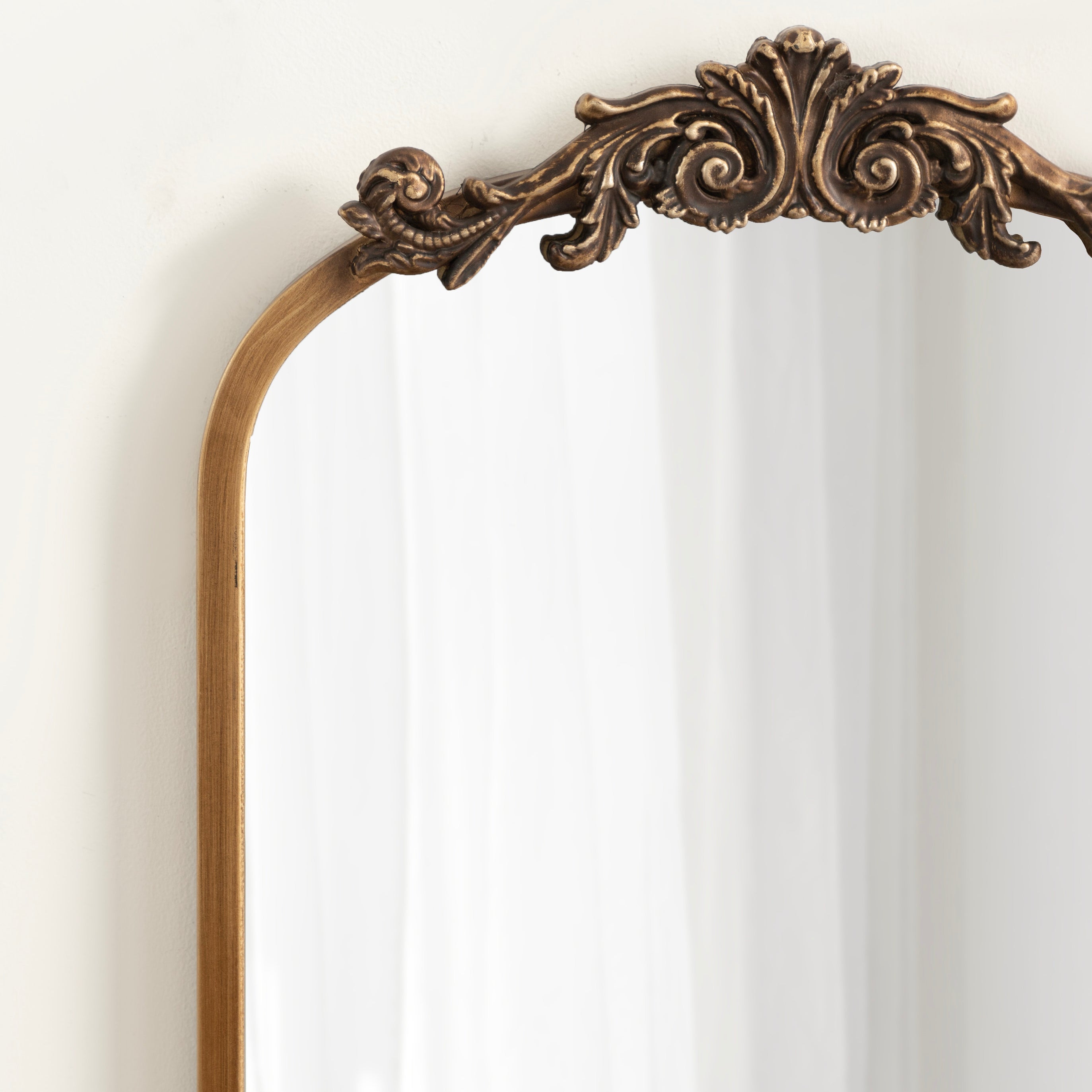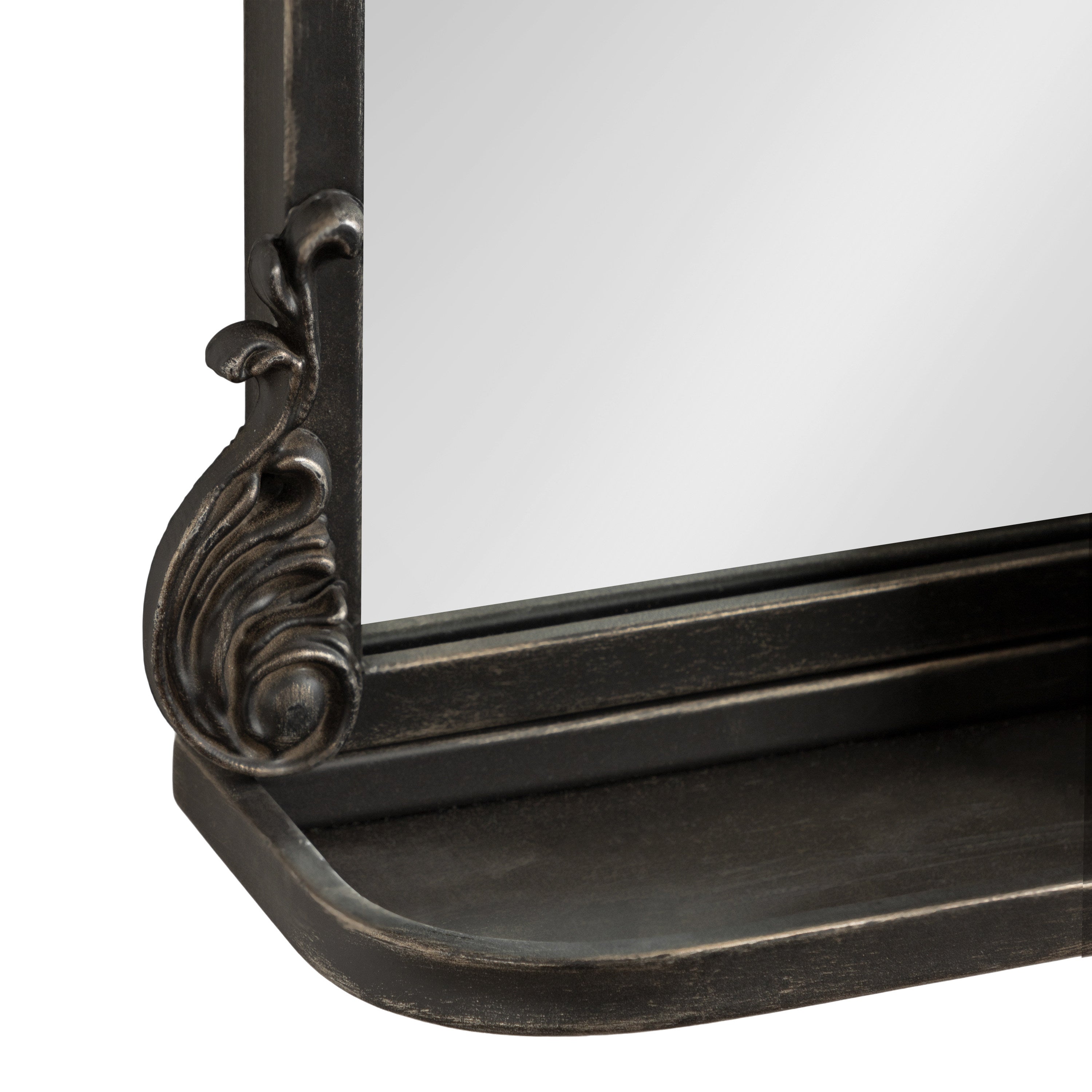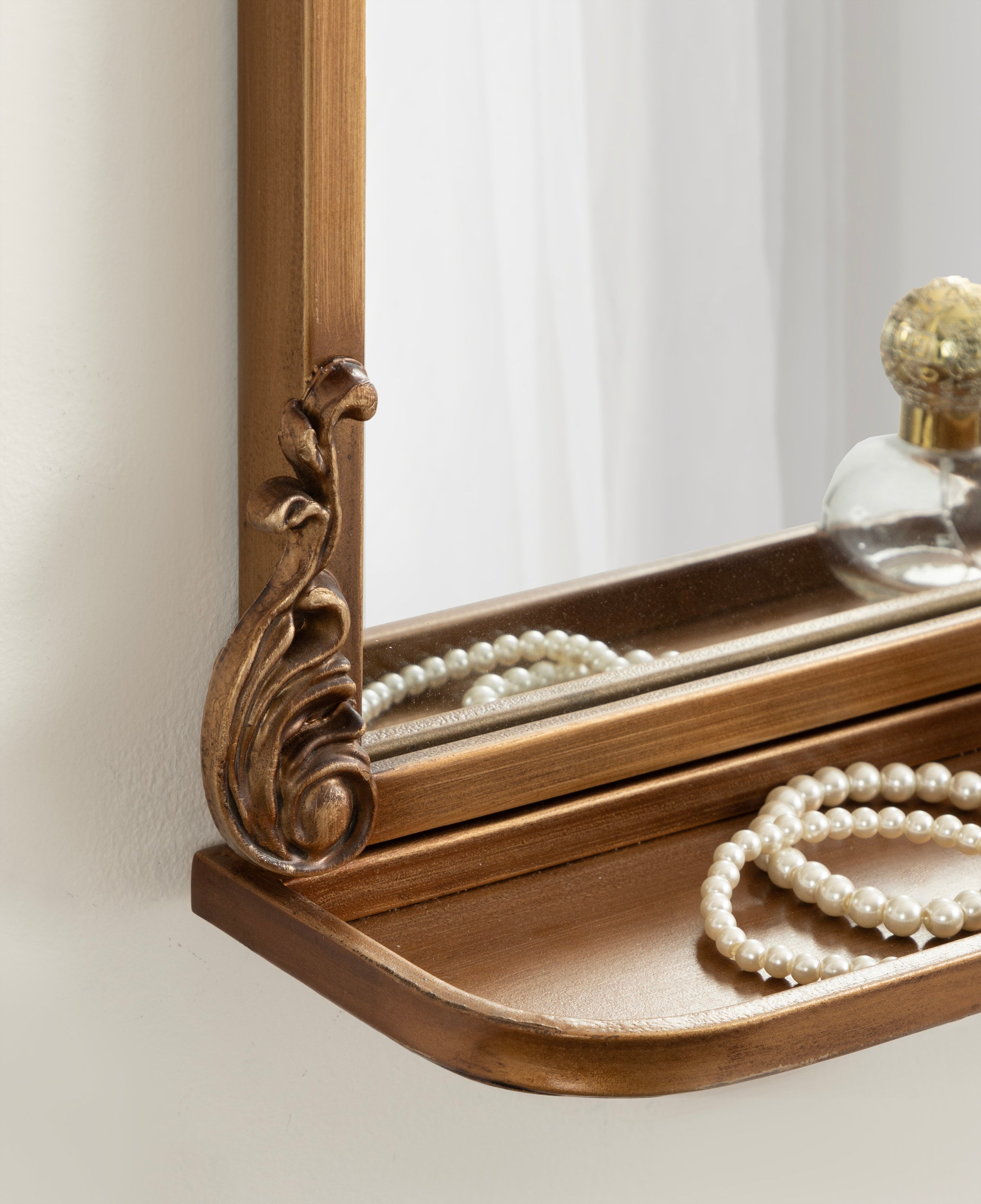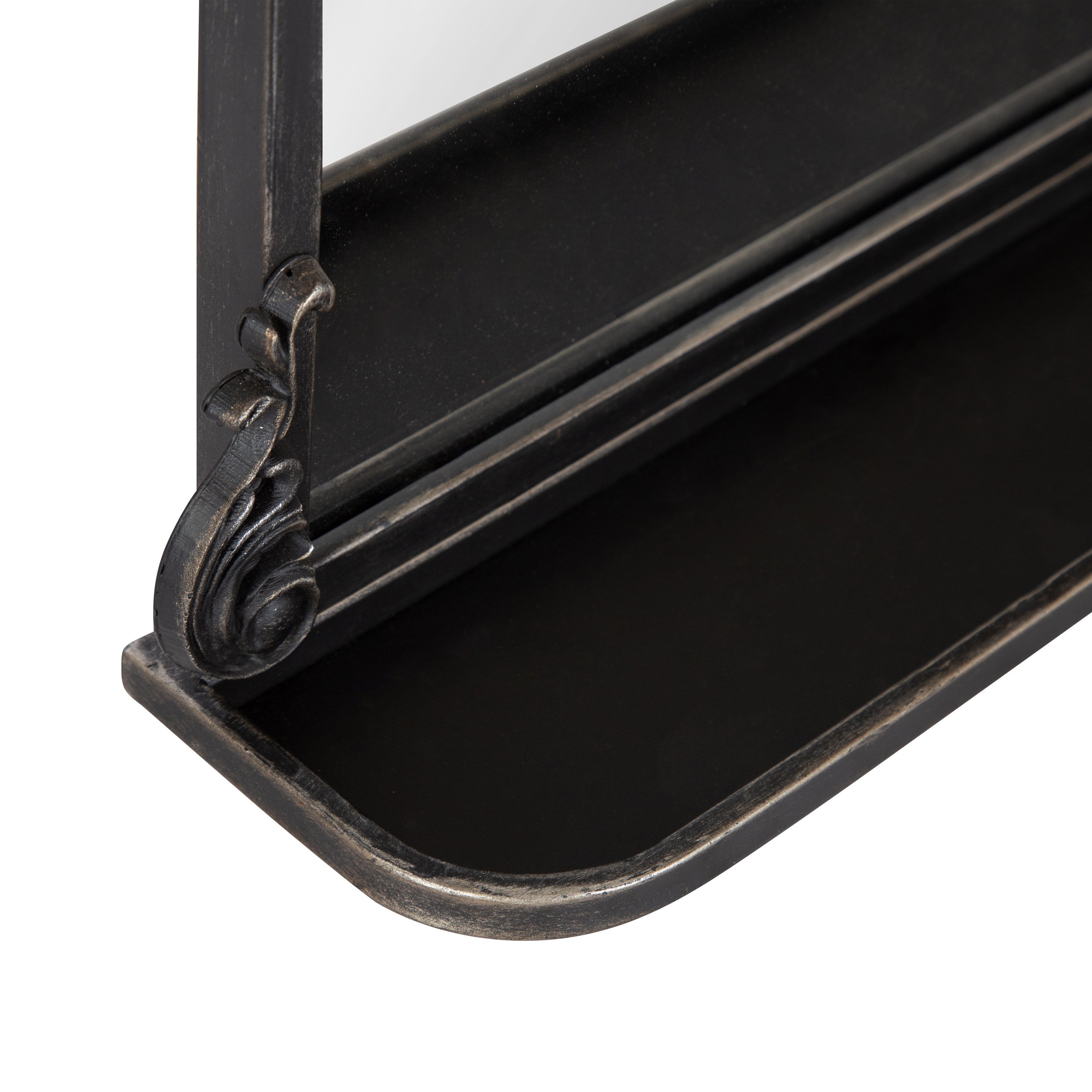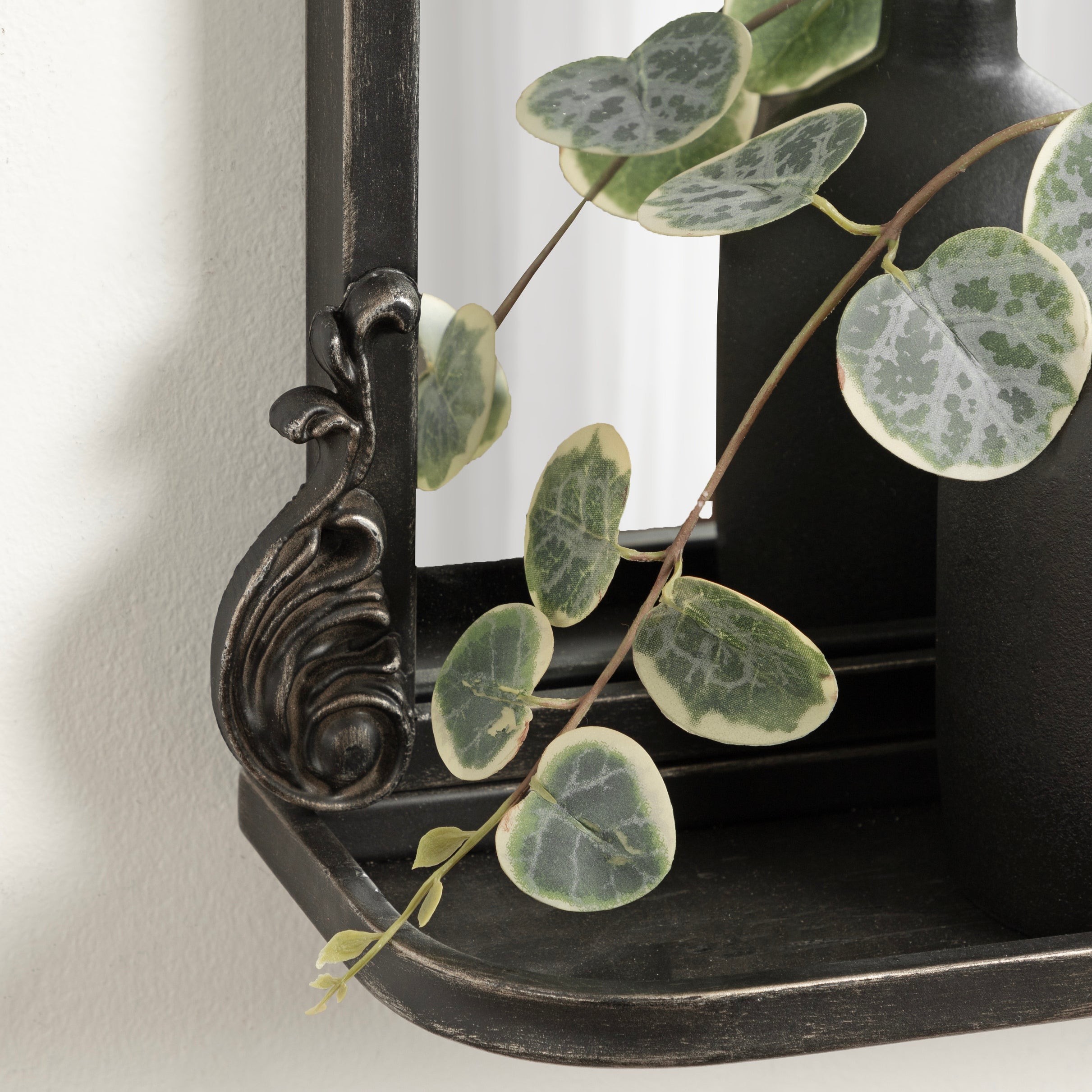 The Arendahl wall mirror brings a brilliant and decadent accent to any traditional home design. This wall mirror features a baroque-inspired design, with a resin garland crown cascading down a wide arched iron frame. The stunning antique finish brings it together as a vintage piece to display anywhere in your home. This version of the Arendahl features a functional shelf to place some small decor accents or necessary household items. Use the fabulous Arendahl wall mirror to bring dimension to your smaller spaces, opening up the area, and illuminating the darker corners. This framed mirror is also easy to hang, with metal keyhole wall hangers discreetly and securely attached to the back. Assembling this arch mirror is simple with a one-step assembly process to attach the shelf to the mirror.