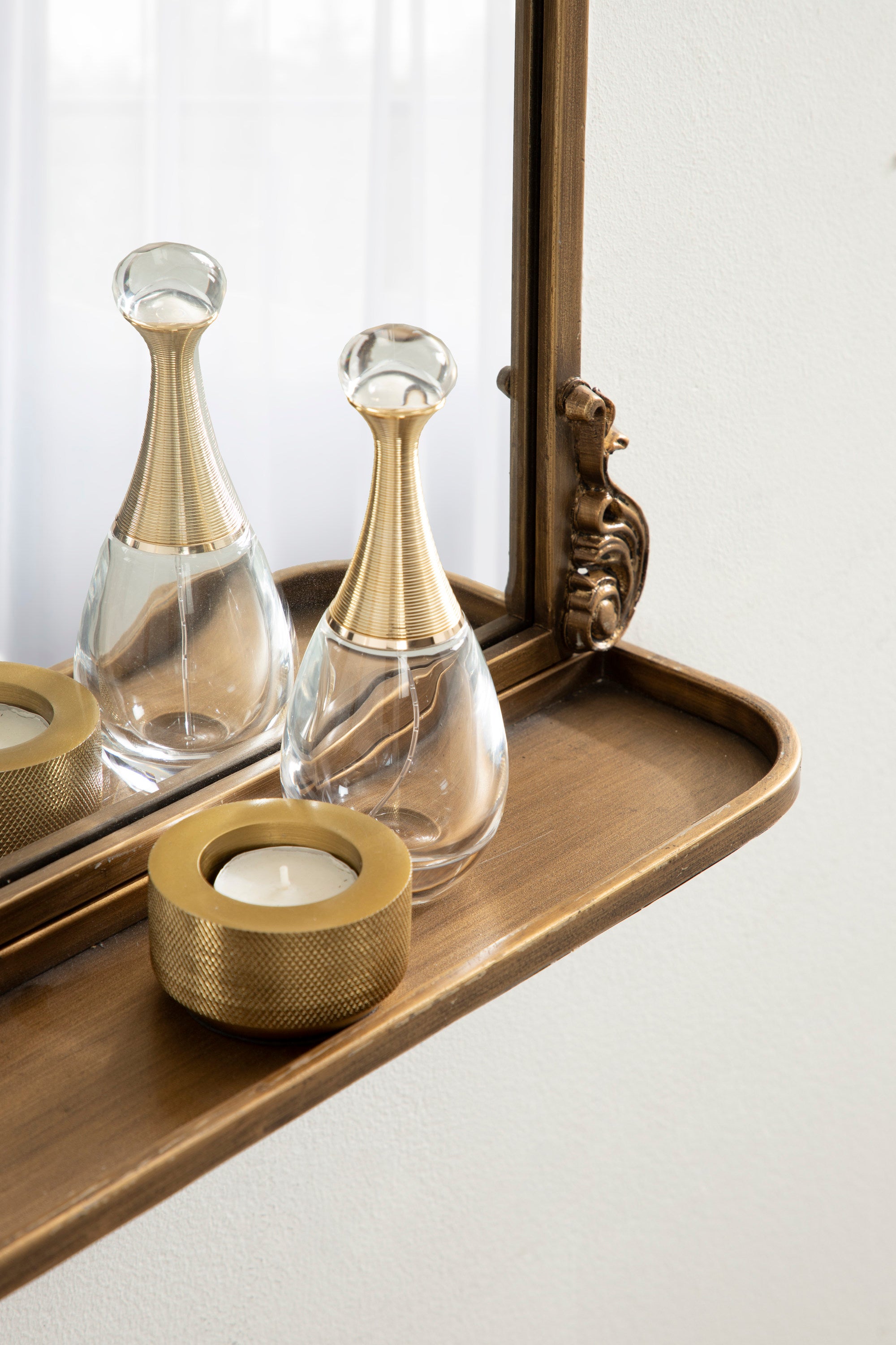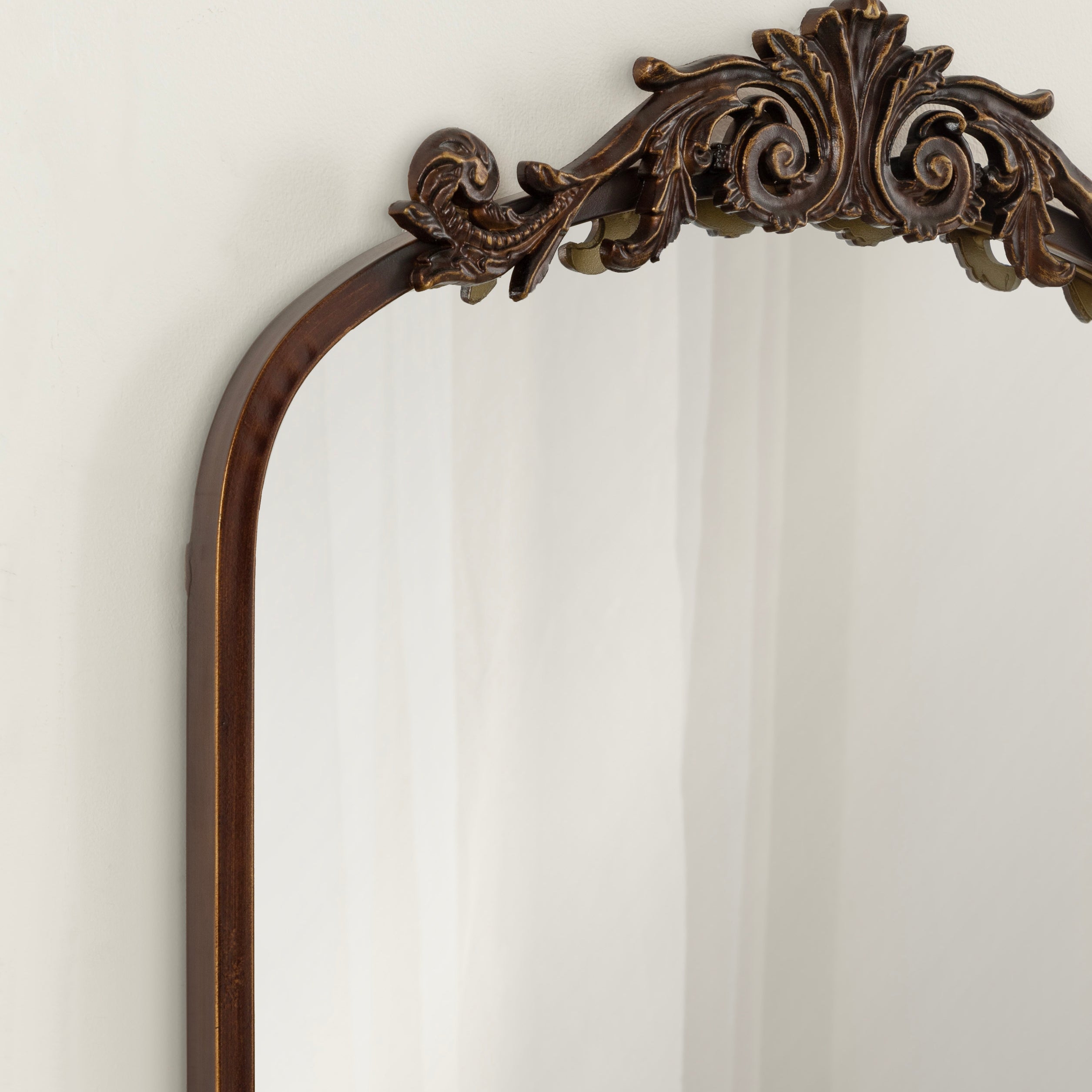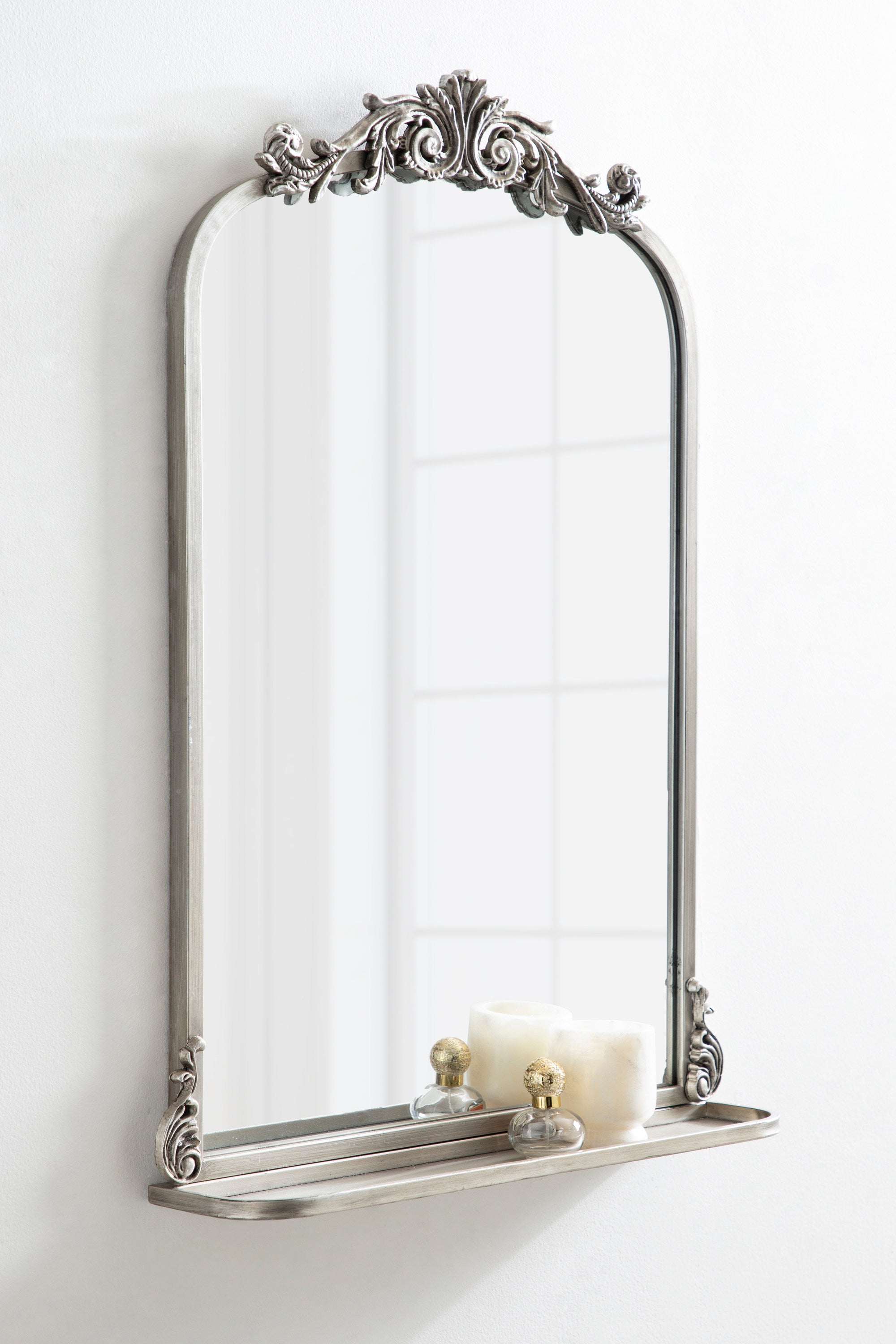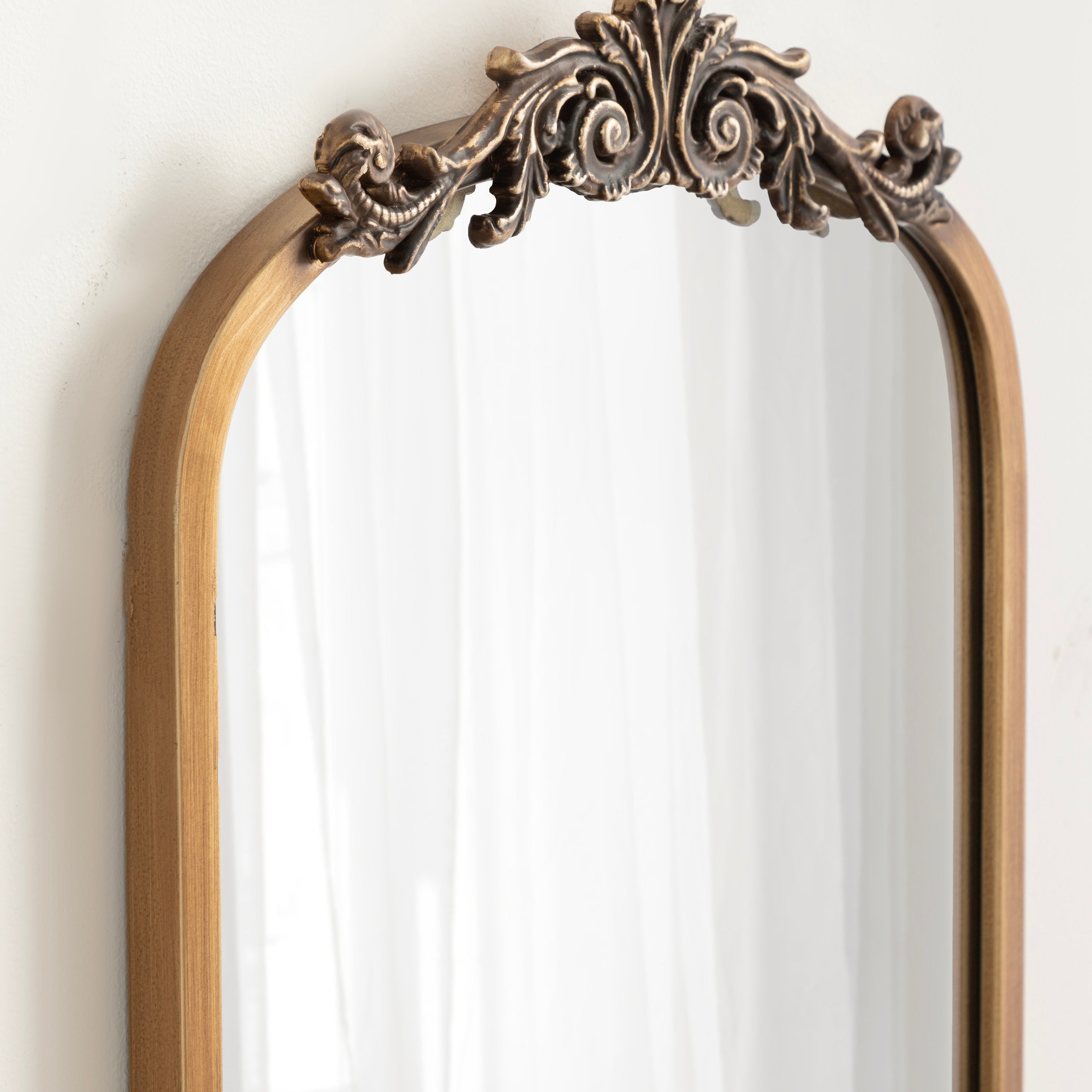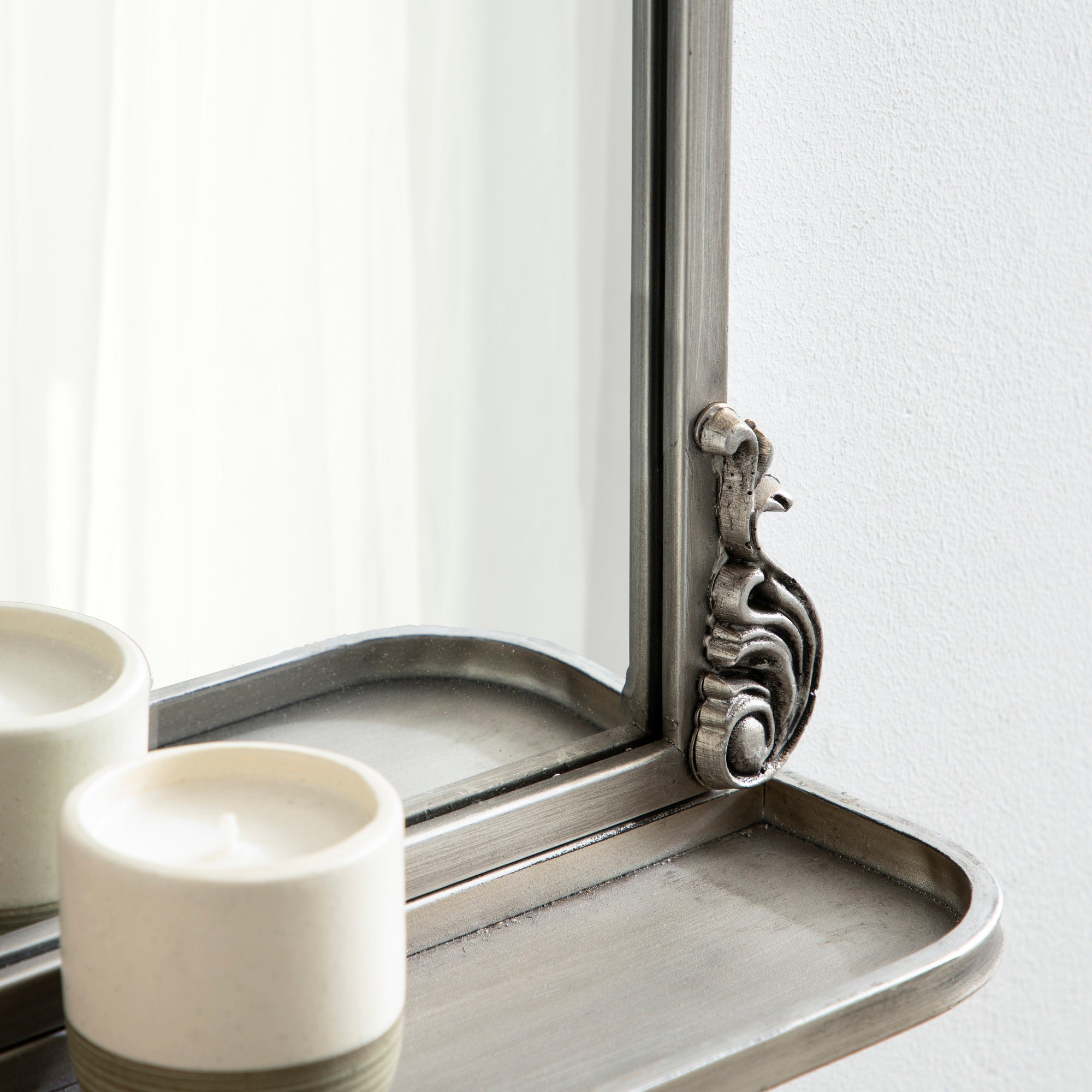 The Arendahl wall mirror brings a brilliant and decadent accent to any traditional home design. This wall mirror features a baroque-inspired design, with a resin garland crown cascading down a wide arched iron frame. The stunning antique finish brings it together as a vintage piece to display anywhere in your home. This version of the Arendahl features a functional shelf to place some small decor accents or necessary household items. Use the fabulous Arendahl wall mirror to bring dimension to your smaller spaces, opening up the area, and illuminating the darker corners. This framed mirror is also easy to hang, with metal keyhole wall hangers discreetly and securely attached to the back. Assembling this arch mirror is simple with a one-step assembly process to attach the shelf to the mirror.