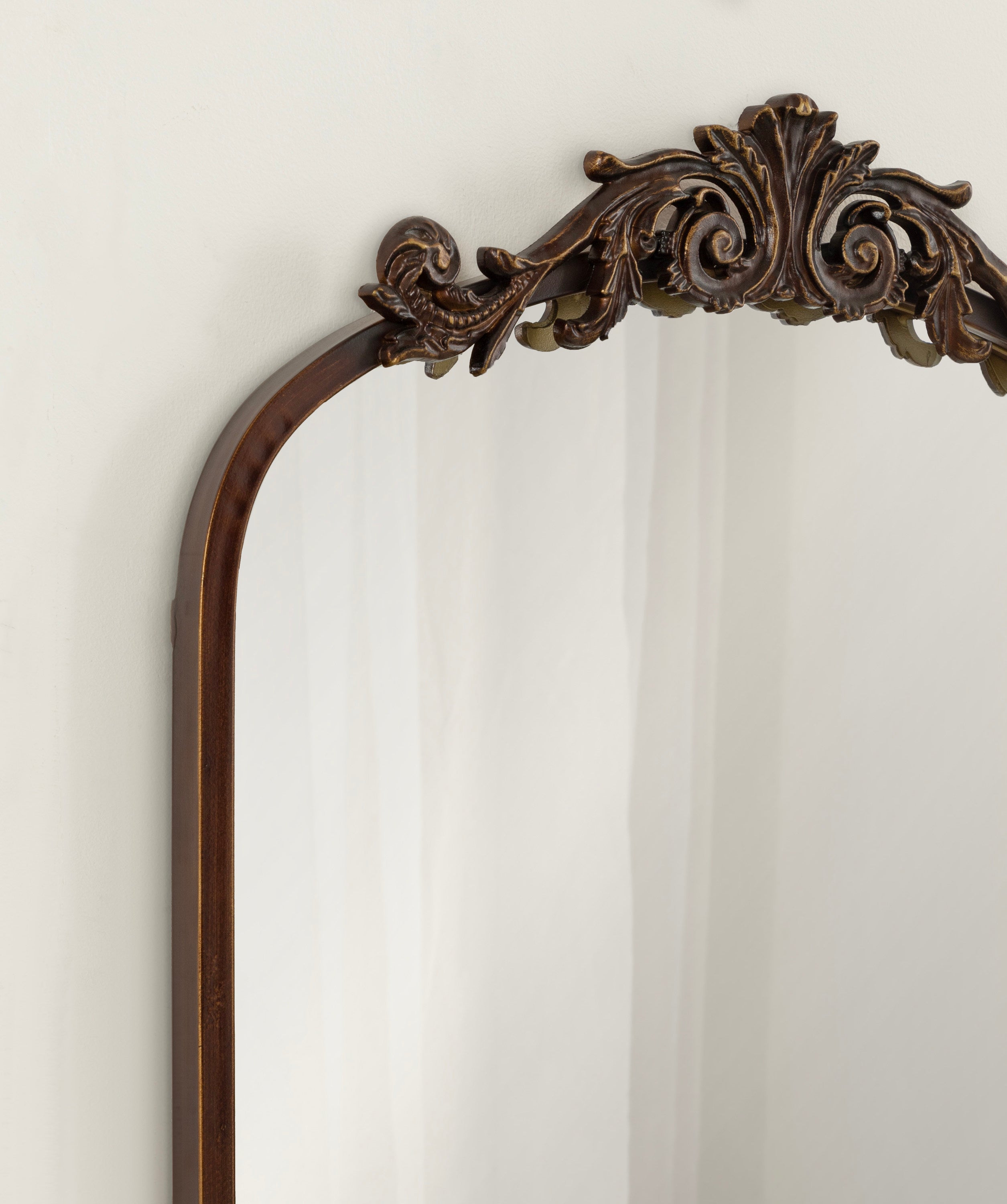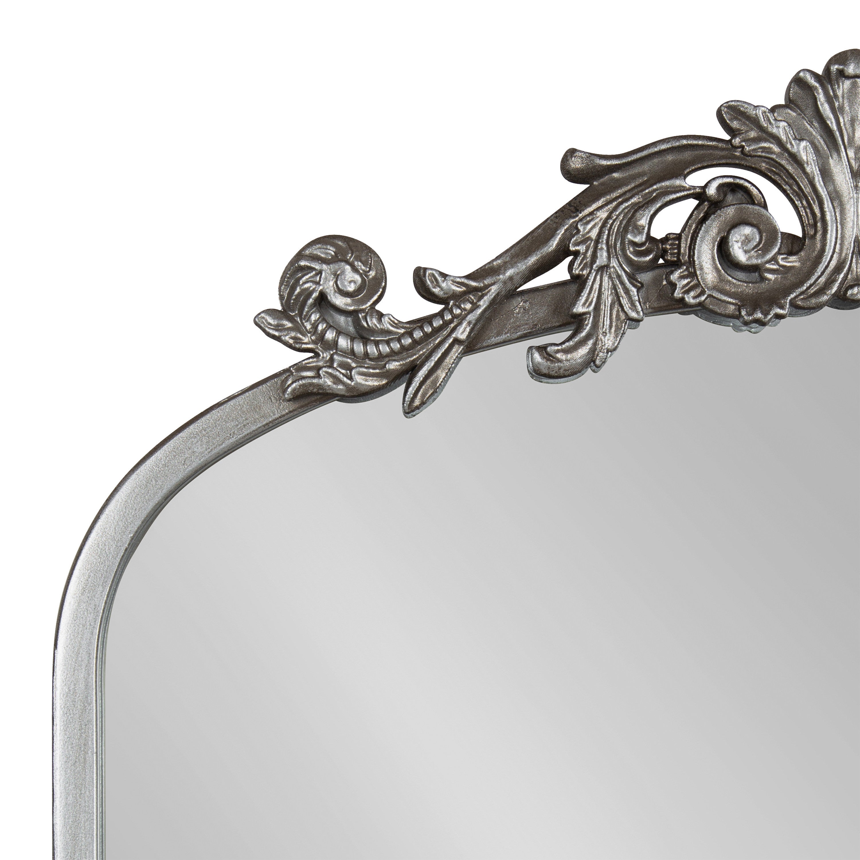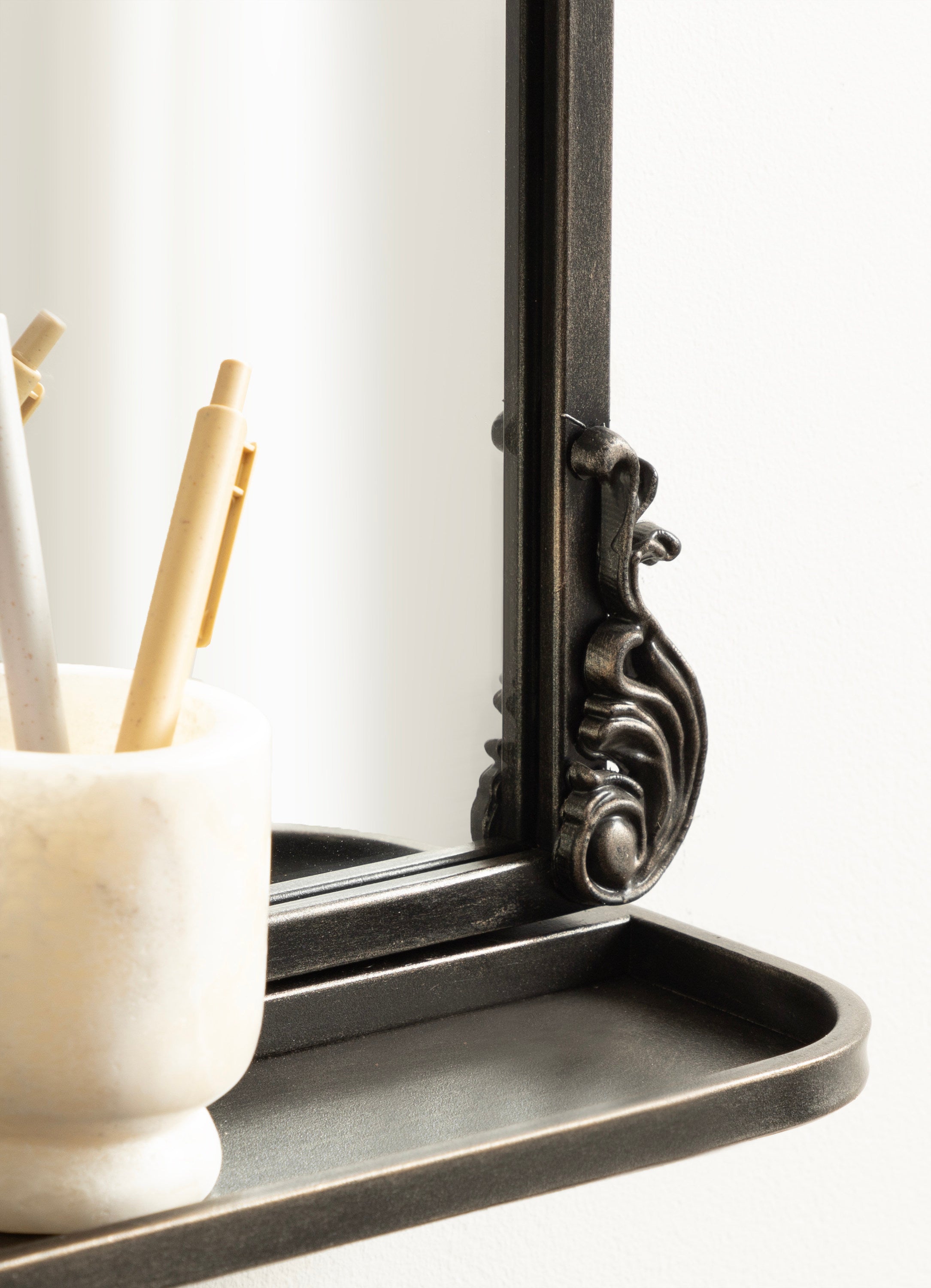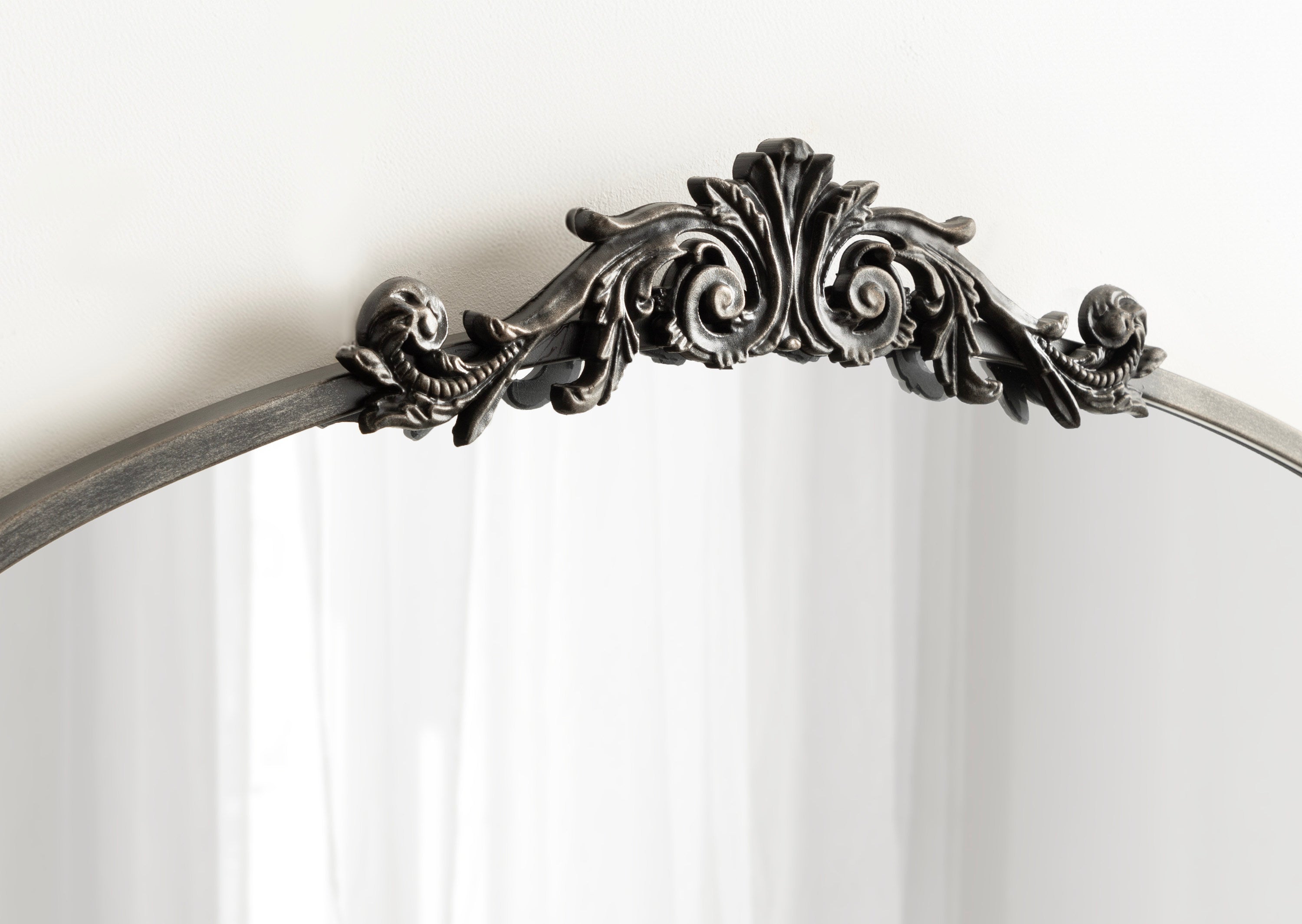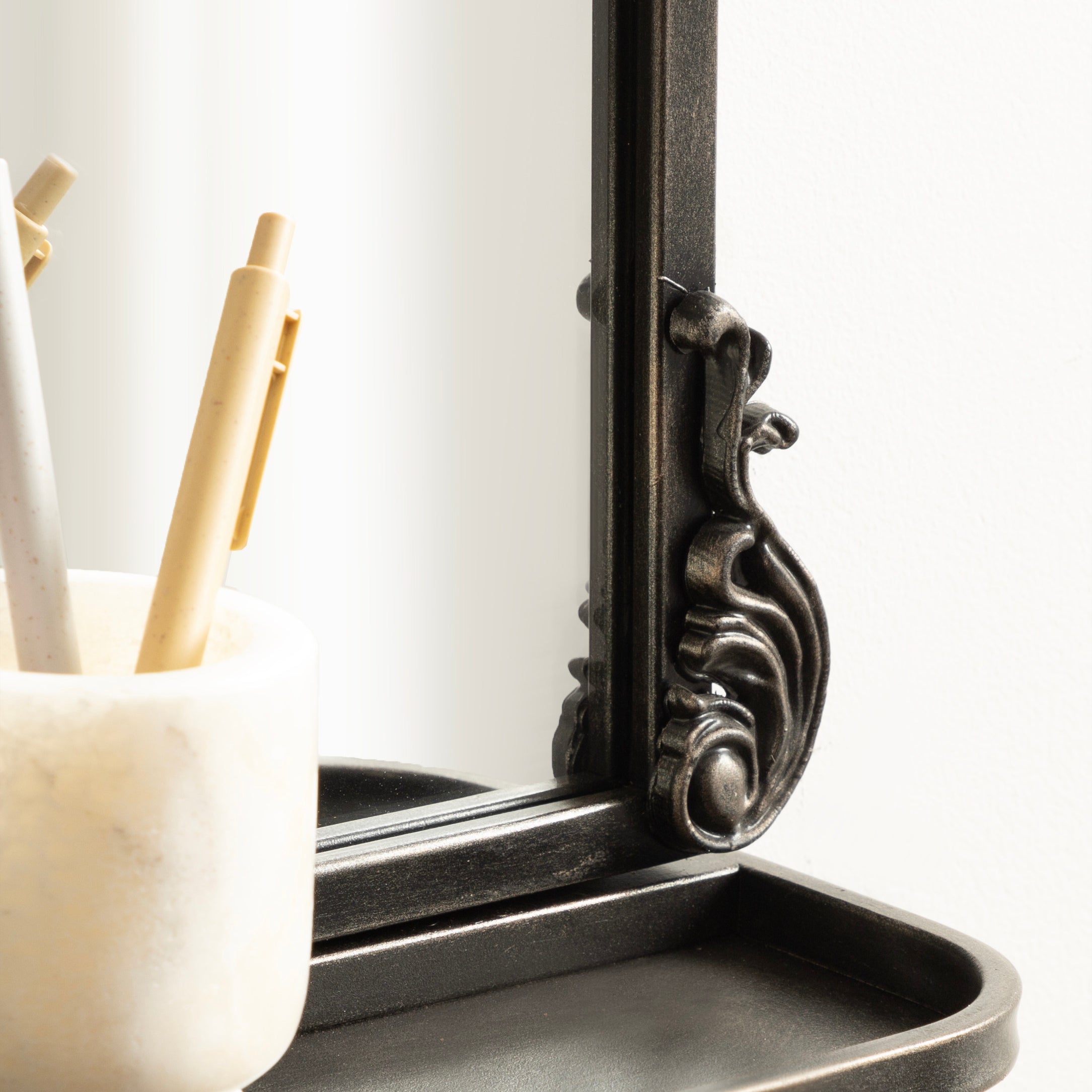 The Arendahl wall mirror brings a brilliant and decadent accent to any traditional home design. This wall mirror features a baroque-inspired design, with a resin garland crown cascading down a wide arched iron frame. The stunning antique finish brings it together as a vintage piece to display anywhere in your home. This version of the Arendahl features a functional shelf to place some small decor accents or necessary household items. Use the fabulous Arendahl wall mirror to bring dimension to your smaller spaces, opening up the area, and illuminating the darker corners. This framed mirror is also easy to hang, with metal keyhole wall hangers discreetly and securely attached to the back. Assembling this arch mirror is simple with a one-step assembly process to attach the shelf to the mirror.